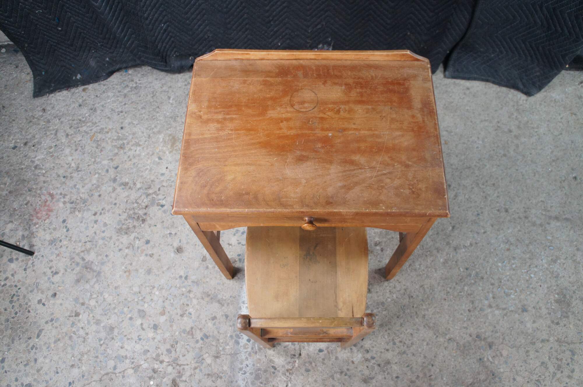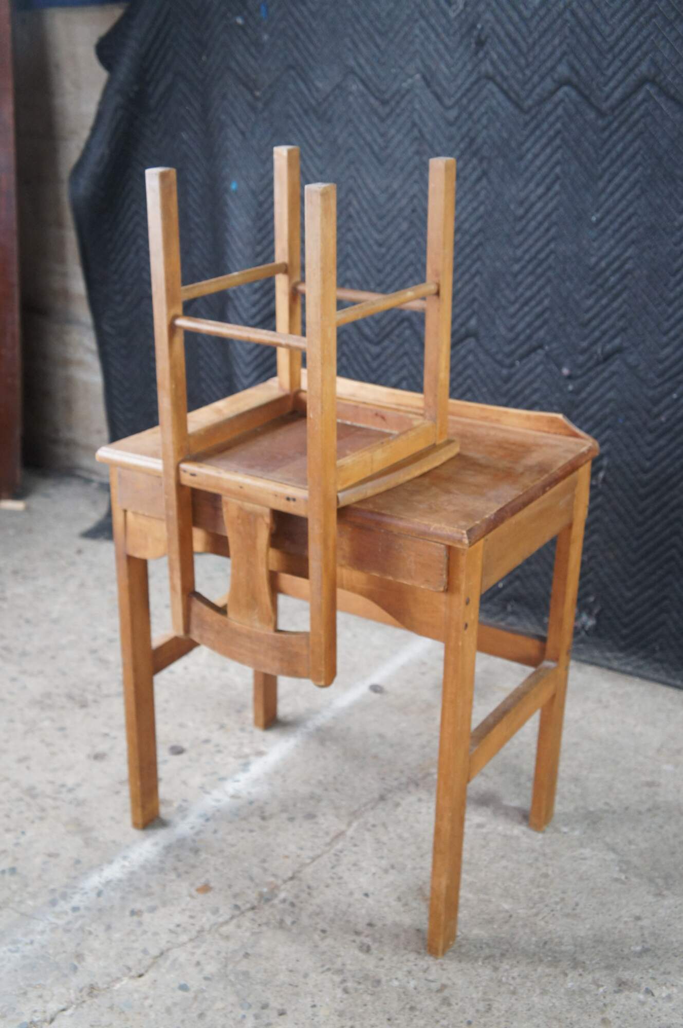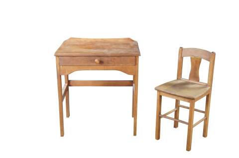 Mid 20th century childs size school desk and chair. Made from oak featuring one large drawer with turned knob.