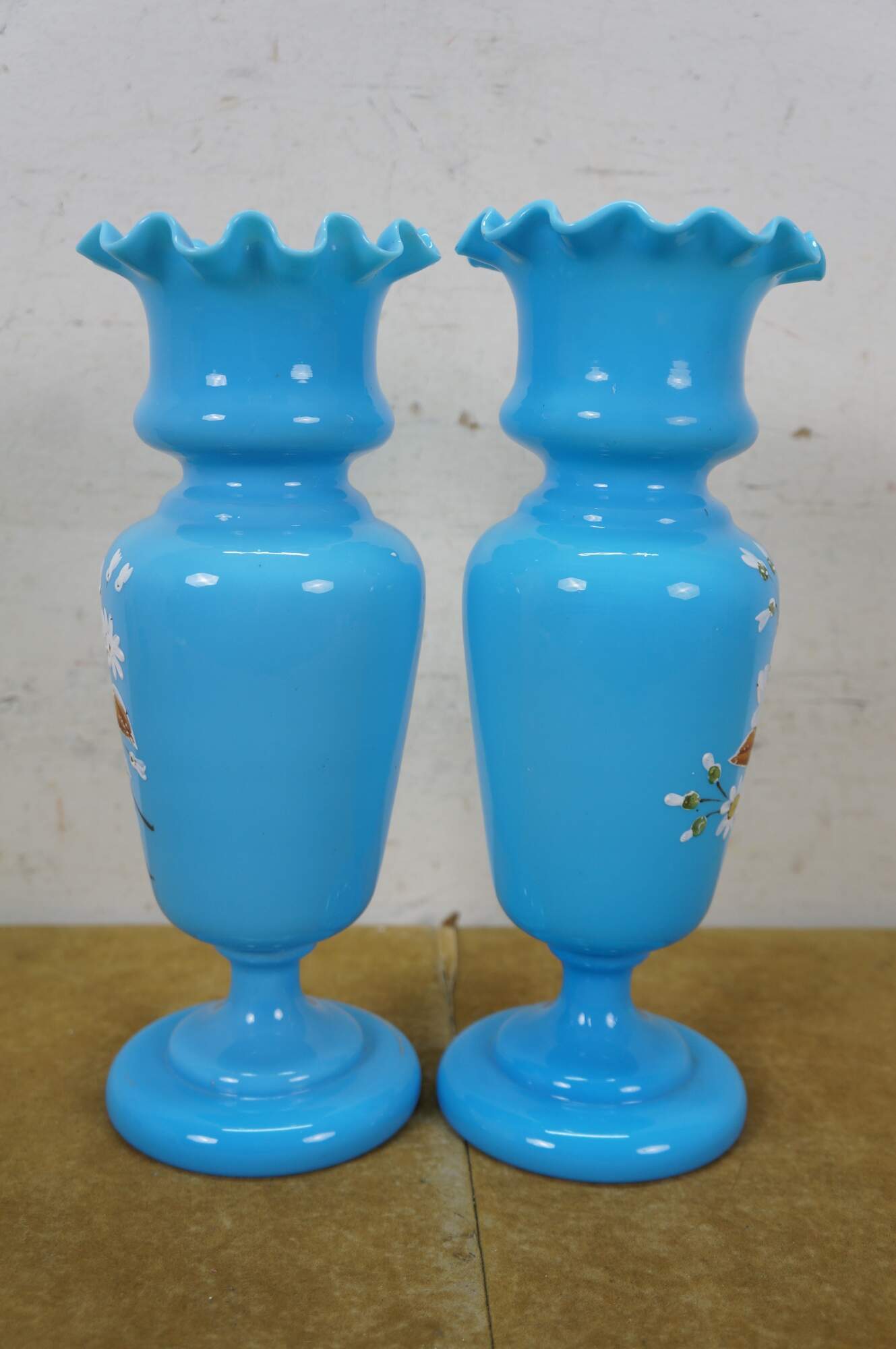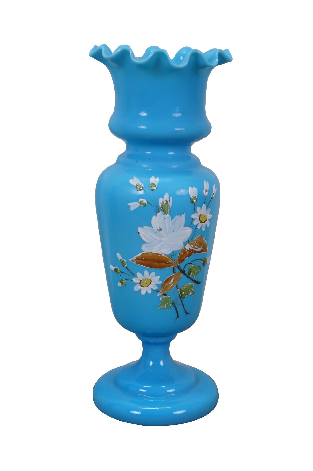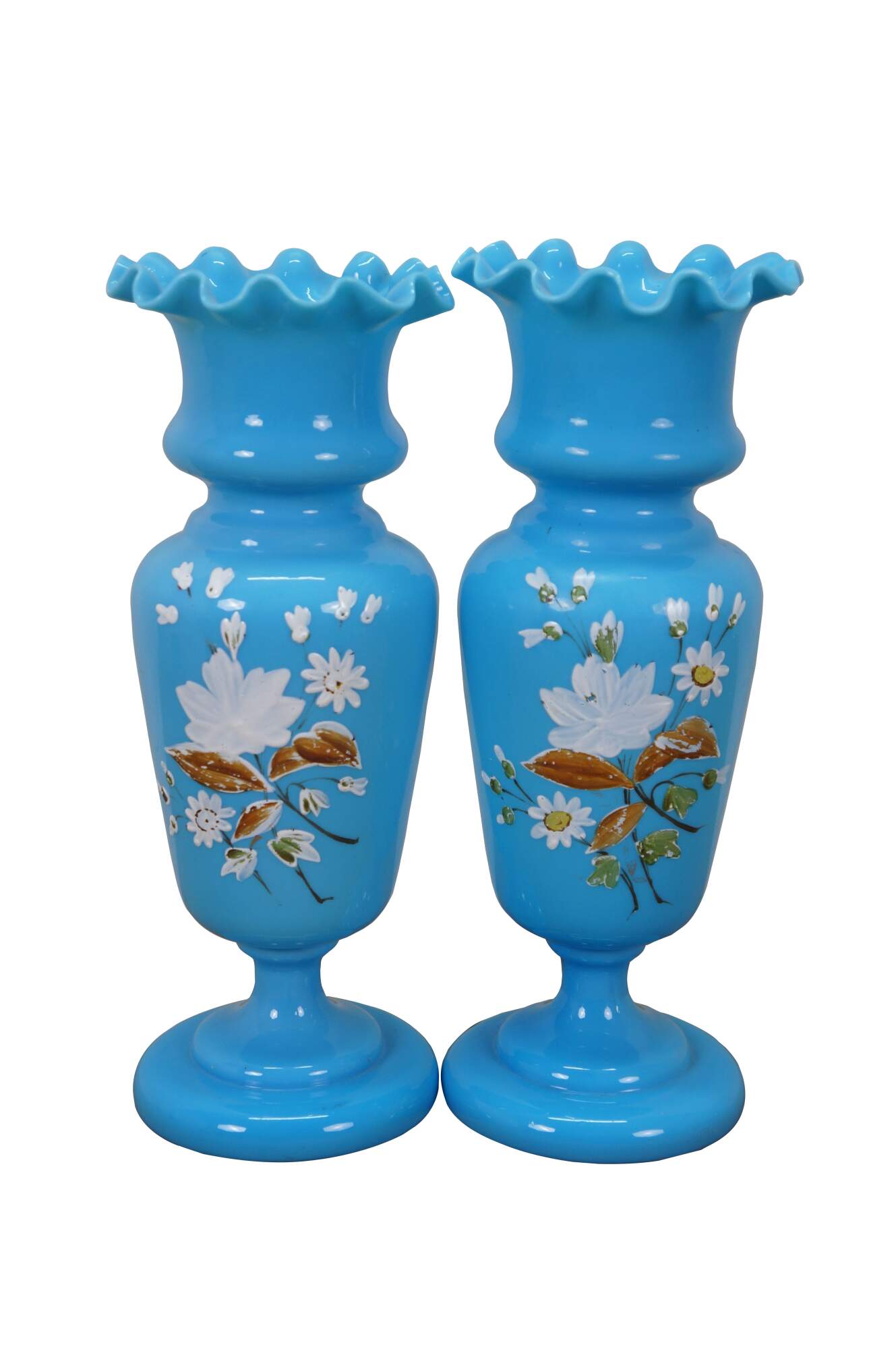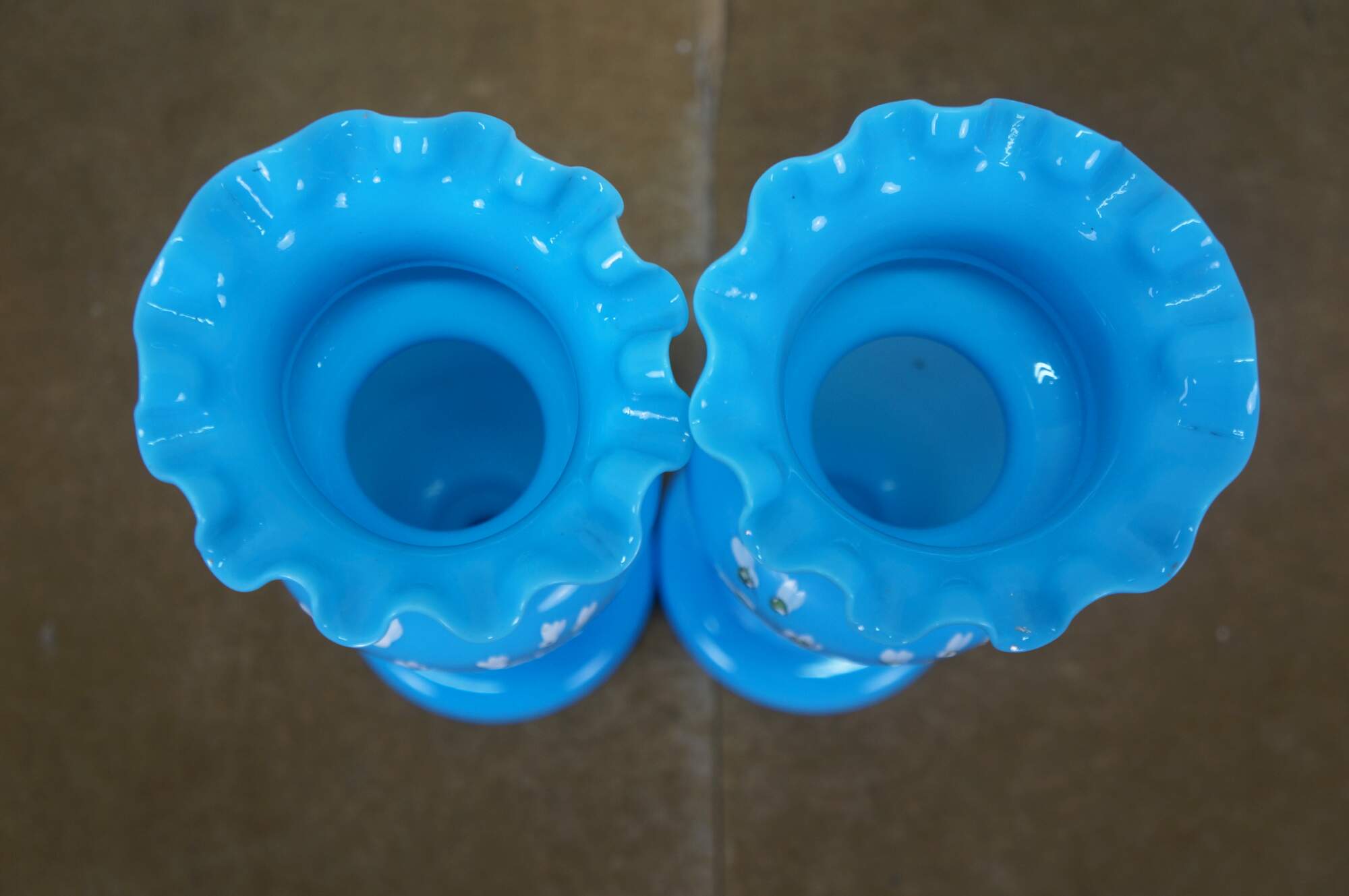 Pair of antique light blue clambroth glass vases. Handblown with pedestal bases and ruffled tops, hand painted on one side with sprigs of white daisies.