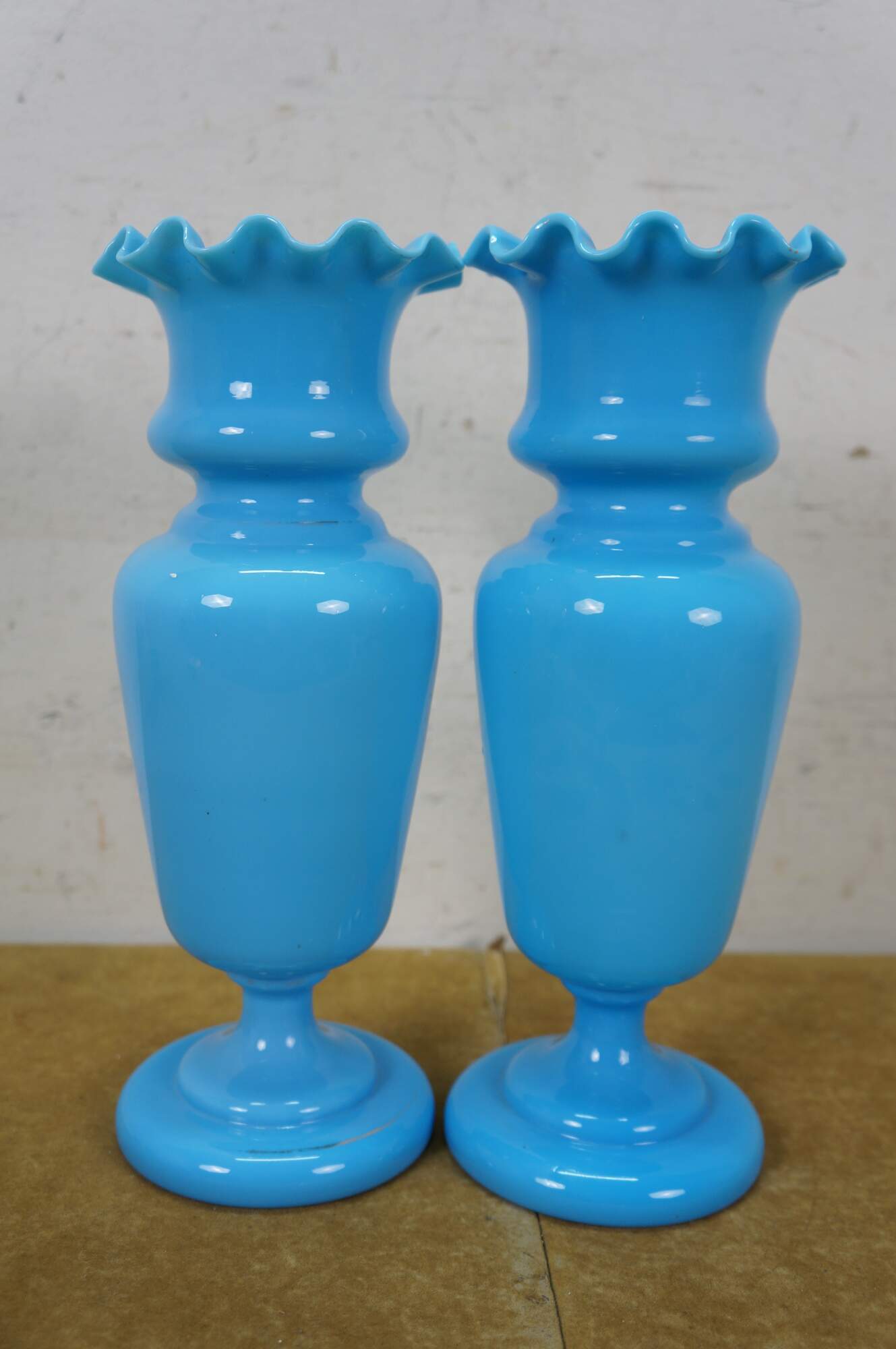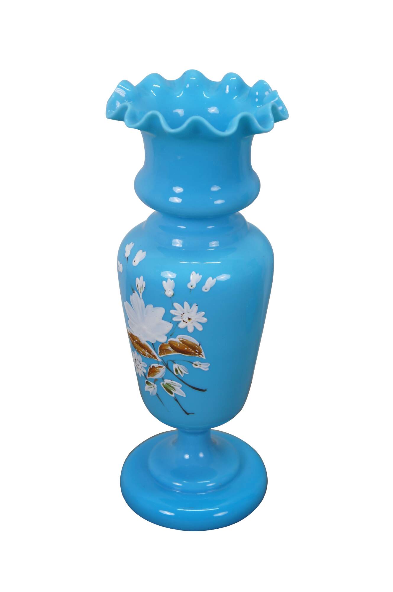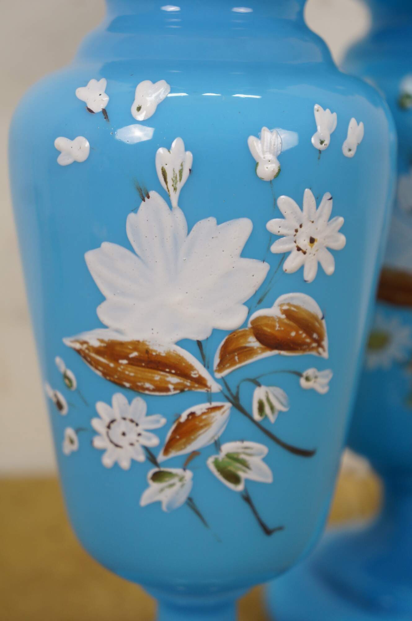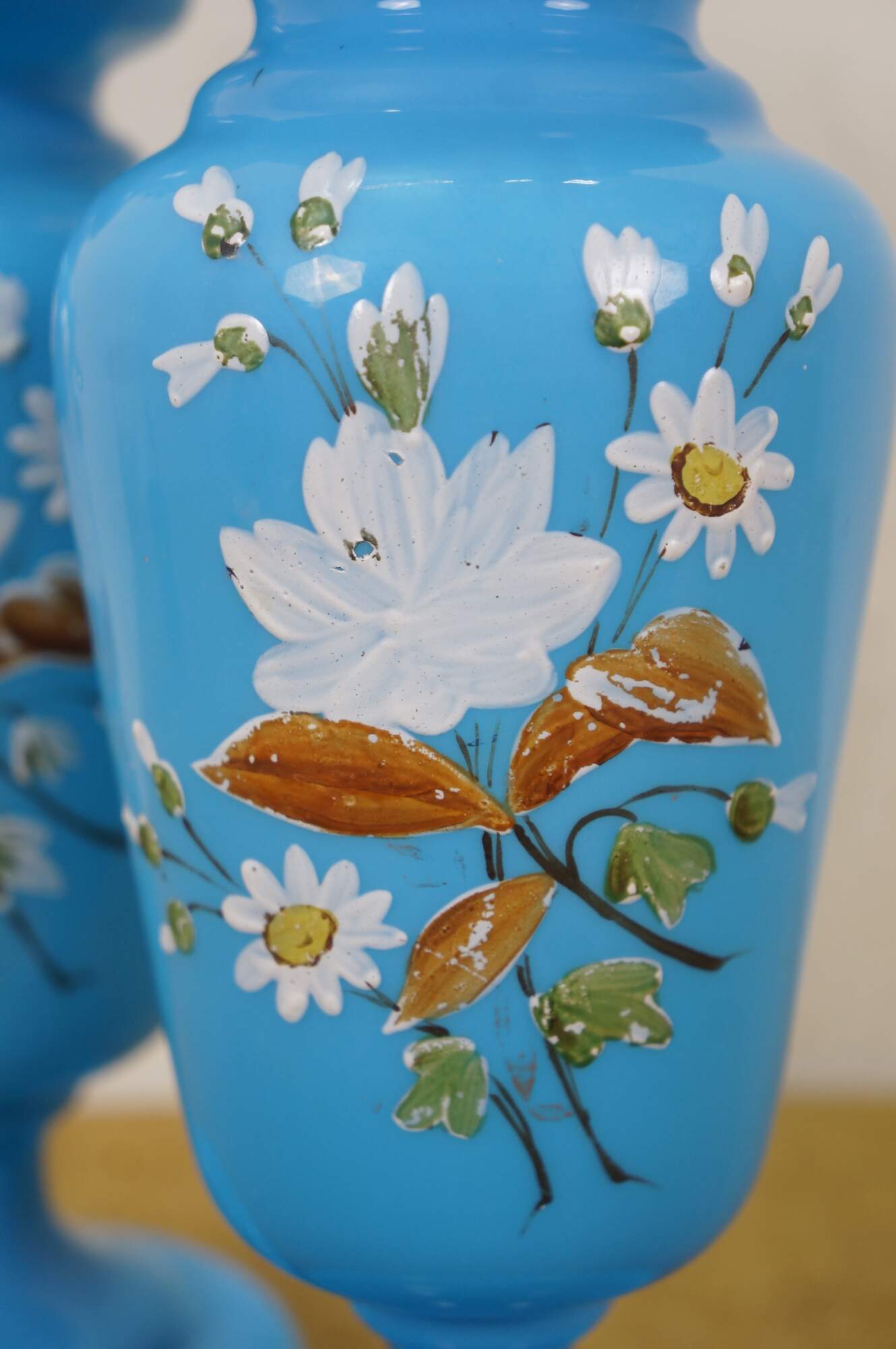 Pair of antique light blue clambroth glass vases. Handblown with pedestal bases and ruffled tops, hand painted on one side with sprigs of white daisies.
