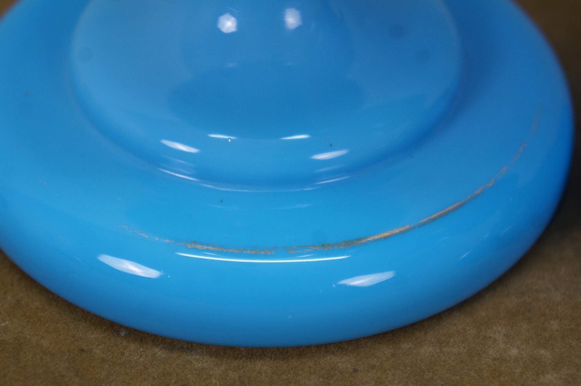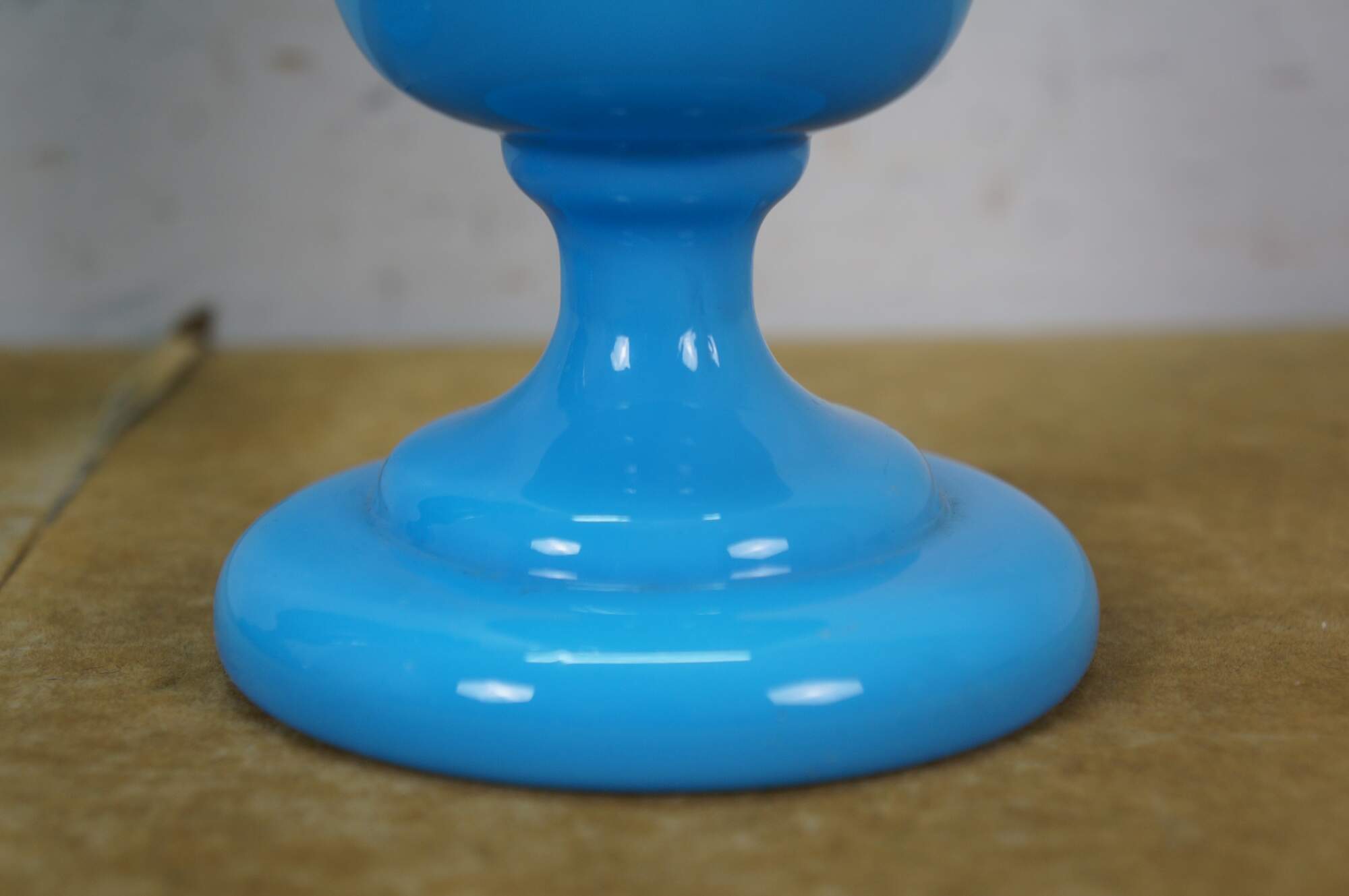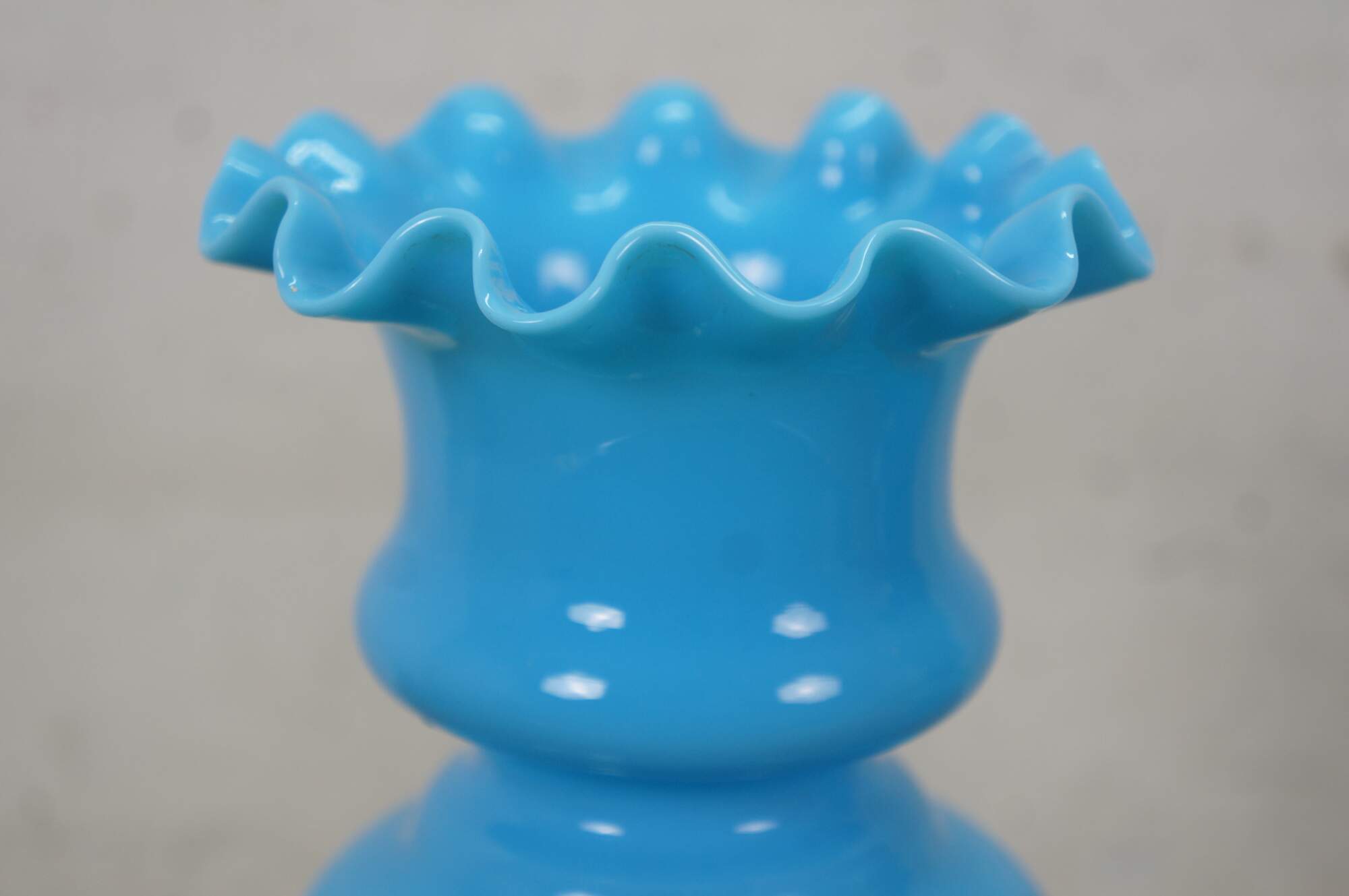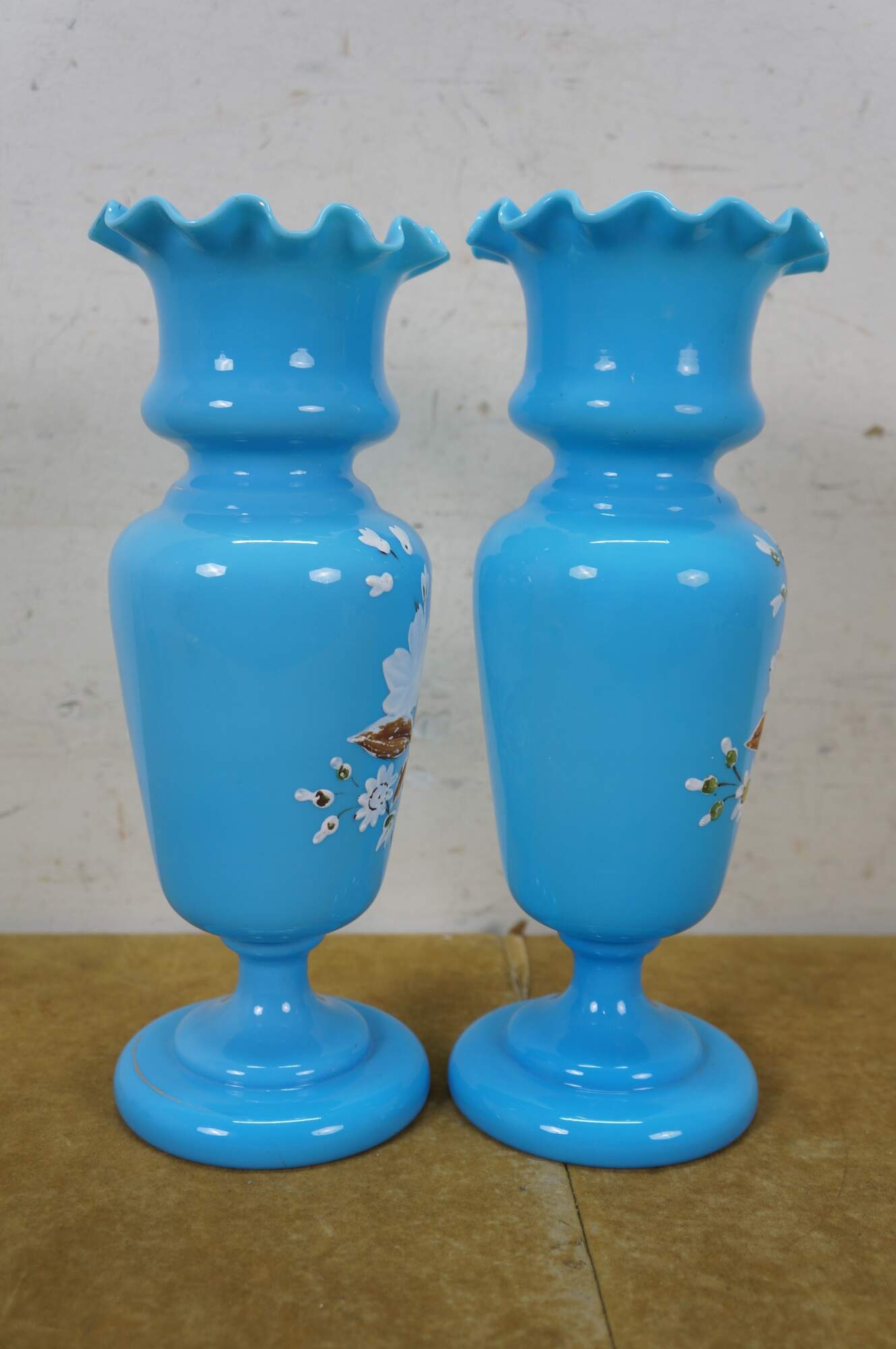 Pair of antique light blue clambroth glass vases. Handblown with pedestal bases and ruffled tops, hand painted on one side with sprigs of white daisies.