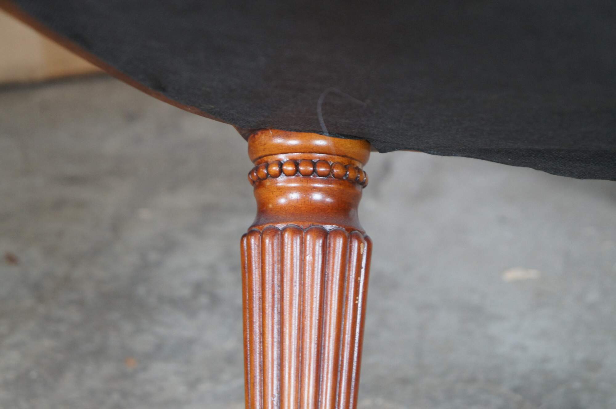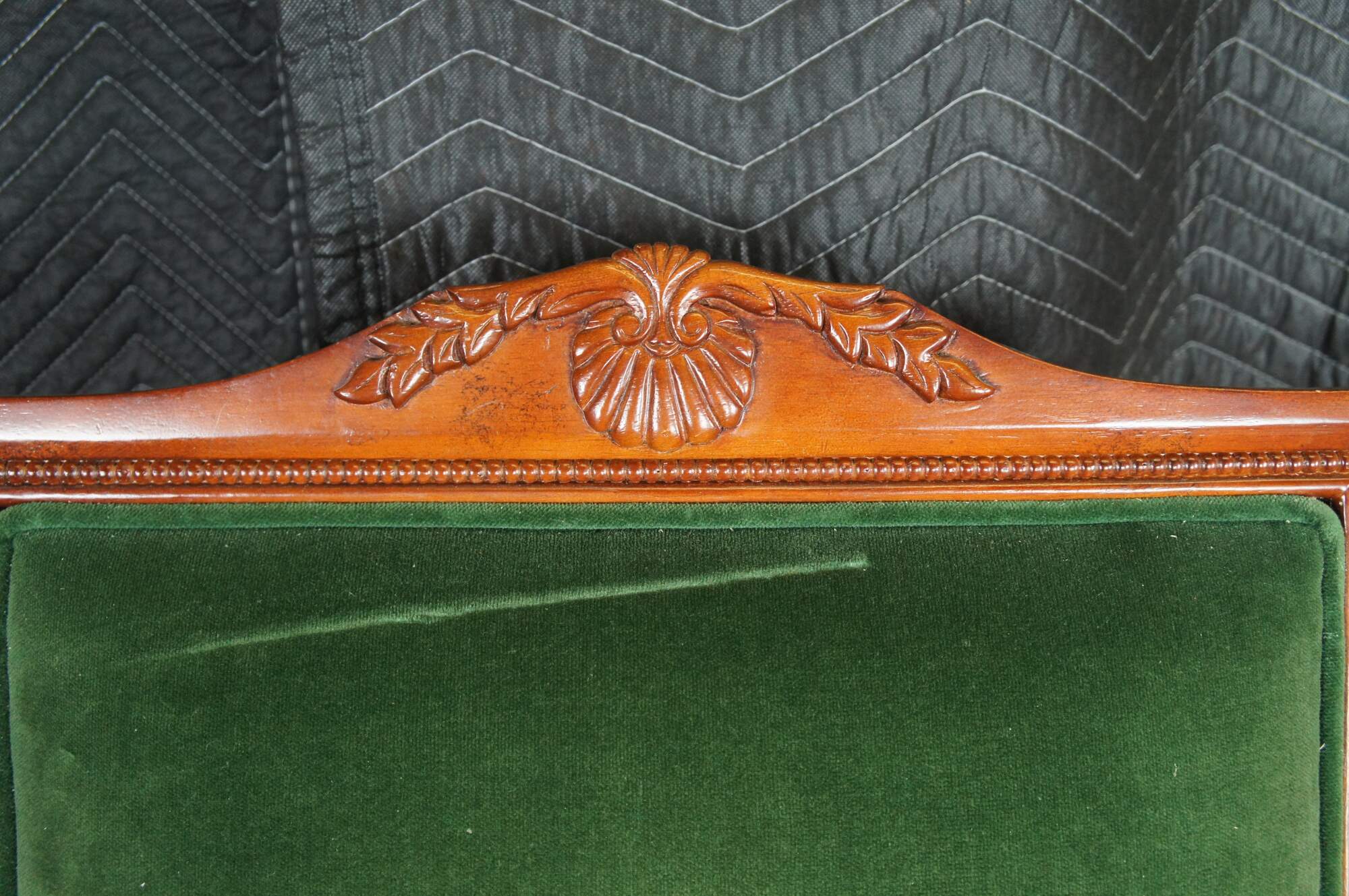 Late 20th Century French Empire Style Upholstered Arm Chair. Made from birch with a high back featuring a scalloped crest rail, green velvet upholstery and downswept scrolled acanthus carved arms. The legs are reeded and tapered leading to arrow feet.