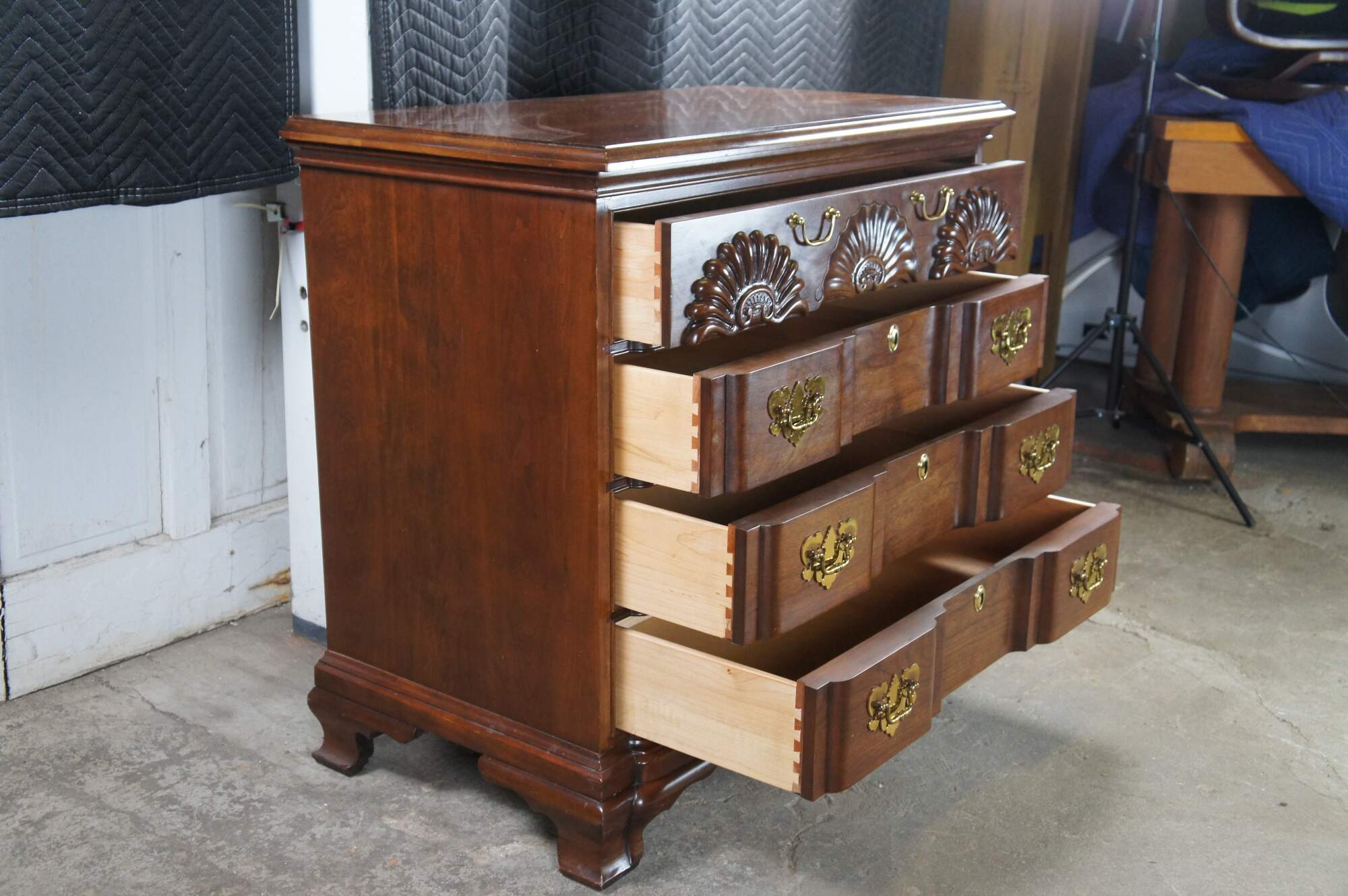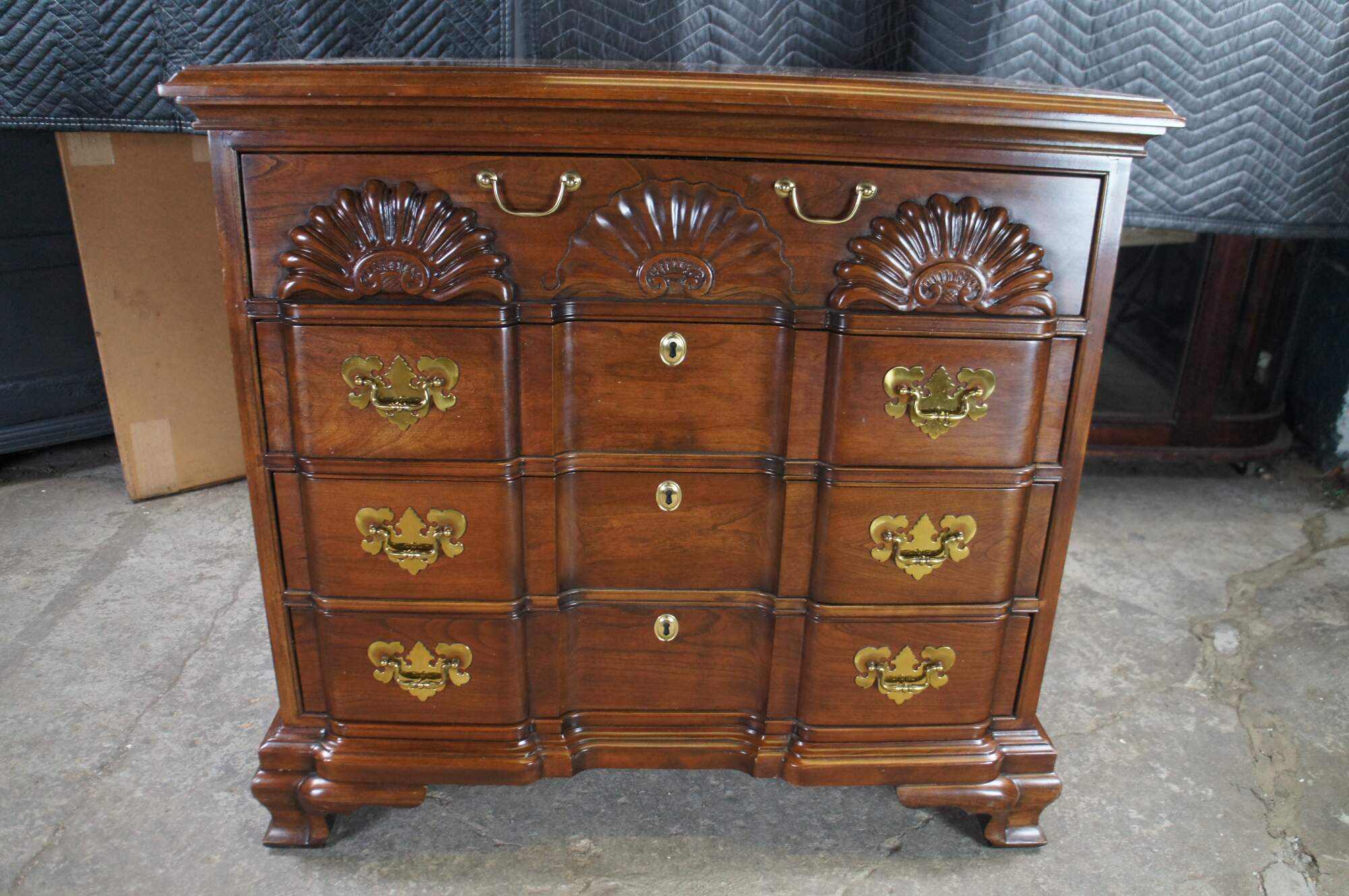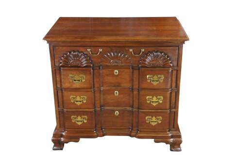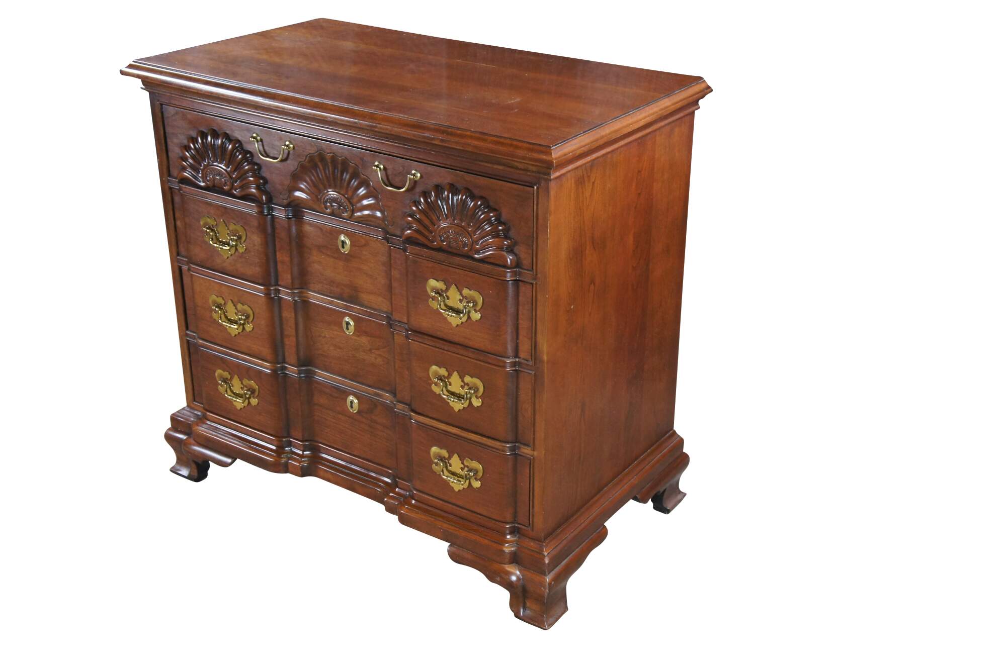 Harden Georgian style block front chest of drawers. Features a solid cherry frame with four dovetailed oak drawers. Drawer fronts are carved and scalloped along the top. with colonial style brass bale hardware with batwing plates. Drawer centers feature faux escutcheon plates. The chest is supported by Ogee bracket feet.