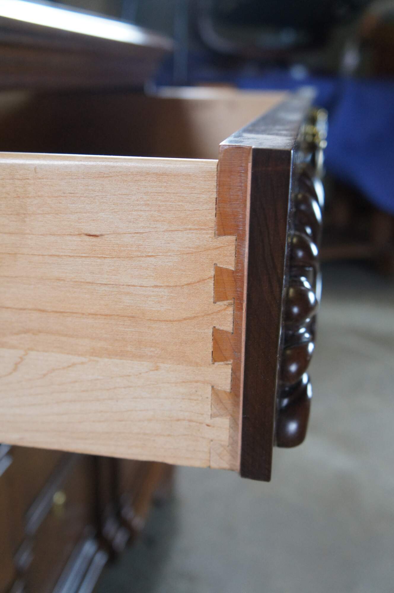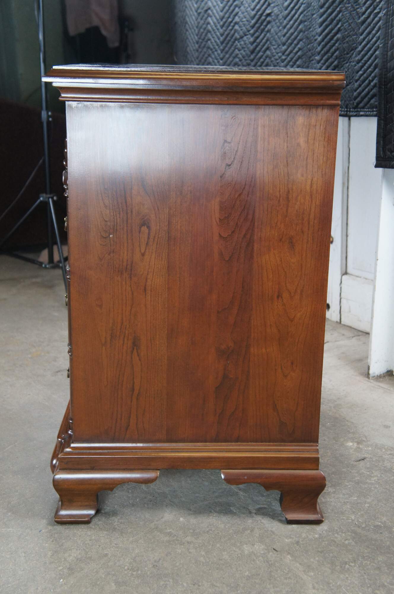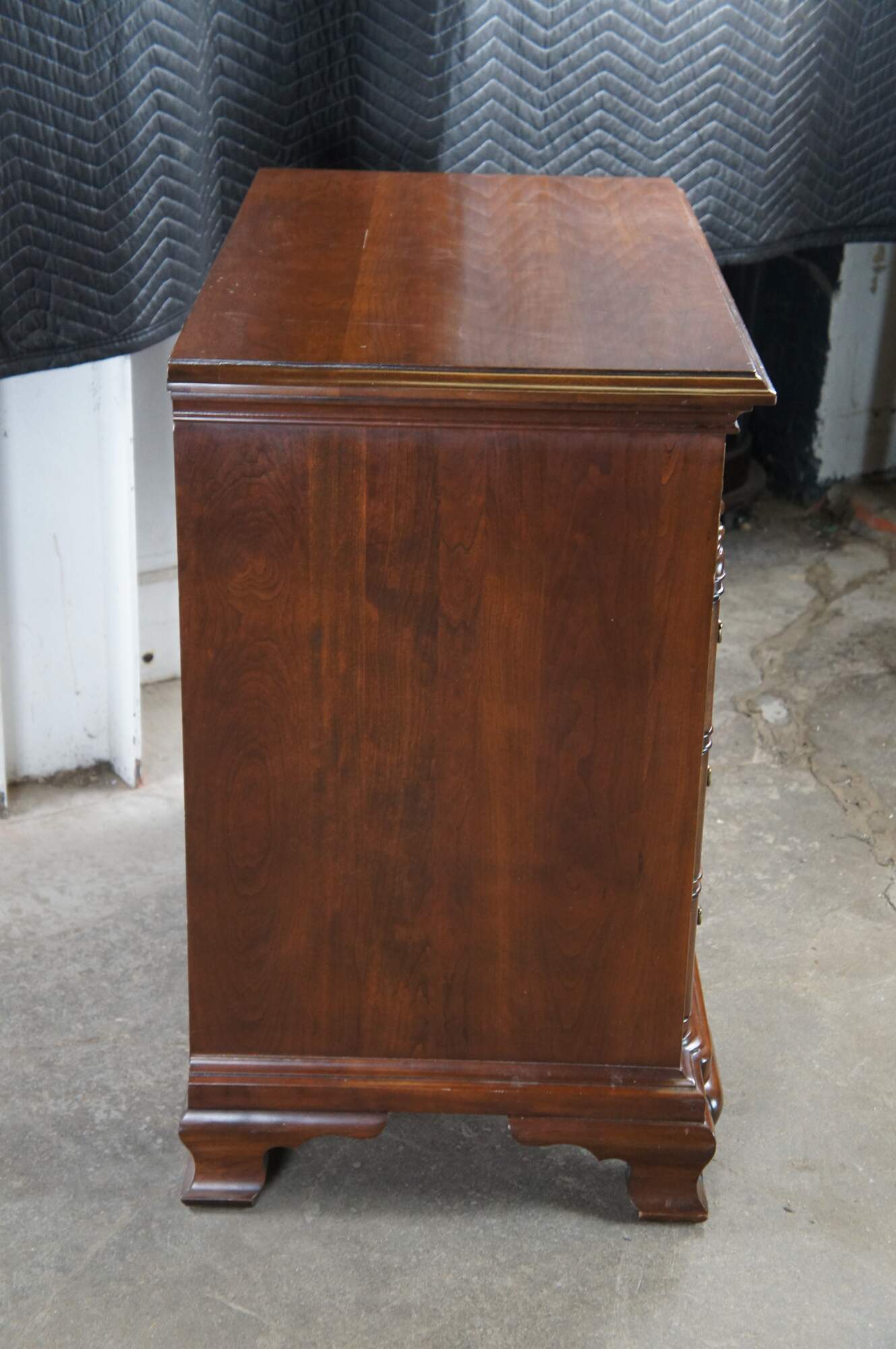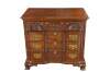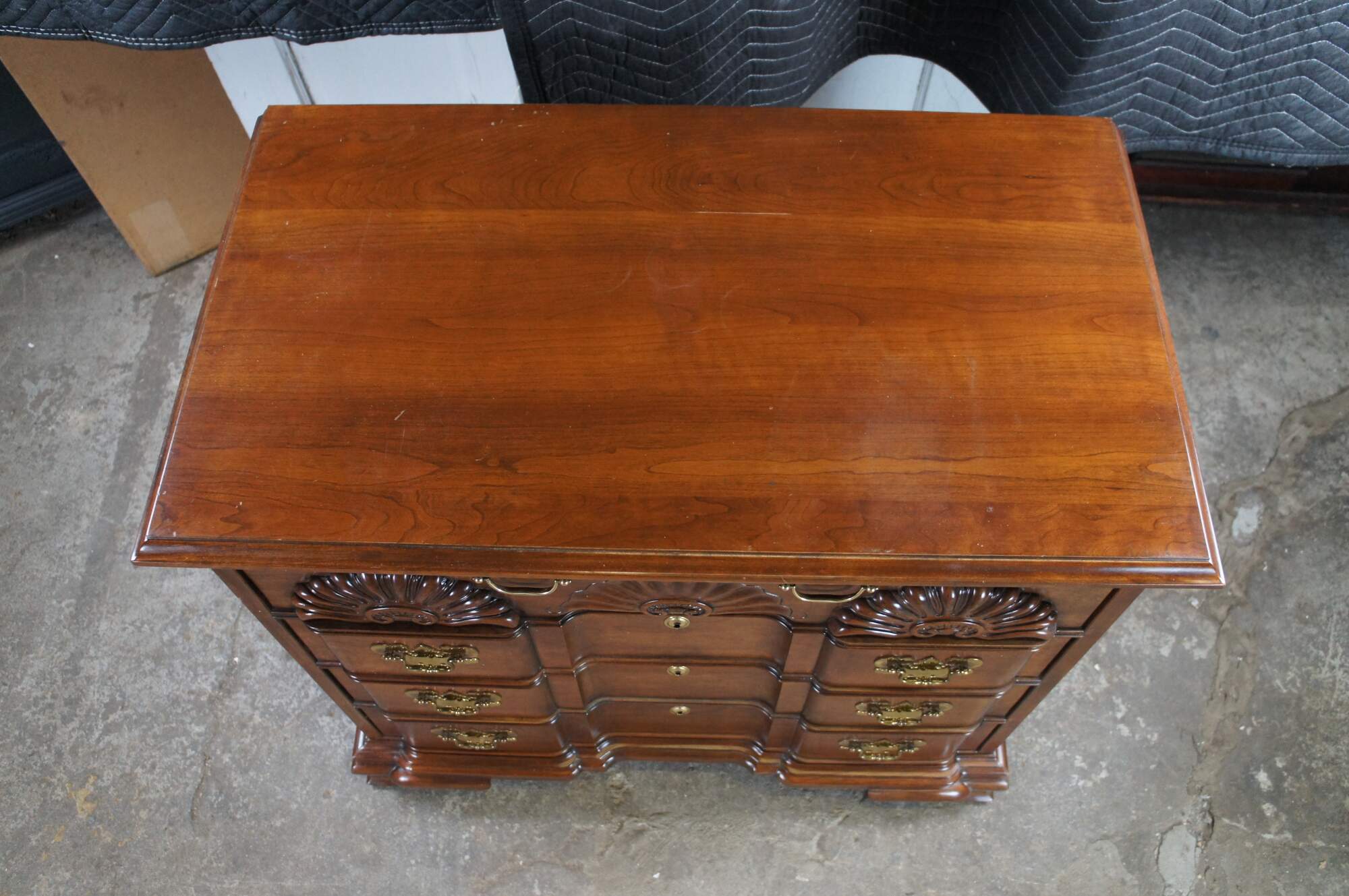 Harden Georgian style block front chest of drawers. Features a solid cherry frame with four dovetailed oak drawers. Drawer fronts are carved and scalloped along the top. with colonial style brass bale hardware with batwing plates. Drawer centers feature faux escutcheon plates. The chest is supported by Ogee bracket feet.