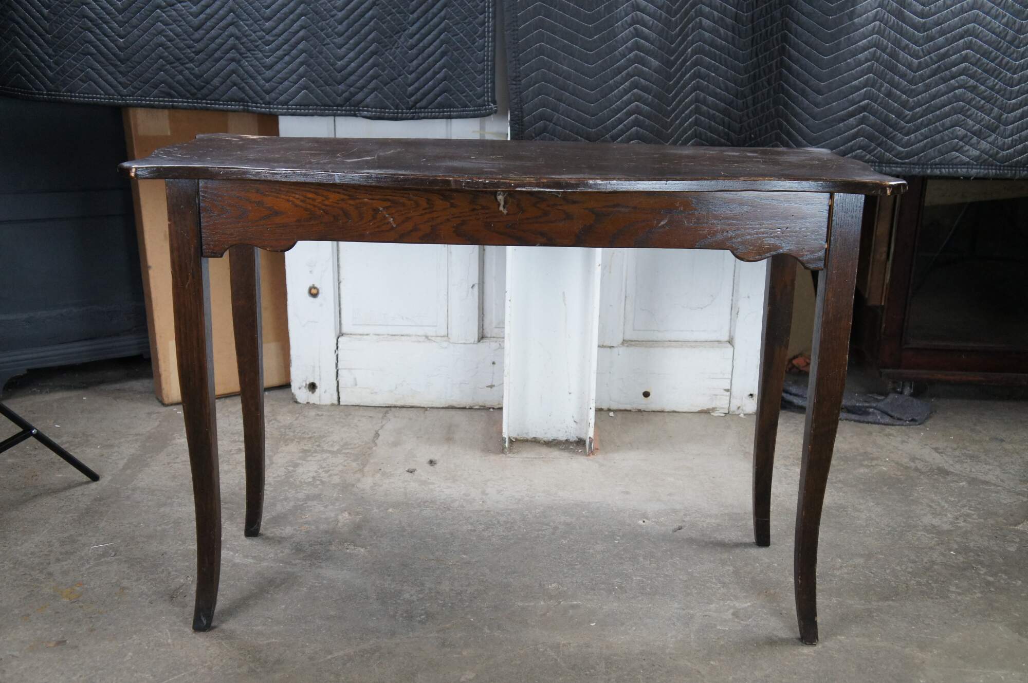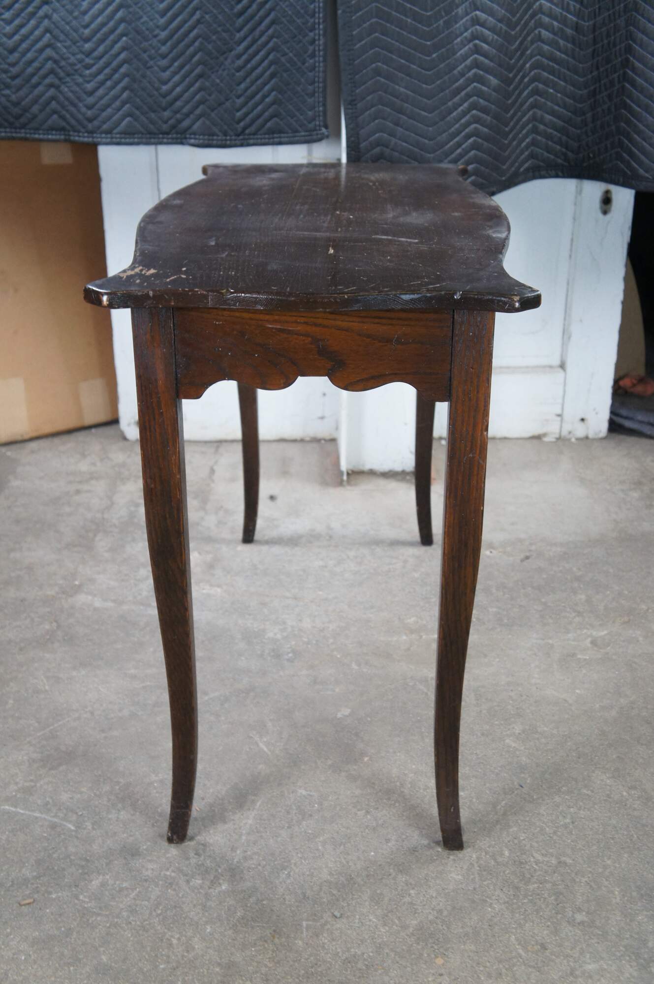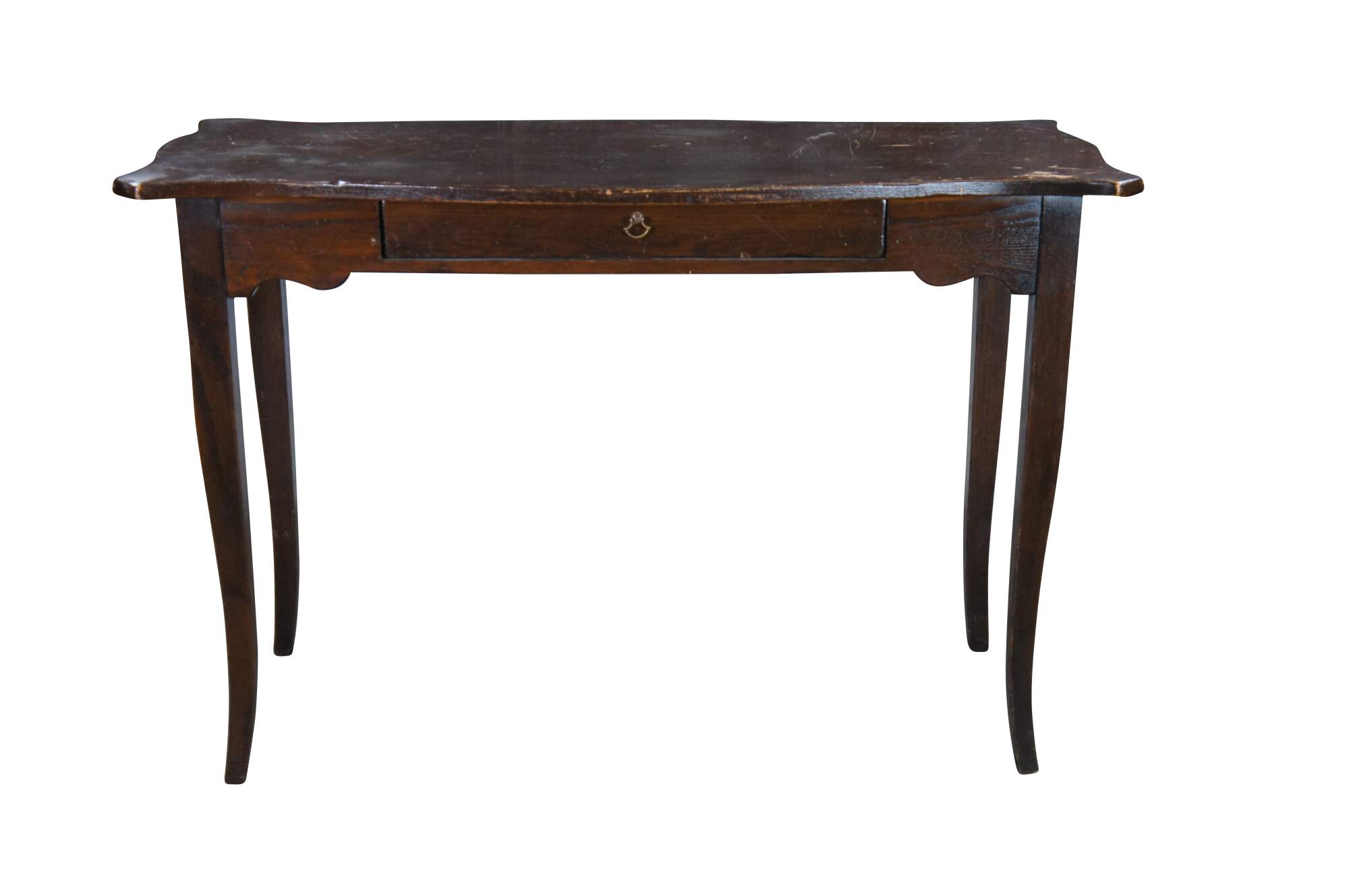 18th Century style French Country console table. Made from oak with a serpentine top leading to ears over a frieze with drawer and square tapered legs leading to a flared foot.