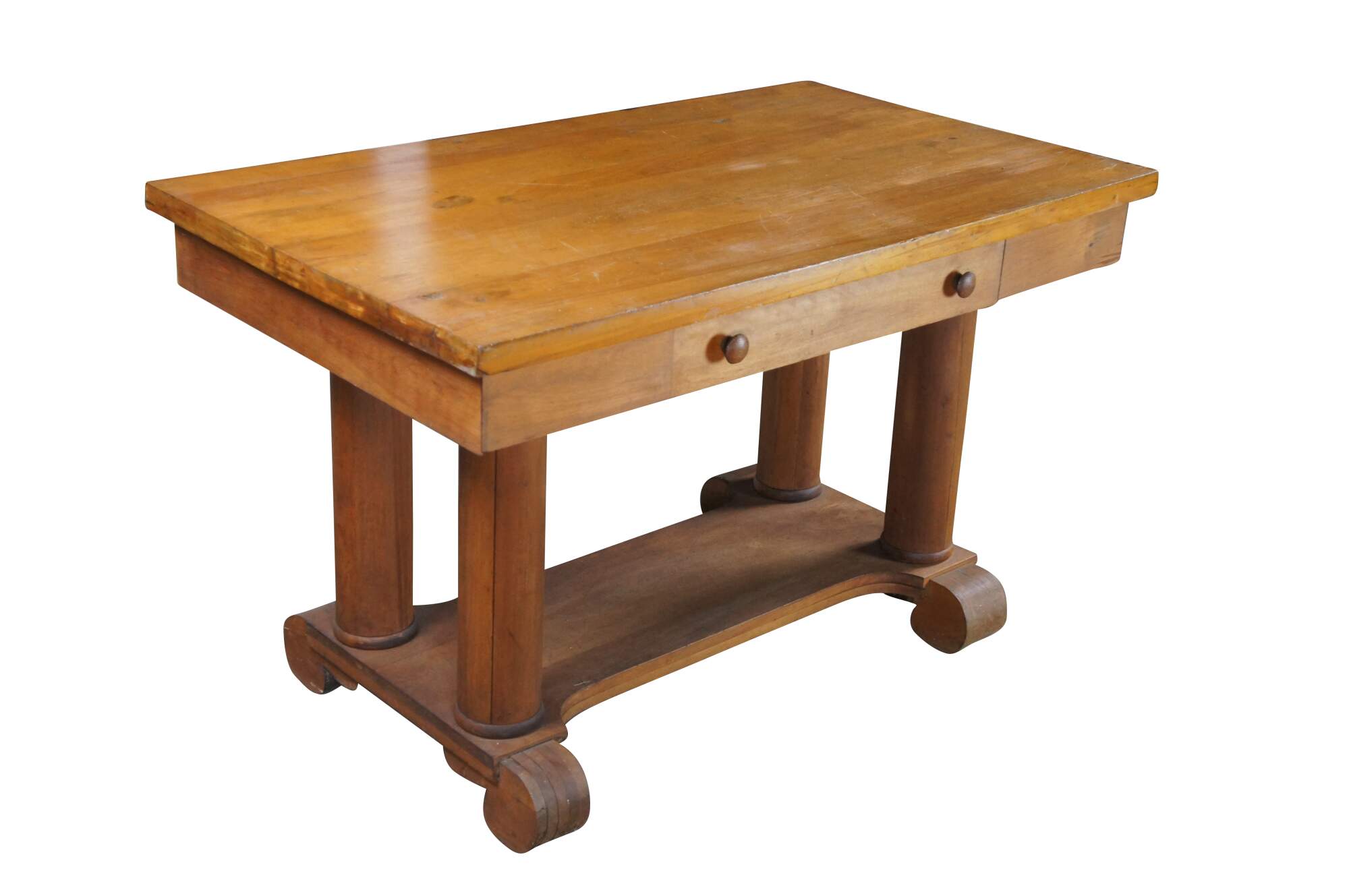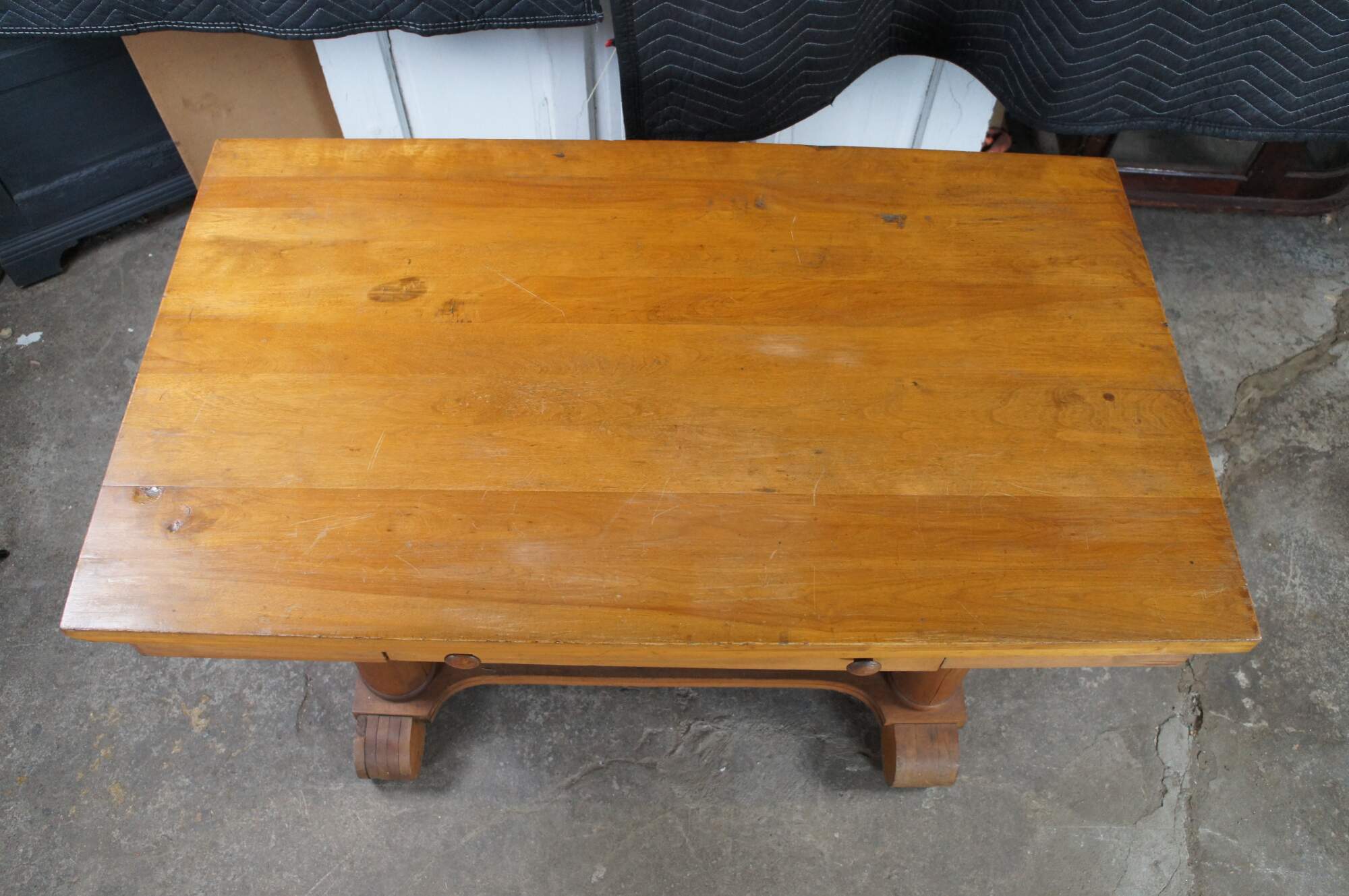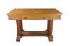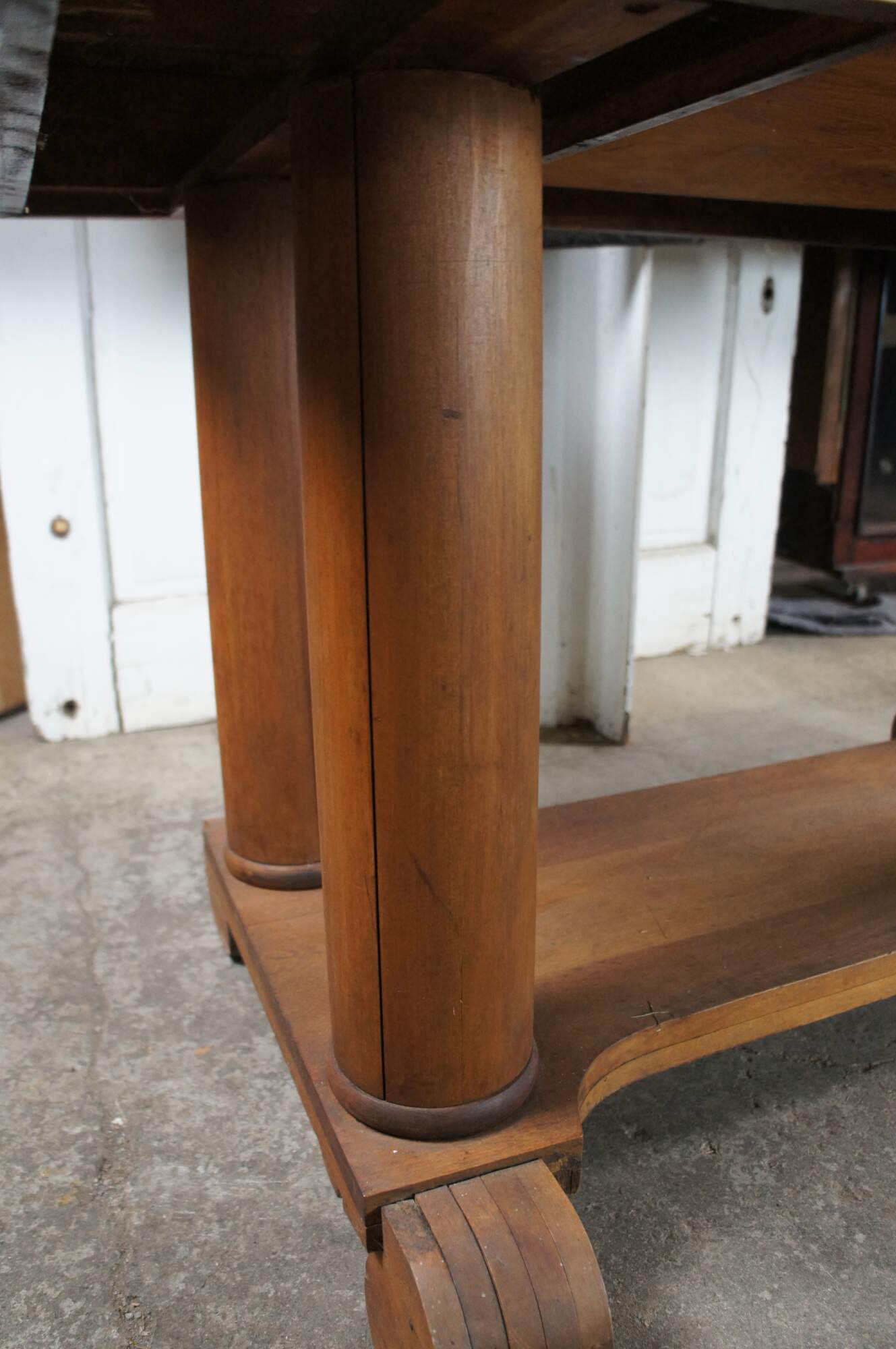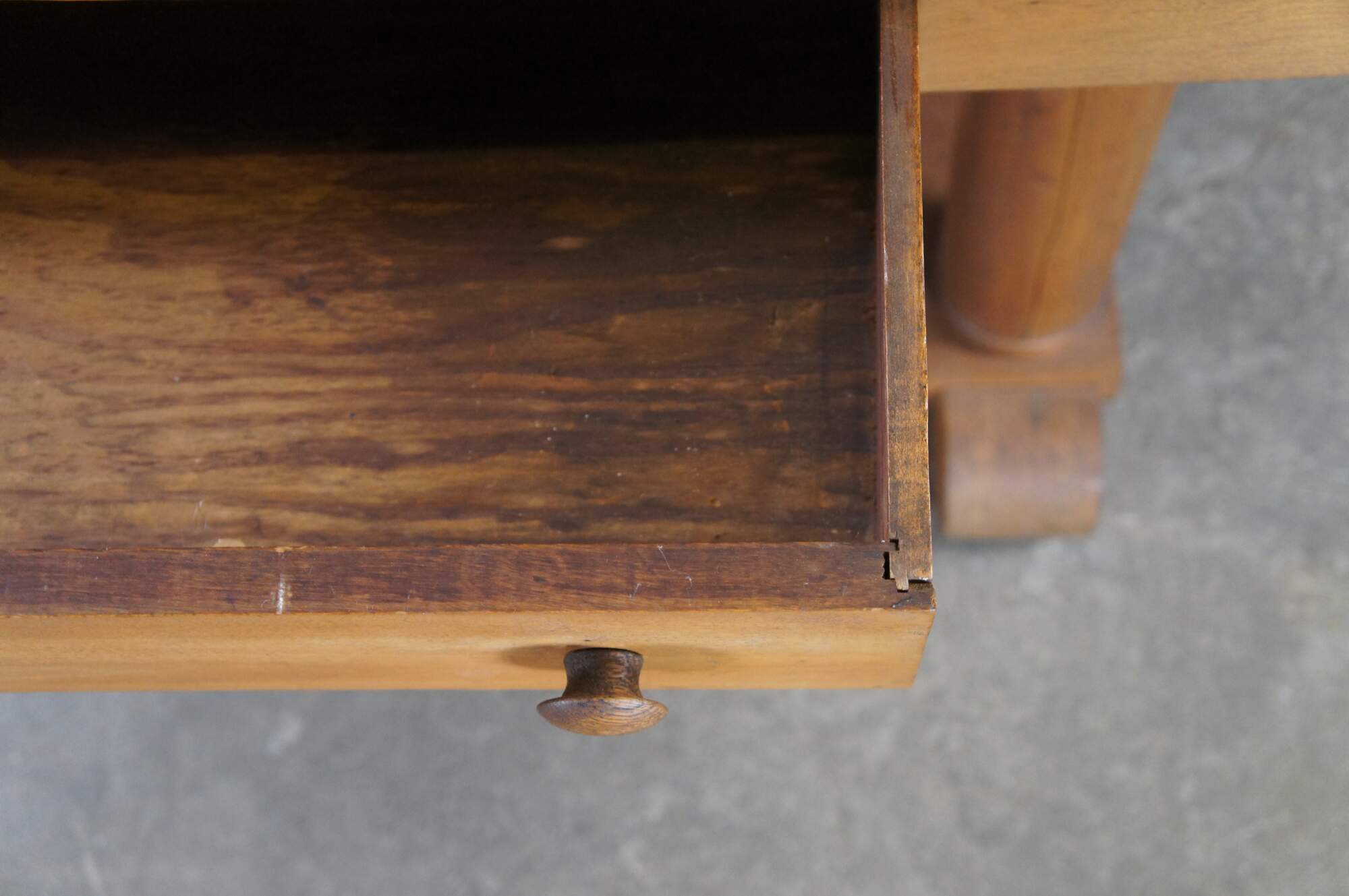 Early 20th Century Arts & Crafts / Mission Library Table. Features a rectangular form made from oak and pine `with a central drawer over columnar supports leading to a trestle base with scrolled feet.