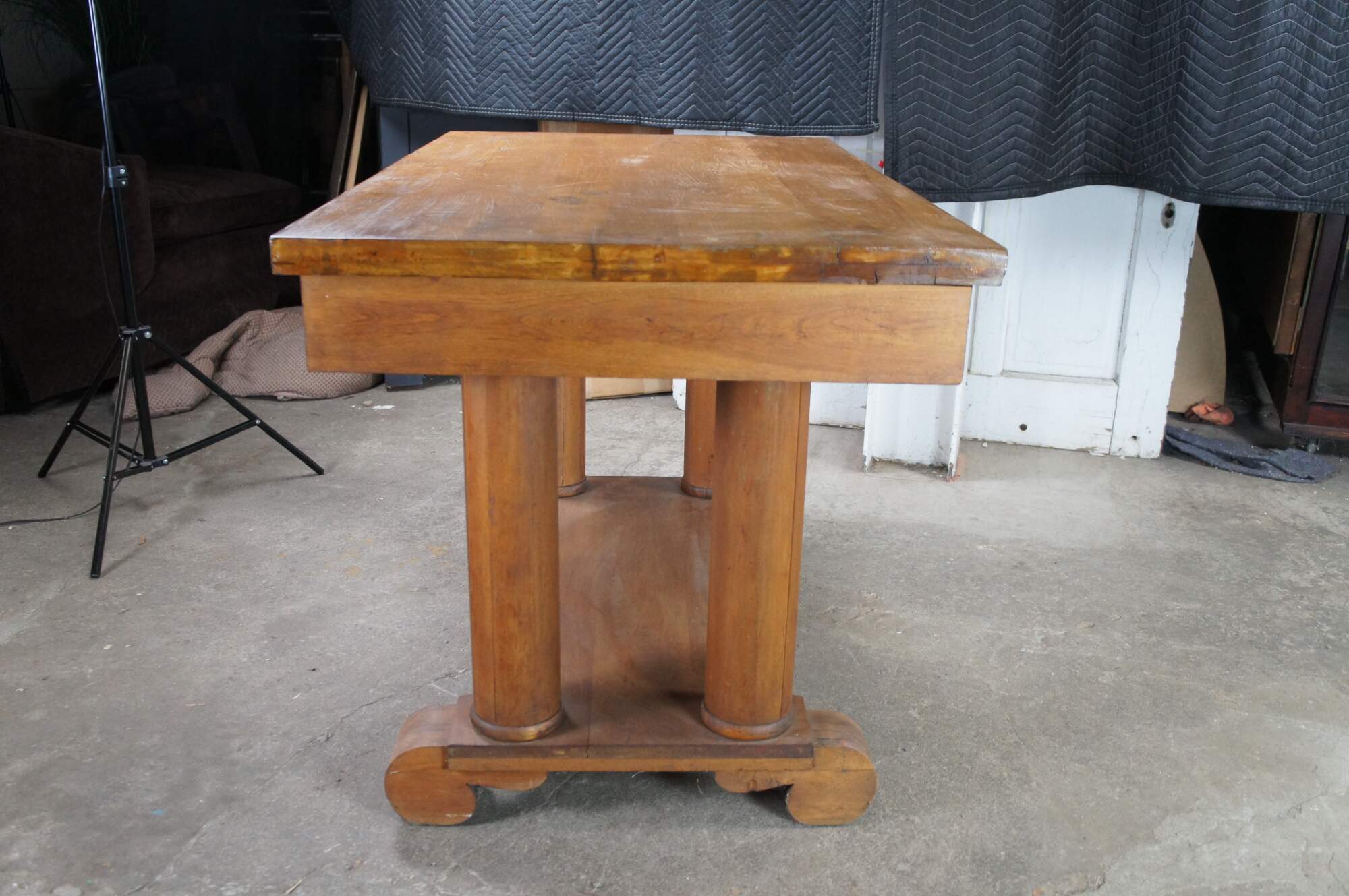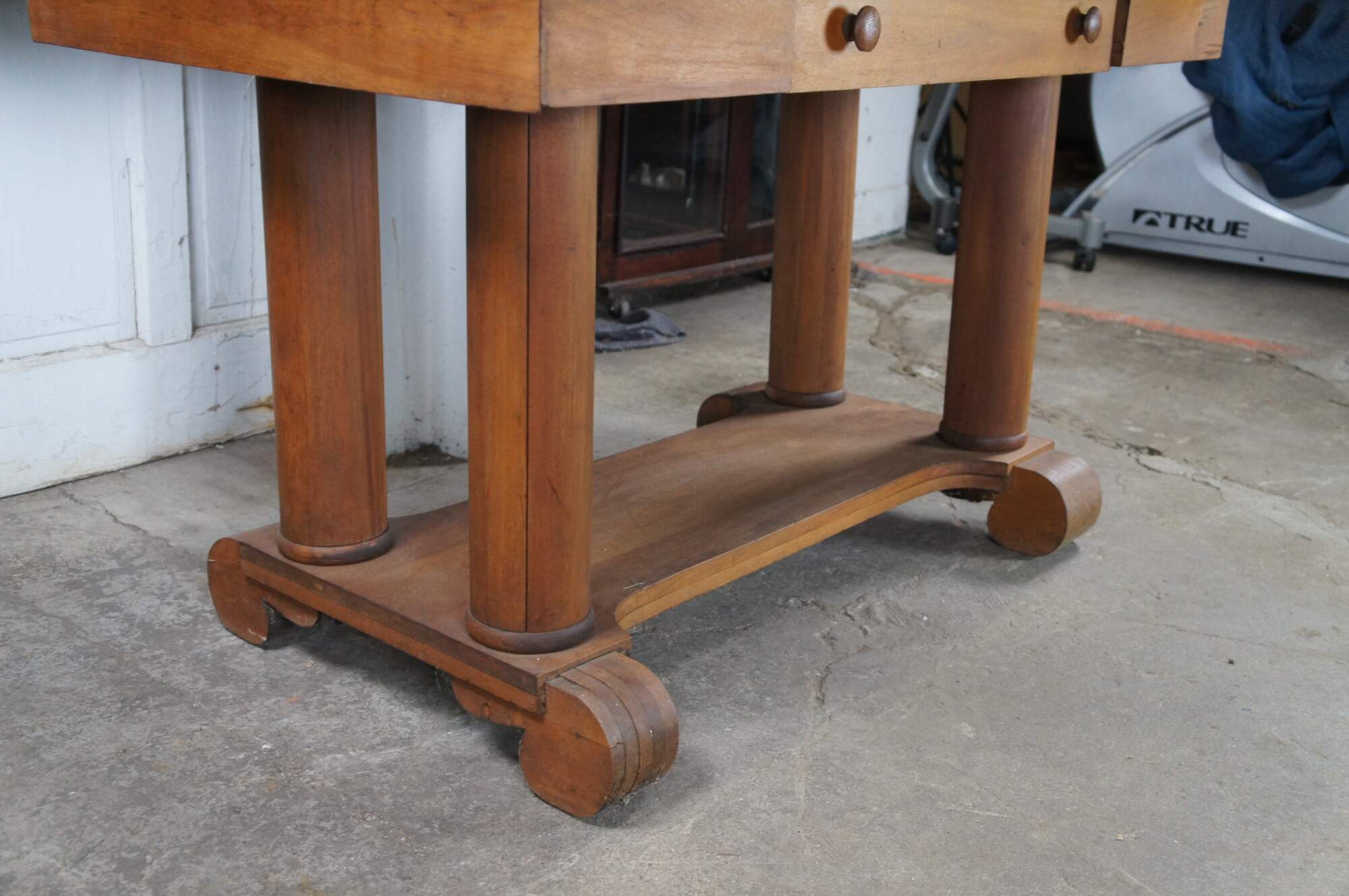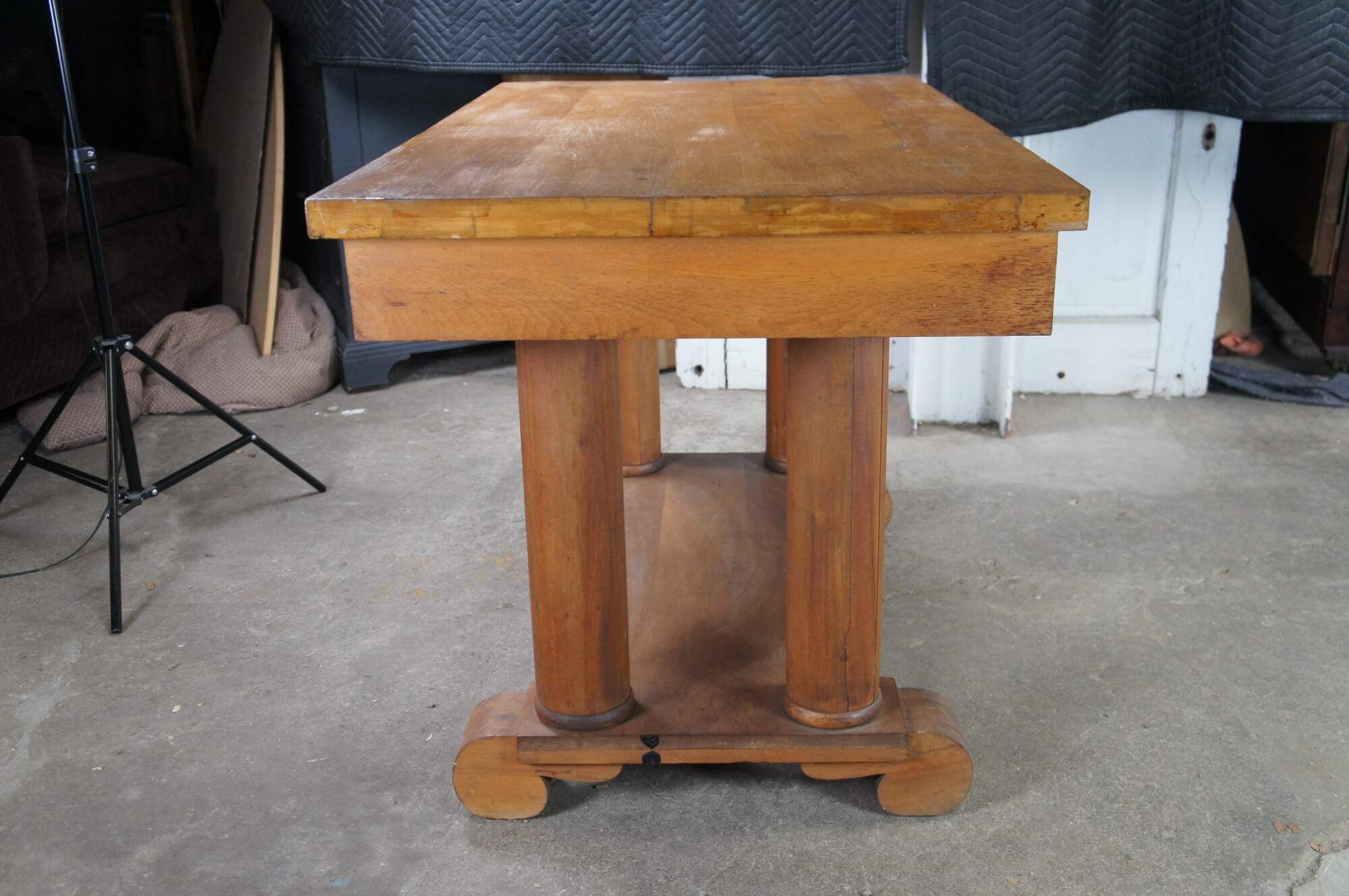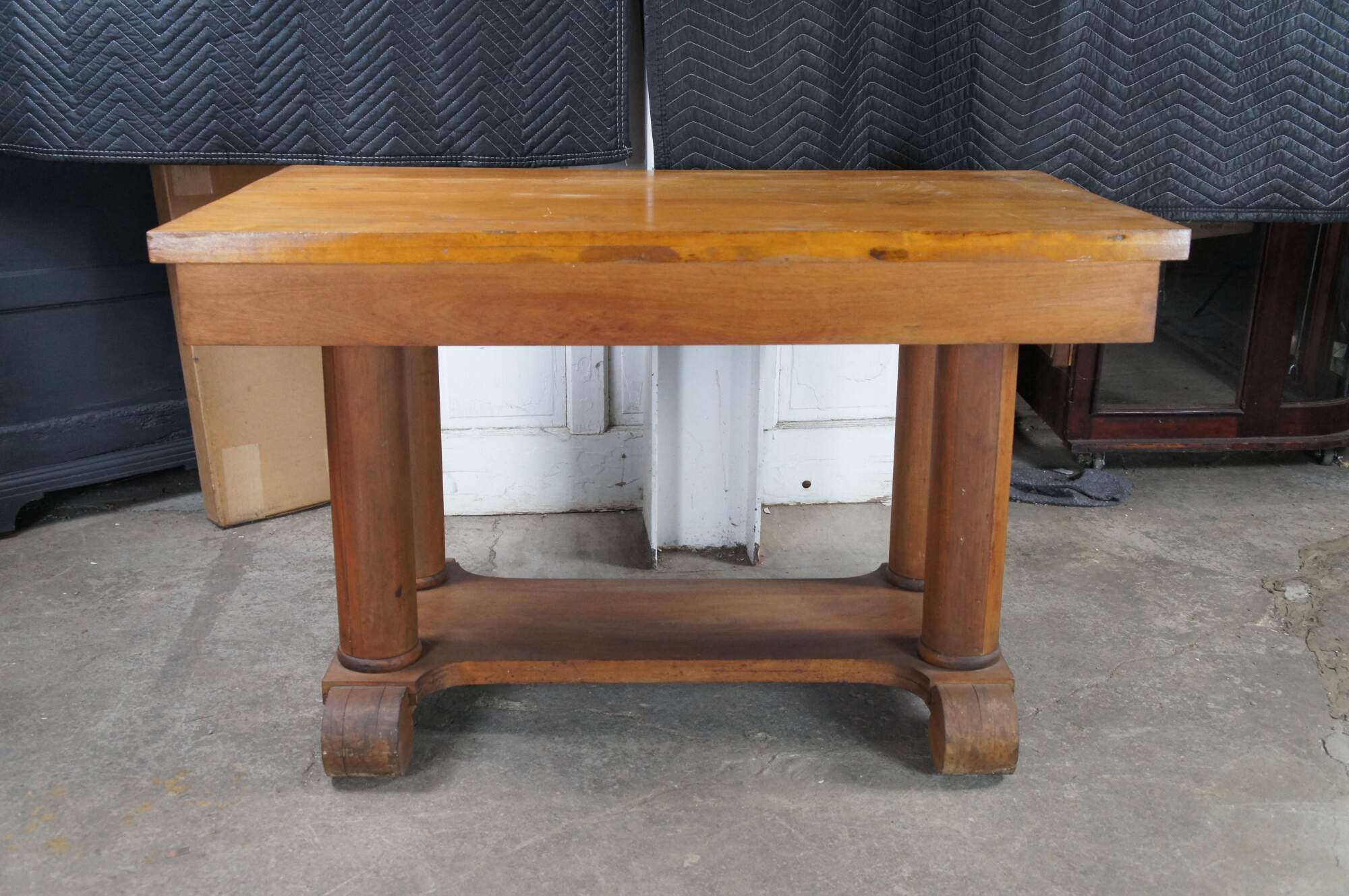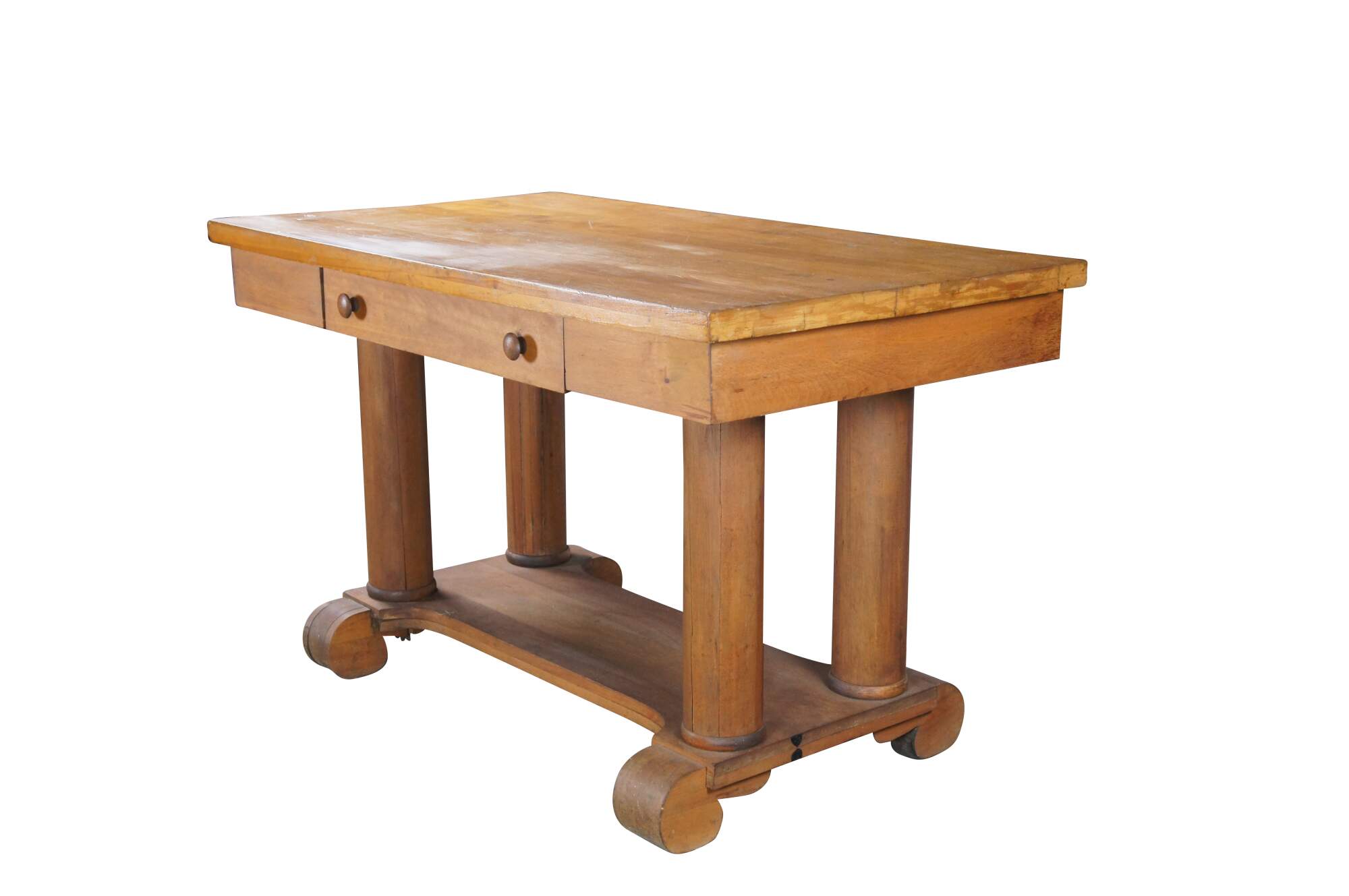 Early 20th Century Arts & Crafts / Mission Library Table. Features a rectangular form made from oak and pine `with a central drawer over columnar supports leading to a trestle base with scrolled feet.
