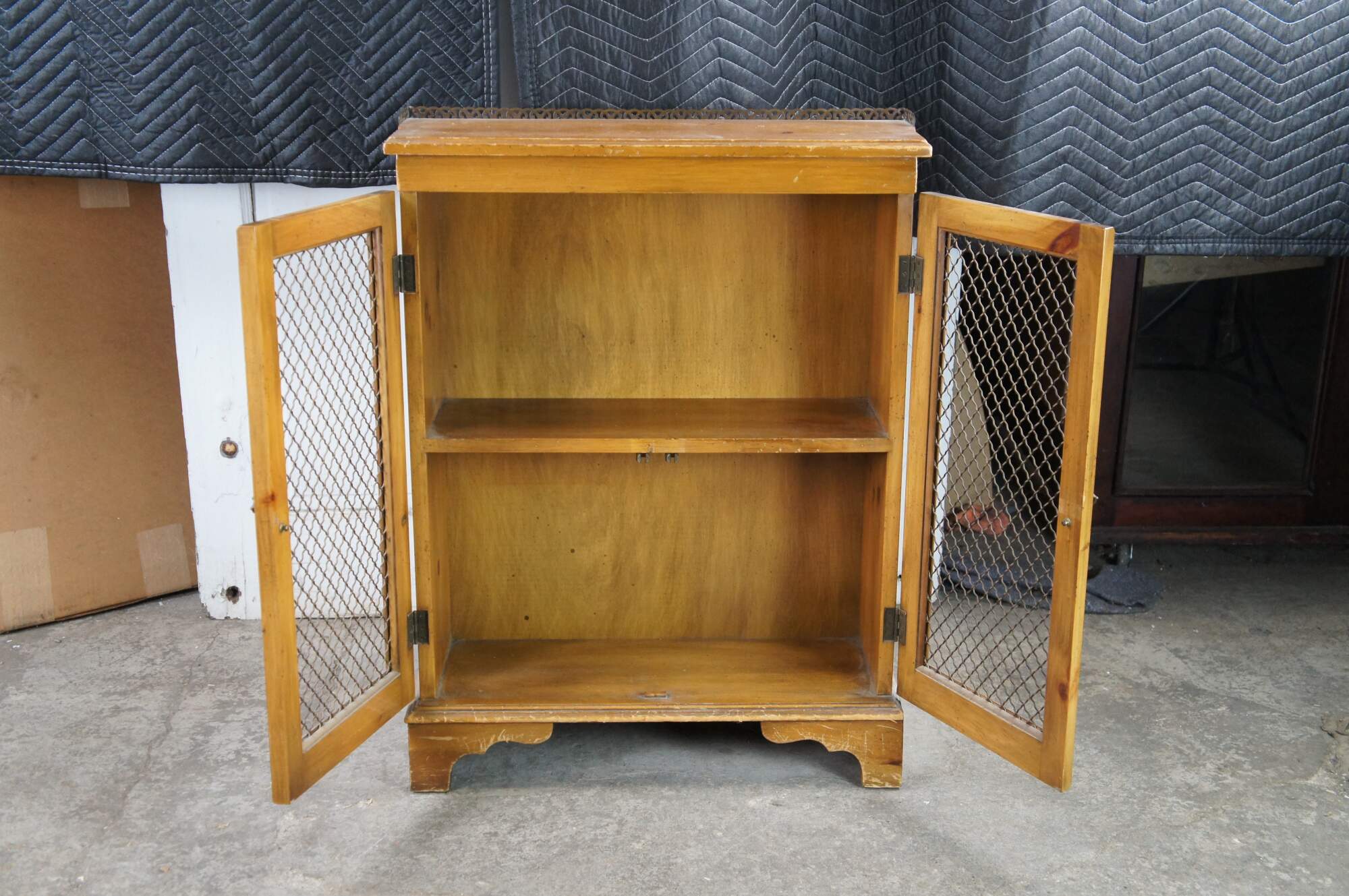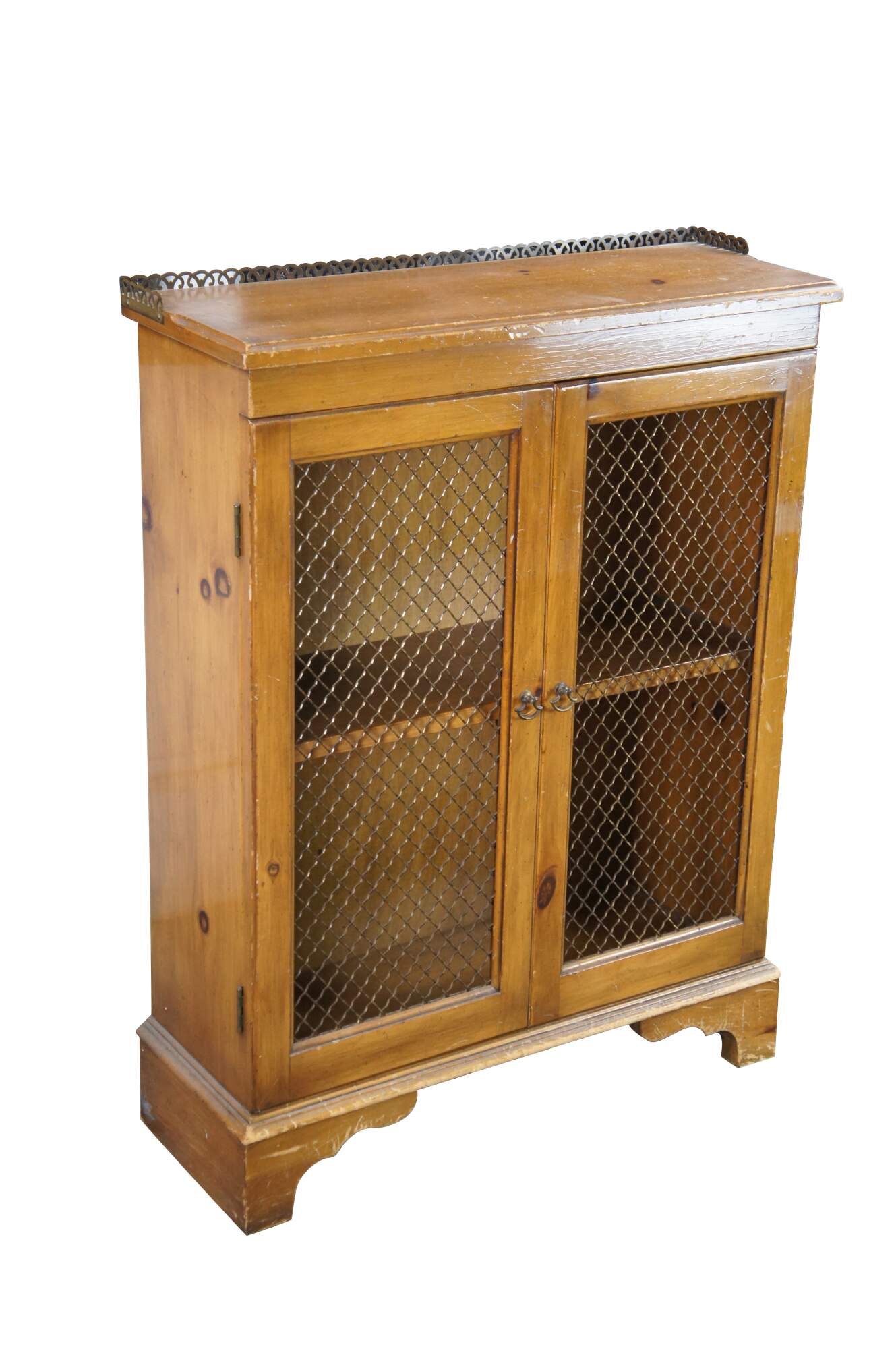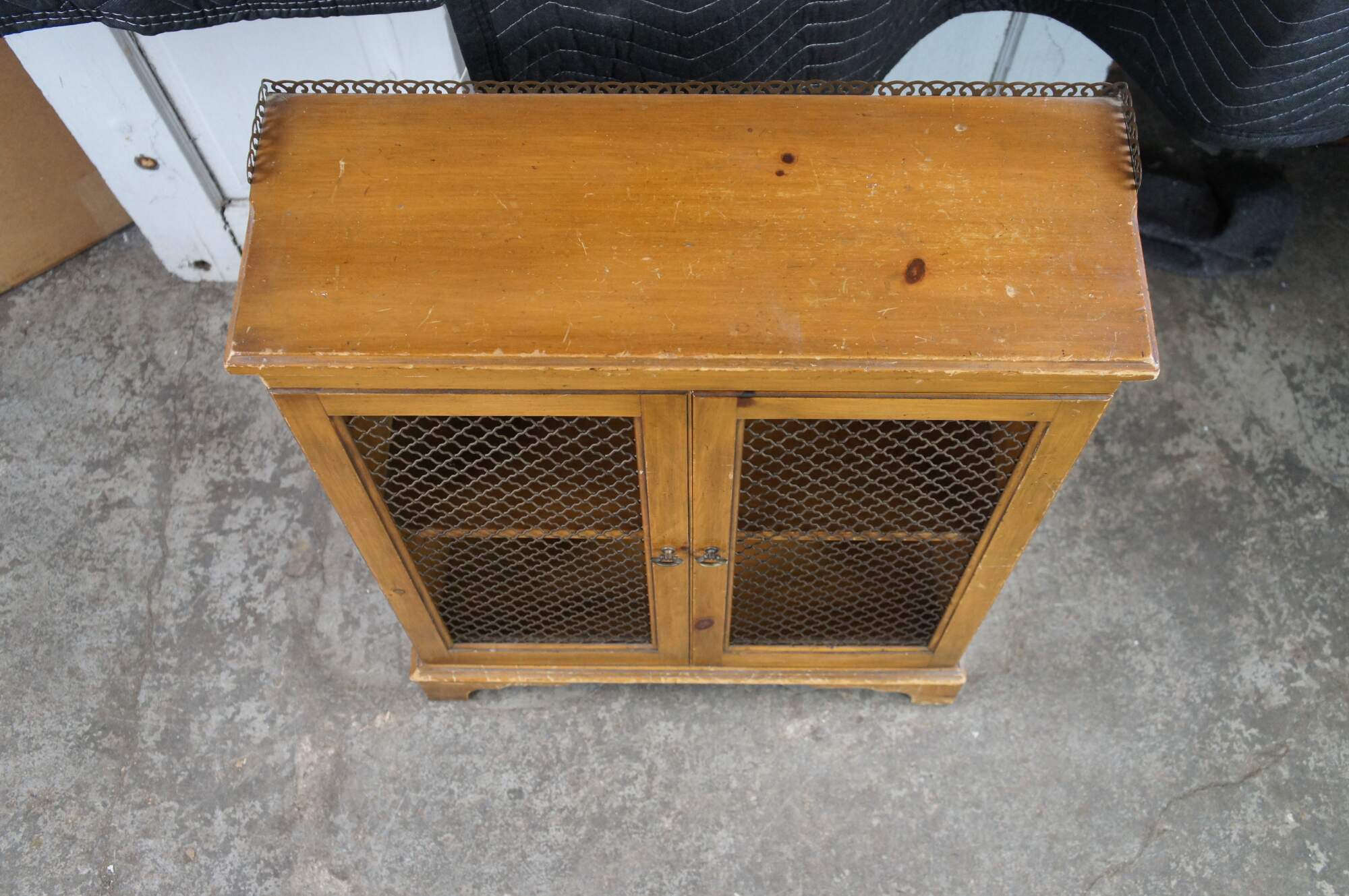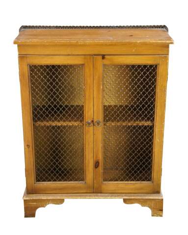 A quaint farmhouse cabinet. Made from pine with two lattice front doors opening to an interior with one shelf. Features a pierced brass gallery along the top and bracket style feet at the base. Great for use as a small booksehlf, jelly cabinet or hallway console.