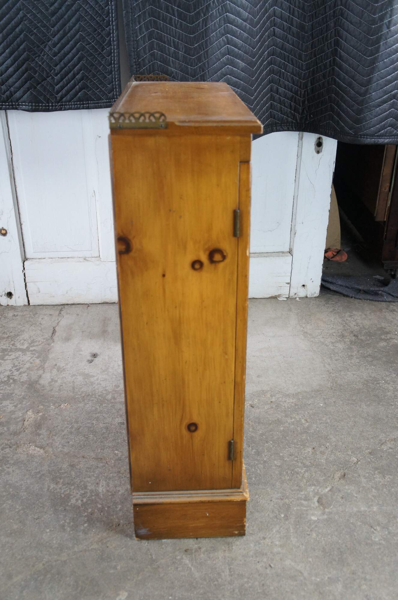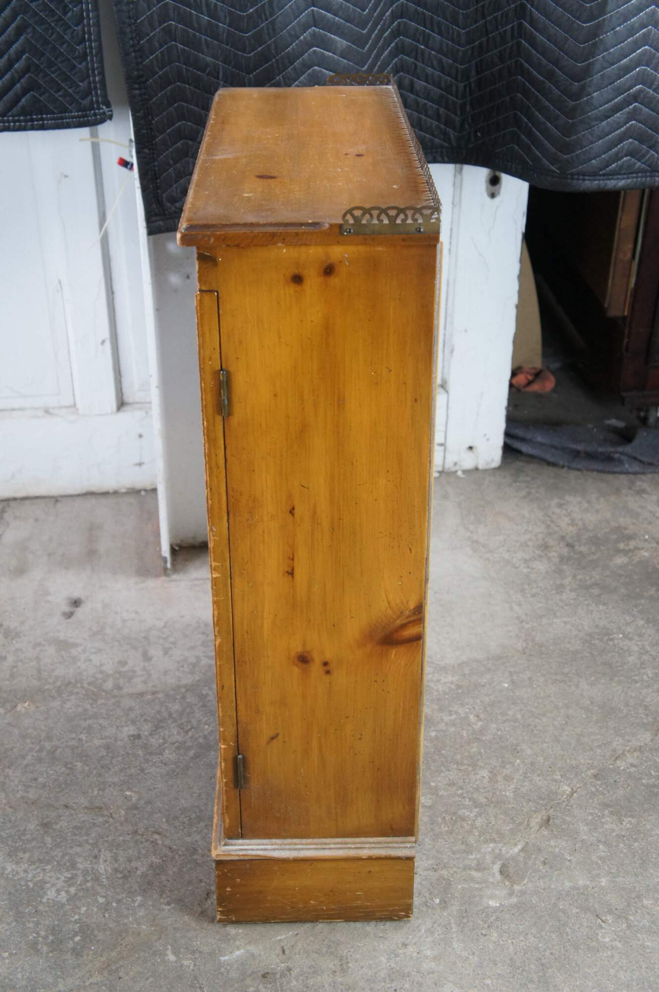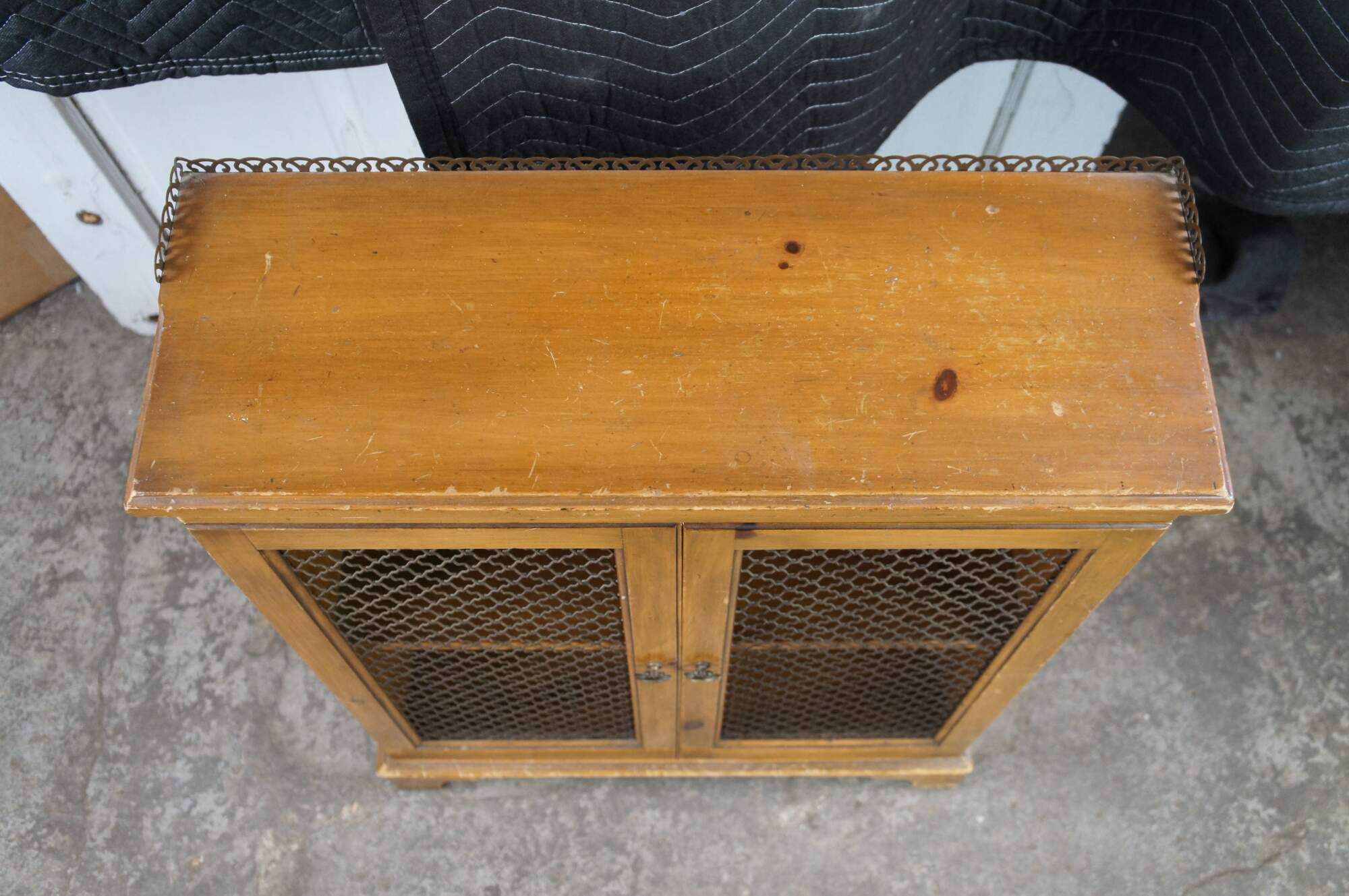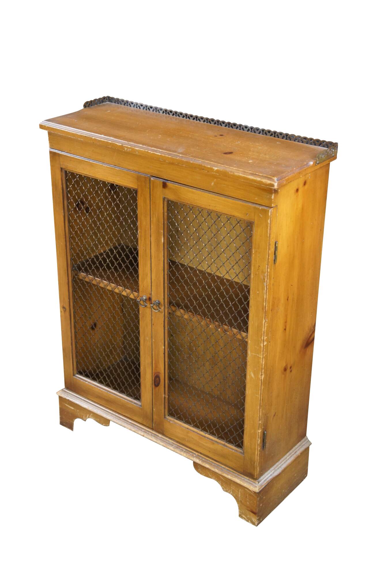 A quaint farmhouse cabinet. Made from pine with two lattice front doors opening to an interior with one shelf. Features a pierced brass gallery along the top and bracket style feet at the base. Great for use as a small booksehlf, jelly cabinet or hallway console.