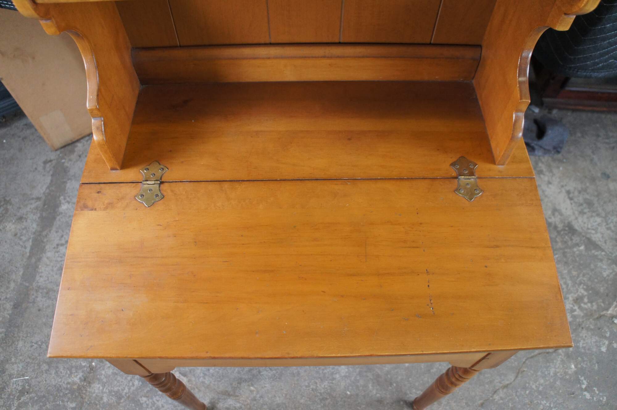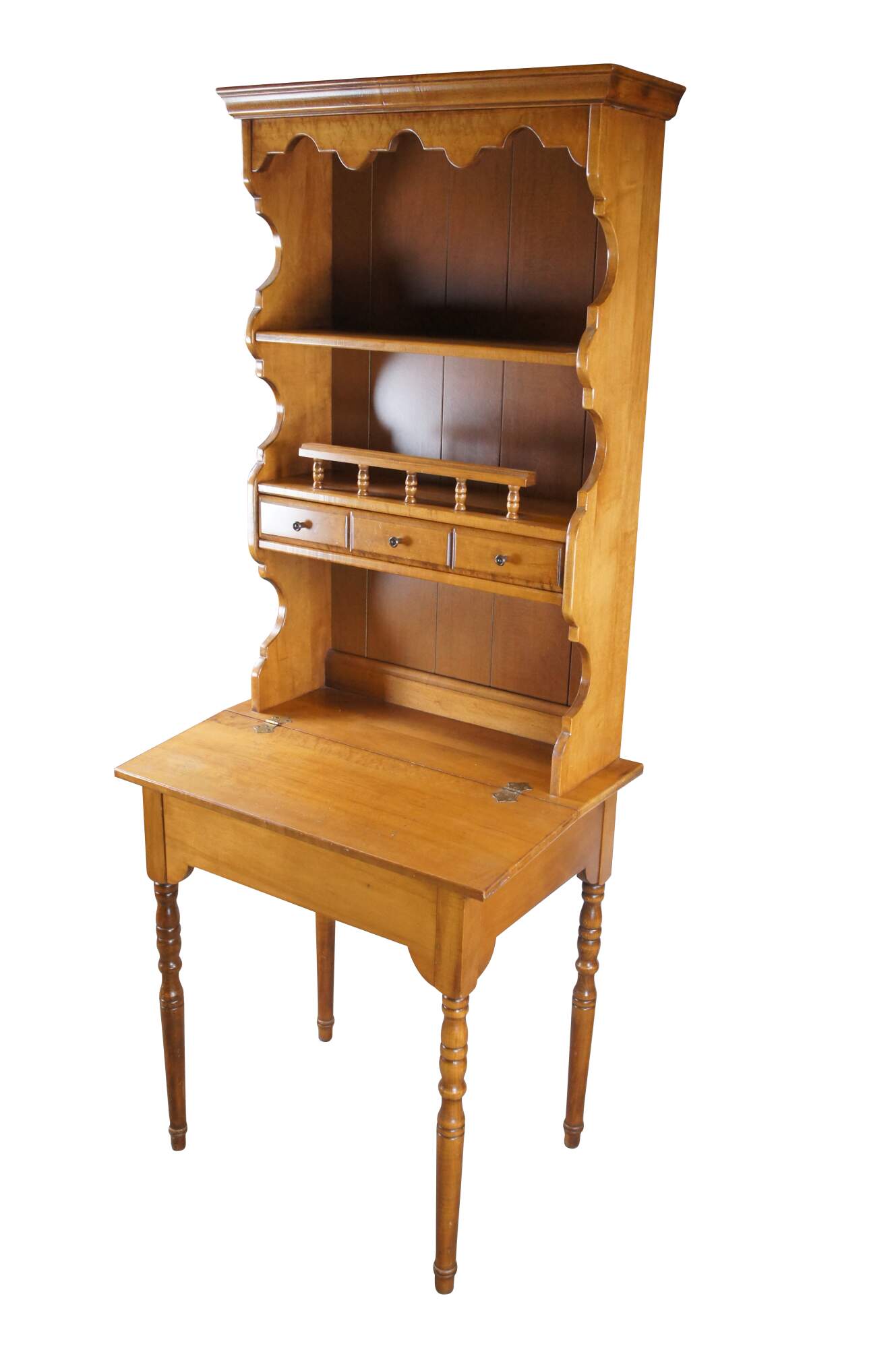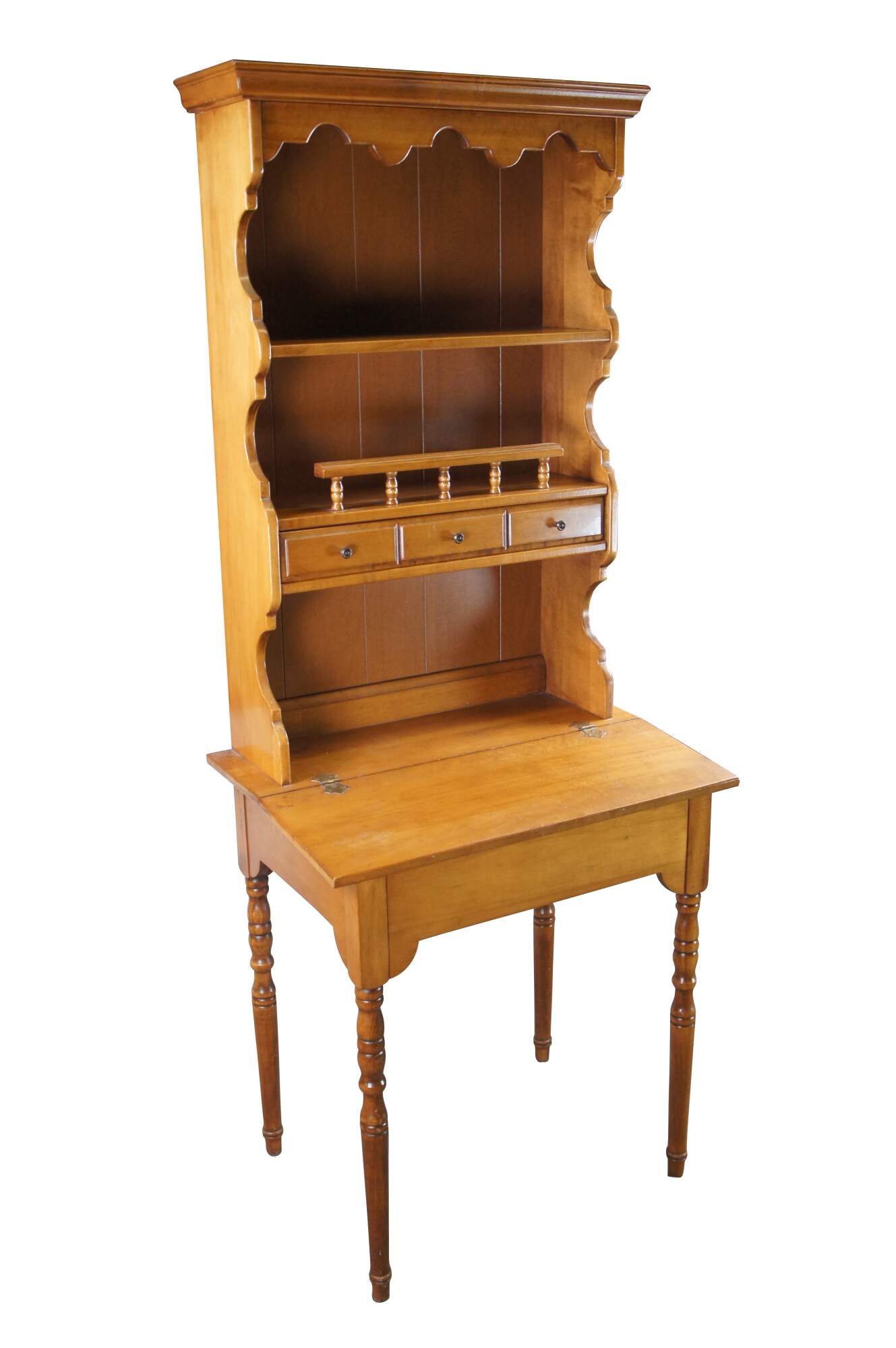 1960s American Country Dimunitive Desk & Hutch. Made from maple with a lift top writing desk topped by a large backsplash with shelves and drawer. Great for use as a bookshelf. Backsplash has serpentine cut sides, panelled back and one large dovetailed drawer made to look like it is three smaller ones. The desk is supported by turned legs with ribbed accents.