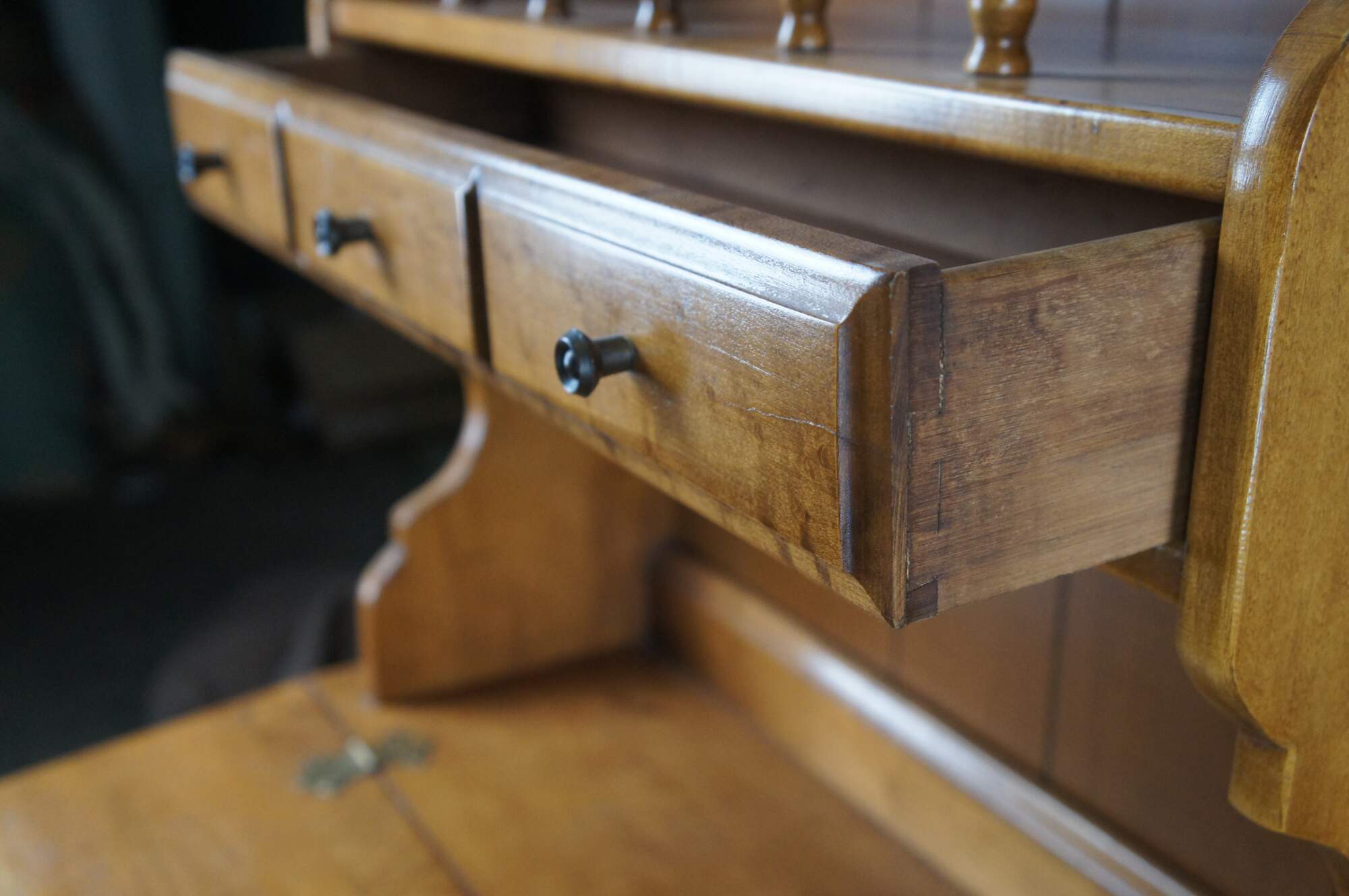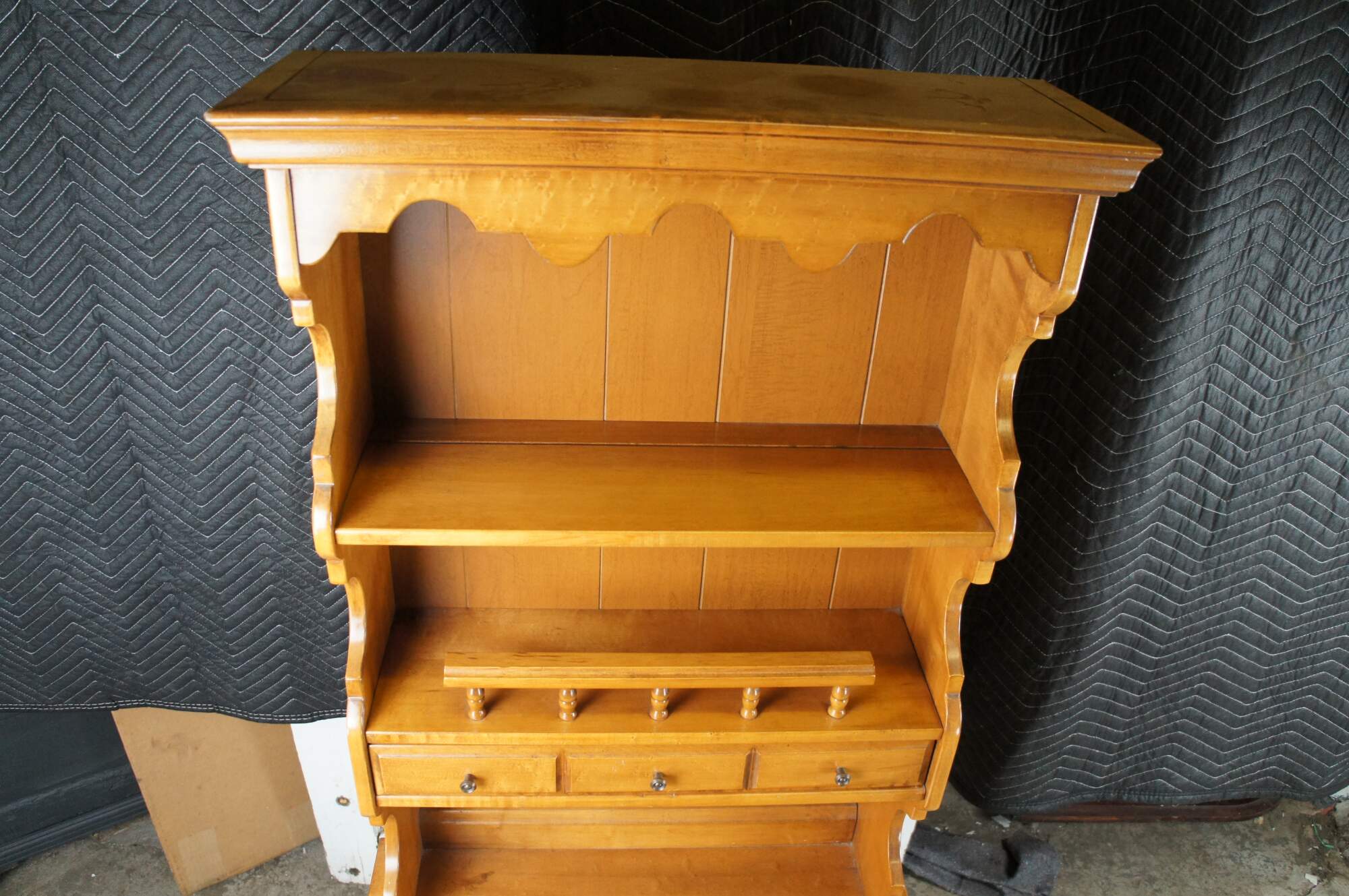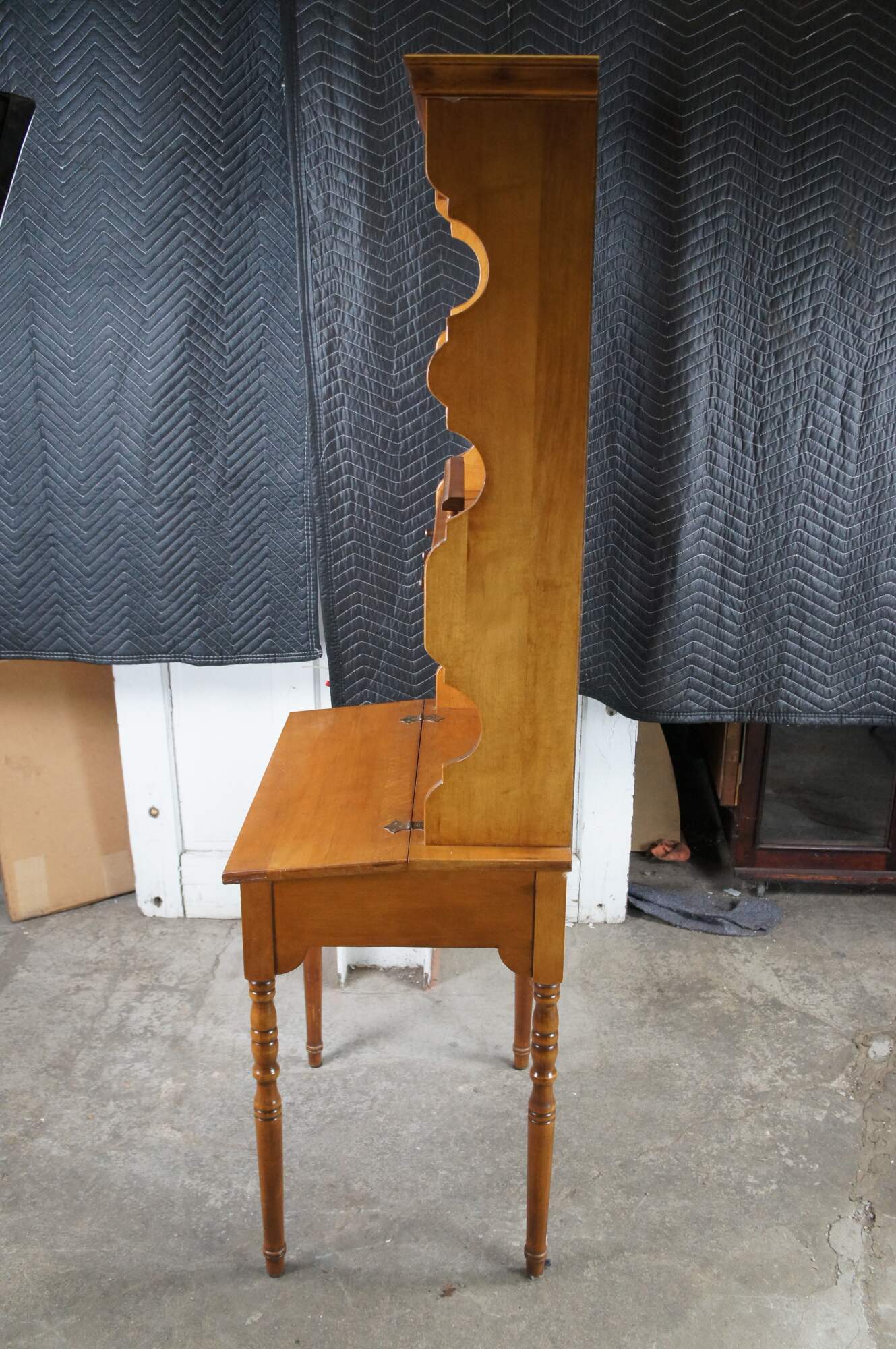 1960s American Country Dimunitive Desk & Hutch. Made from maple with a lift top writing desk topped by a large backsplash with shelves and drawer. Great for use as a bookshelf. Backsplash has serpentine cut sides, panelled back and one large dovetailed drawer made to look like it is three smaller ones. The desk is supported by turned legs with ribbed accents.