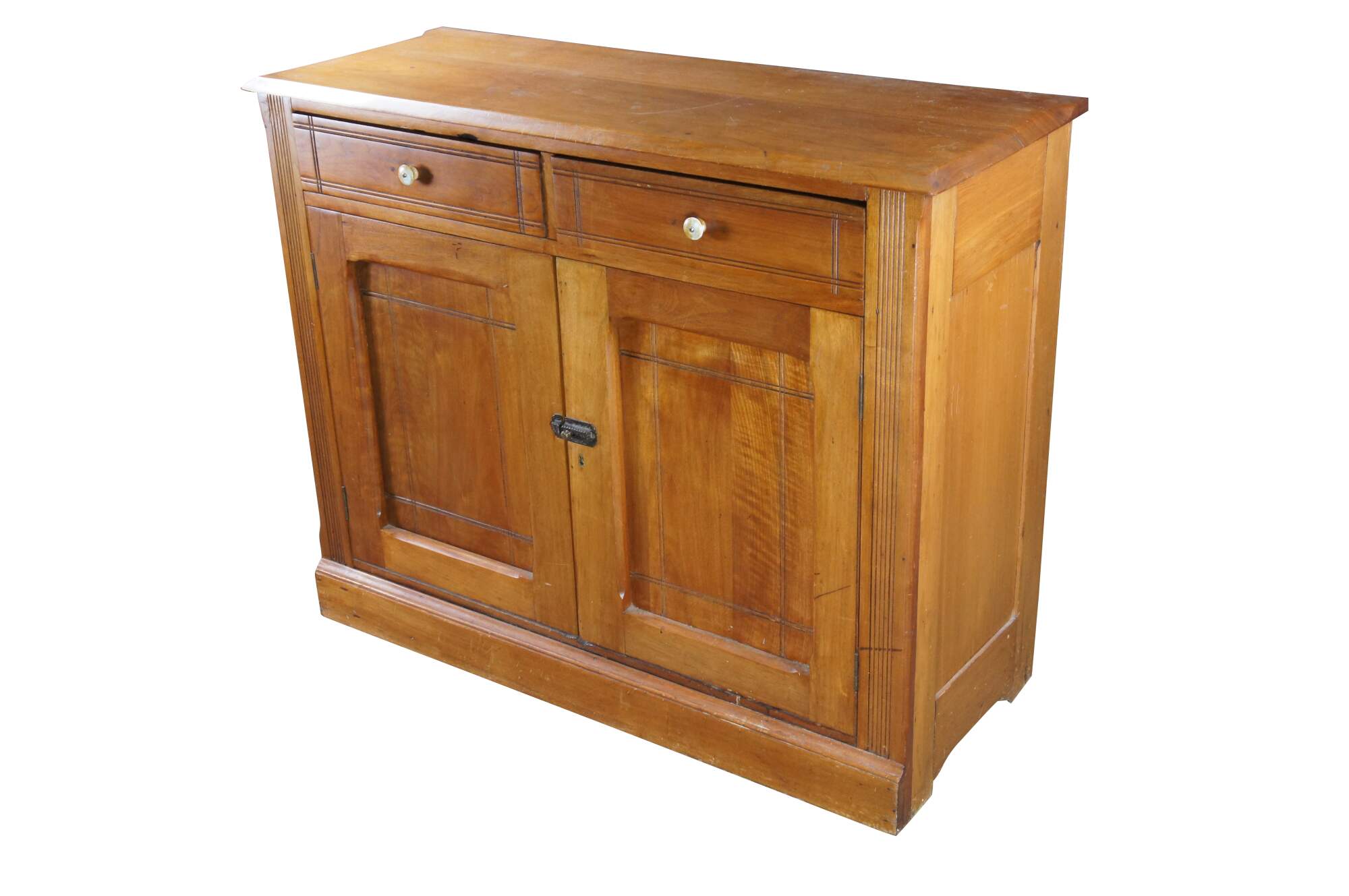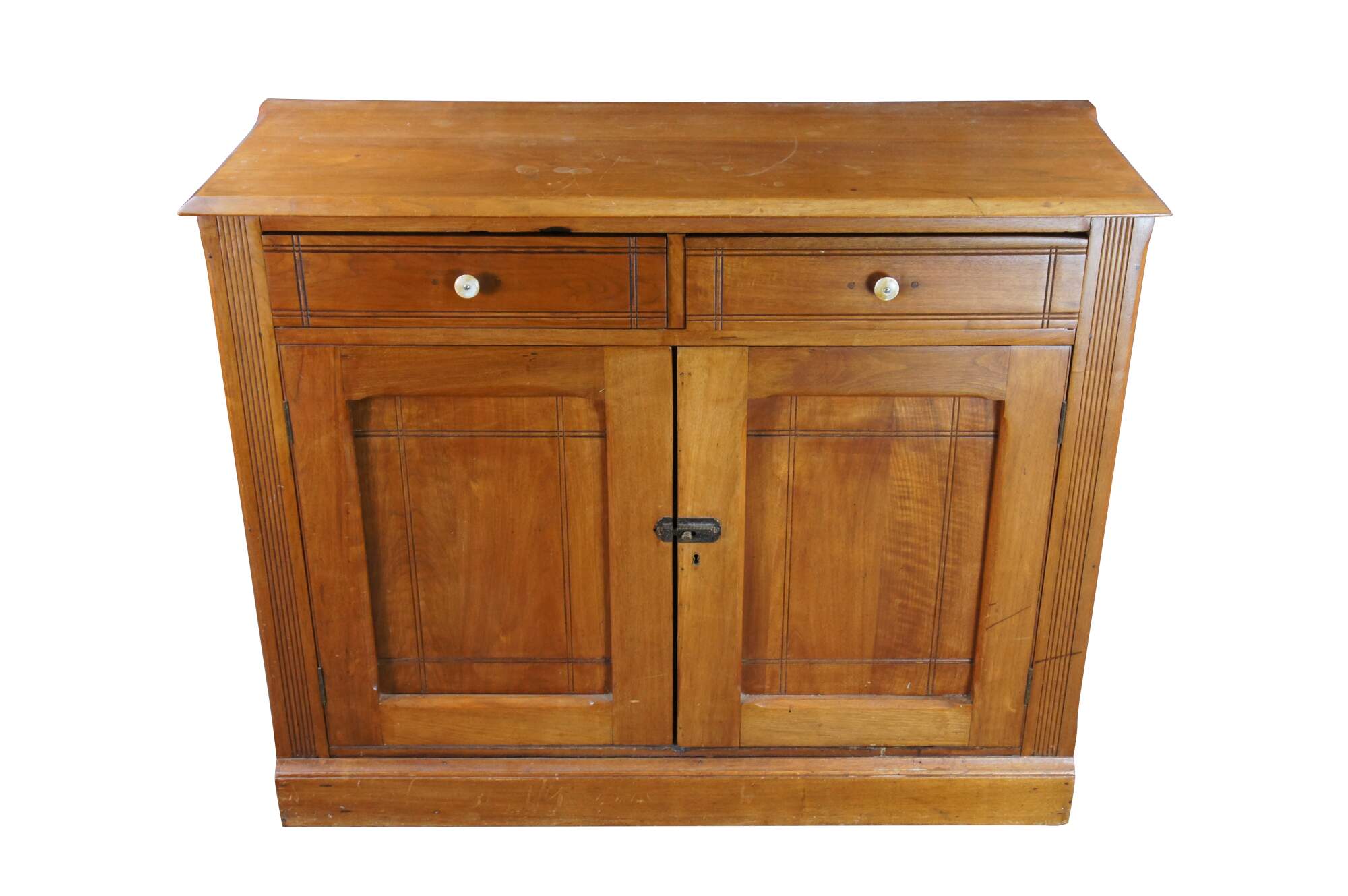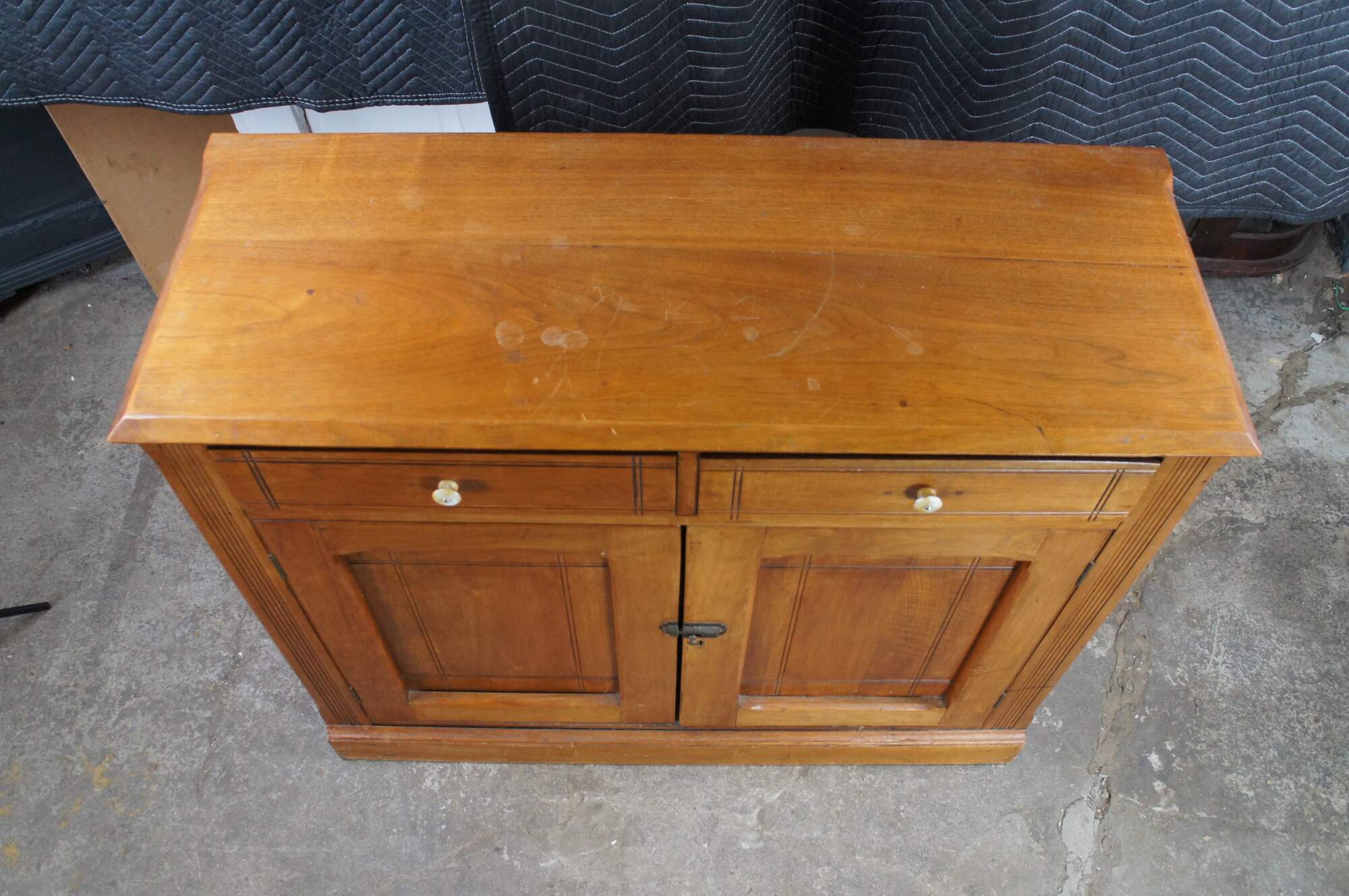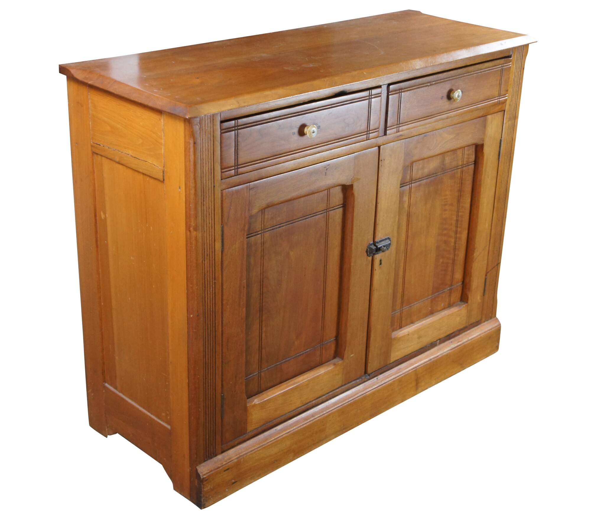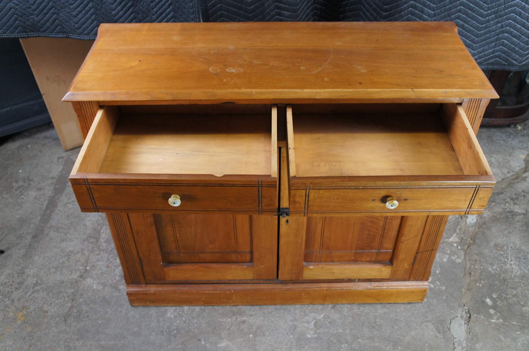 American Victorian Era Buffet or sideboard. Features a cherry frame with two knapp jointed drawers over lower cabinet with shelf. Drawers and cabinet doors have cross lined grooves. This is flanked by striped stiles along the outer edge. Drawer handles are porcelain and lower cabinet has a metal latch. A beautiful cabinet with minalist styling for the era lending well with modern farmhouse and country styling.