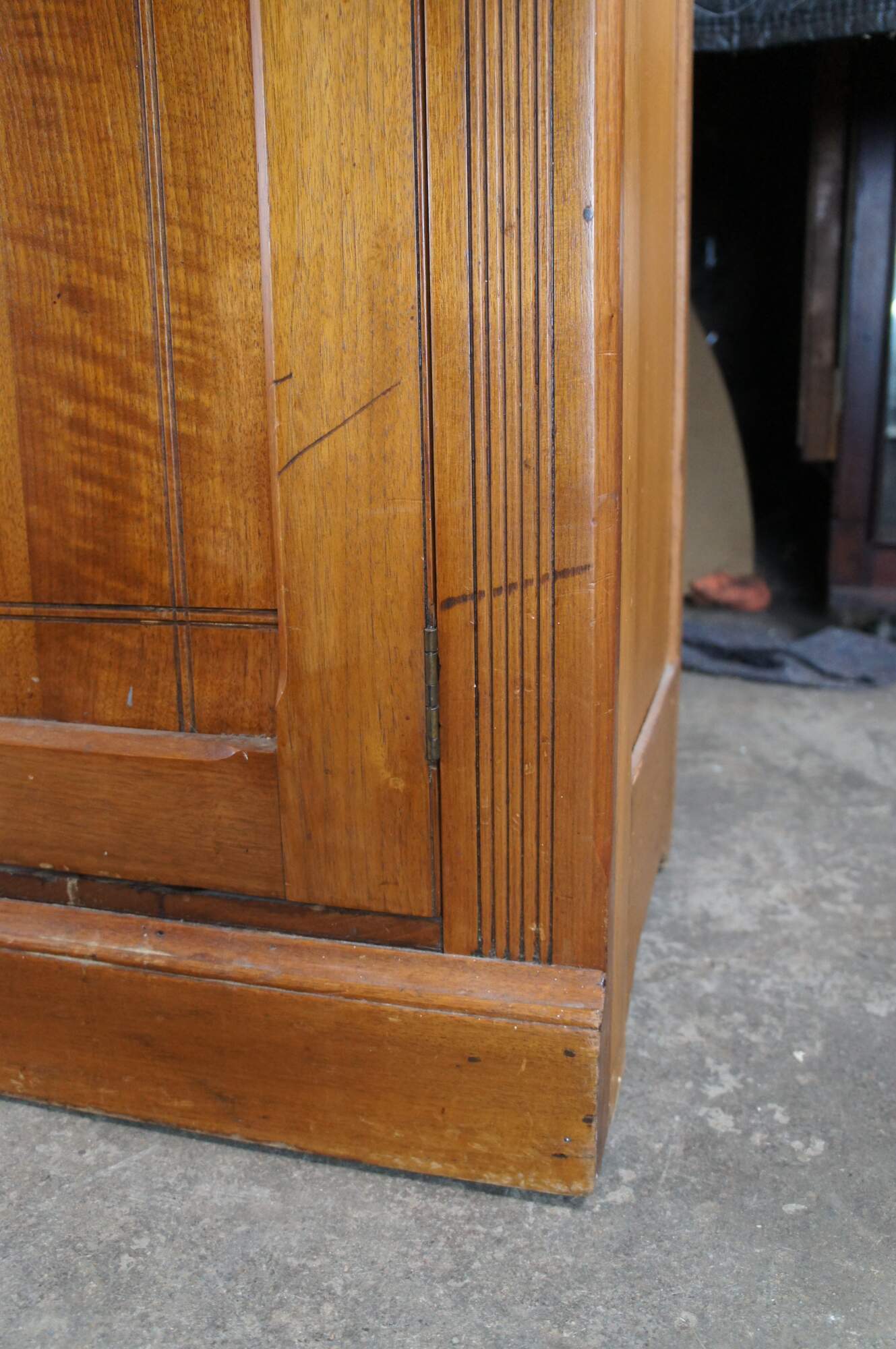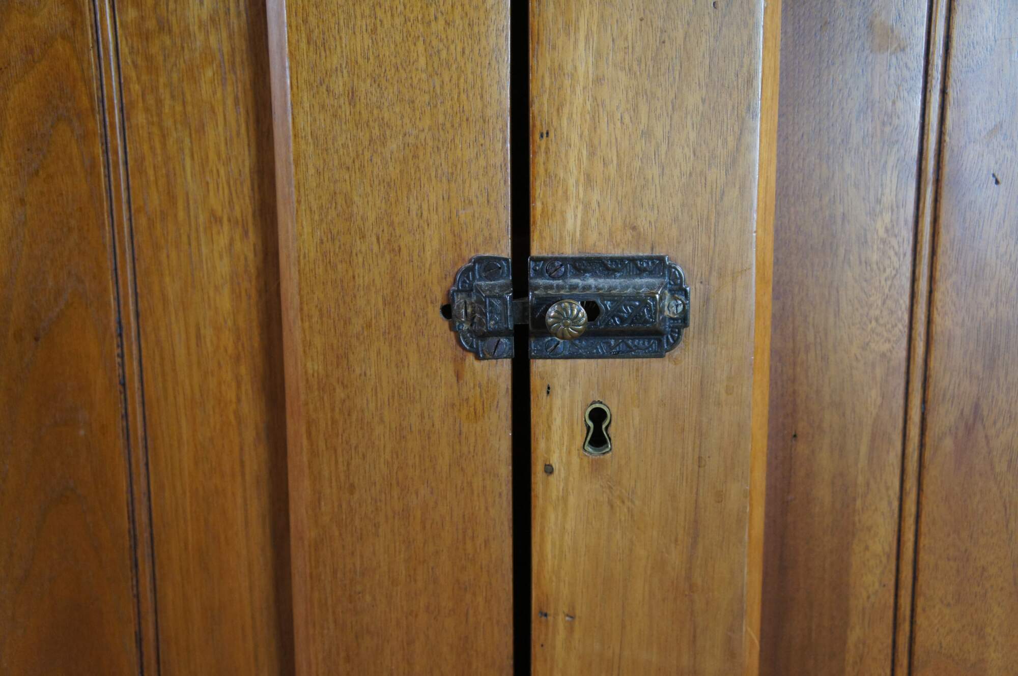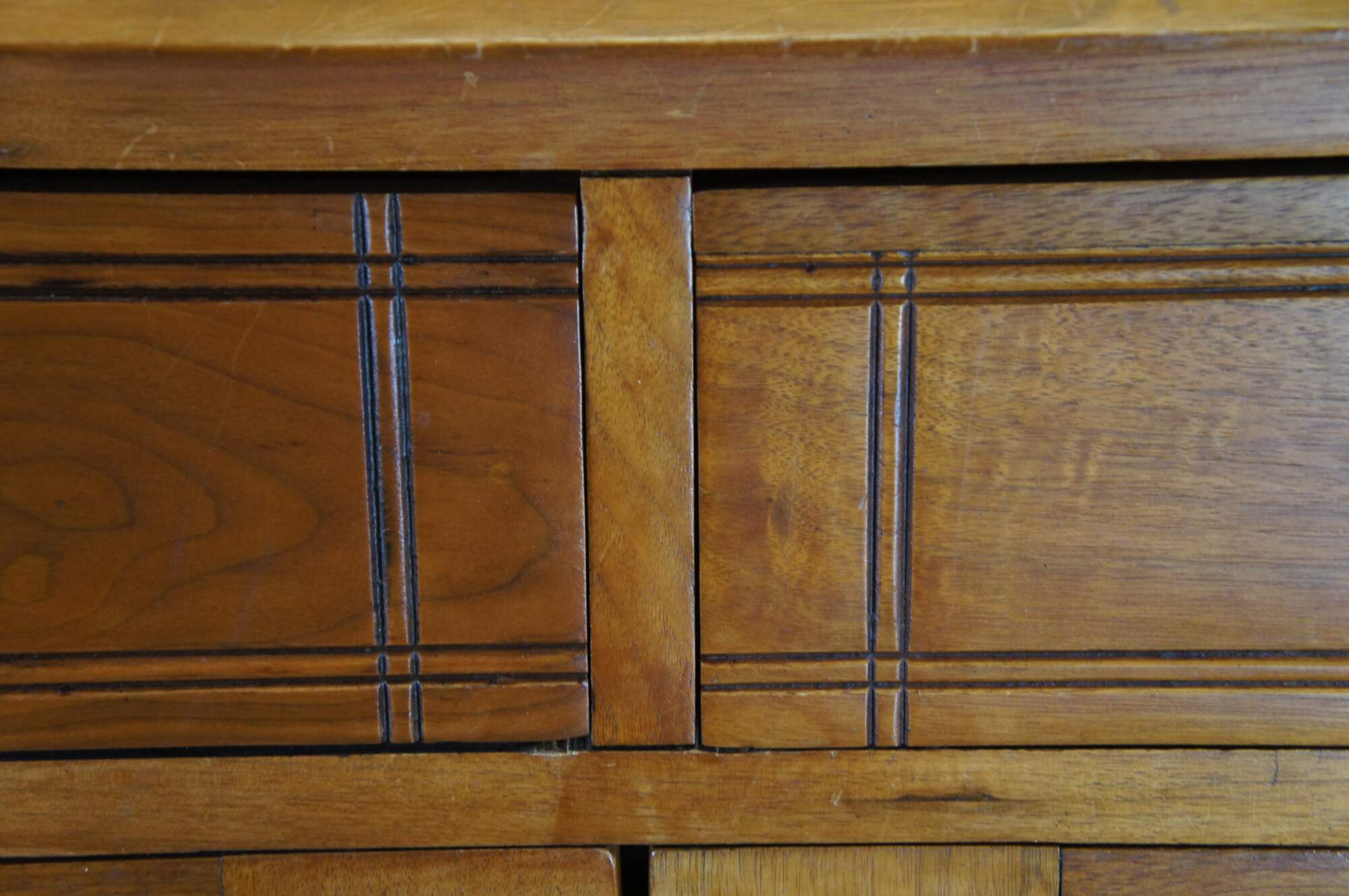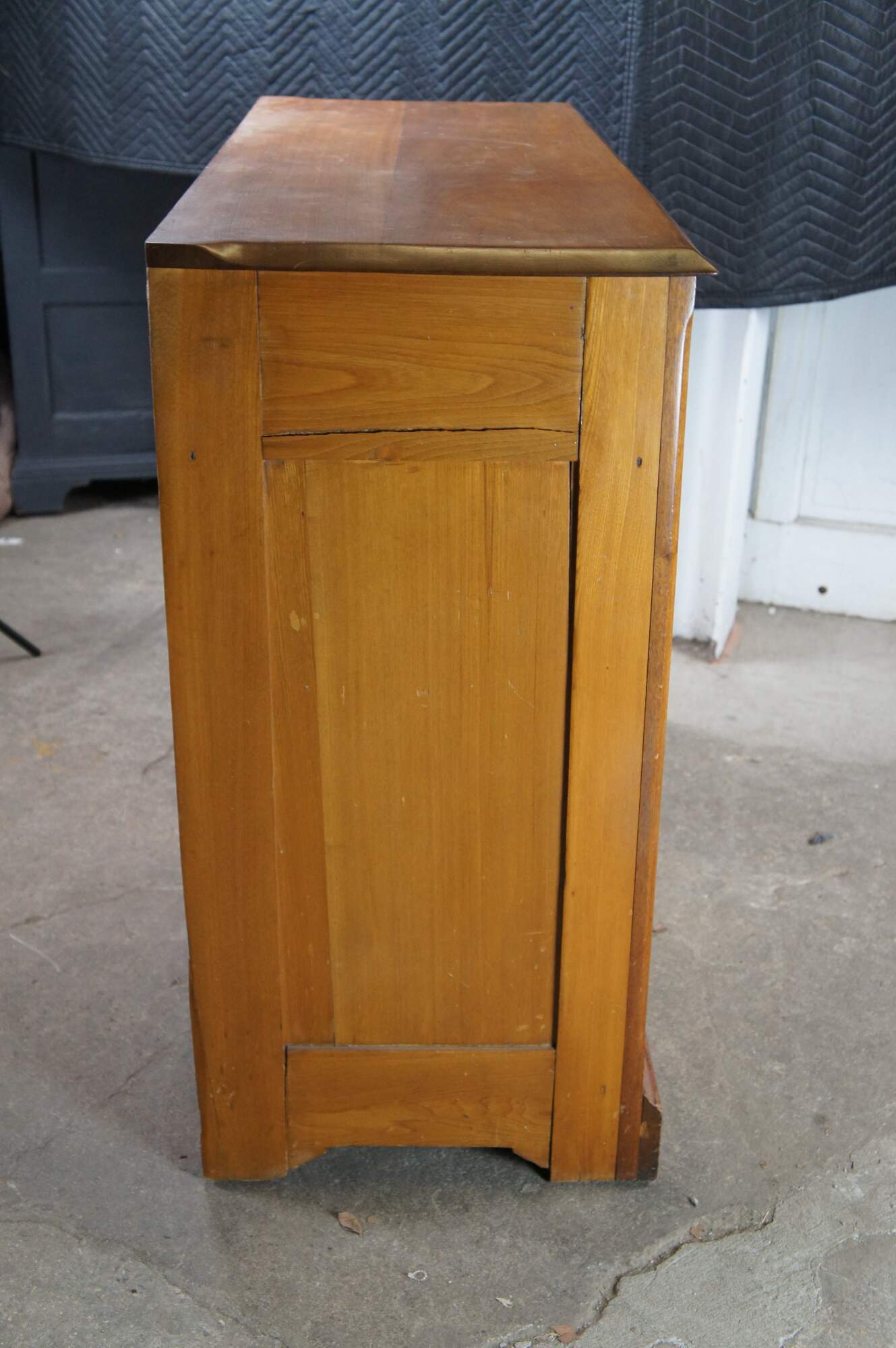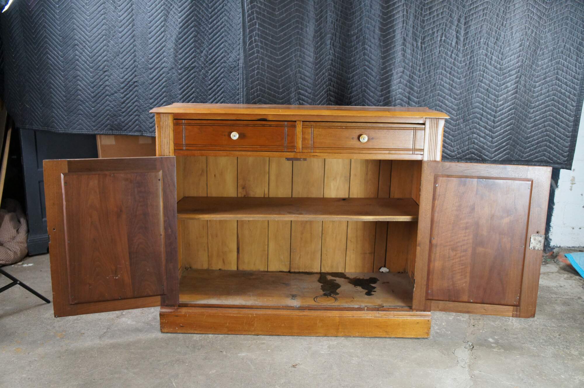 American Victorian Era Buffet or sideboard. Features a cherry frame with two knapp jointed drawers over lower cabinet with shelf. Drawers and cabinet doors have cross lined grooves. This is flanked by striped stiles along the outer edge. Drawer handles are porcelain and lower cabinet has a metal latch. A beautiful cabinet with minalist styling for the era lending well with modern farmhouse and country styling.