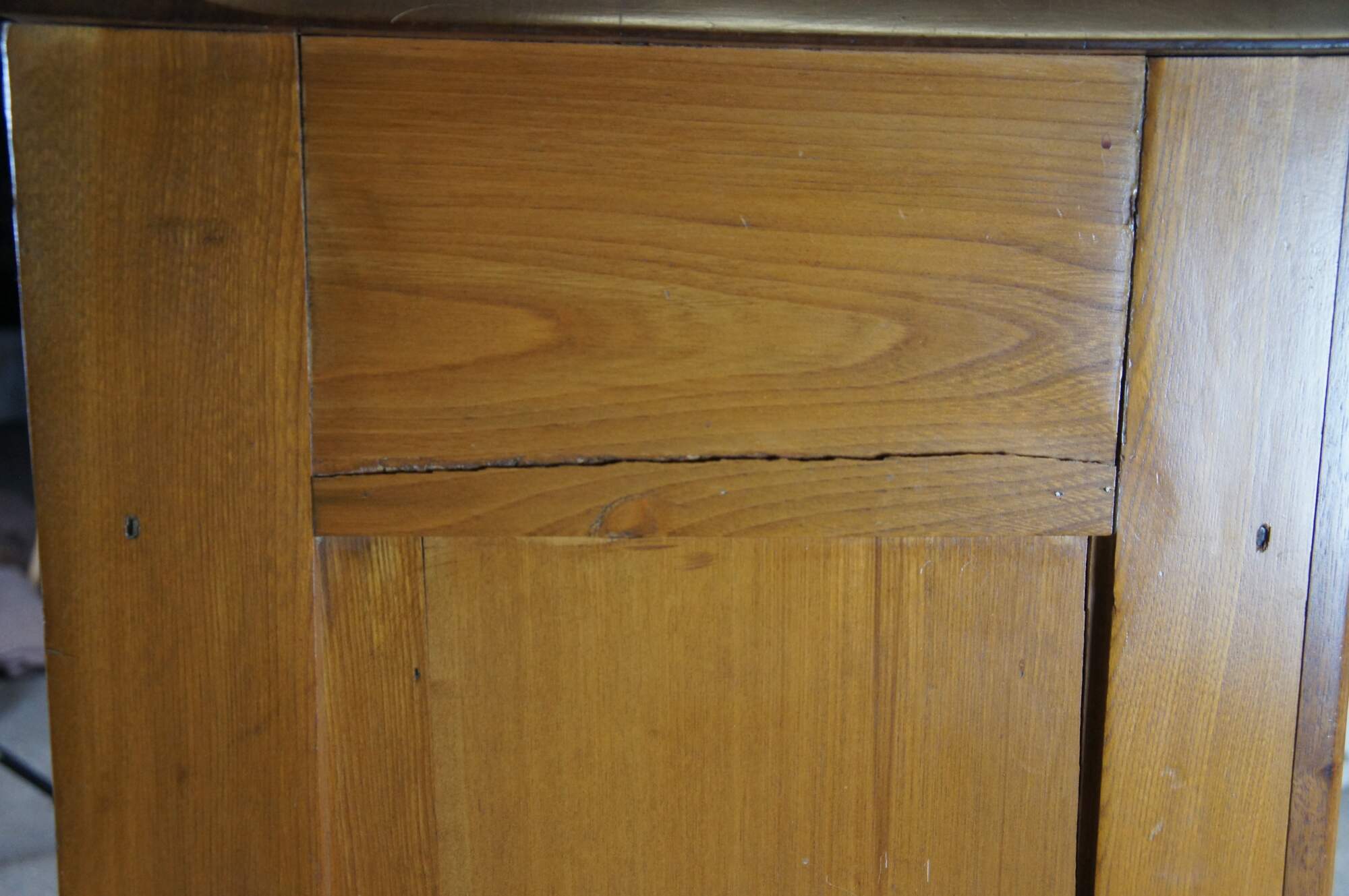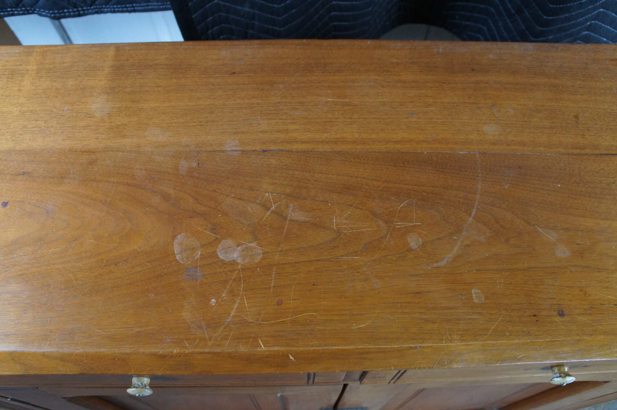 Good Condition; General wear from use and age. Structurally so, Some marks and stains to wood. Blemishing to top. Chip in top edge of left drawer