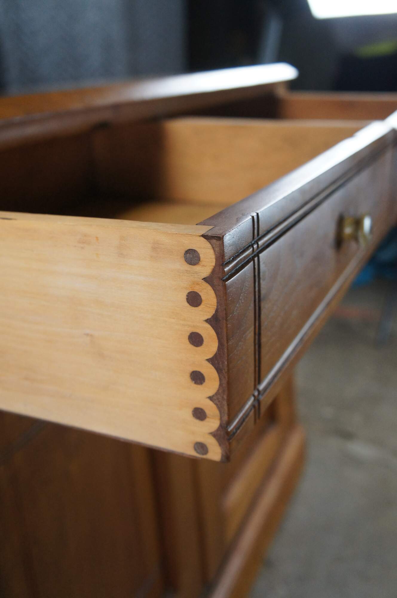 The Knapp joint was developed during the late Victoria Era in post Civil War United States. Patented by Charles Knapp of Waterloo, WI in 1867, the Knapp Joint was a huge breakthrough for the furniture industry; machines called routers made circular cuts in wood far quicker than by hand. The Knapp Joint is particularly unique to furniture as it was only used from 1870 until 1900. It is also referred to as the Pin and Cove Drawer.