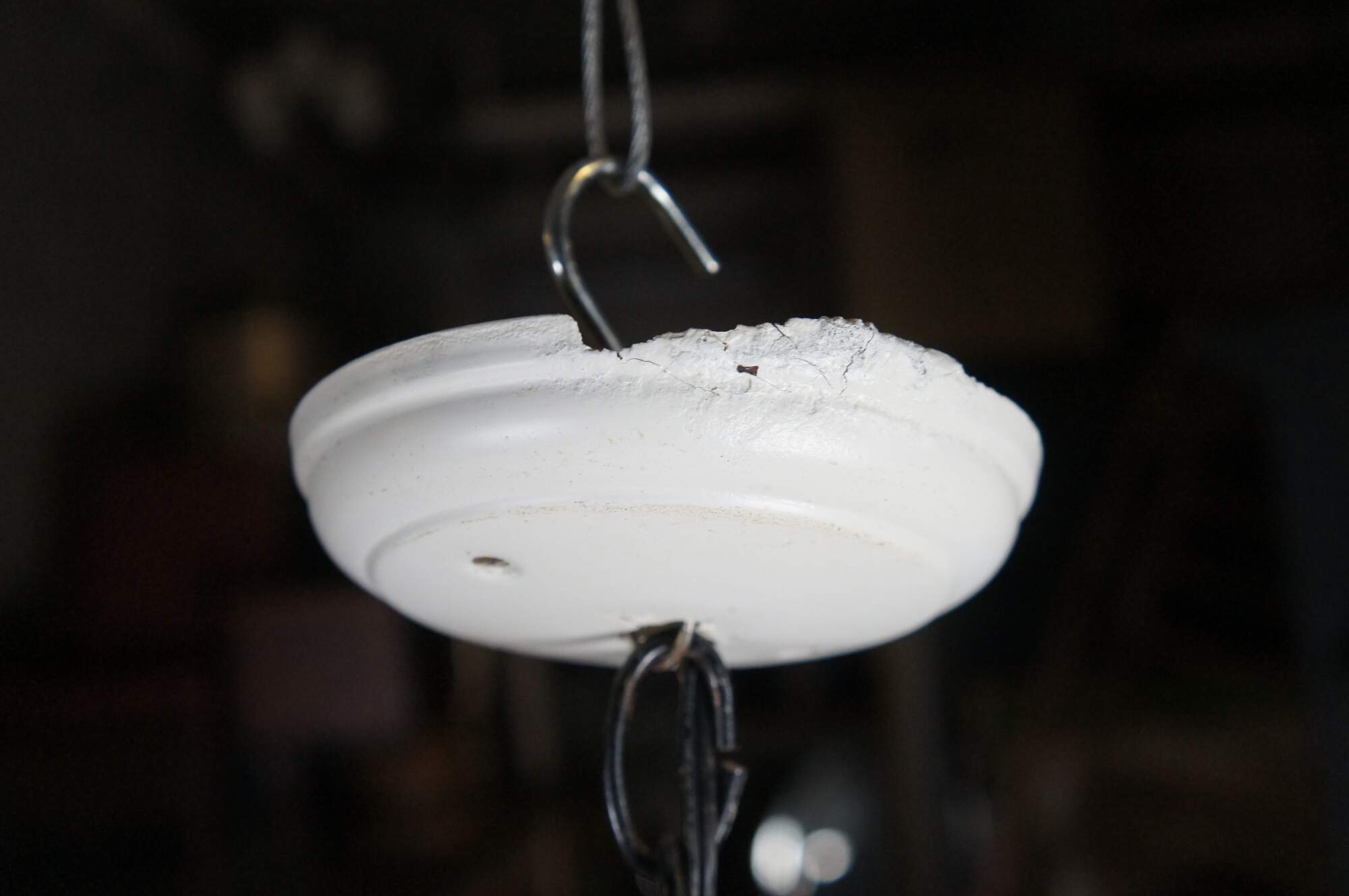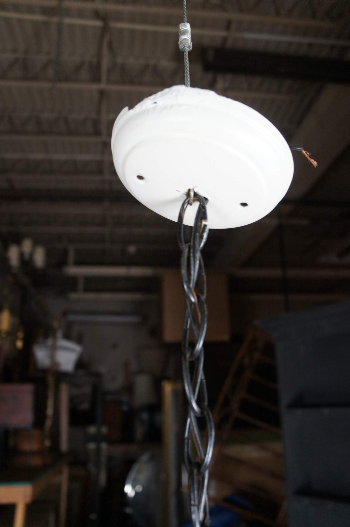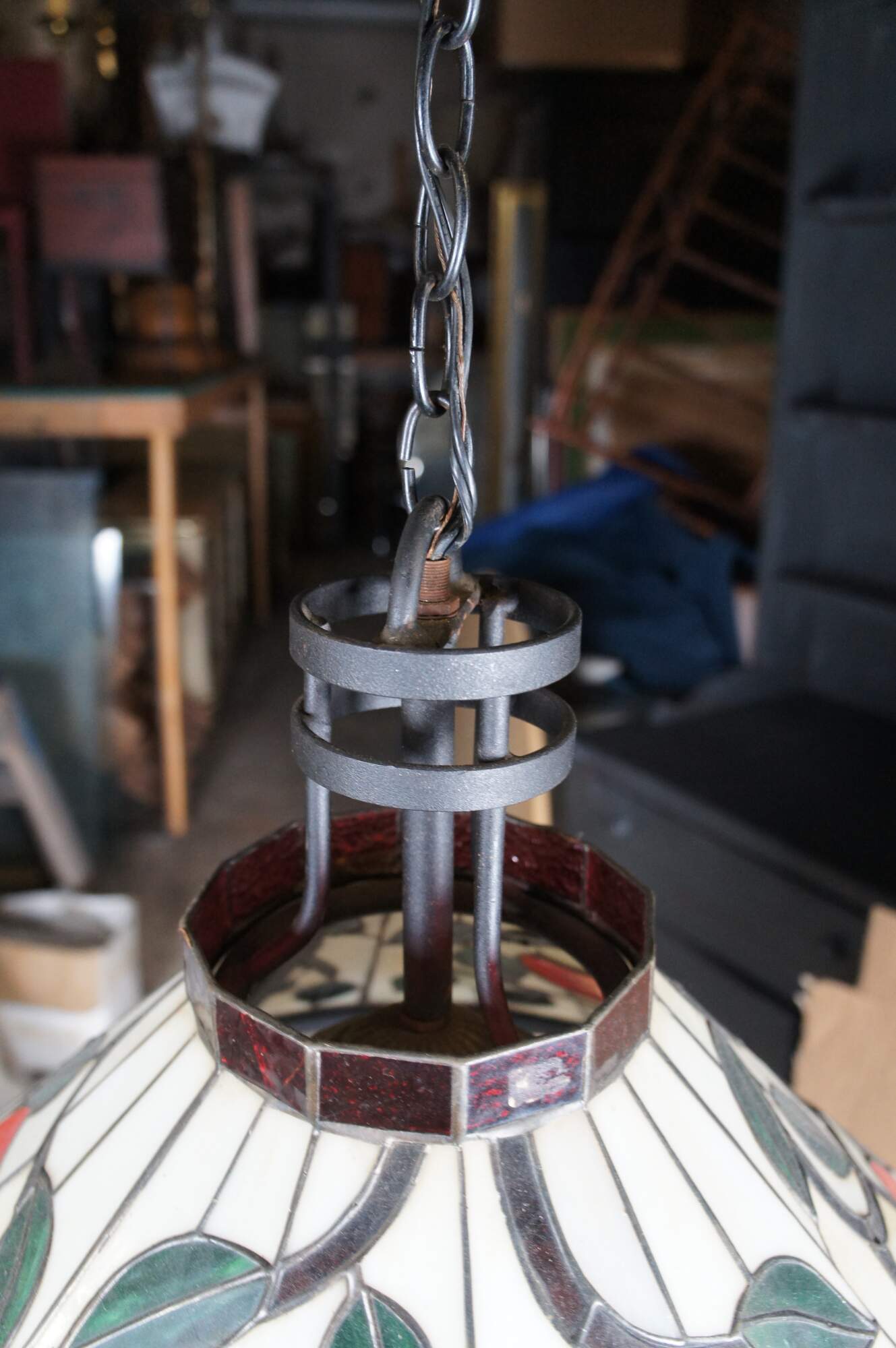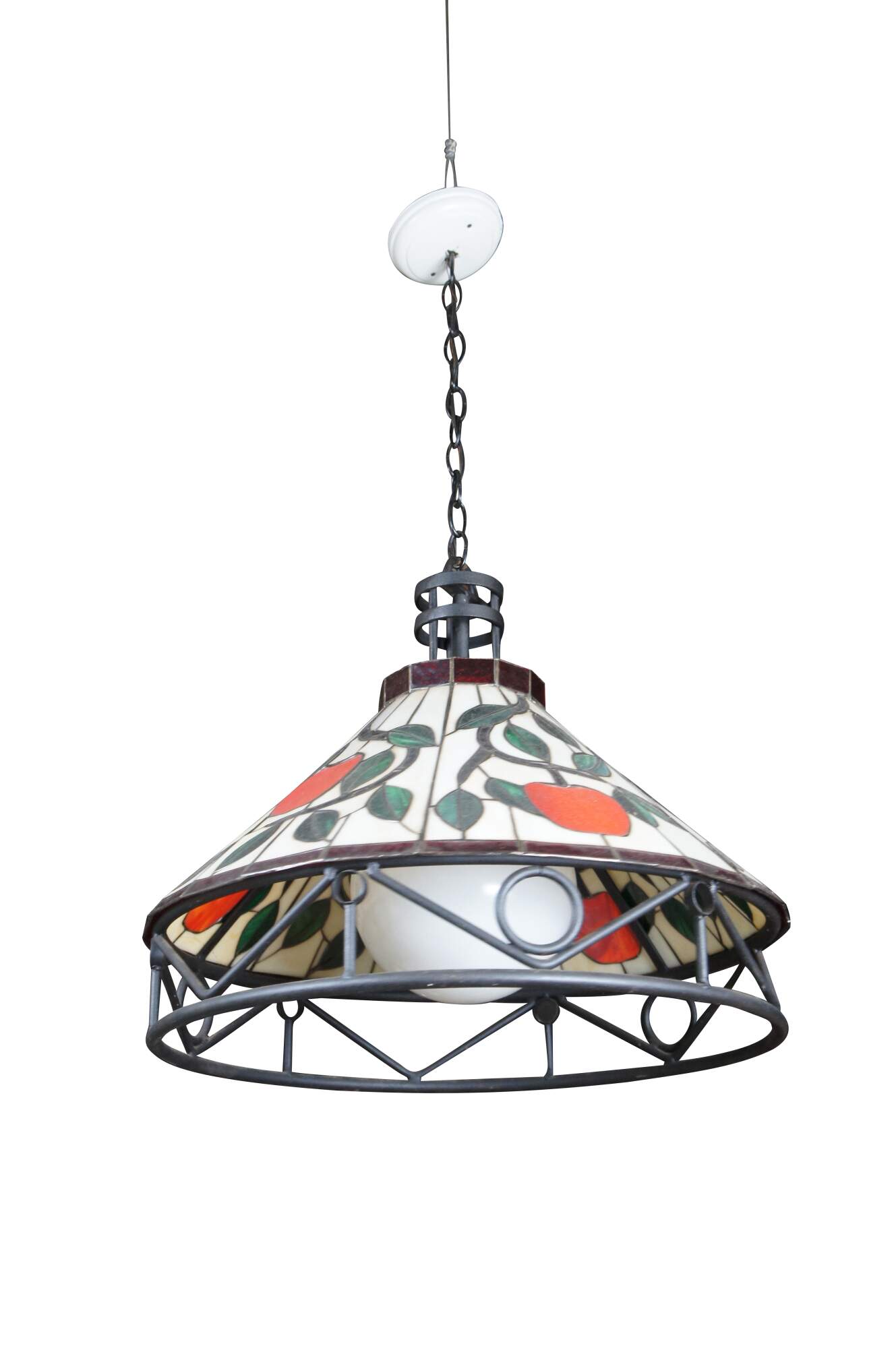 20th Century Tiffany Style Pendant Light / Chandelier. Made from iron with leaded stained glass panels featuring an apple and vine motif. Interior light is covered by a milk glass globe. The light hangs via a short chain with white pendant cap. Could be altered to use as a swag light. Circa 1970s