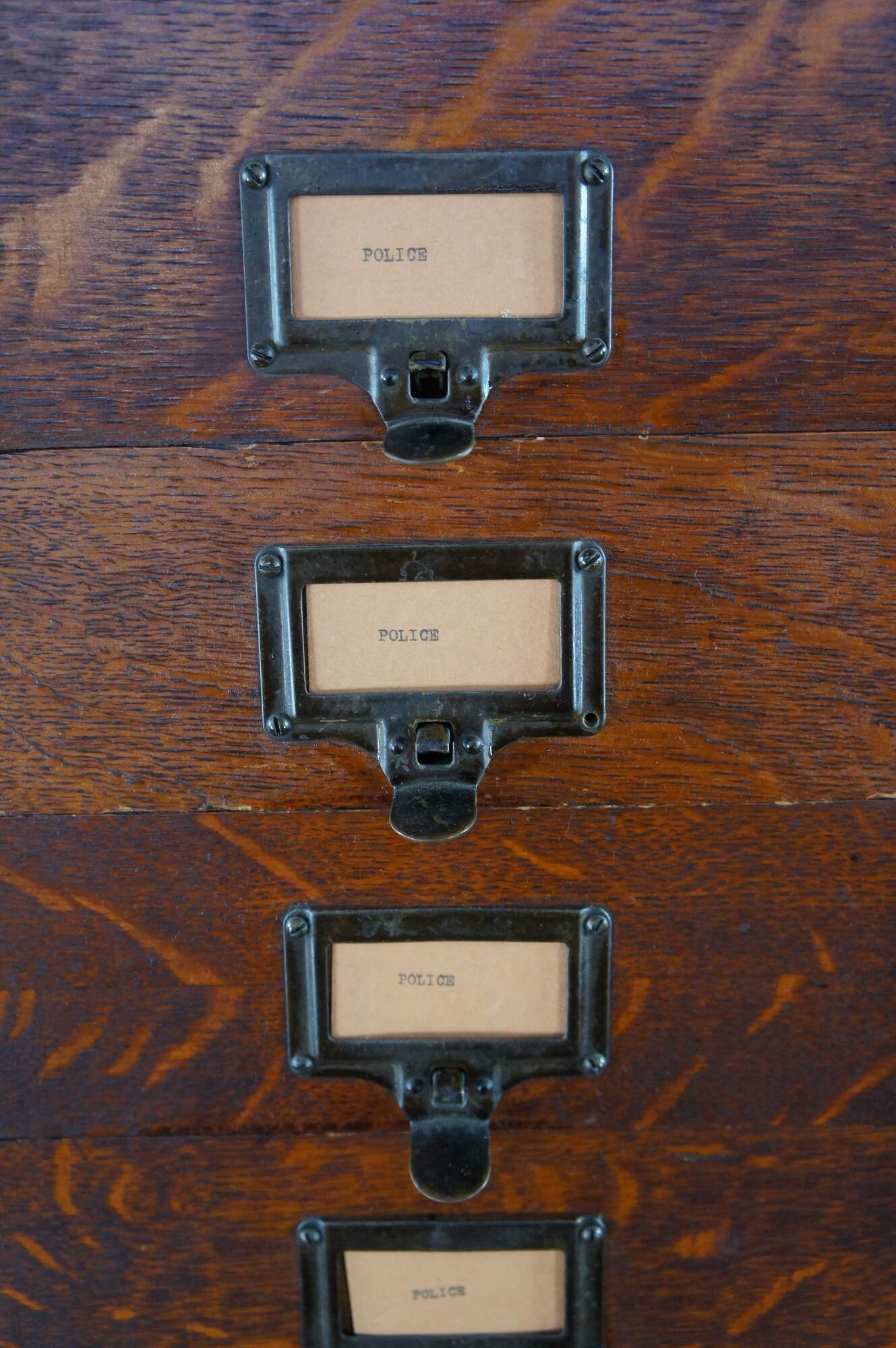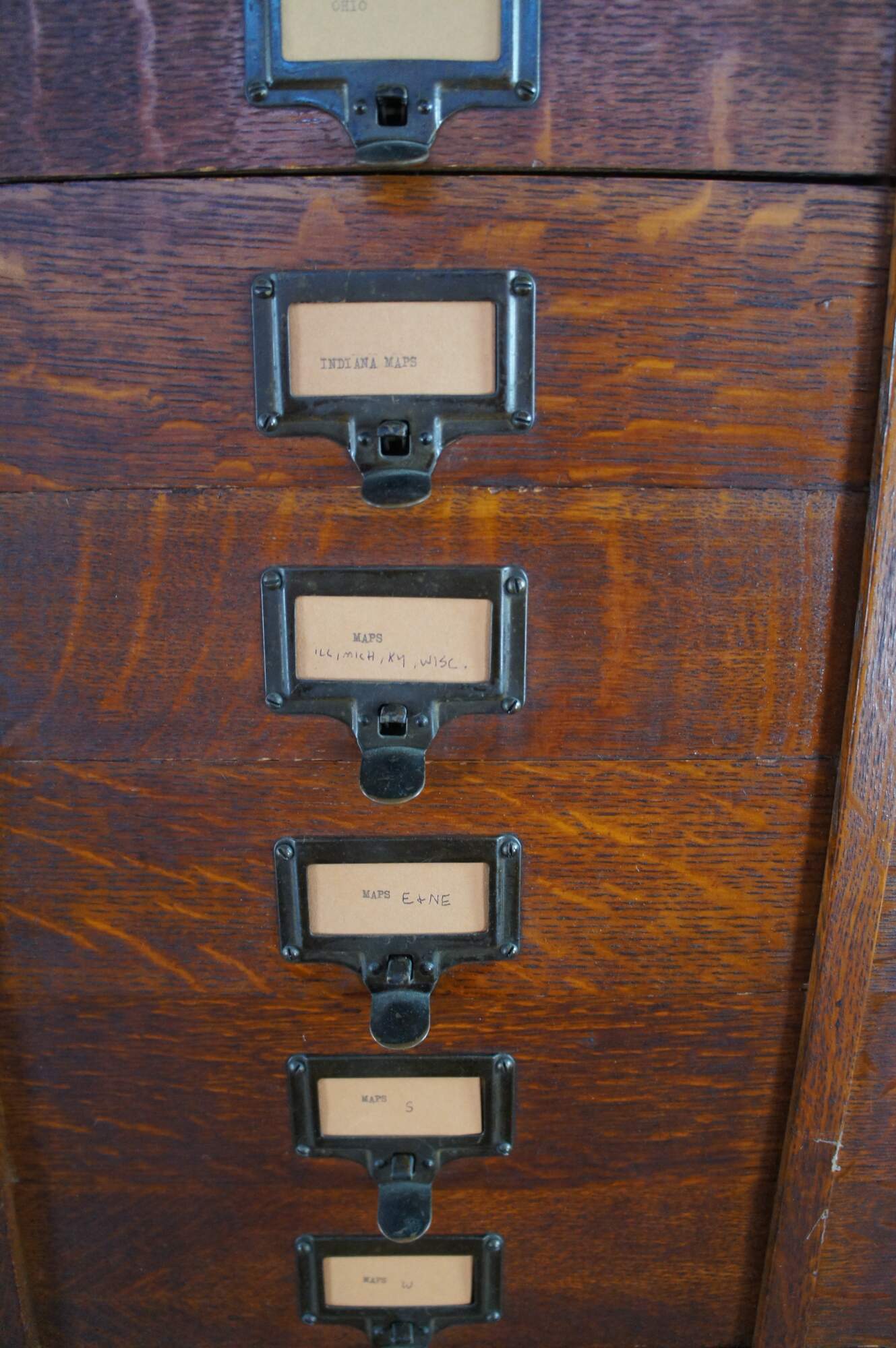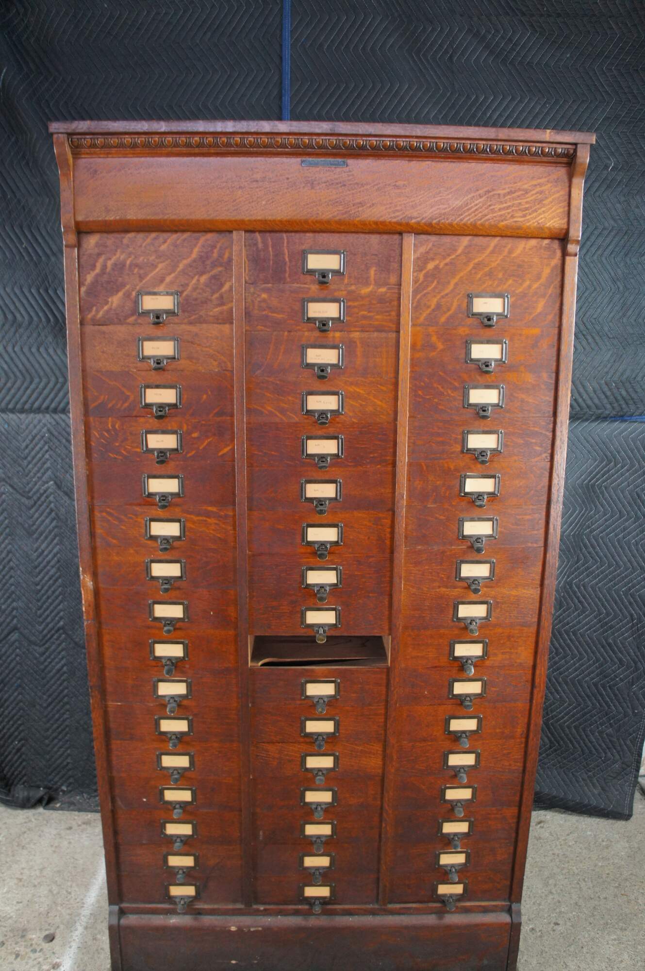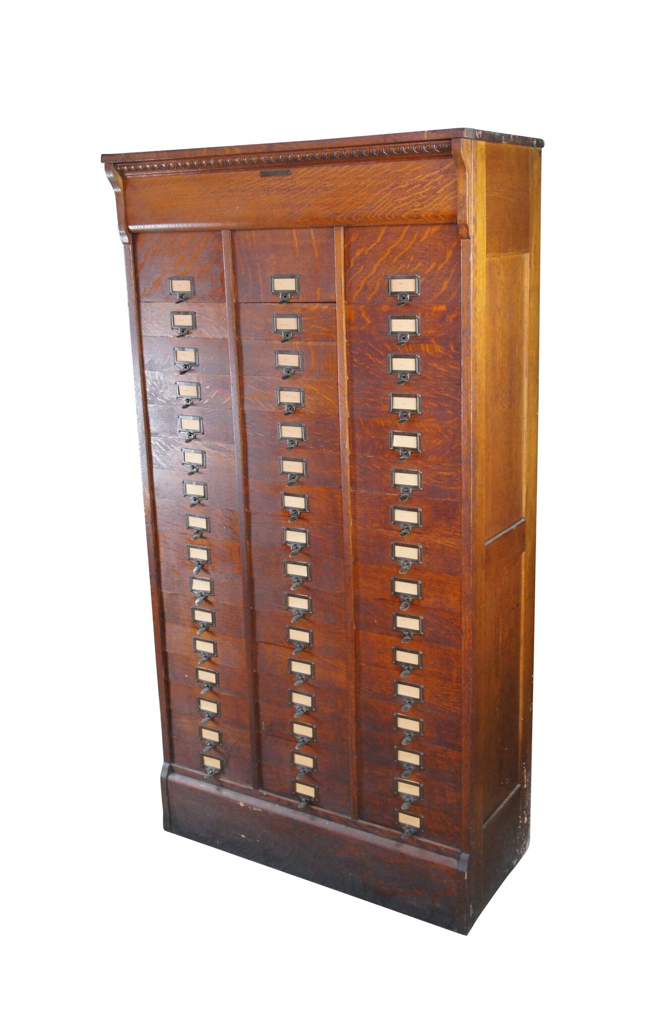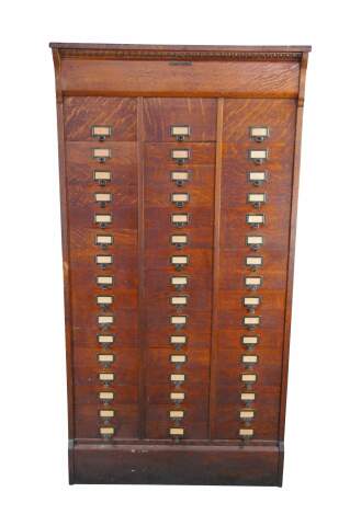 Antique Ohmer's administrative industrial apothecary office filing cabinet. Made of quartersawn oak featuring 48 slide up drawers for storage of index cards, letters and documents. The sides are paneled and the top has egg and dart molding. Previous users of this cabinet have labels reading Police, Ammo, Maps, and Dates. Manufactured by The M. Ohmers Sons Co., Dayton Ohio. Circa 1920s.