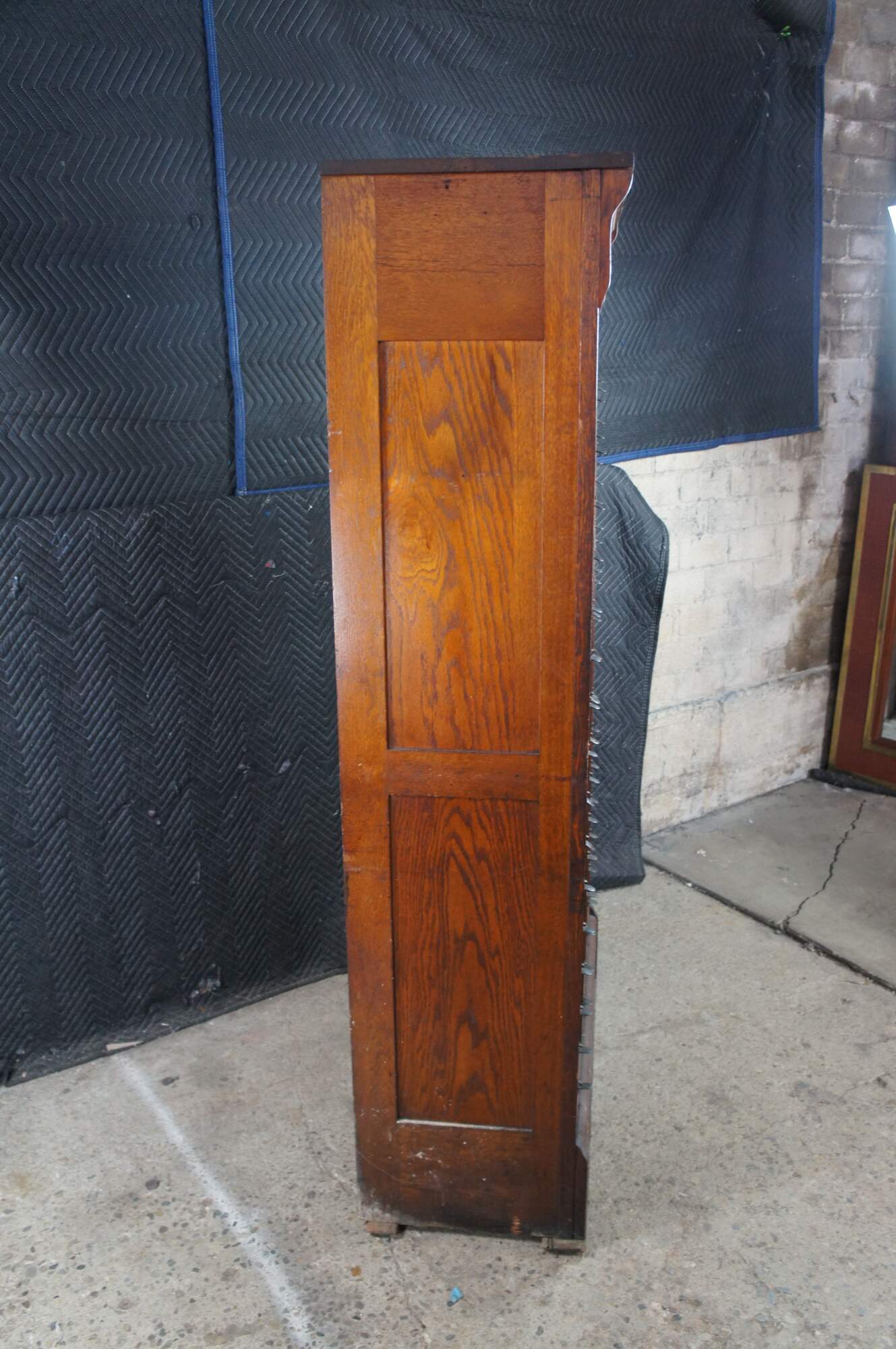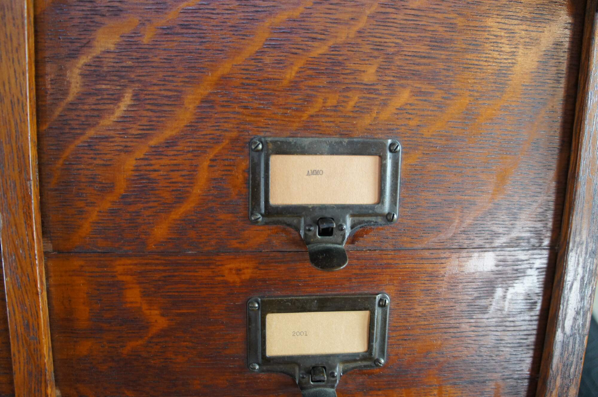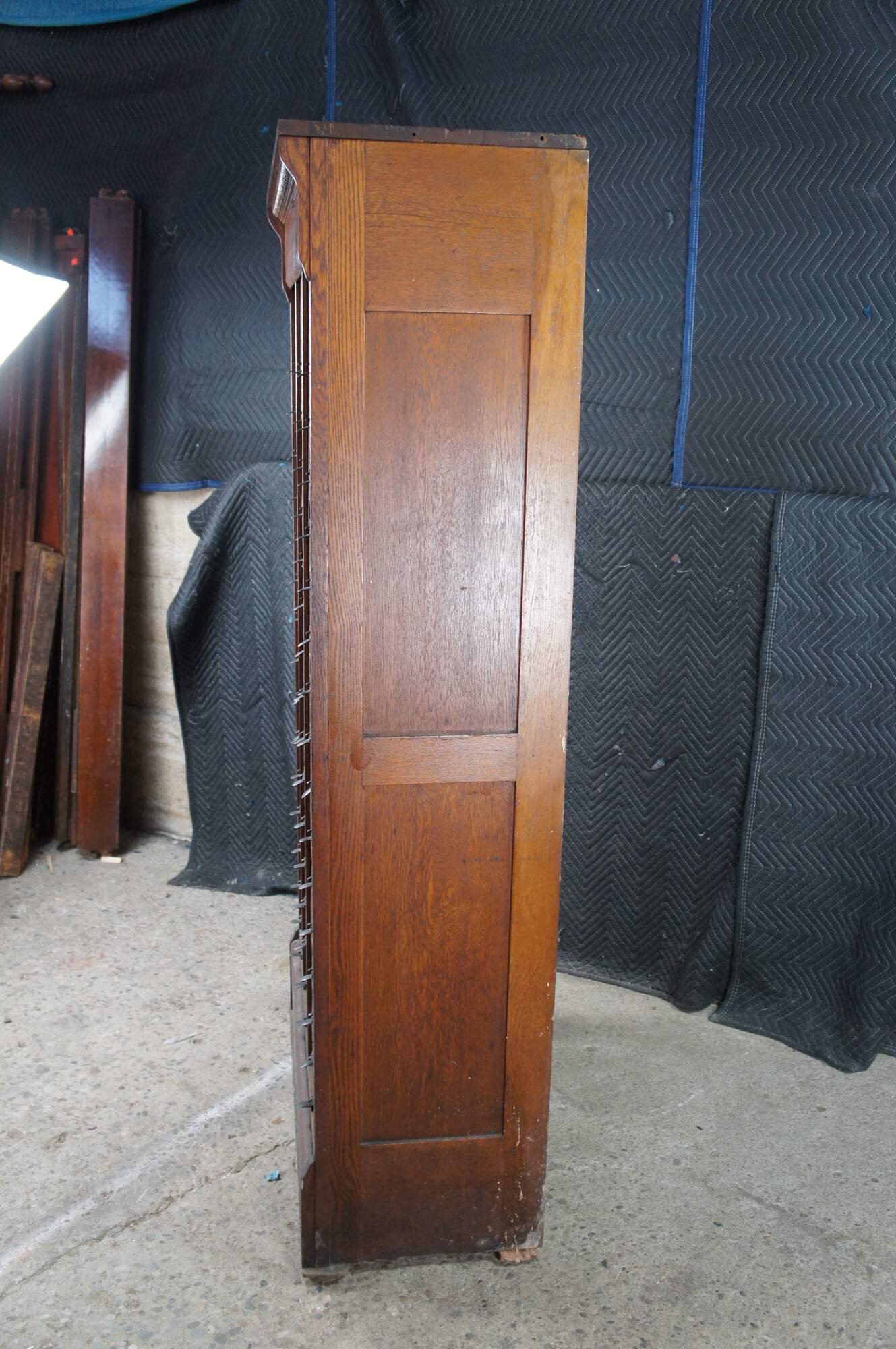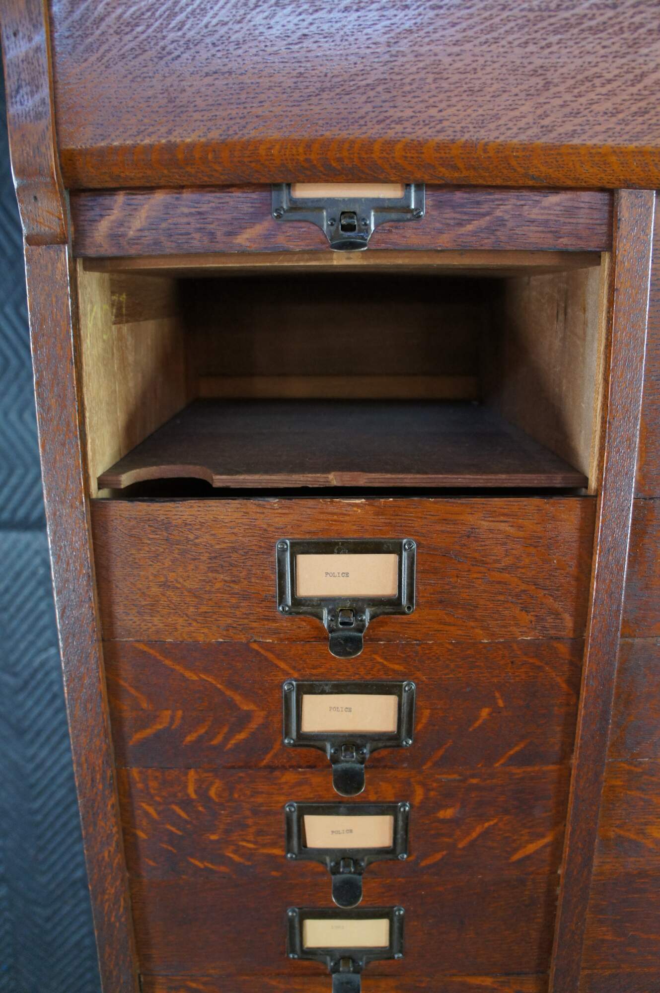 Antique Ohmer's administrative industrial apothecary office filing cabinet. Made of quartersawn oak featuring 48 slide up drawers for storage of index cards, letters and documents. The sides are paneled and the top has egg and dart molding. Previous users of this cabinet have labels reading Police, Ammo, Maps, and Dates. Manufactured by The M. Ohmers Sons Co., Dayton Ohio. Circa 1920s.