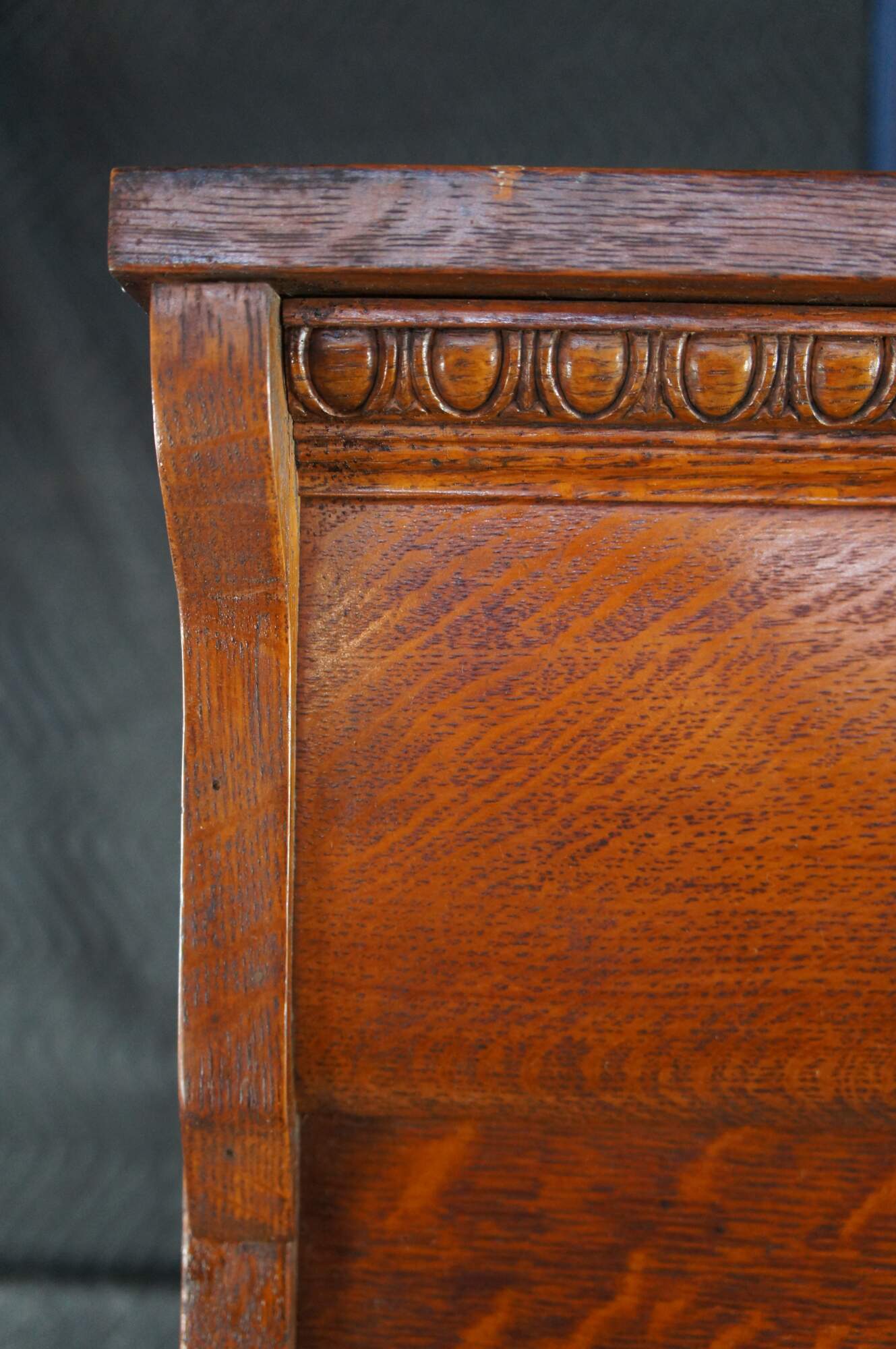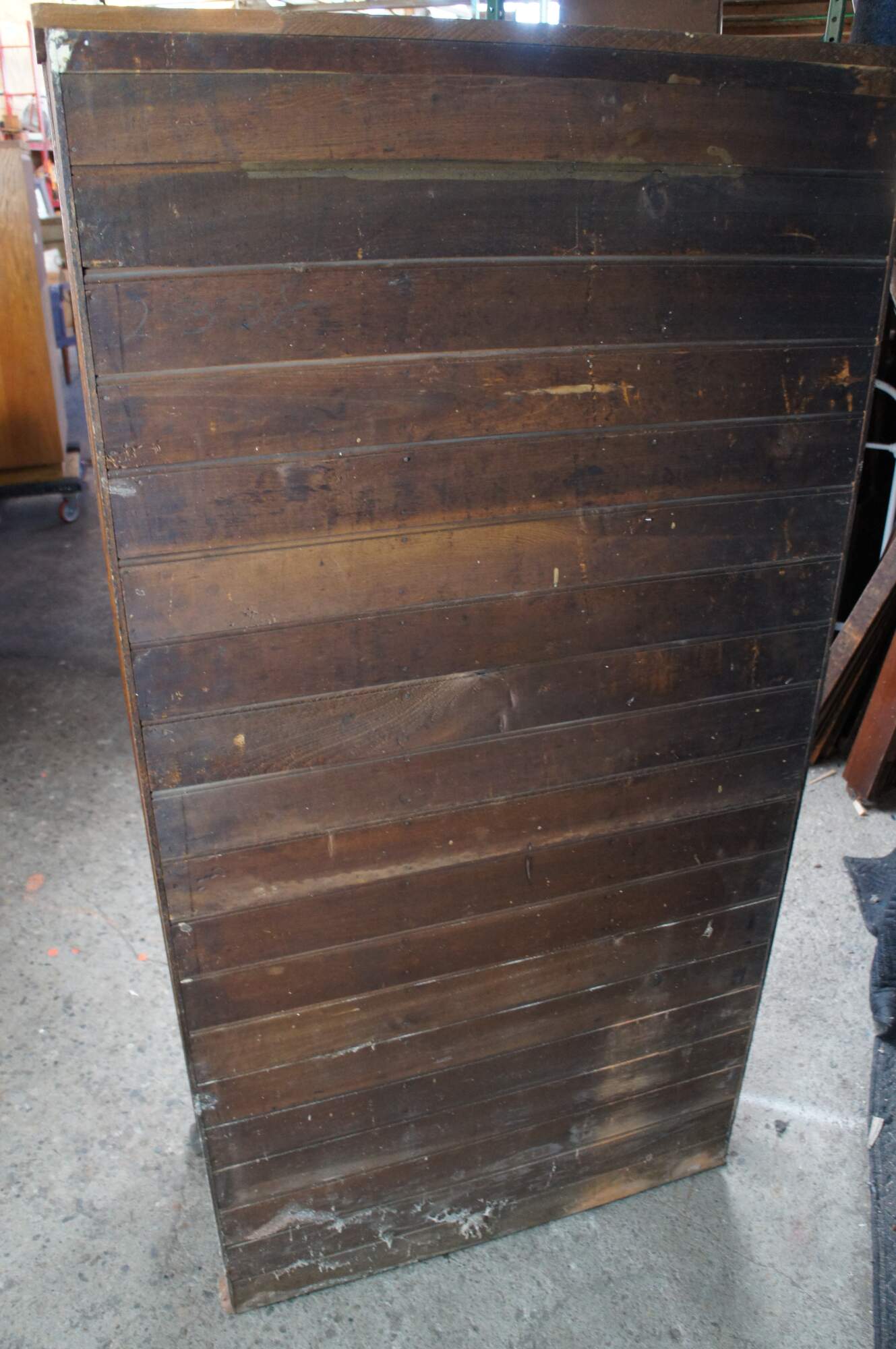 Wear and distressing from age and use, scuffing, marking, finish loss, some water damage / fading at base, previously attached to rails to keep off ground.