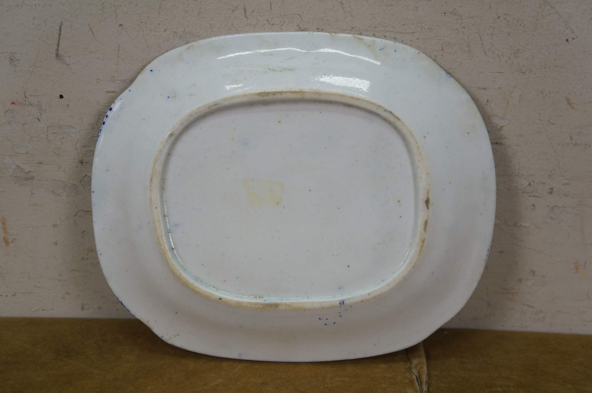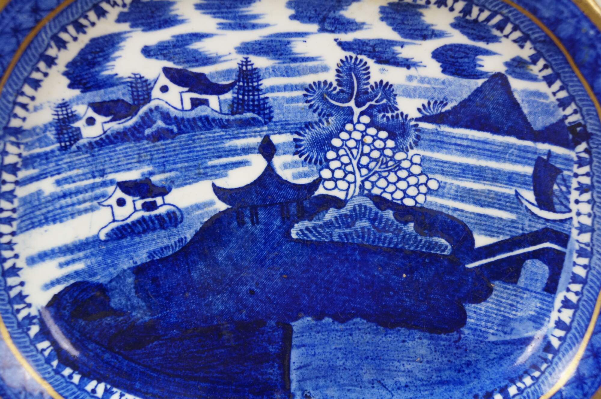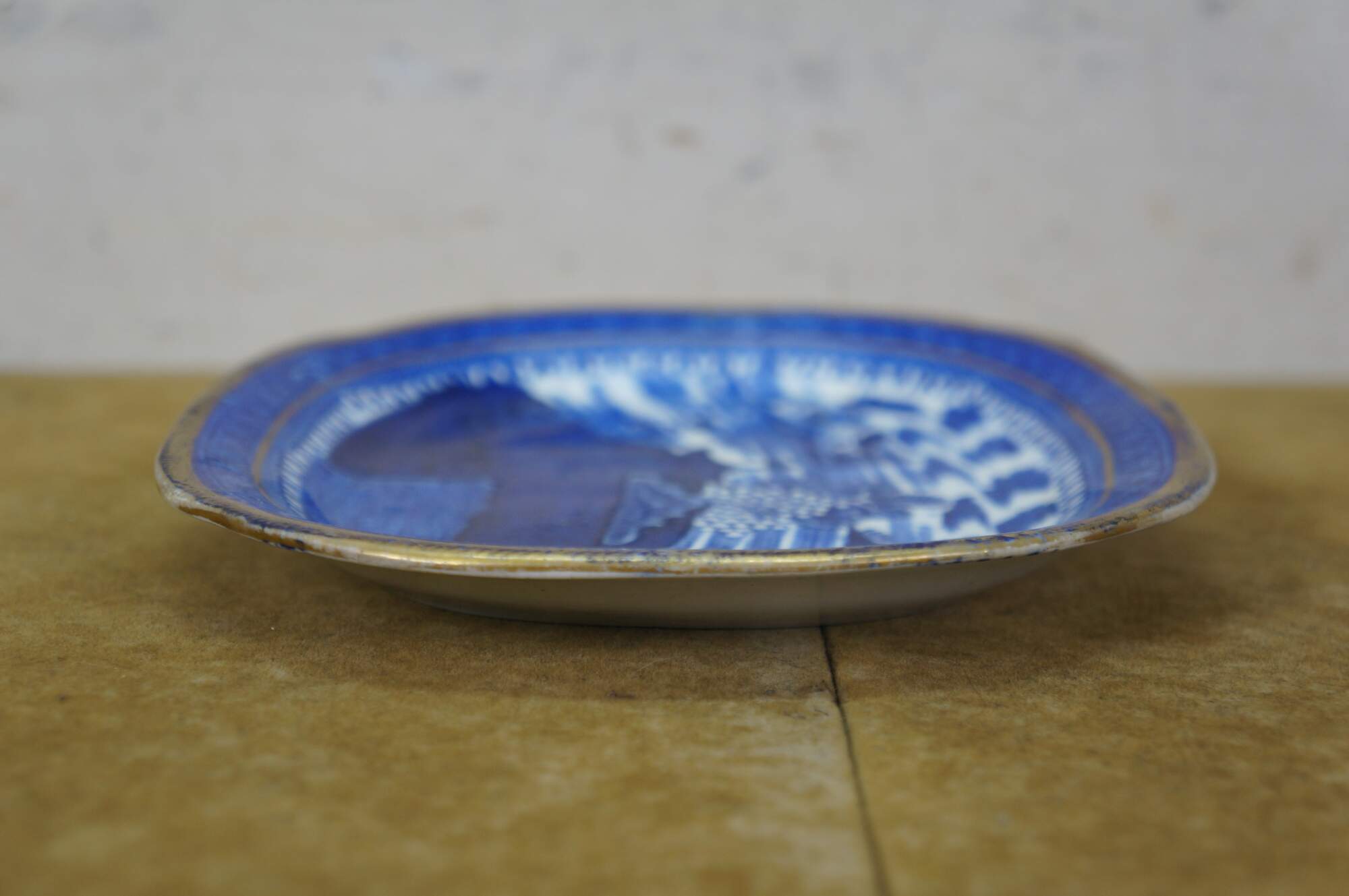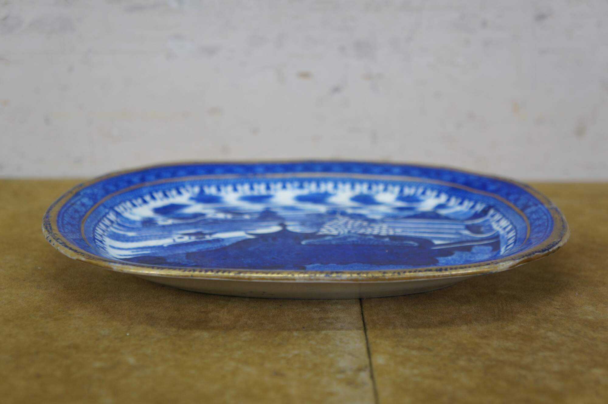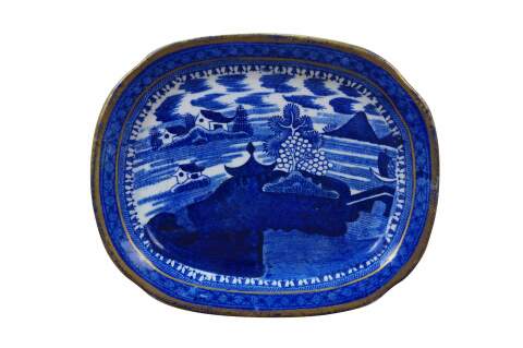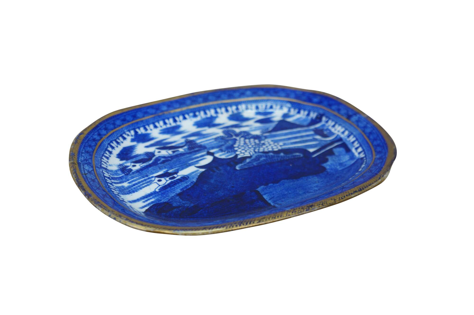 Small late 19th to early 20th century Chinese Export porcelain platter / plate - rectangular in shape with rounded corners and gilt detail at the edge, decorated with a Blue Willow style lands and water scape with pagoda roofs, sail boat, and bridge.