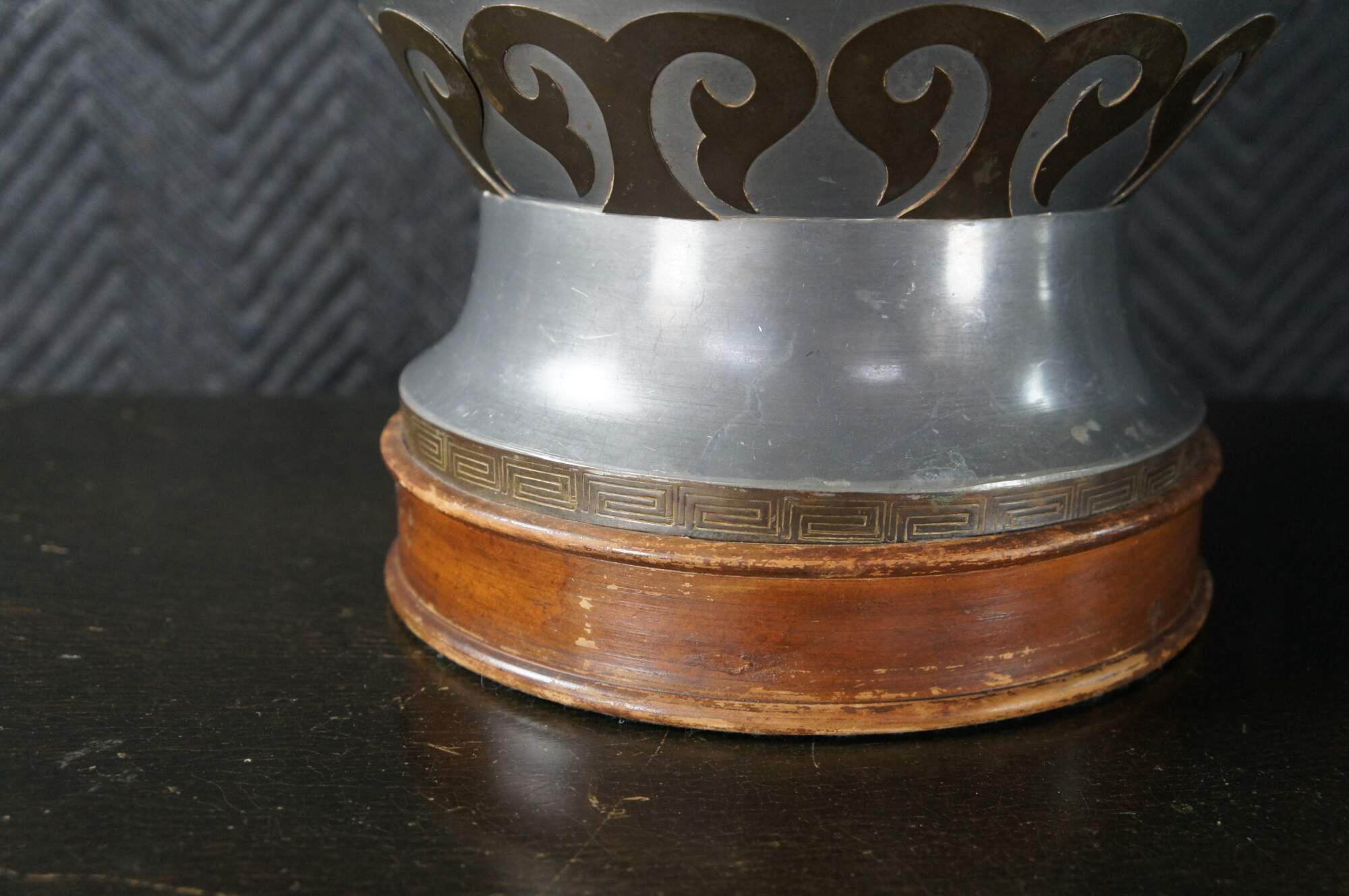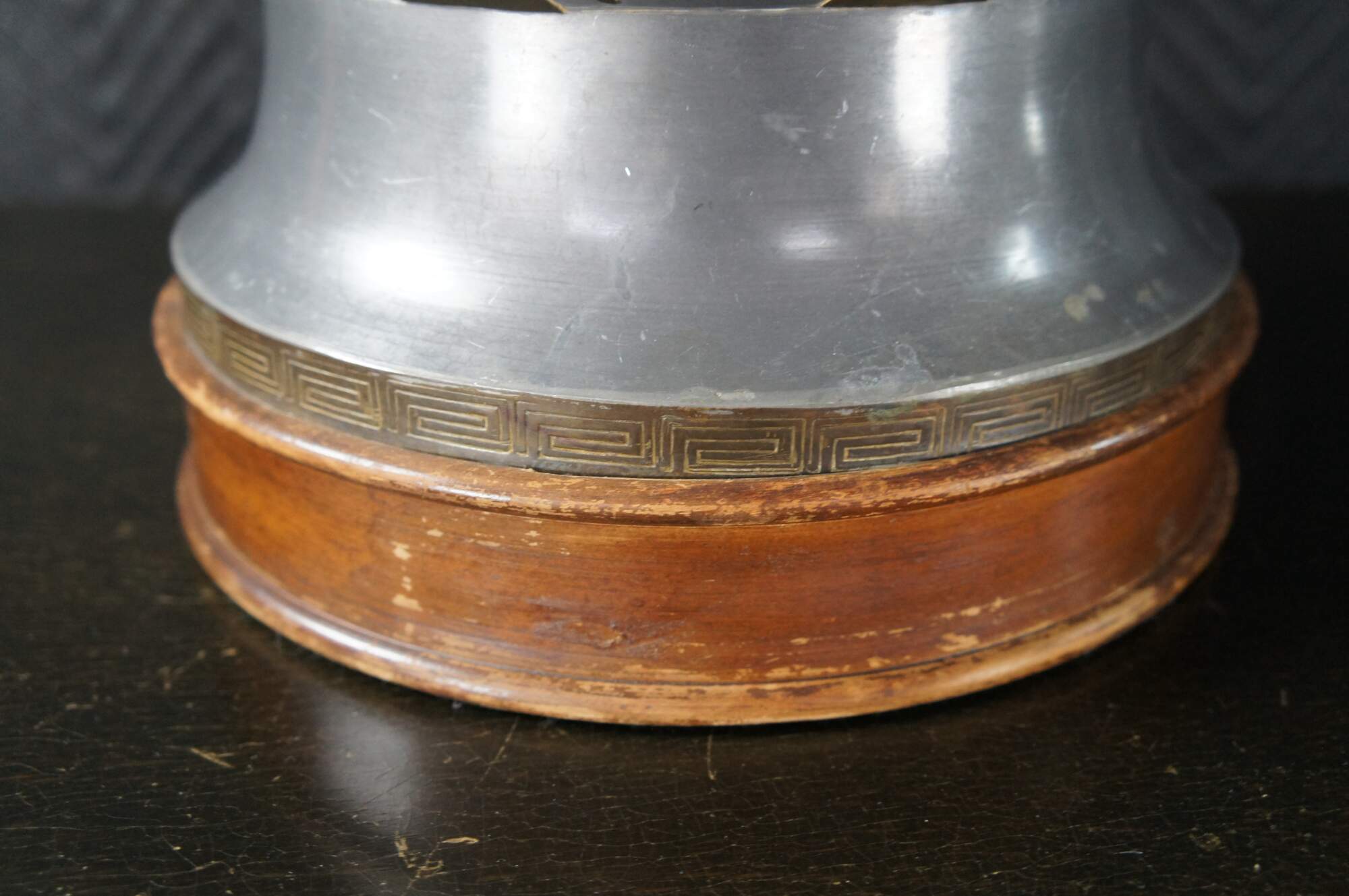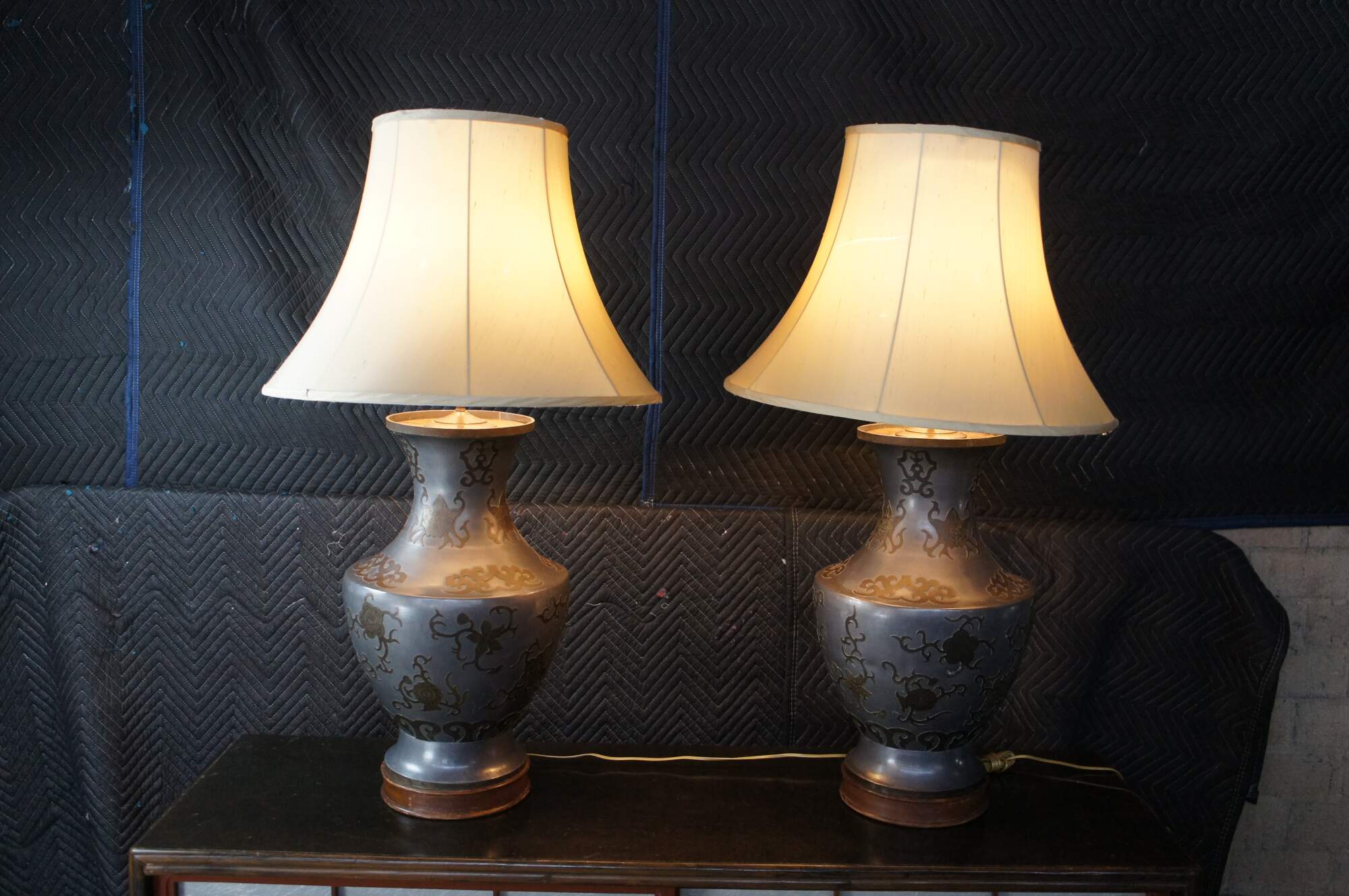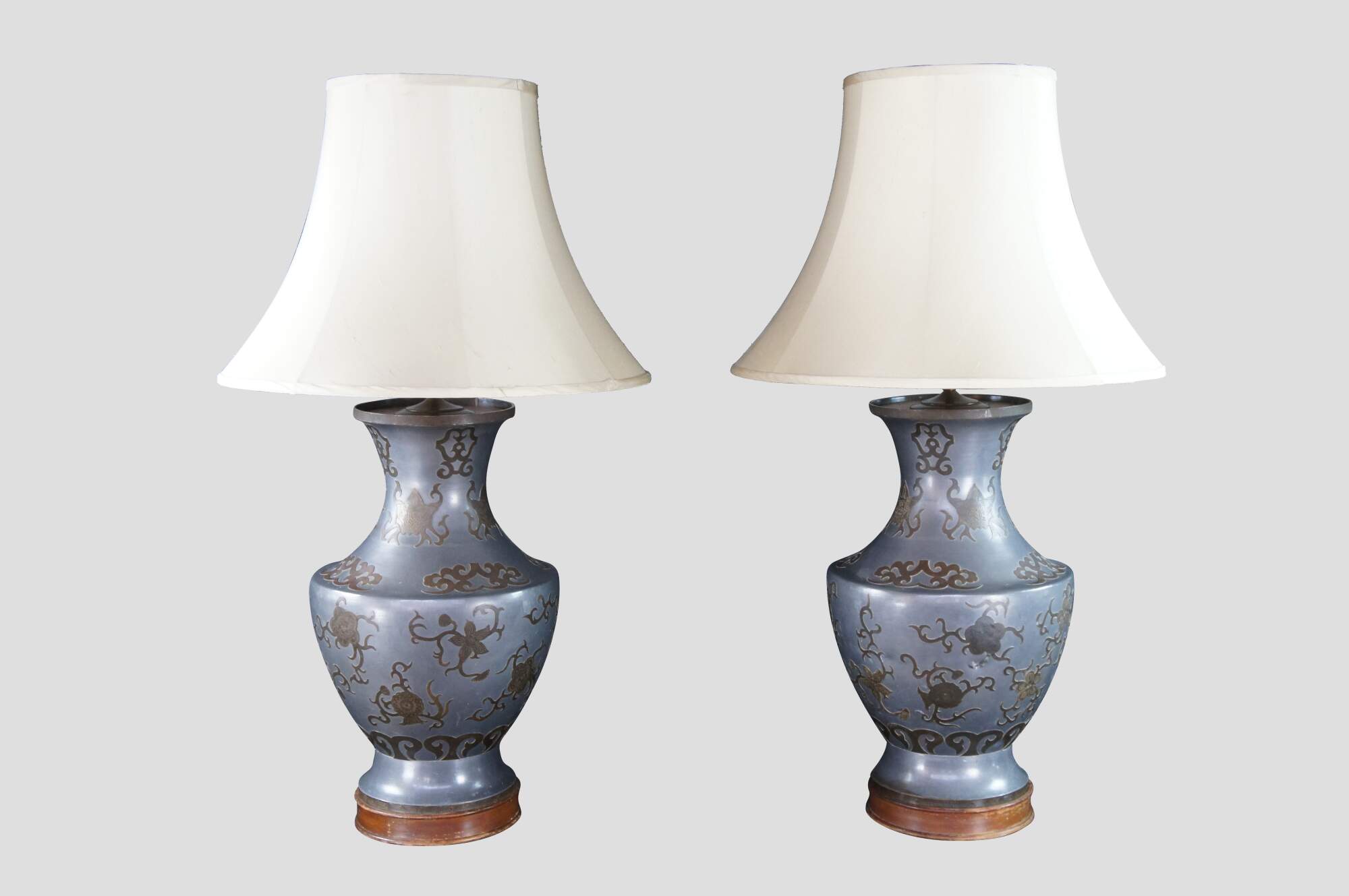 An exquisite and monumental set of handmade Chinoiserie mantel urn buffet lamps. Each large vase is made from pewter with beautiful brass overlay and tapered shades. The lamps showcase greek key engraving, floral foliate and scrolled detail. Each is mounted to wooden base. A staley addition to any space.