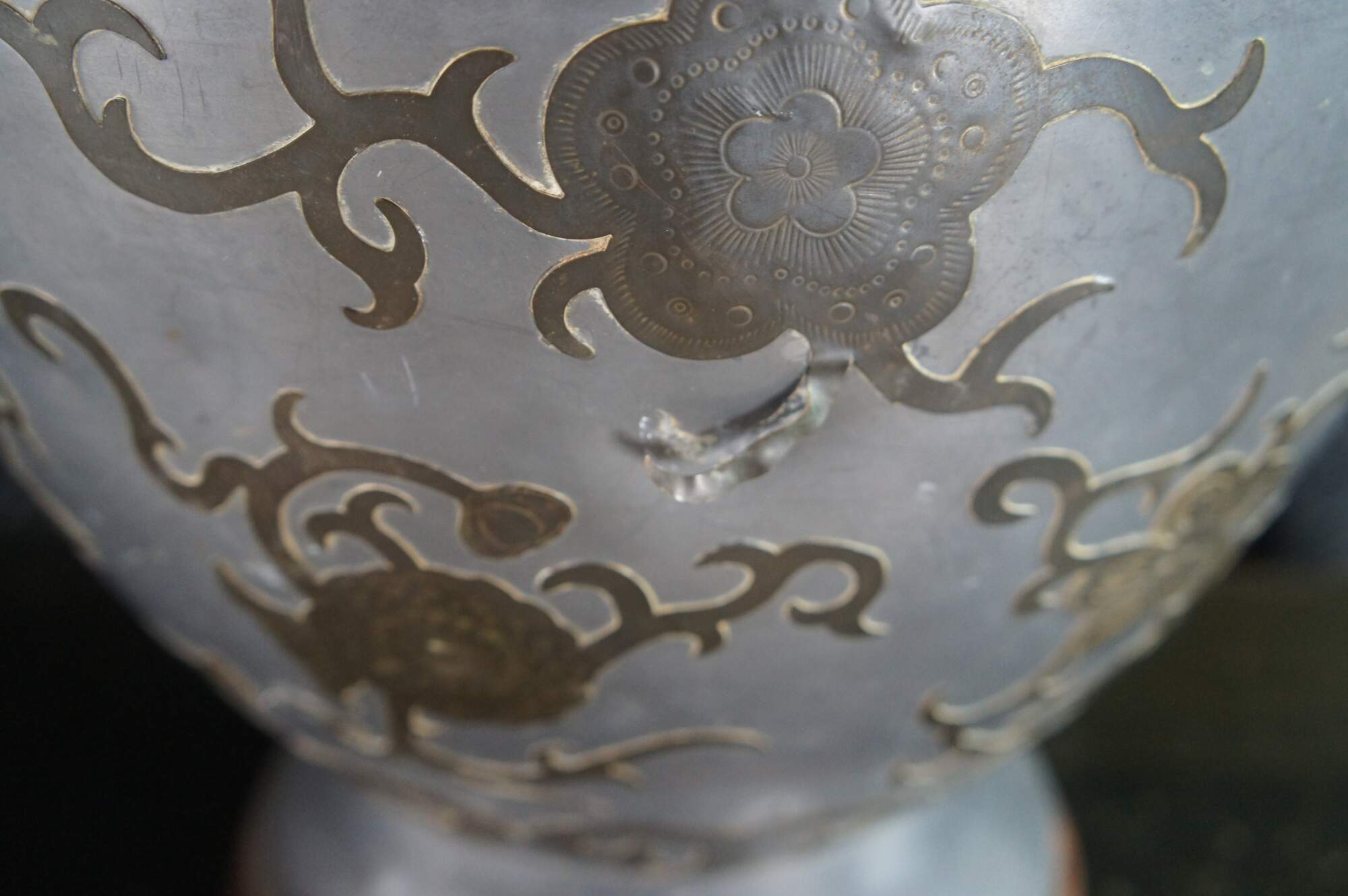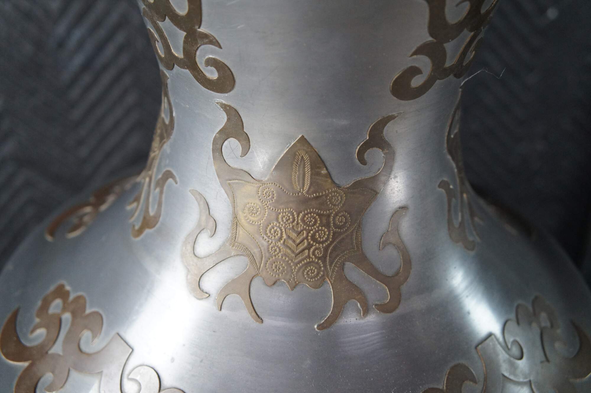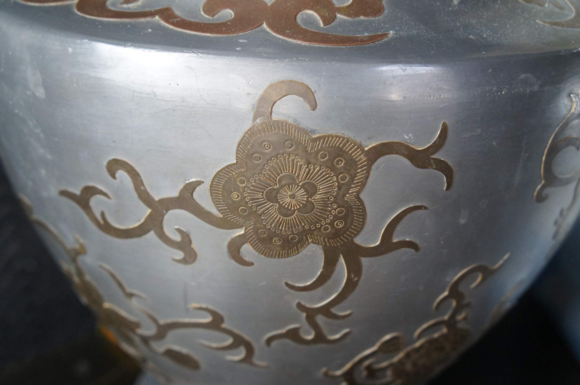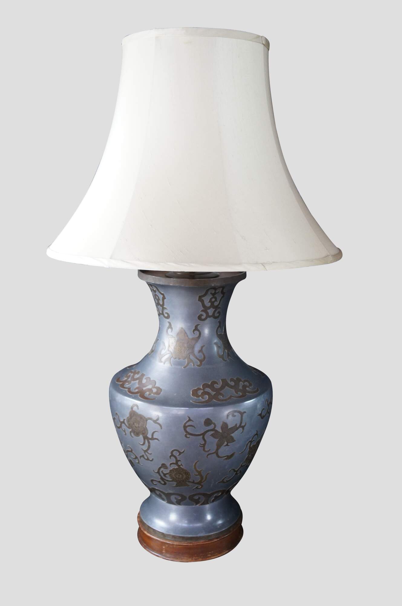 An exquisite and monumental set of handmade Chinoiserie mantel urn buffet lamps. Each large vase is made from pewter with beautiful brass overlay and tapered shades. The lamps showcase greek key engraving, floral foliate and scrolled detail. Each is mounted to wooden base. A staley addition to any space.