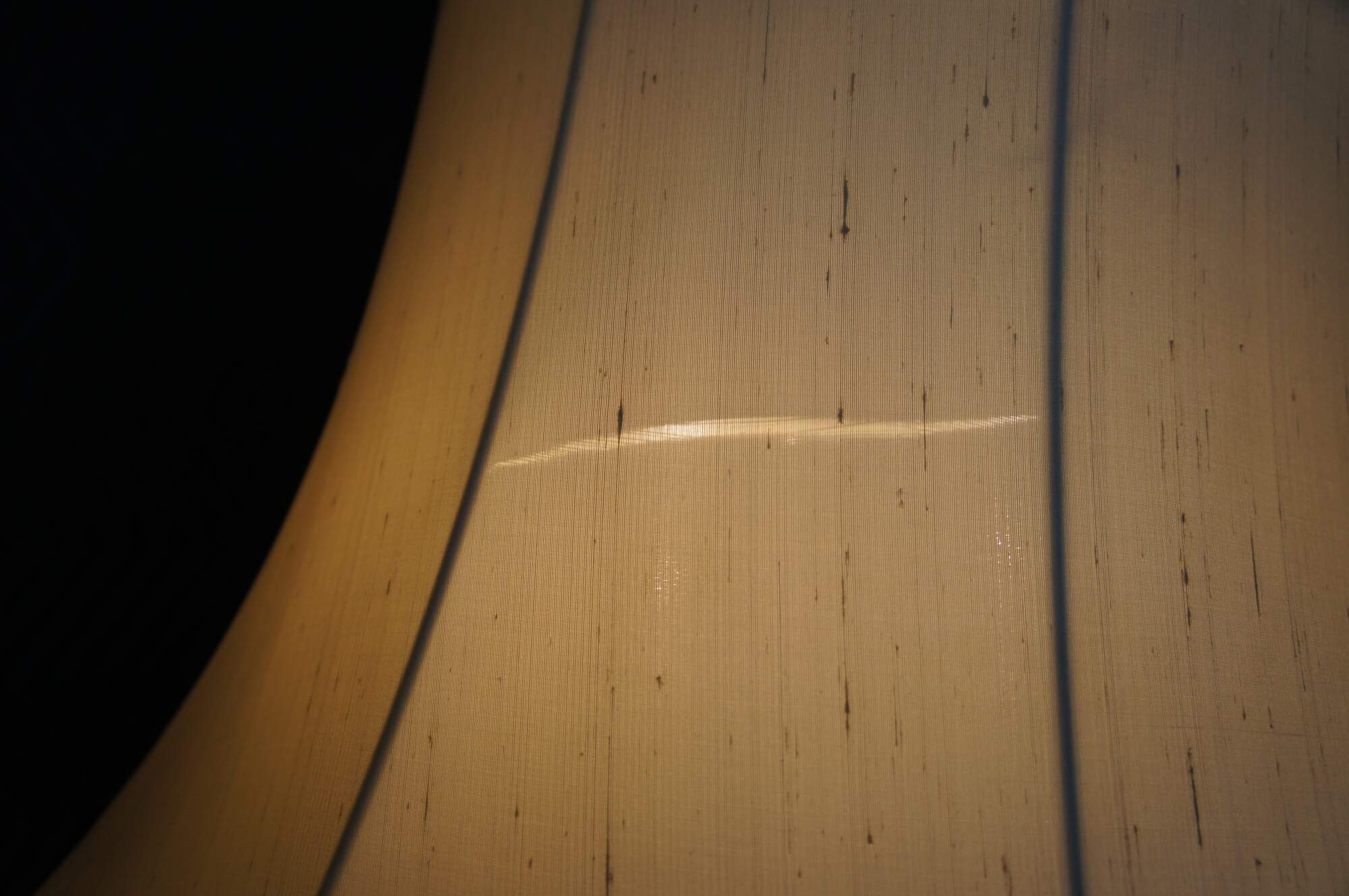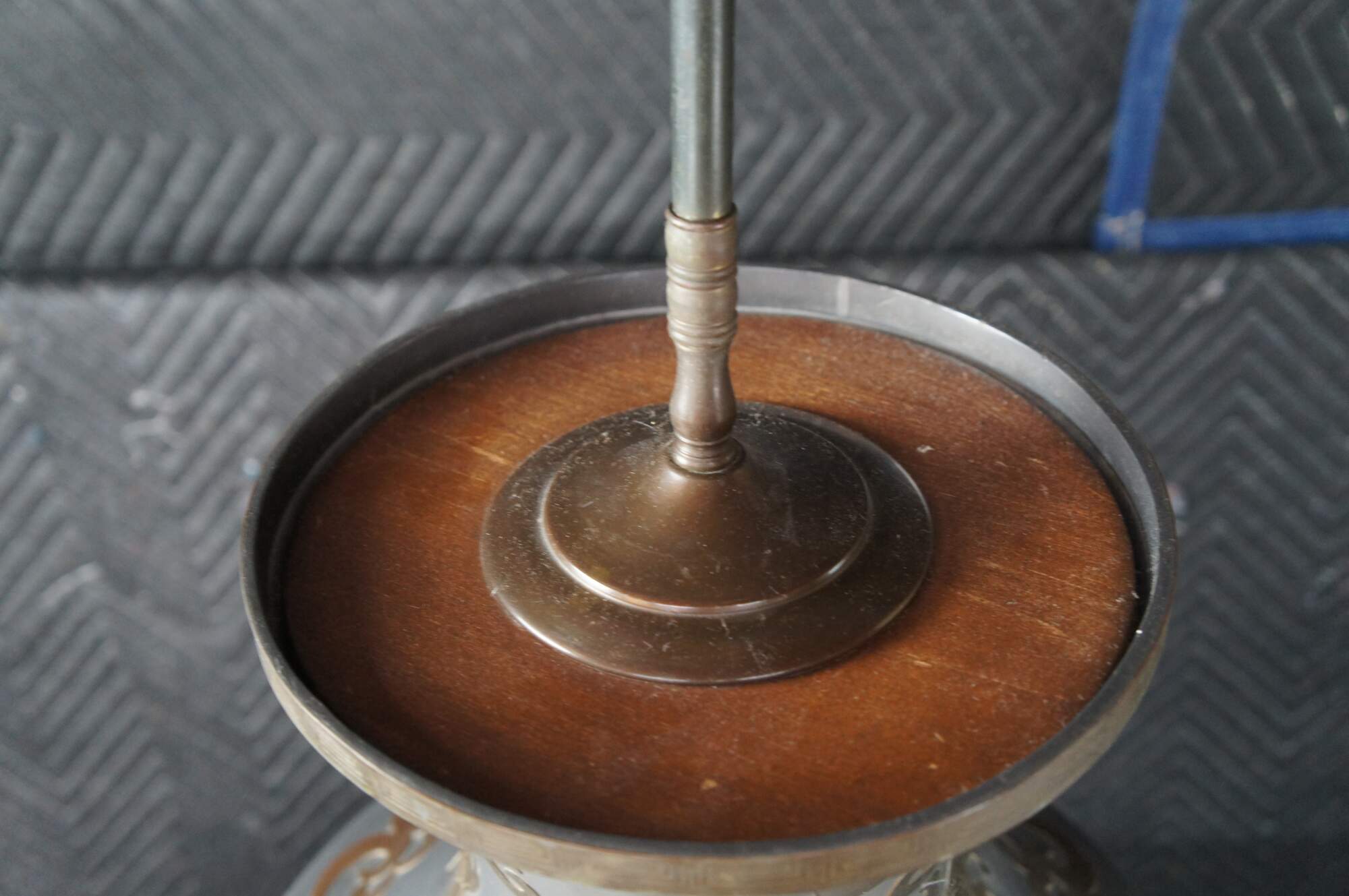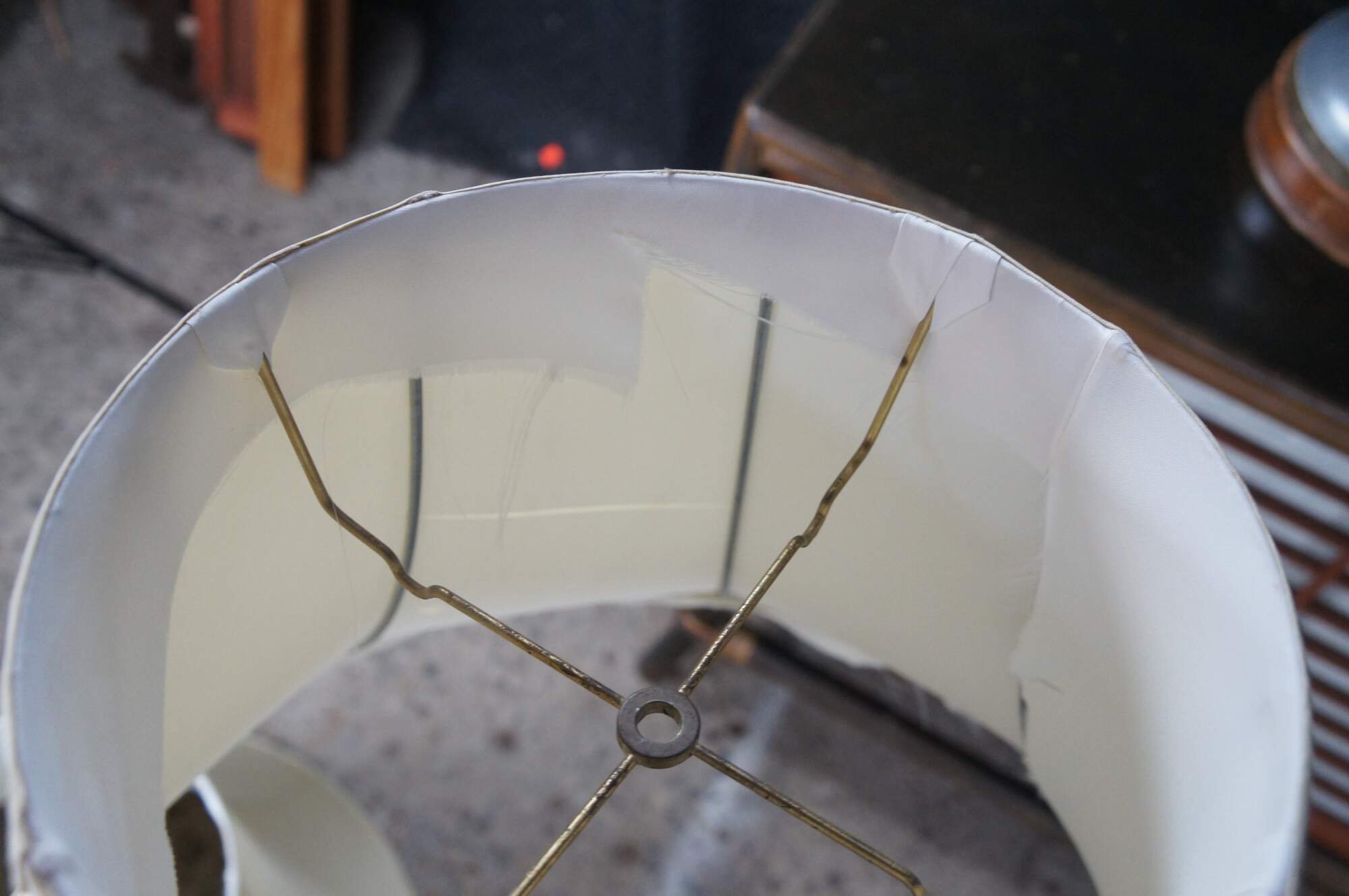 Good Condition; wear from use and age. Lifting to one of the brass mounts. Marking and edge wear. Tears to the shade lining.