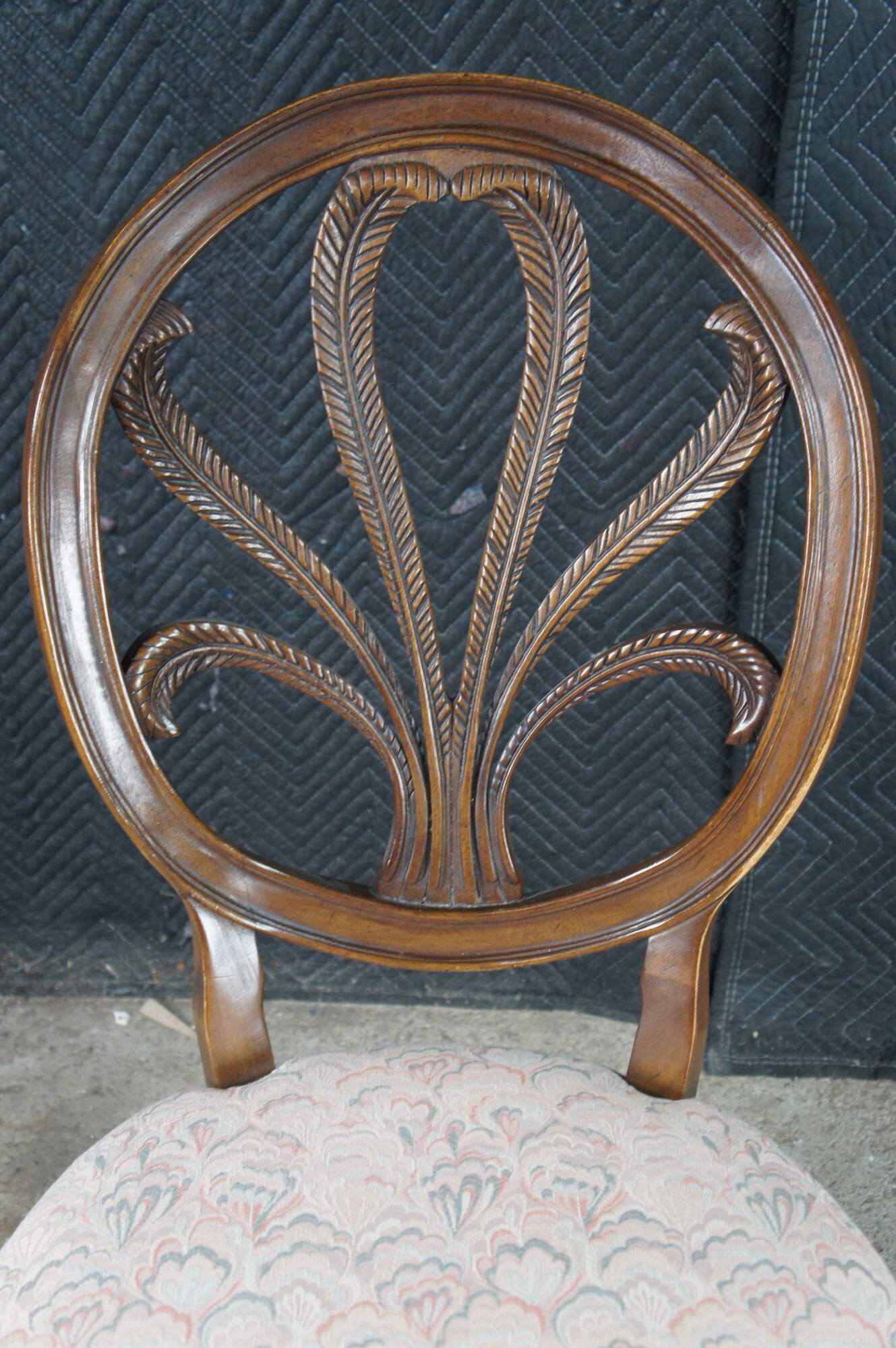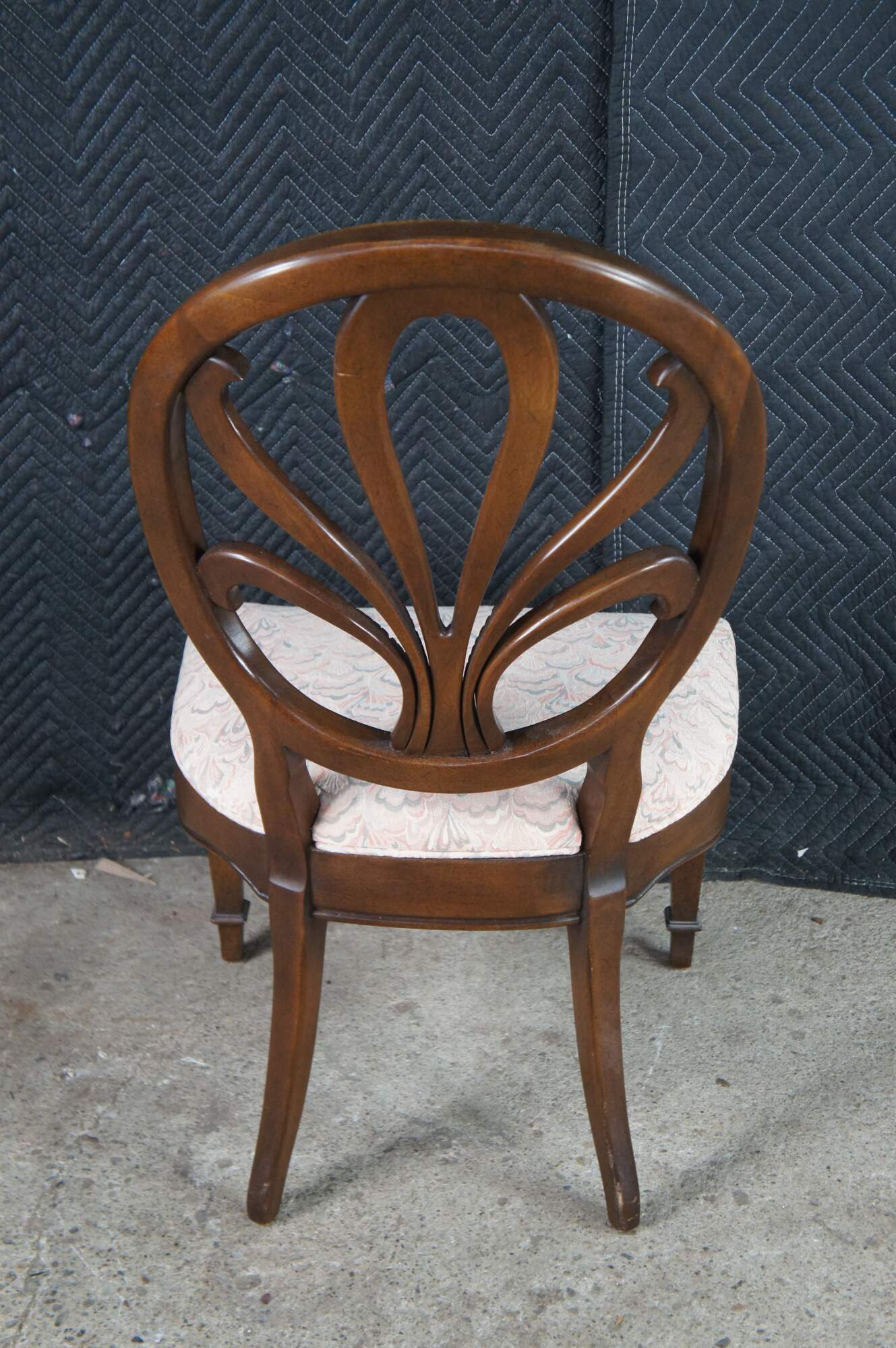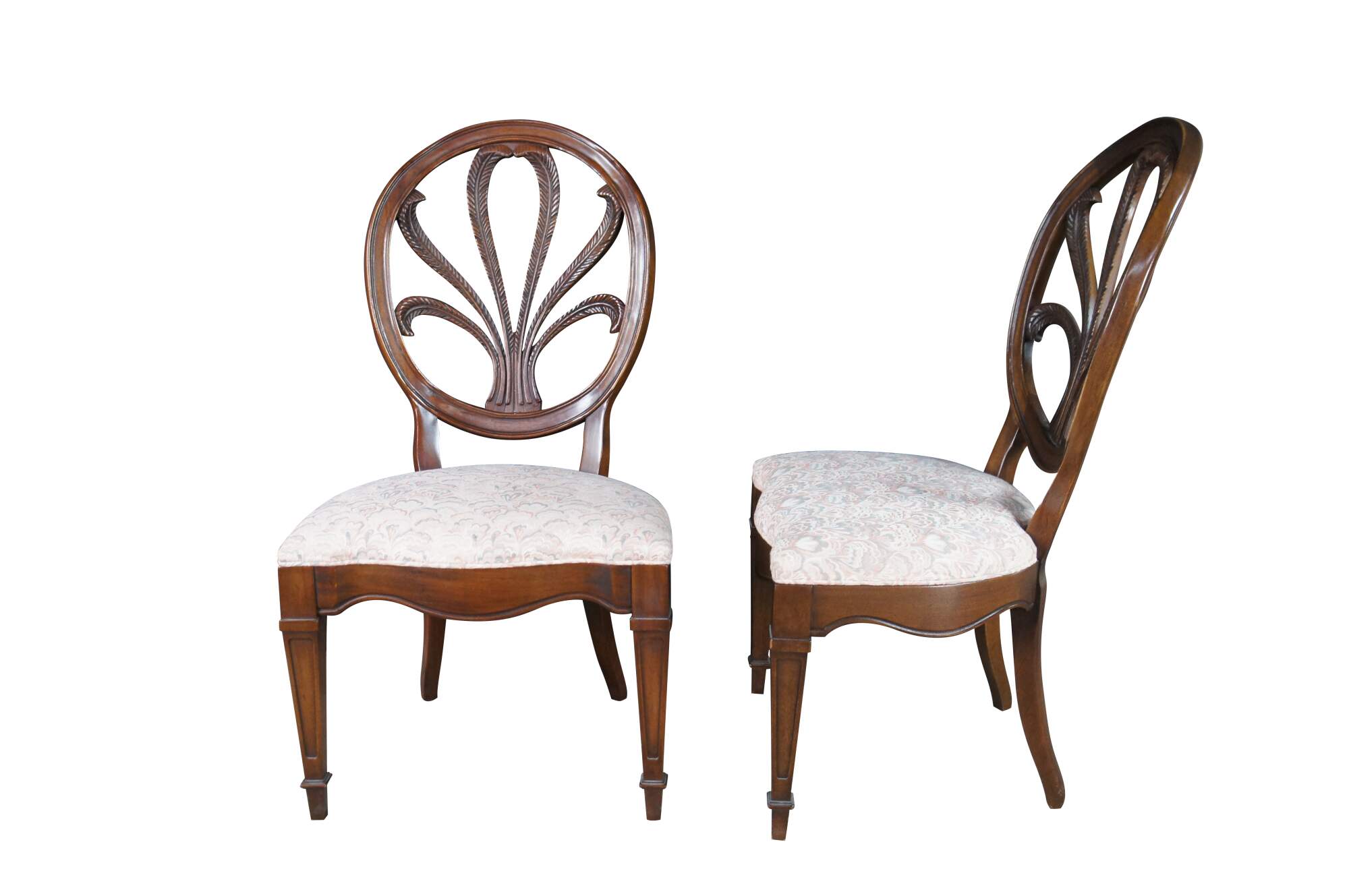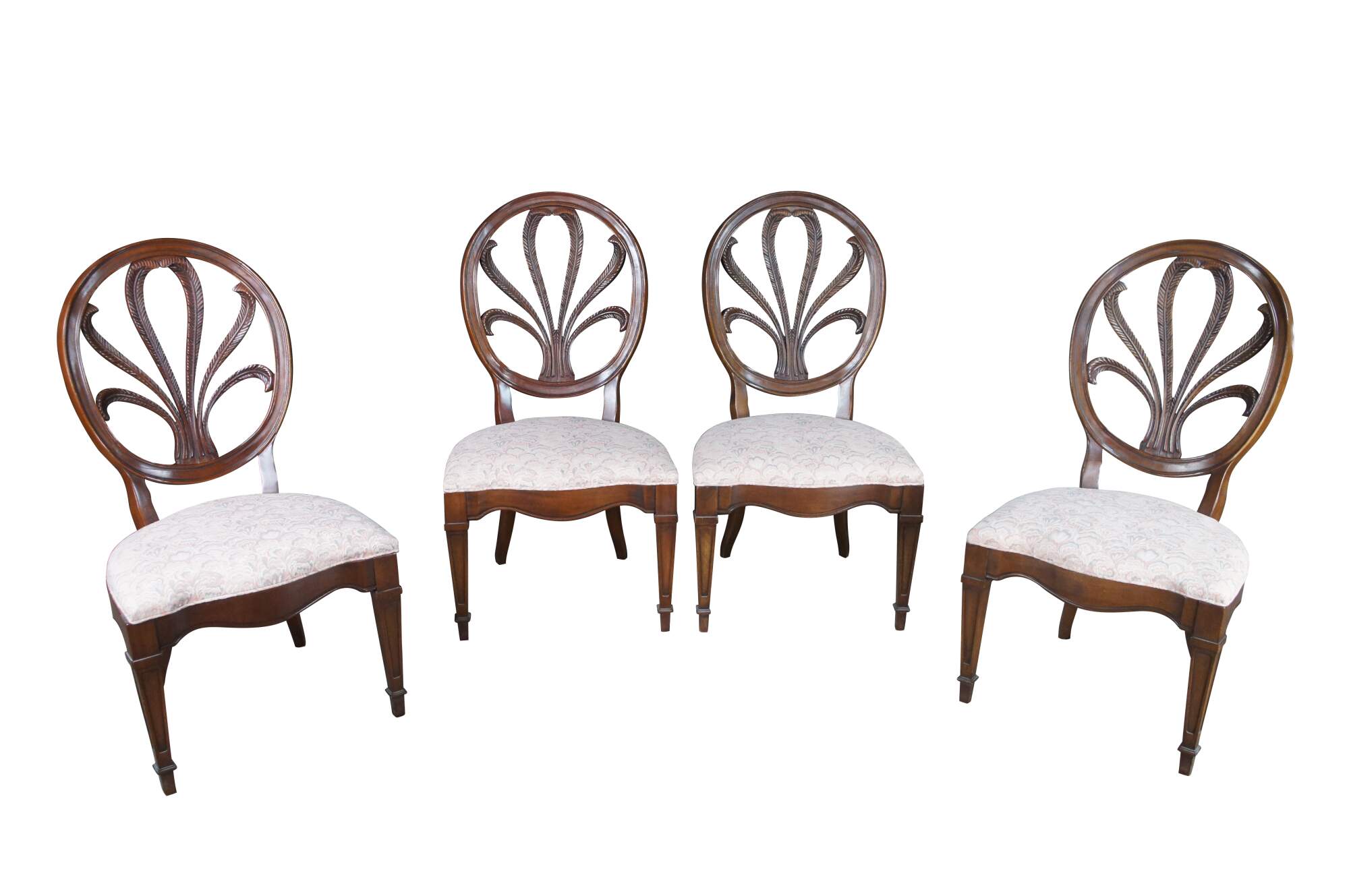 Set of four balloon back dining chairs by White Furniture, circa 1970s. Drawing inspiration from Adams and Hepplewhite styling. Features a walnut frame with carved plume back over a coloful marbled fan style fabric. The chairs showcase a serpentine apront over square tapered legs.