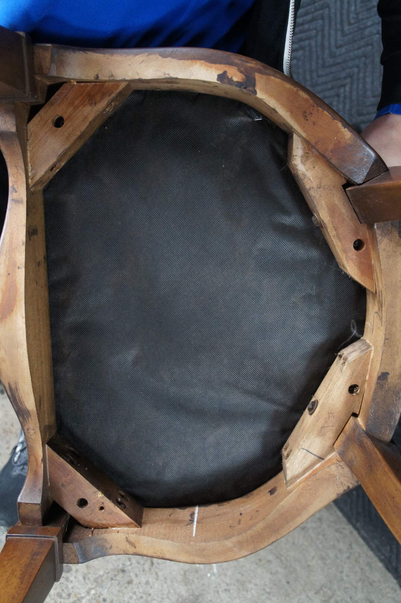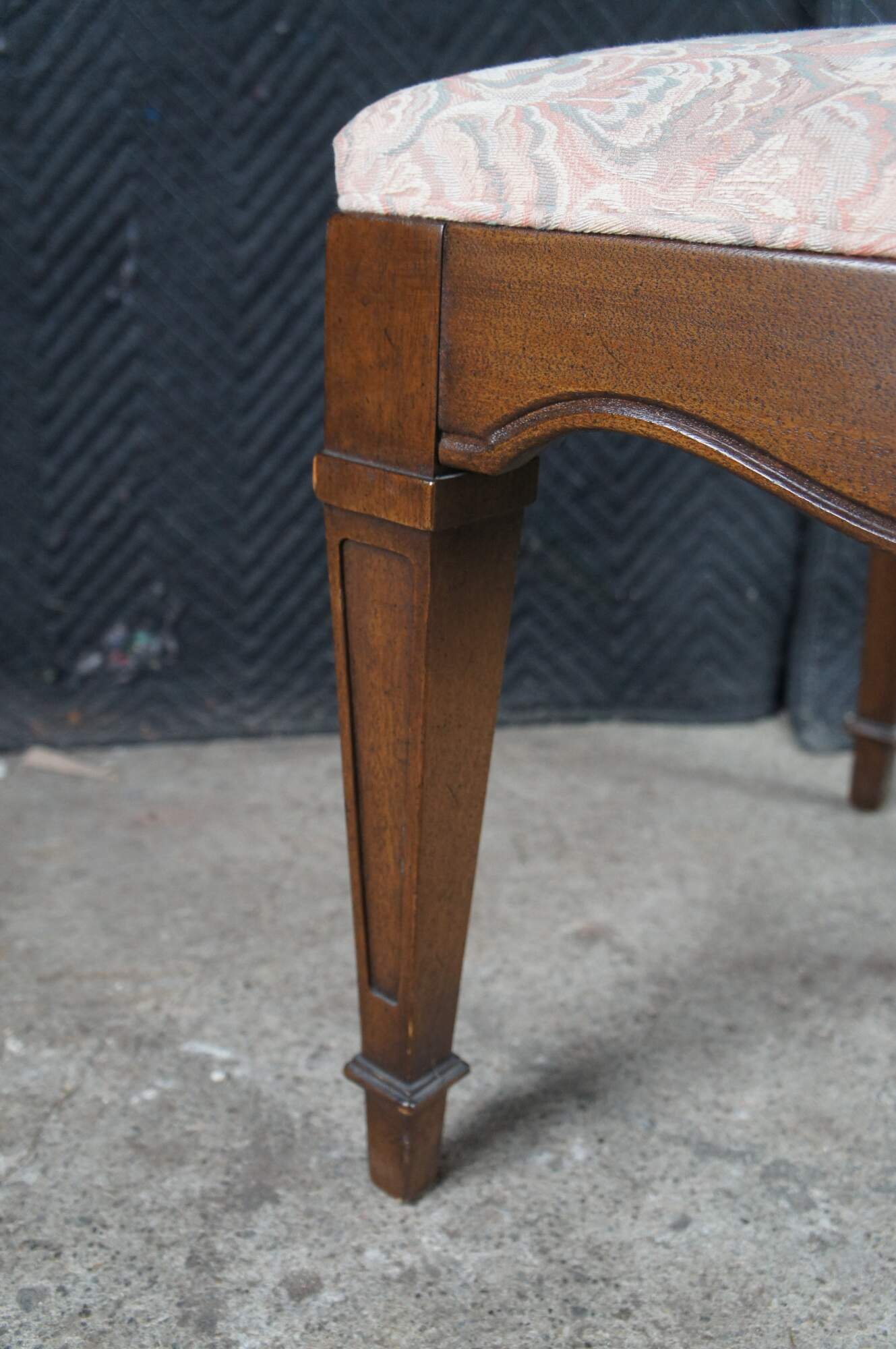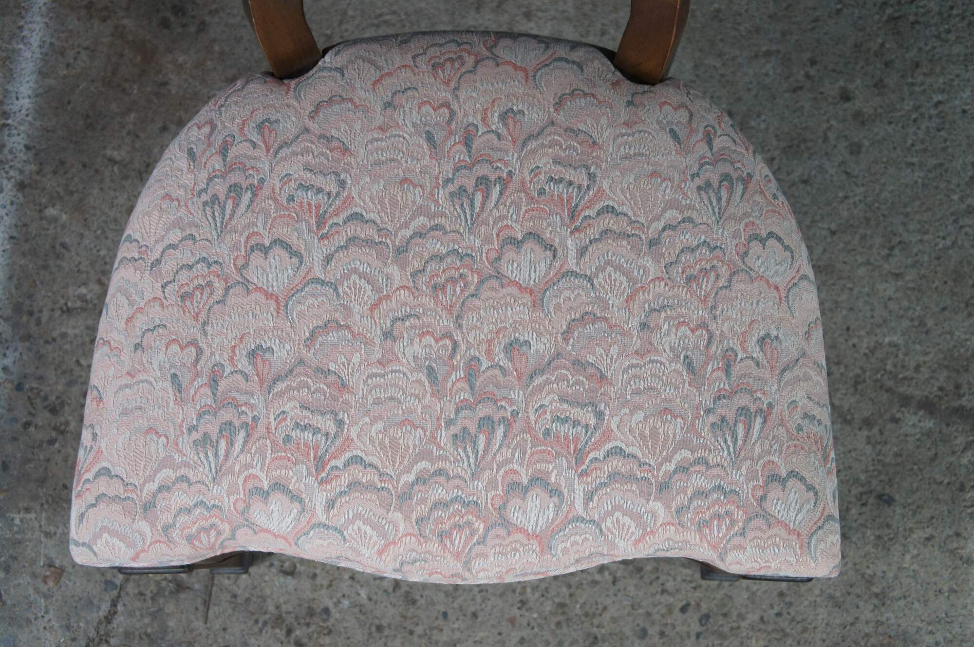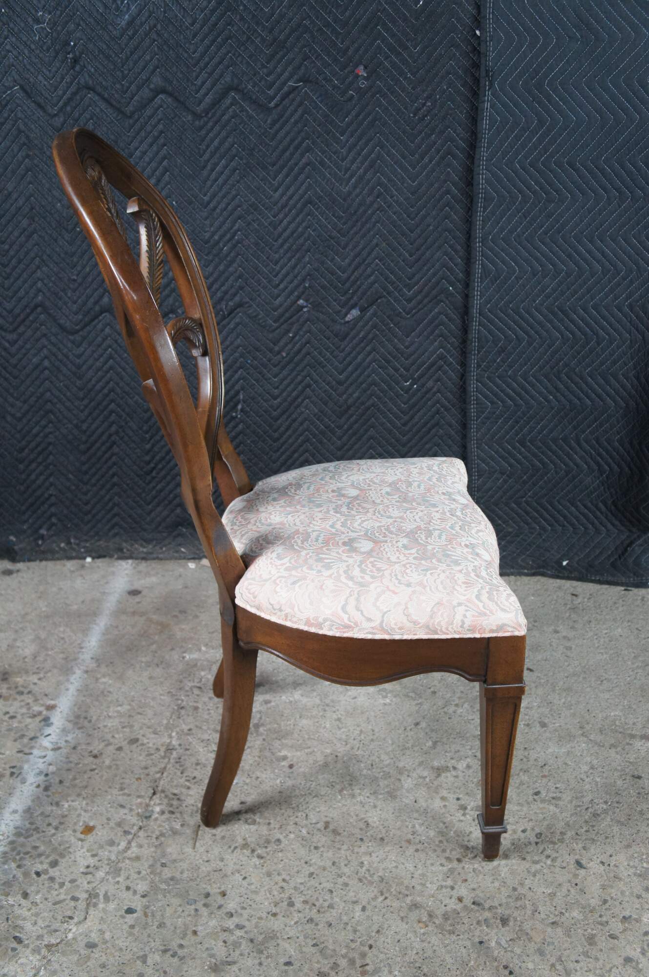 Set of four balloon back dining chairs by White Furniture, circa 1970s. Drawing inspiration from Adams and Hepplewhite styling. Features a walnut frame with carved plume back over a coloful marbled fan style fabric. The chairs showcase a serpentine apront over square tapered legs.