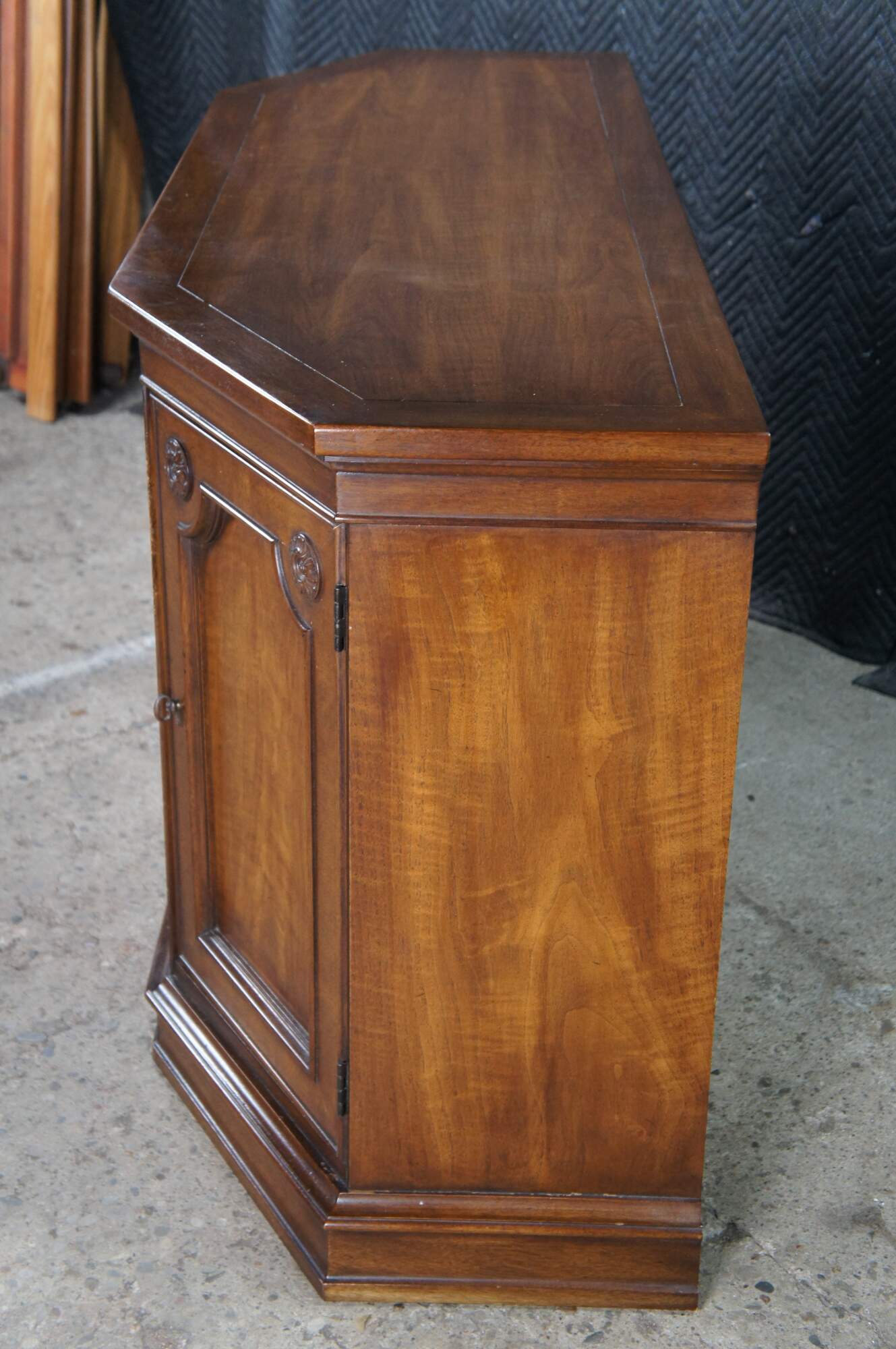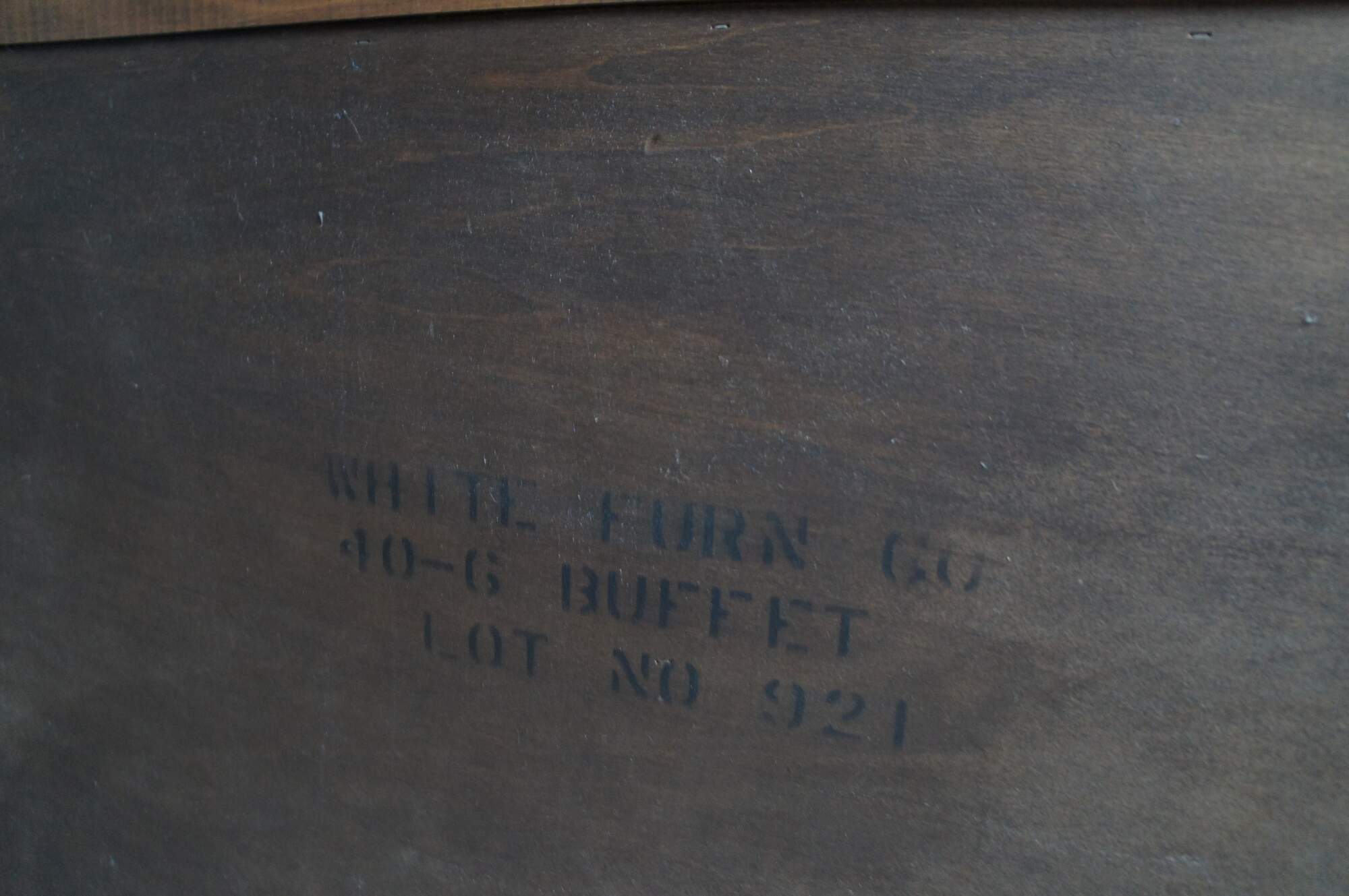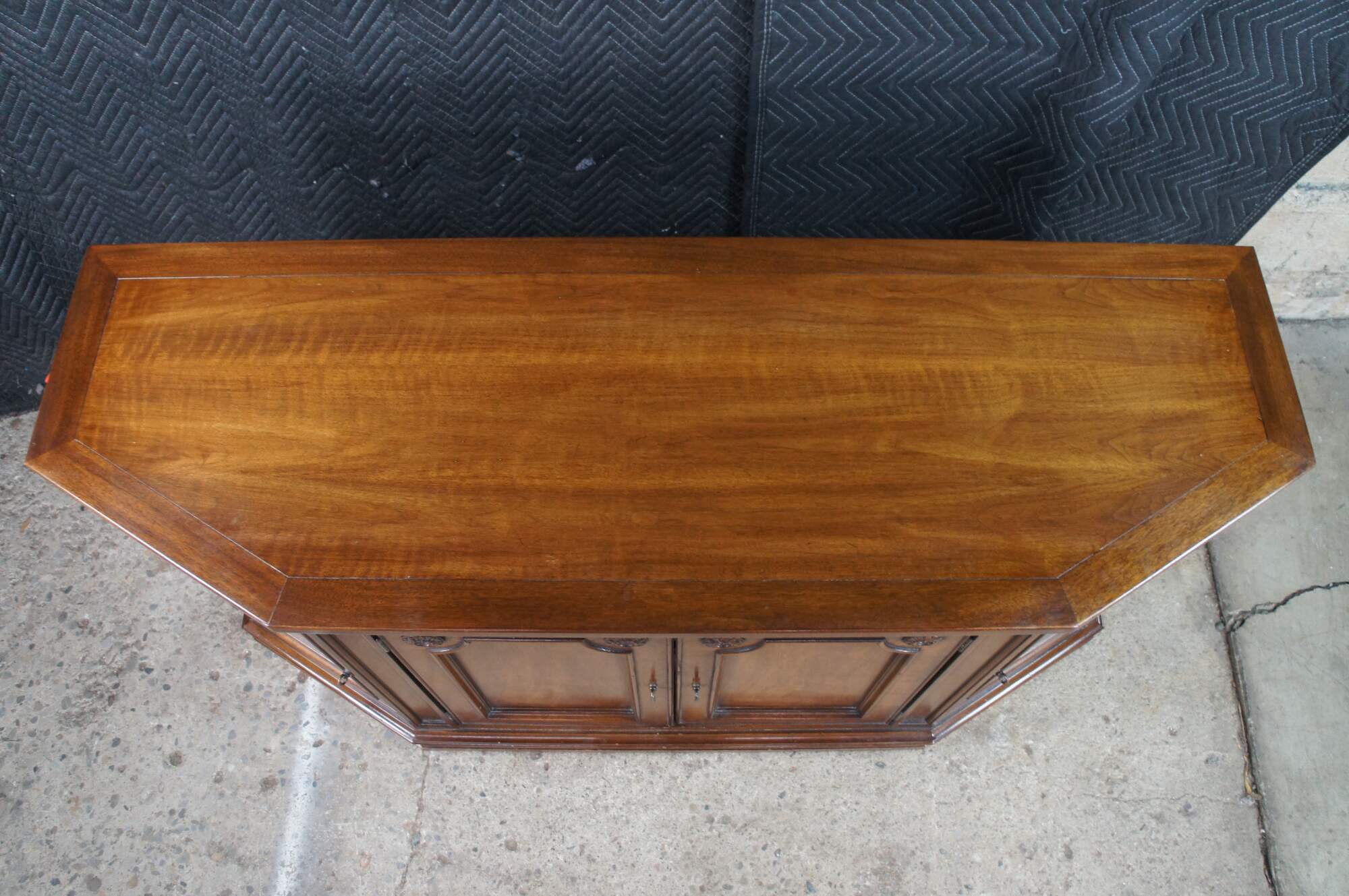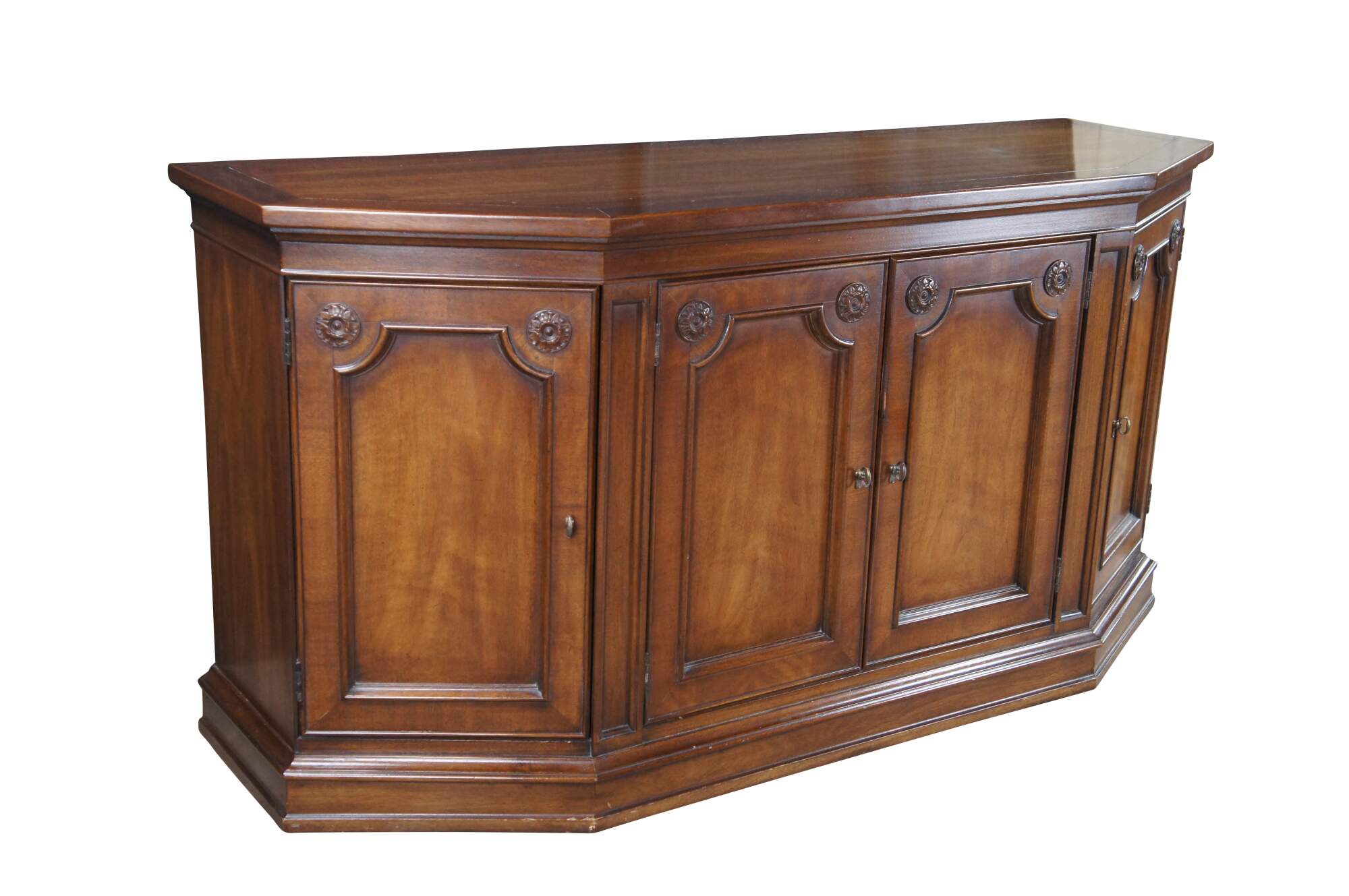 Vintage White Furniture Company Italian Provincial / Regency Style Credenza or Sever, Circa 1970s. Features a rectangular form made from walnut with canted front opening to a central compartment with three dovetailed drawers flanked by outer cabinets with shelf. Uppermost drawer includes silverware cloth. Door fronts have window like molding with neoclassical embelishments along the top corners. Marked 40-6 along the back side.