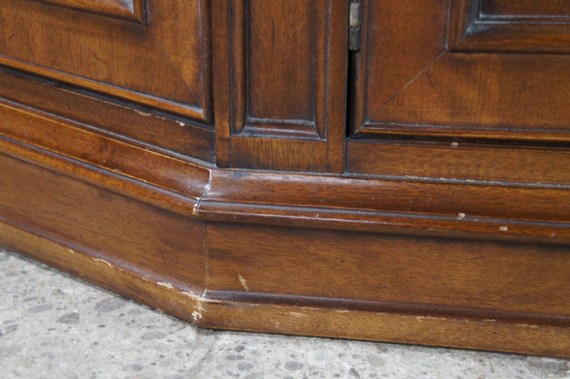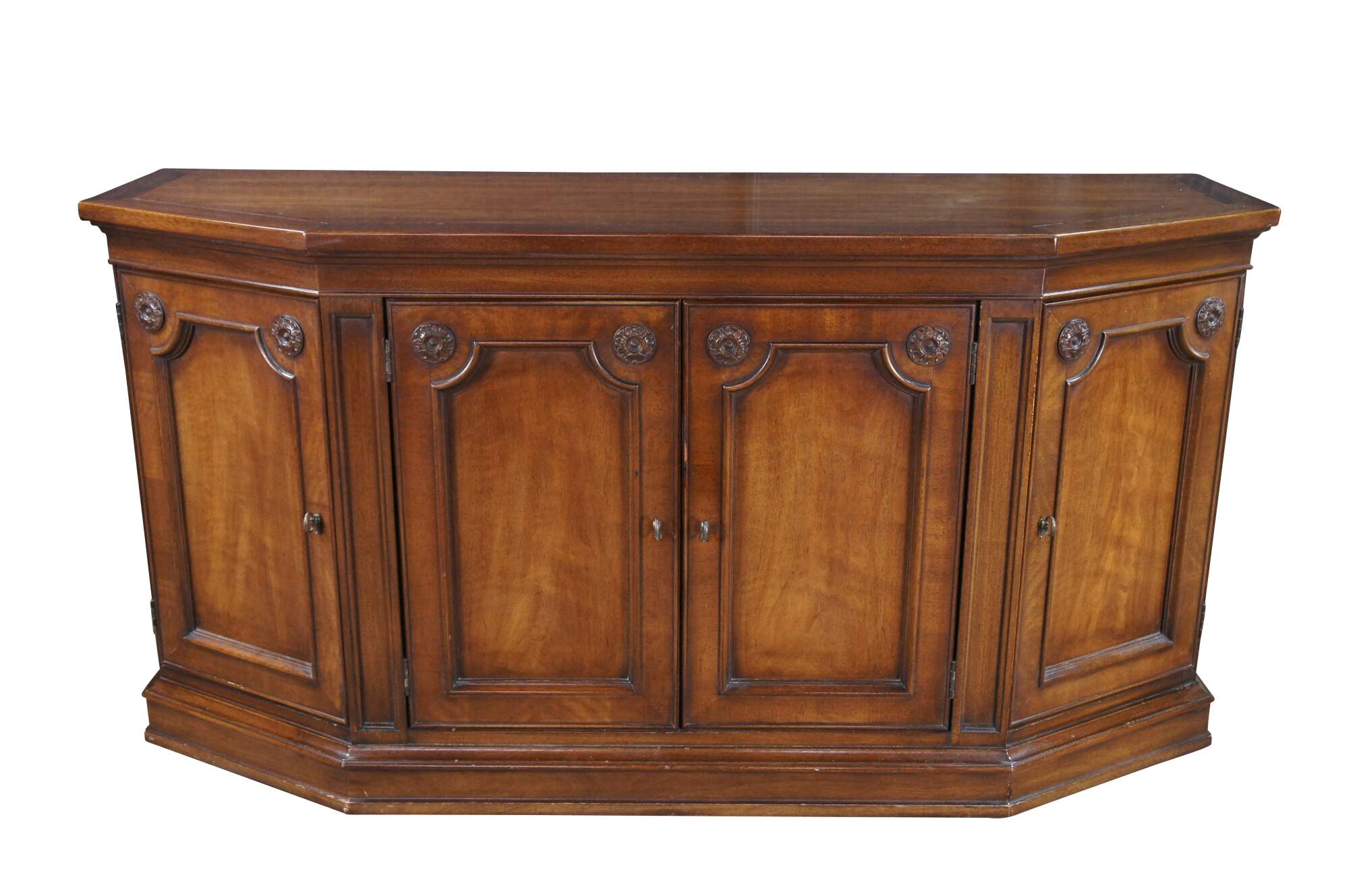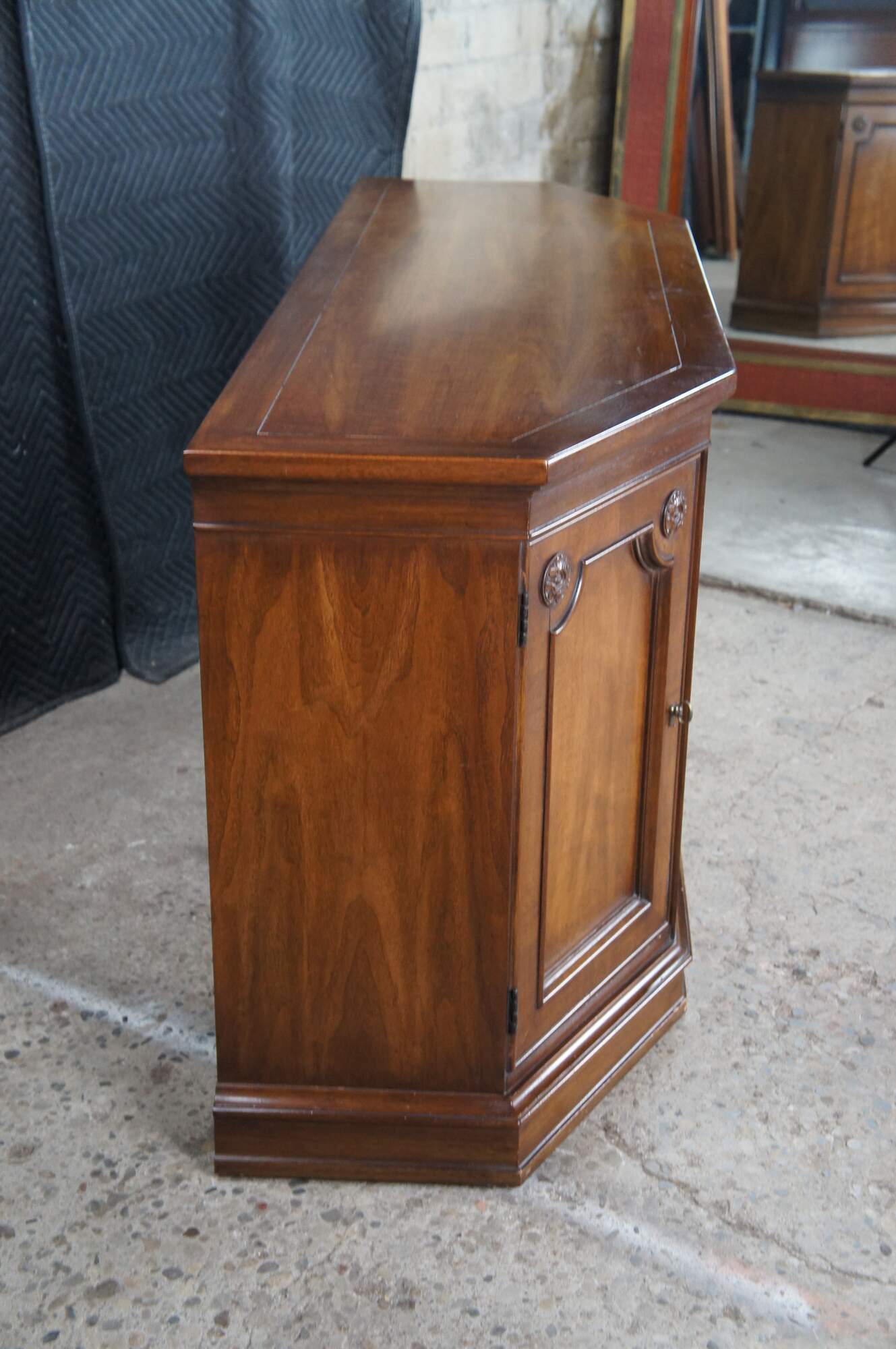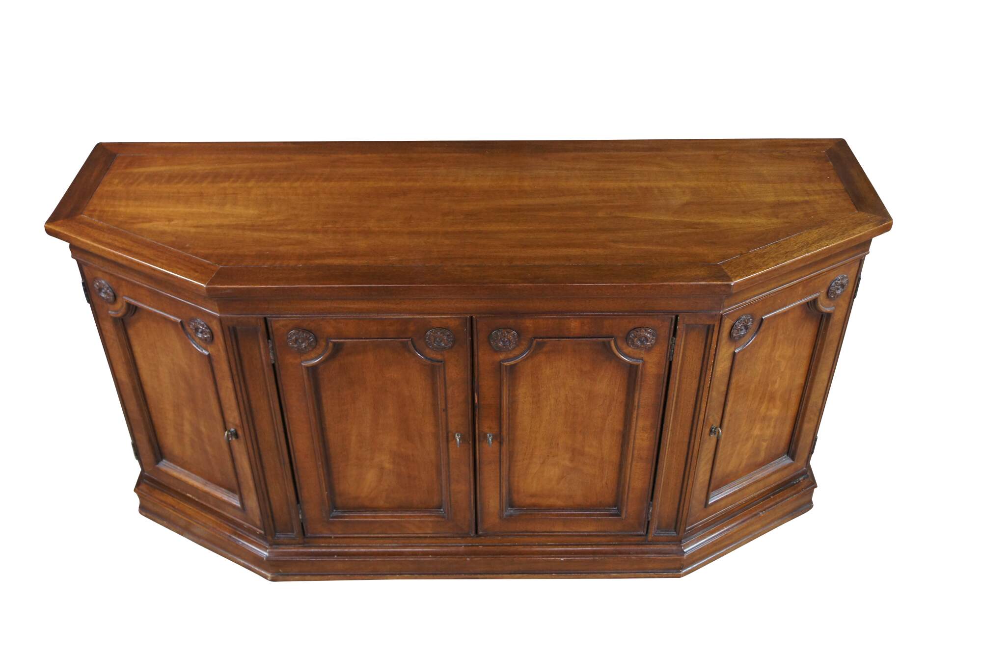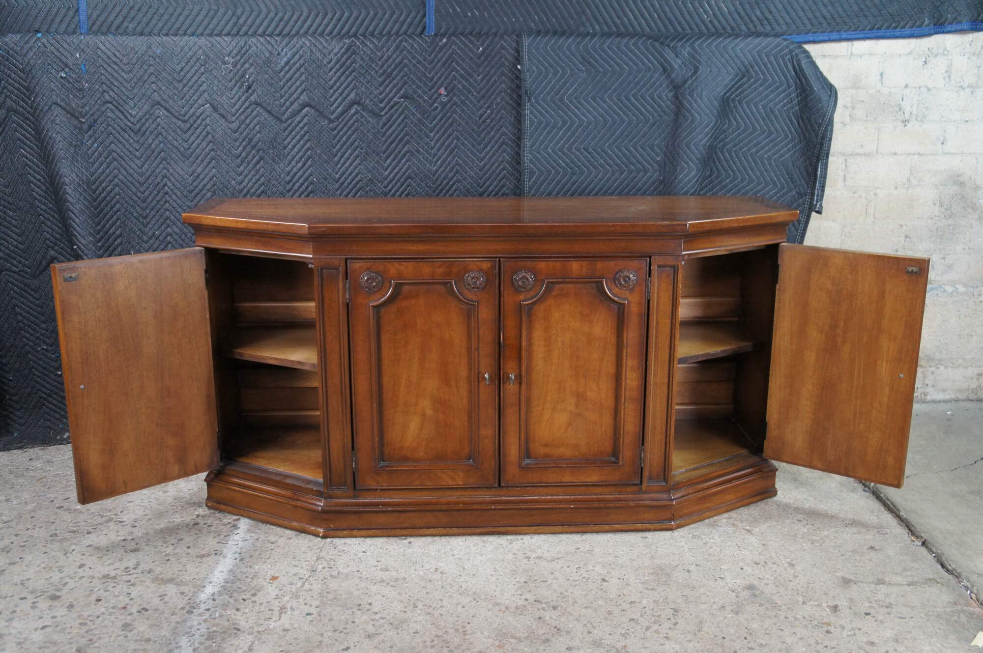 Vintage White Furniture Company Italian Provincial / Regency Style Credenza or Sever, Circa 1970s. Features a rectangular form made from walnut with canted front opening to a central compartment with three dovetailed drawers flanked by outer cabinets with shelf. Uppermost drawer includes silverware cloth. Door fronts have window like molding with neoclassical embelishments along the top corners. Marked 40-6 along the back side.