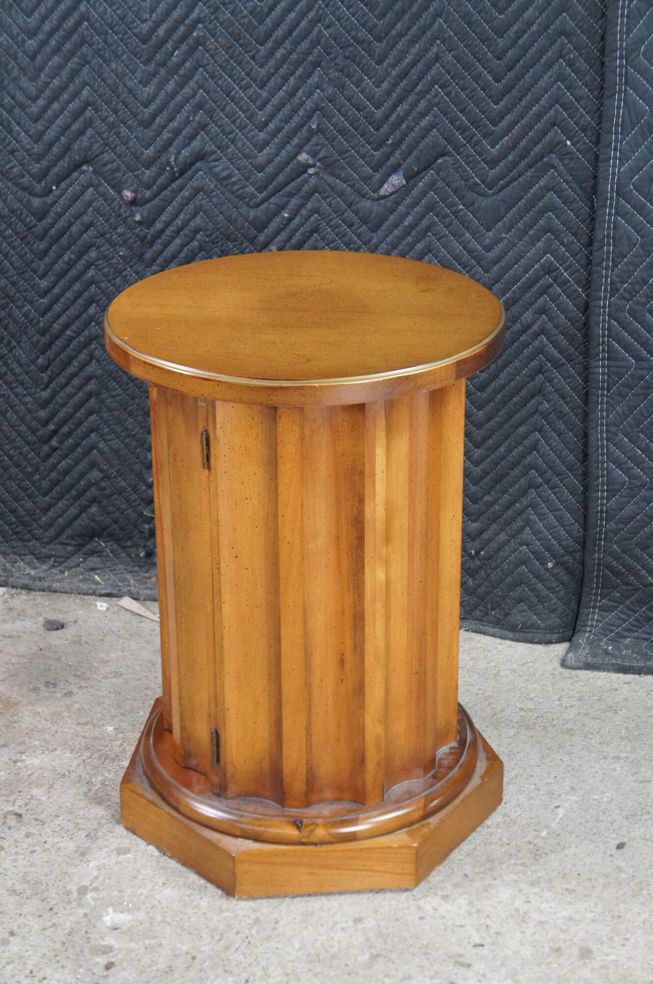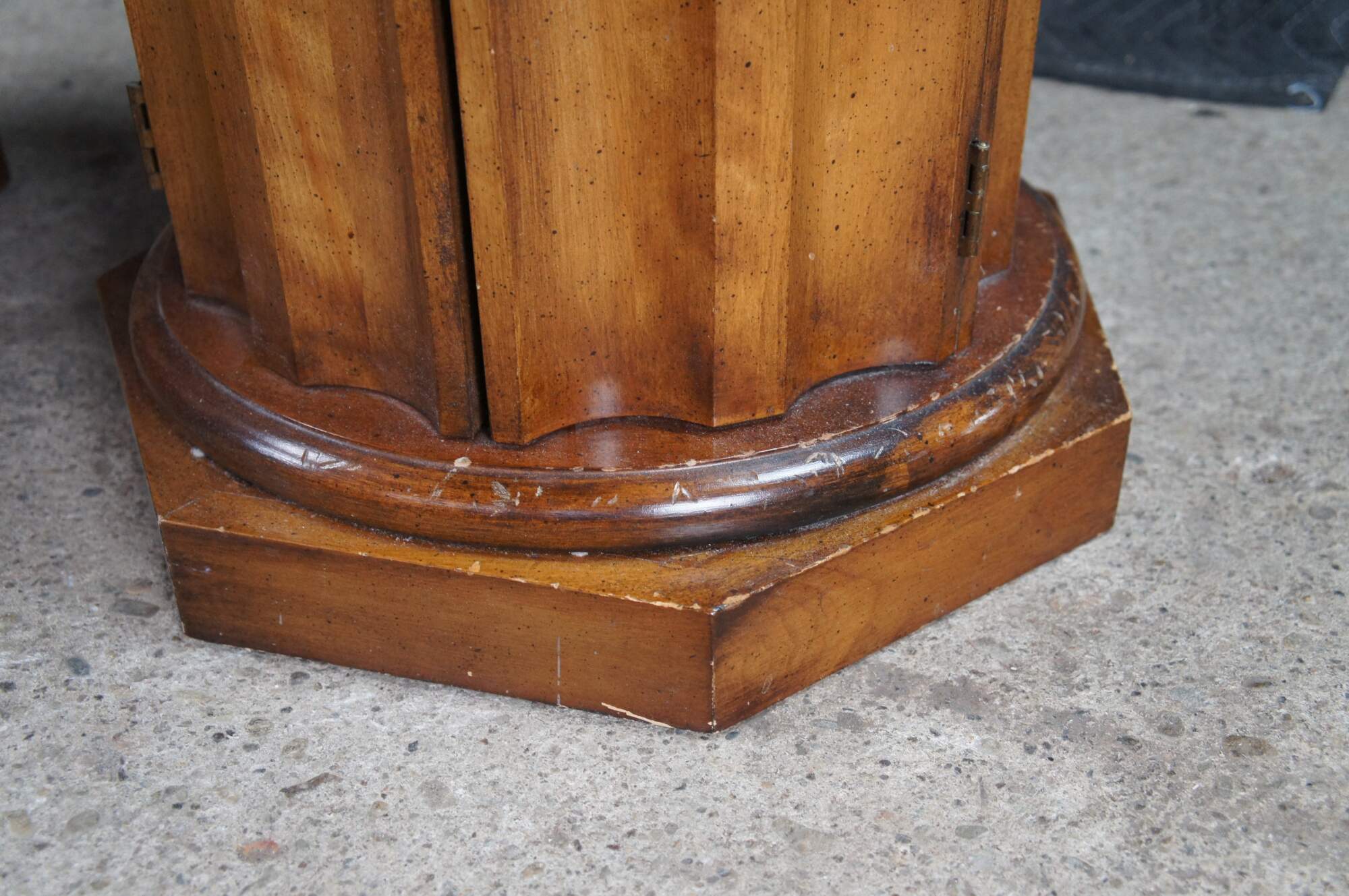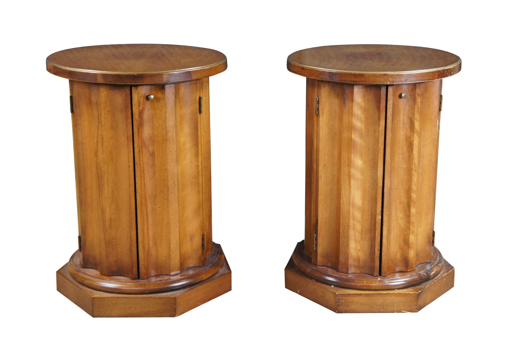 Pair of Mid Century Modern Somno Style Pedestal Tables or Sculpture Stands by American of Chicago, circa 1969. Features a round corinthian column form over octagonal plinth base. The cabinets opens via double doors to an interior removable shelf. Made in august of 69'.