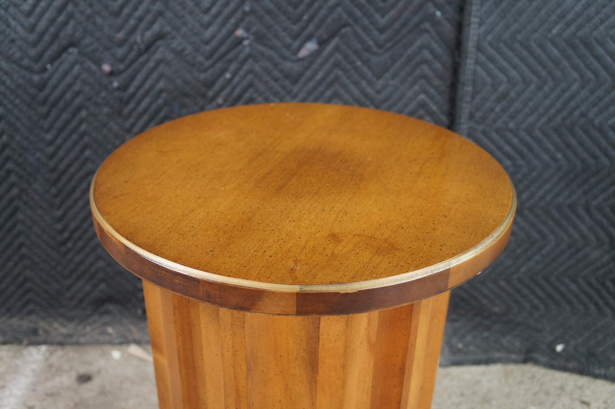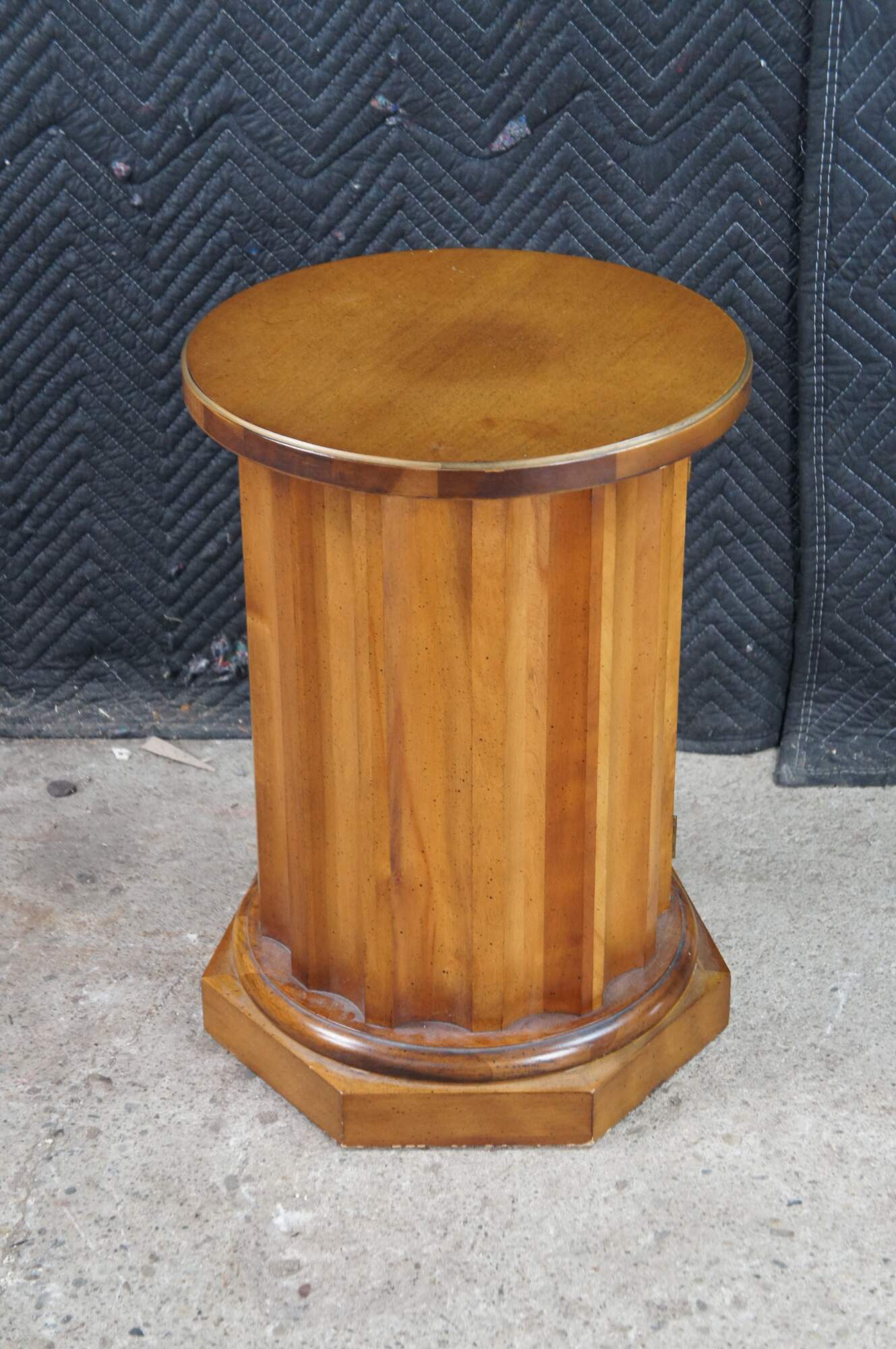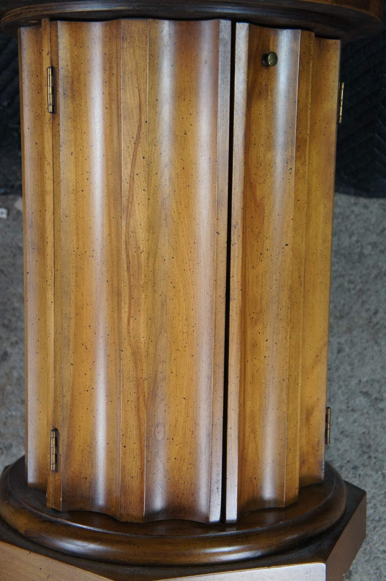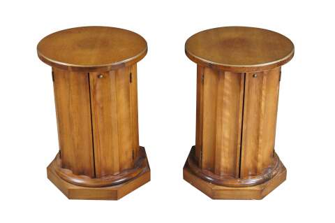 Pair of Mid Century Modern Somno Style Pedestal Tables or Sculpture Stands by American of Chicago, circa 1969. Features a round corinthian column form over octagonal plinth base. The cabinets opens via double doors to an interior removable shelf. Made in august of 69'.