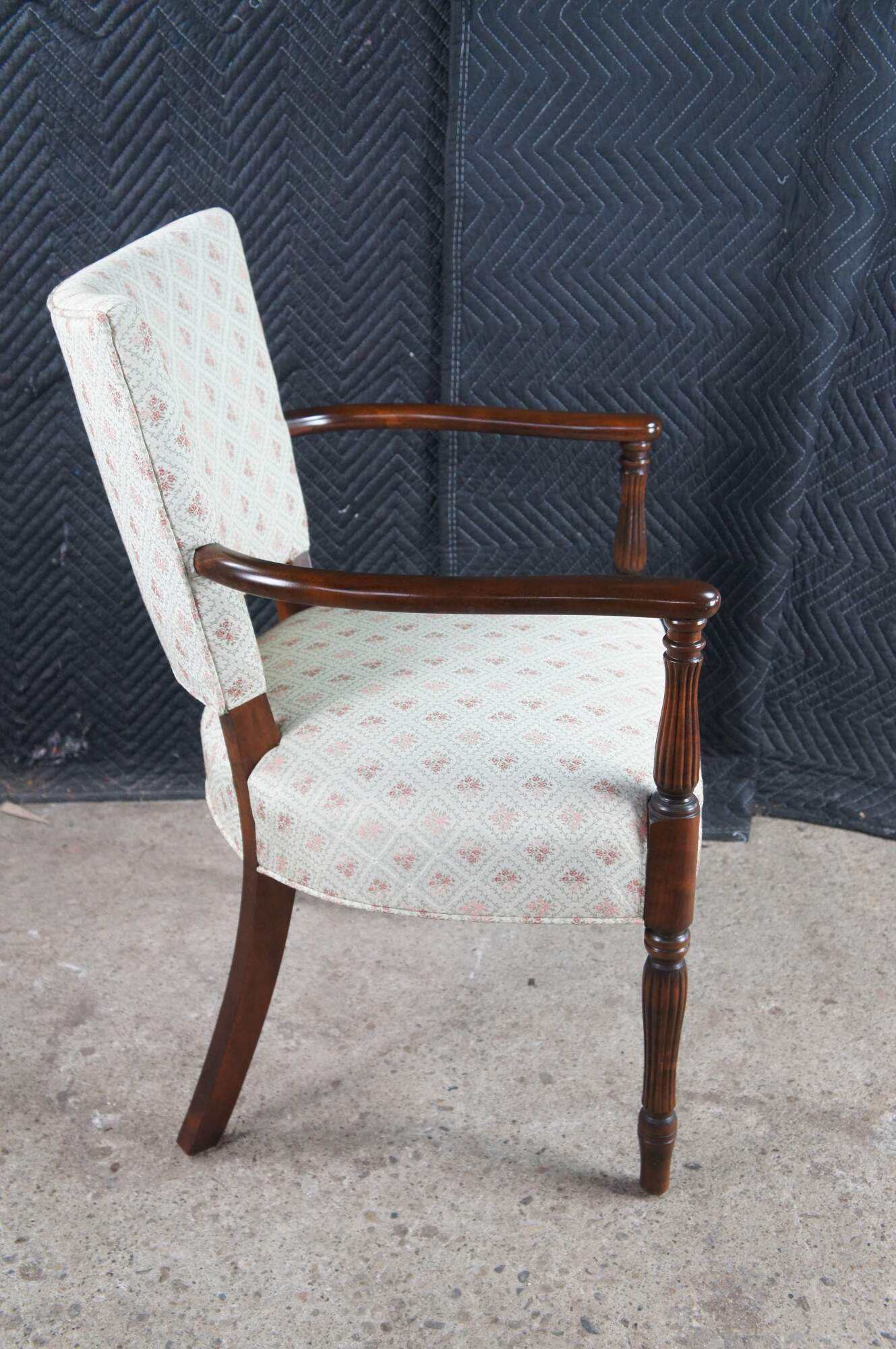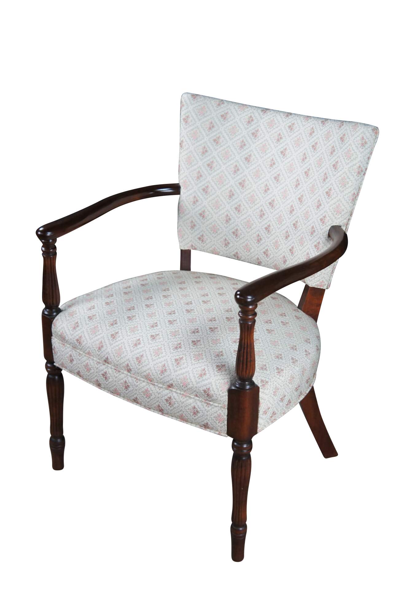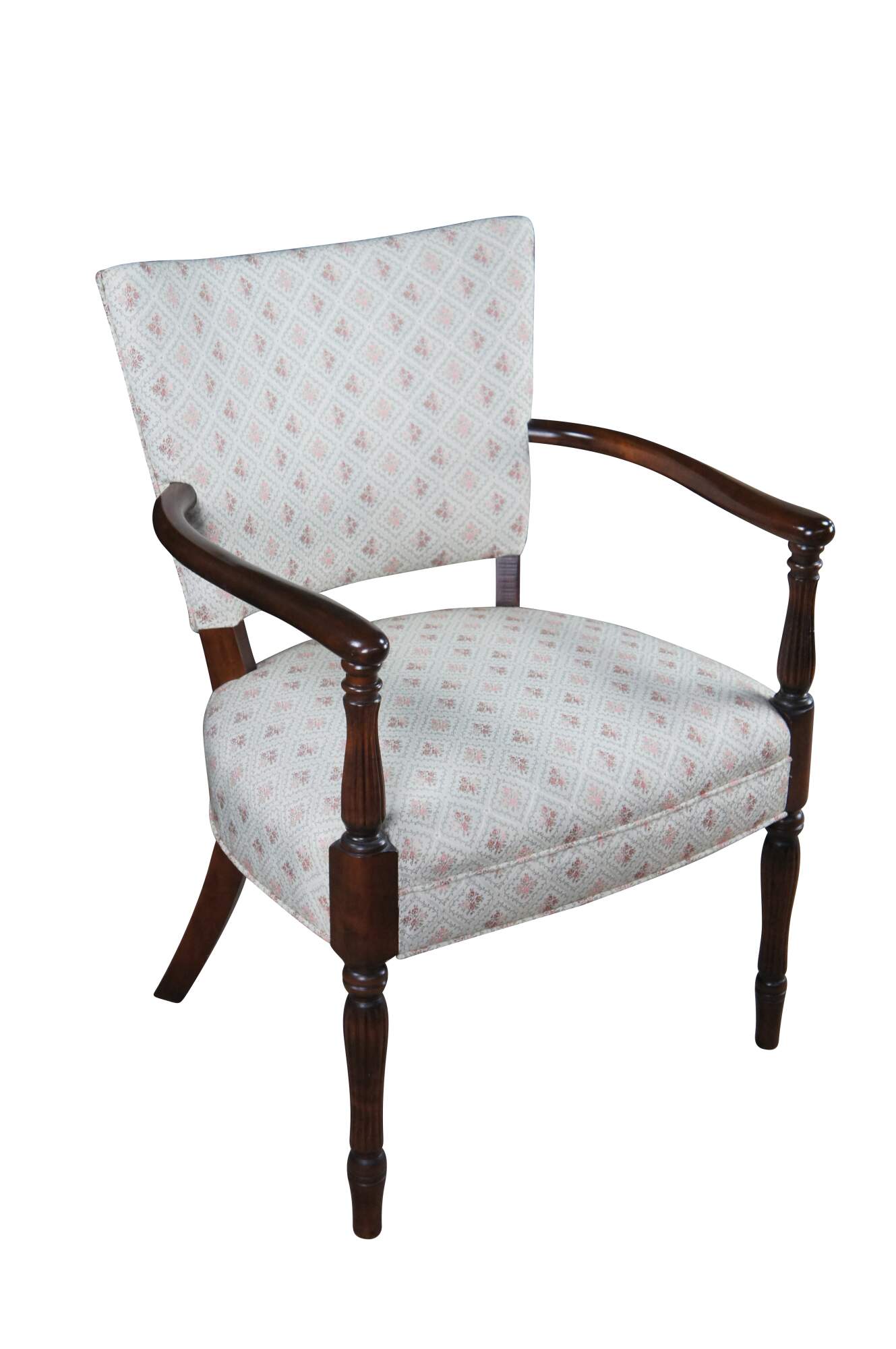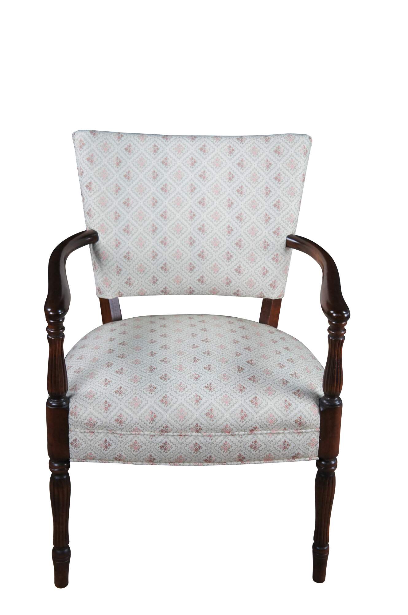 Mid 20th Century Martha Washington Style Arm Chair. Features a mahogany frame with a flared back and contoured arms over reeded legs with arrow feet. This chair is similar to the one used by Edith Bunker (portrayed by Jean Stapleton) in the television series All in the Family. All in the Family was a sitcom that aired on the CBS television network from 1971-1979.
