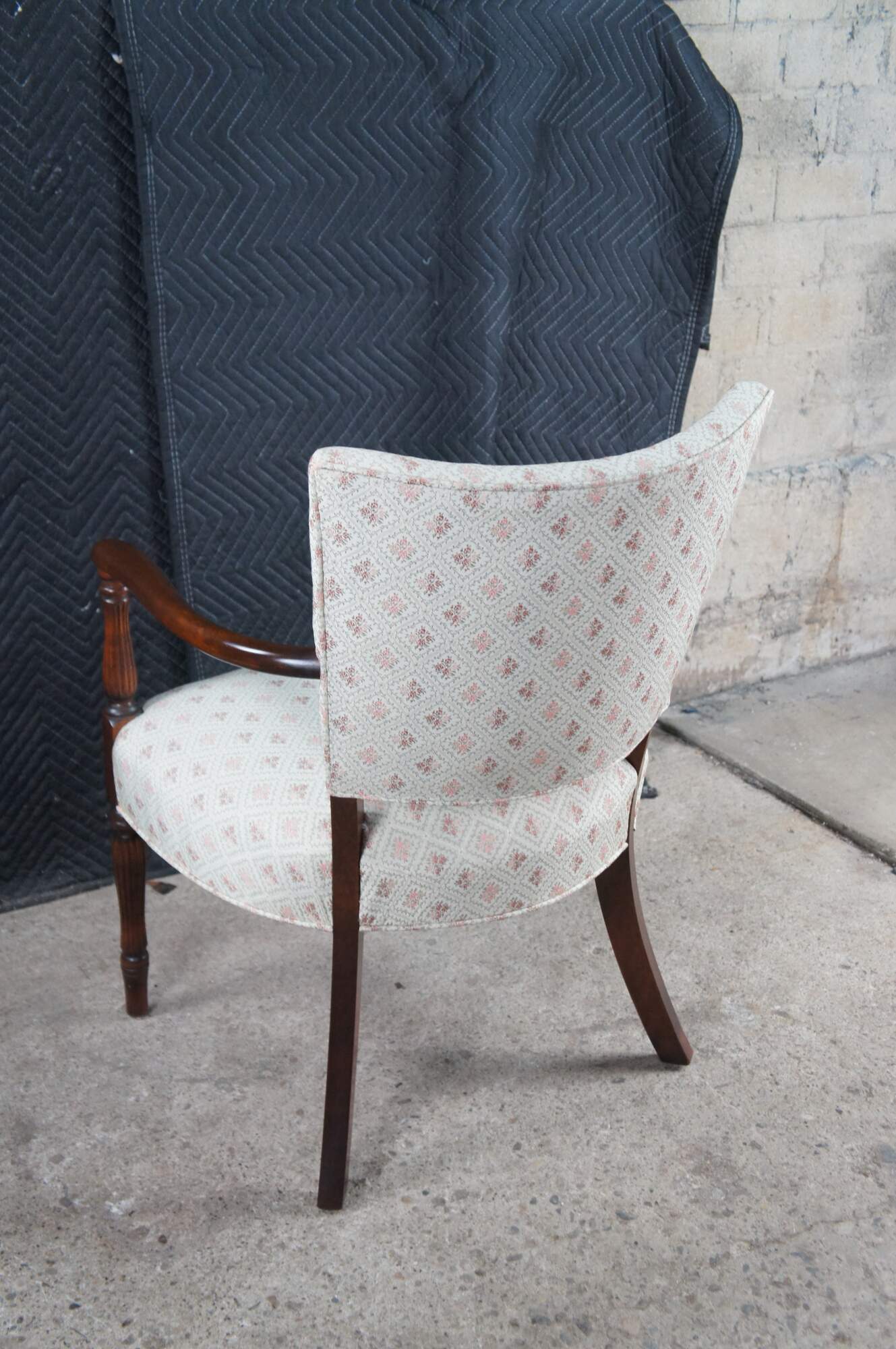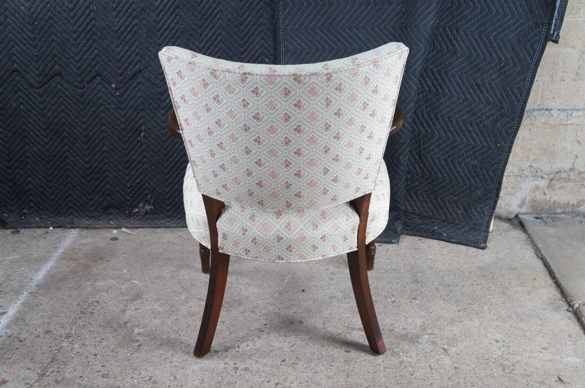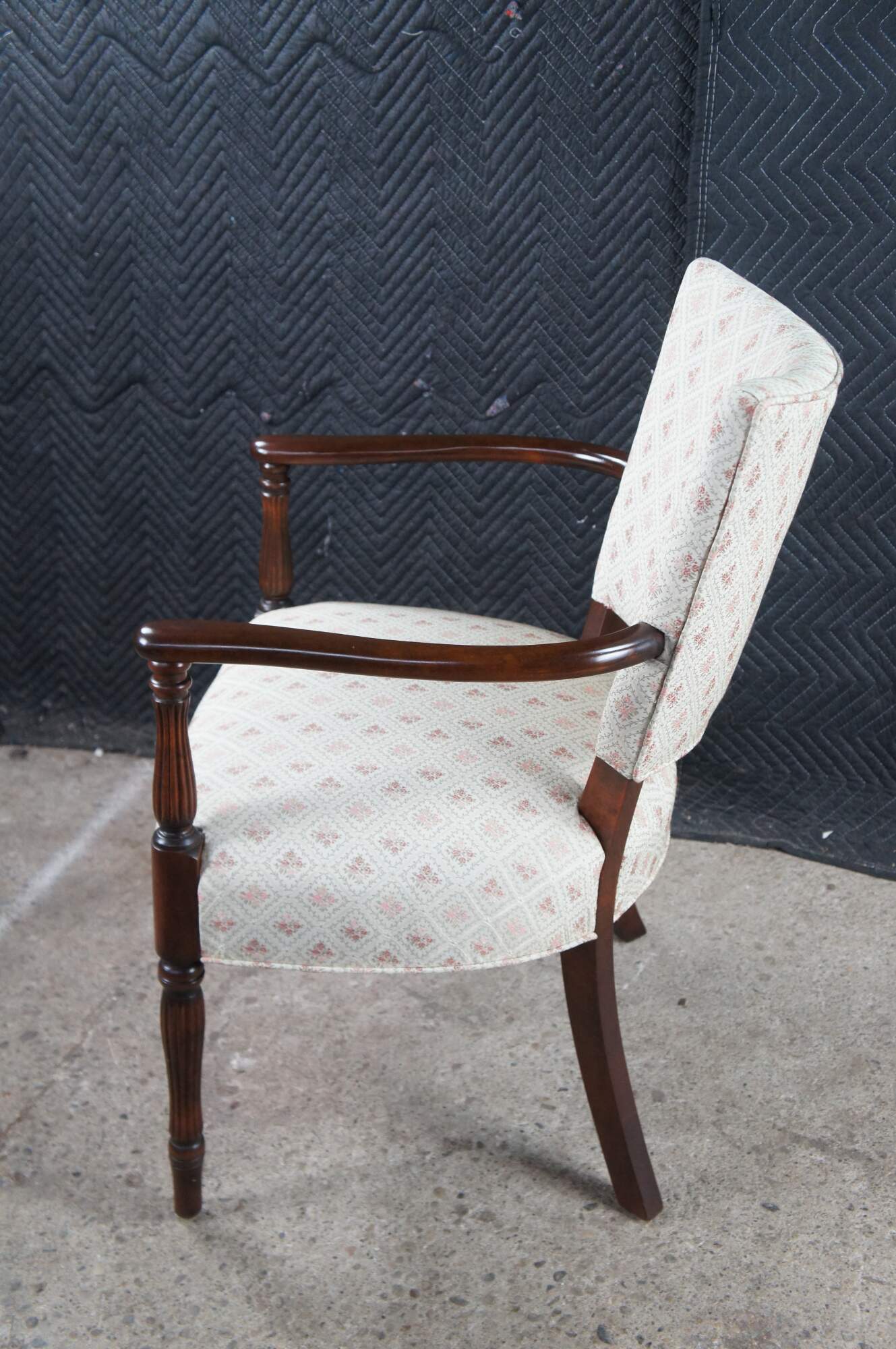 Mid 20th Century Martha Washington Style Arm Chair. Features a mahogany frame with a flared back and contoured arms over reeded legs with arrow feet. This chair is similar to the one used by Edith Bunker (portrayed by Jean Stapleton) in the television series All in the Family. All in the Family was a sitcom that aired on the CBS television network from 1971-1979.