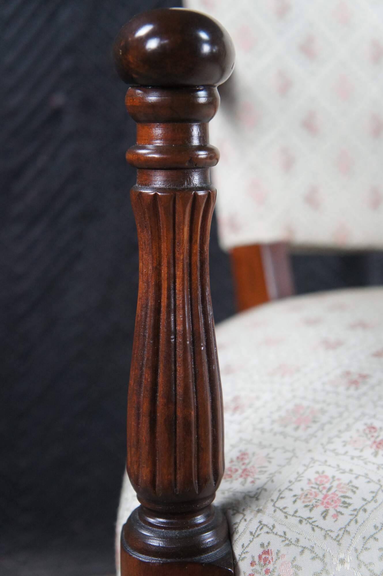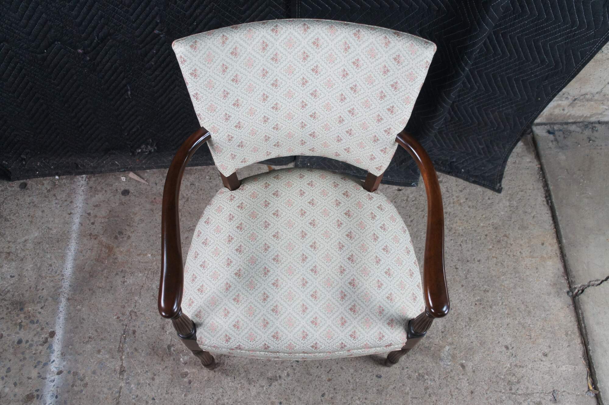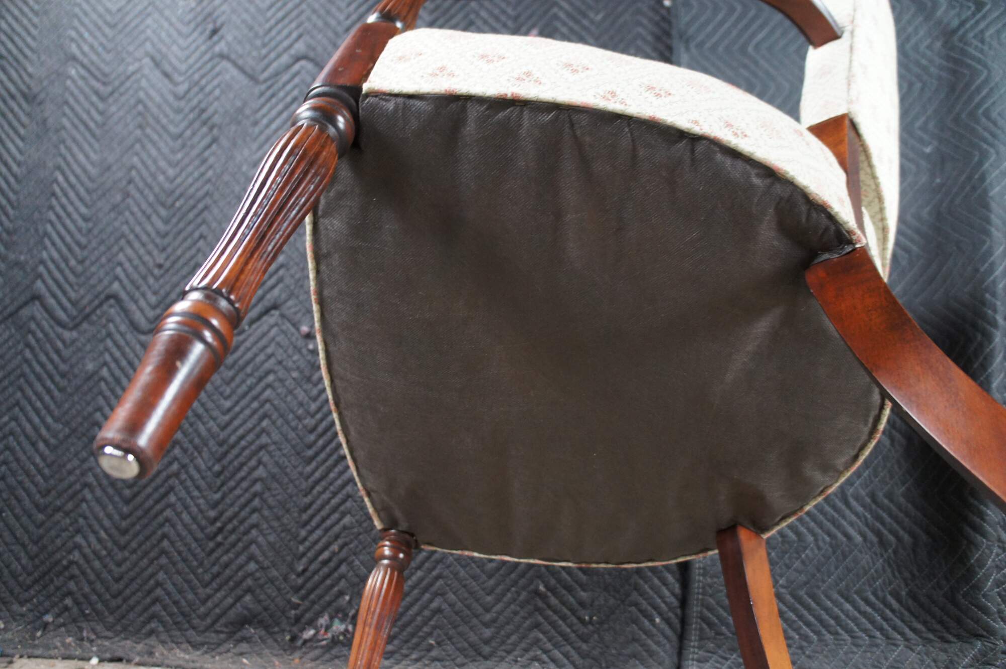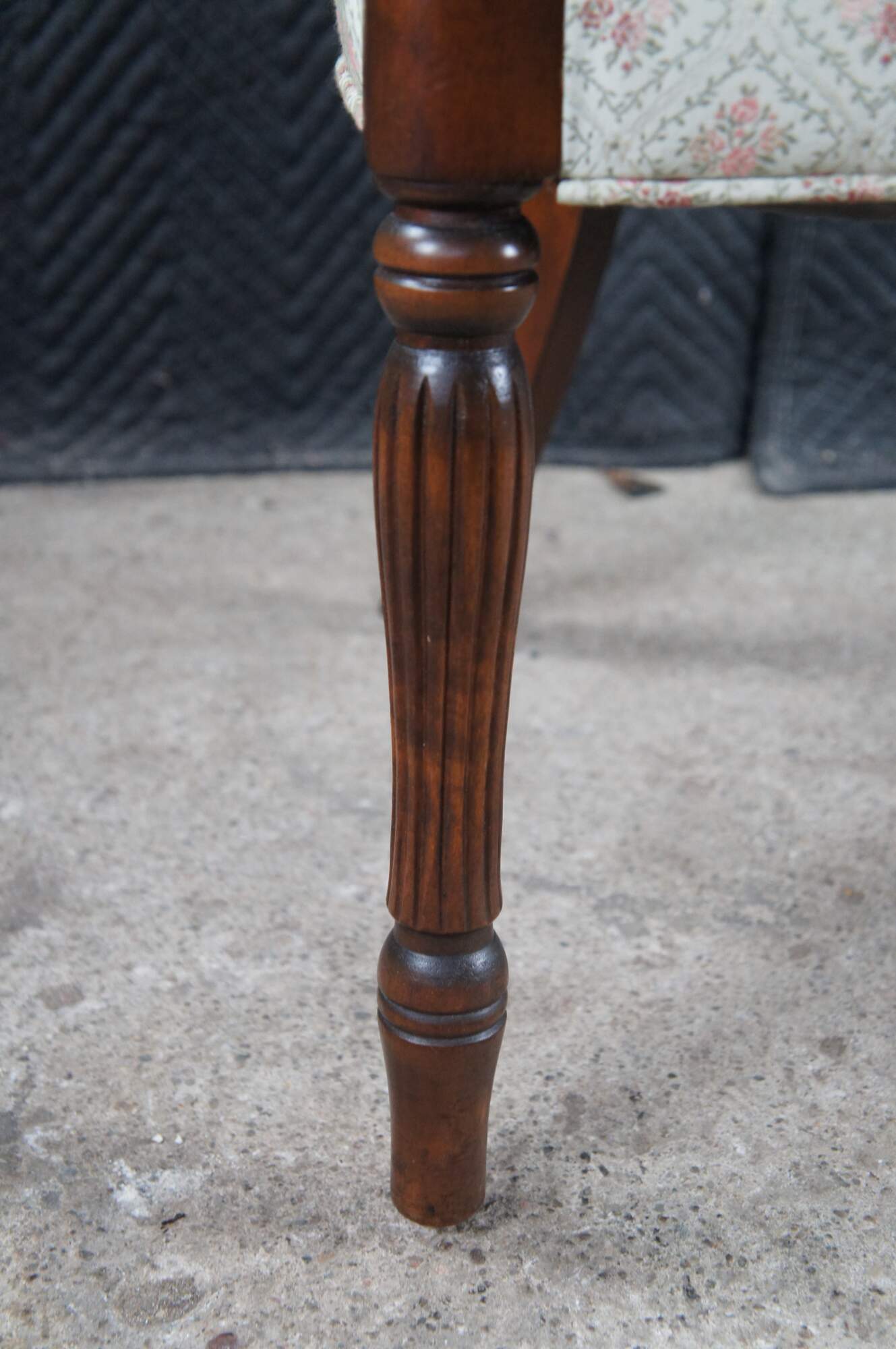 Mid 20th Century Martha Washington Style Arm Chair. Features a mahogany frame with a flared back and contoured arms over reeded legs with arrow feet. This chair is similar to the one used by Edith Bunker (portrayed by Jean Stapleton) in the television series All in the Family. All in the Family was a sitcom that aired on the CBS television network from 1971-1979.
