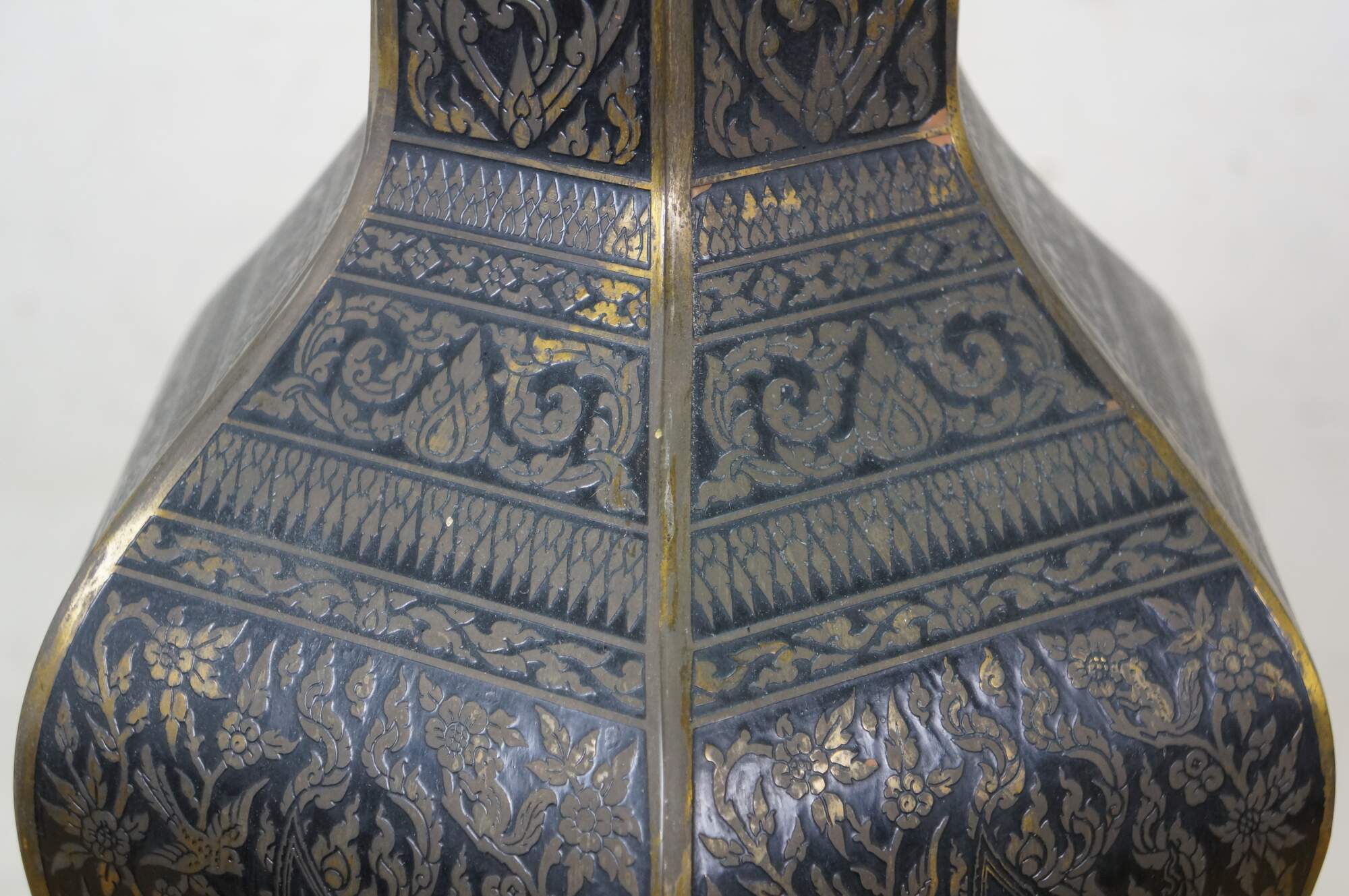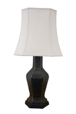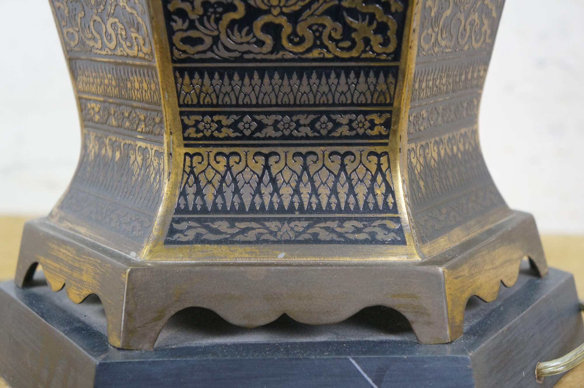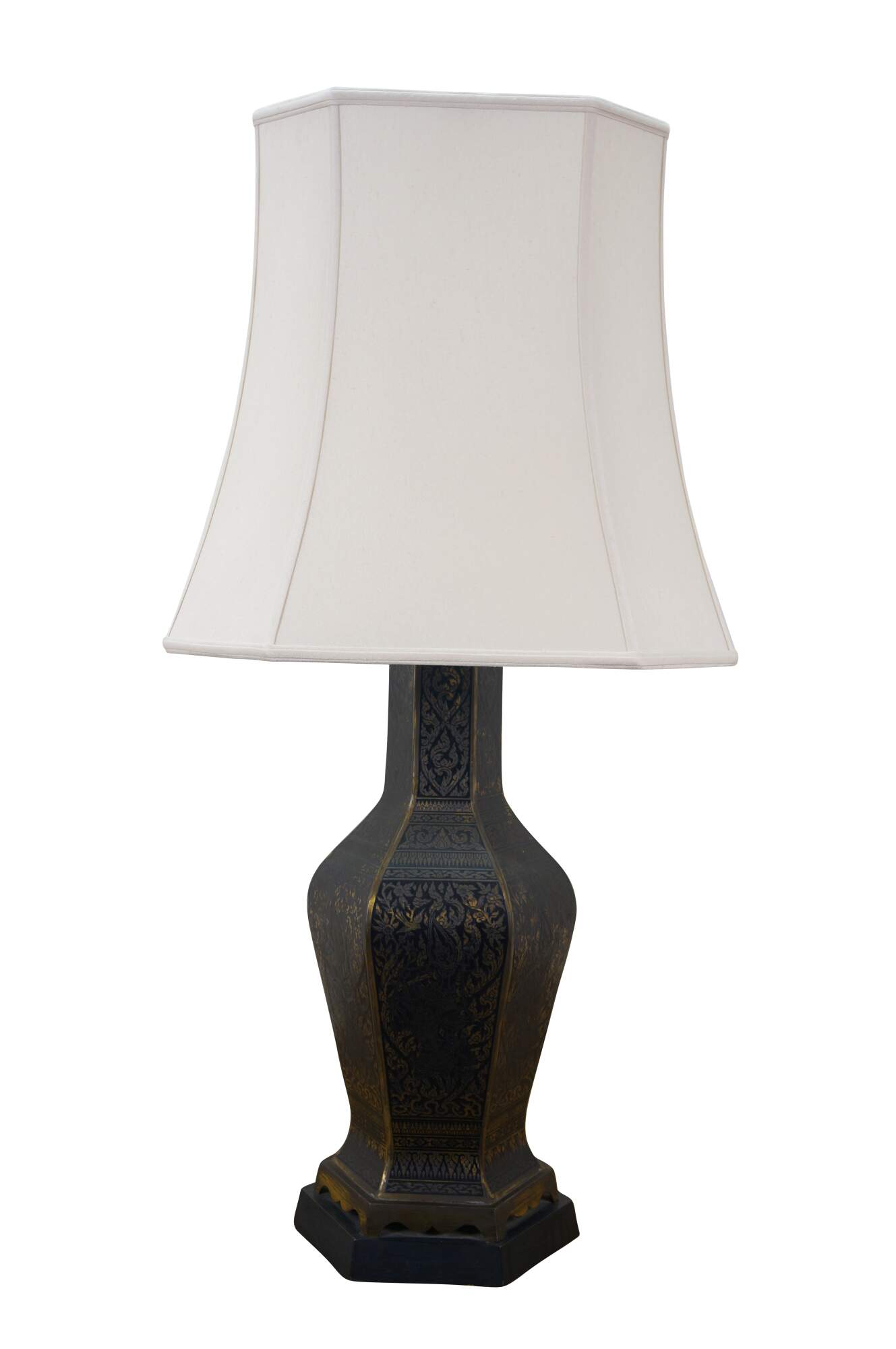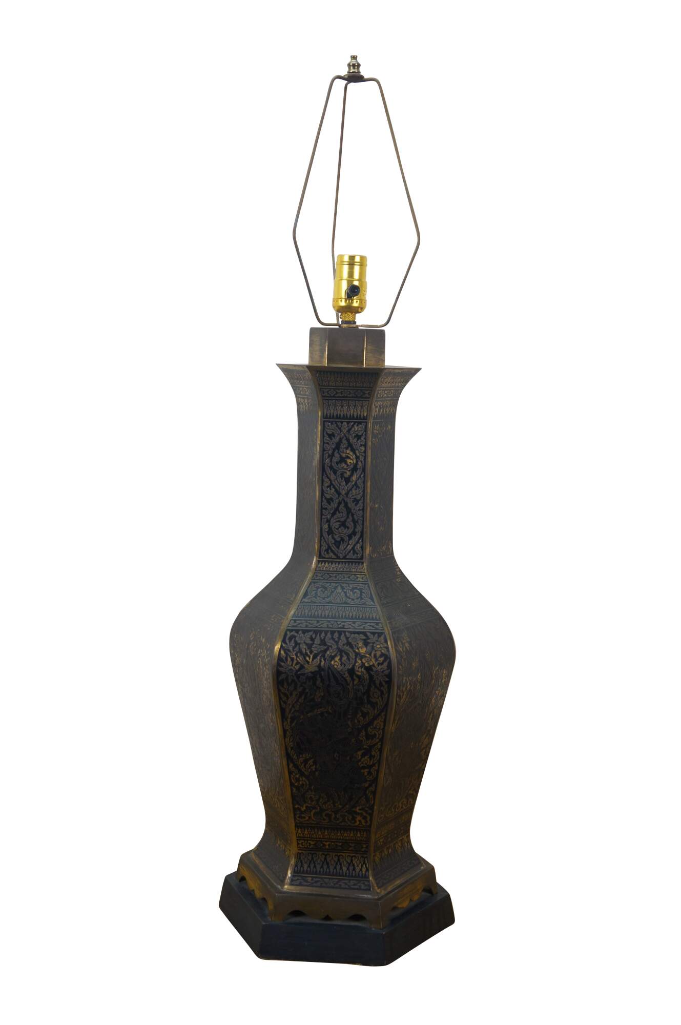 Mid 20th century enameled brass table / banquet / parlor lamp - hexagonal vase shape on black wooden base, etched with Thai figures and intricate floral / foliate / bird and squirrel designs against black enamel. Fixed harp; brass finial. Includes white fabric shade.