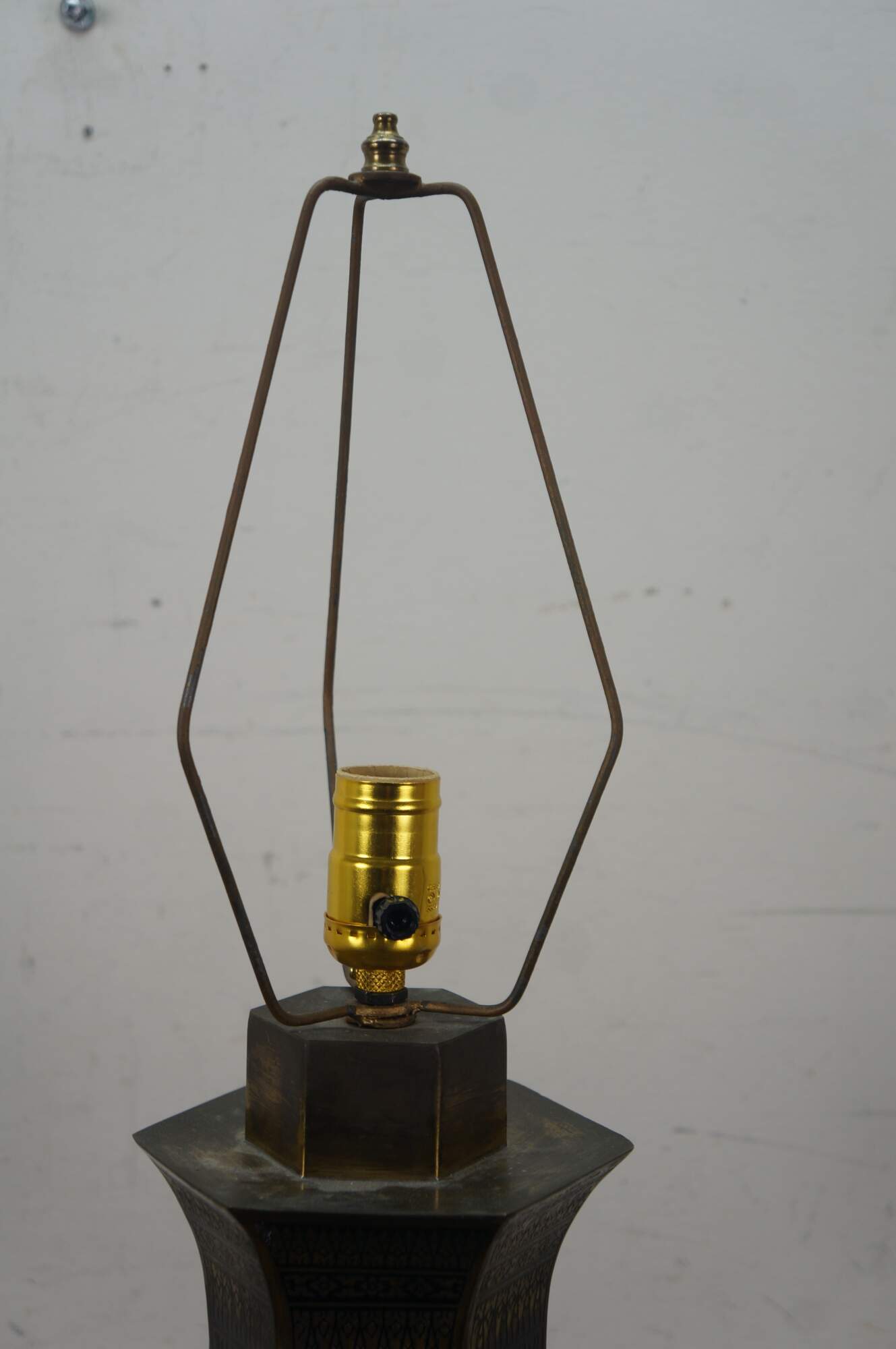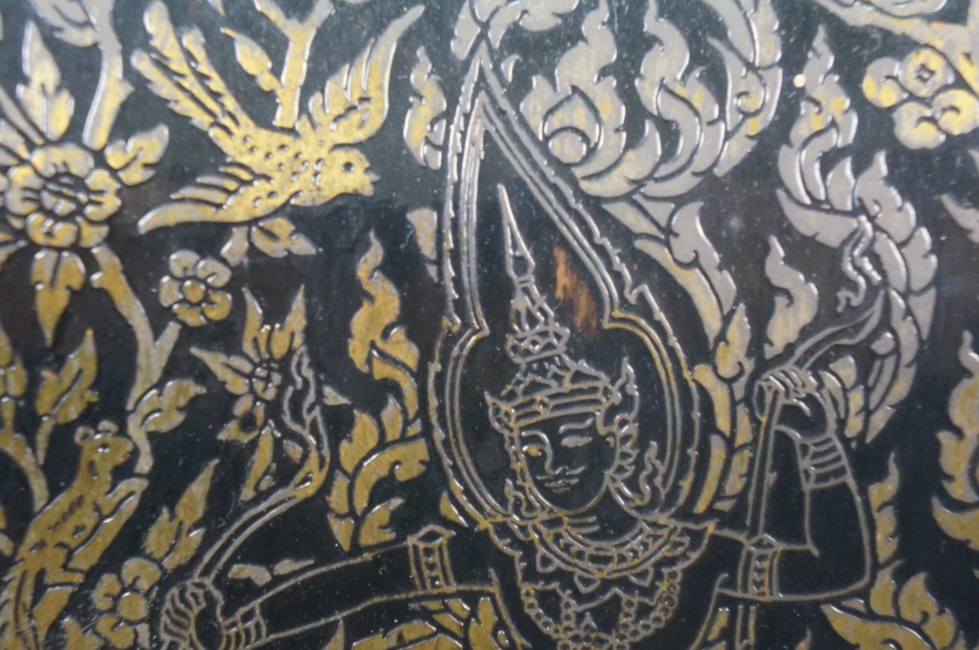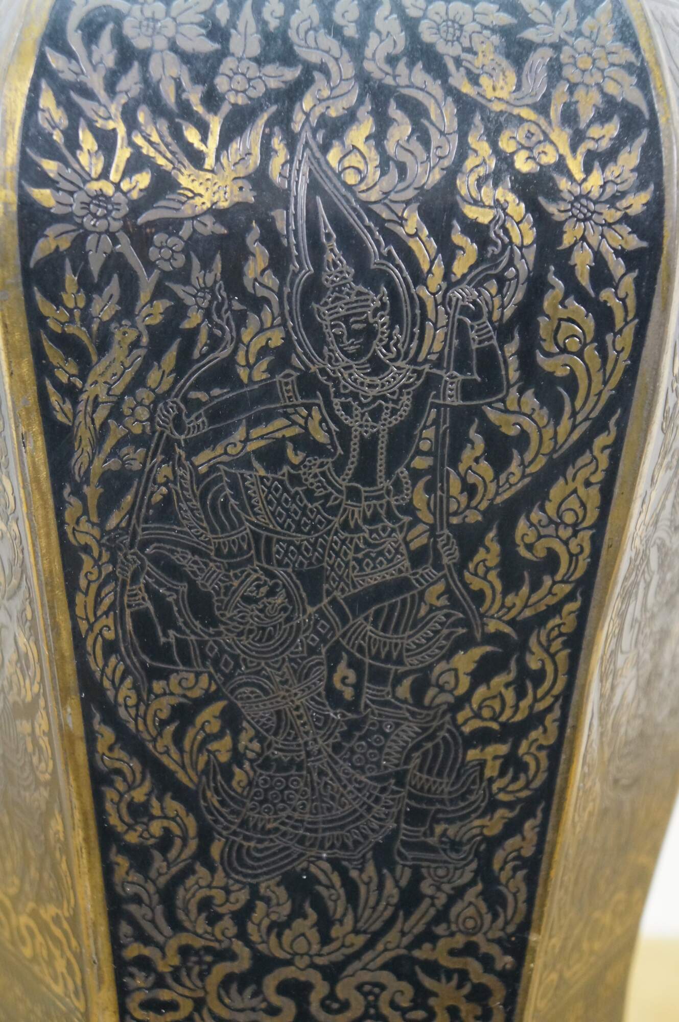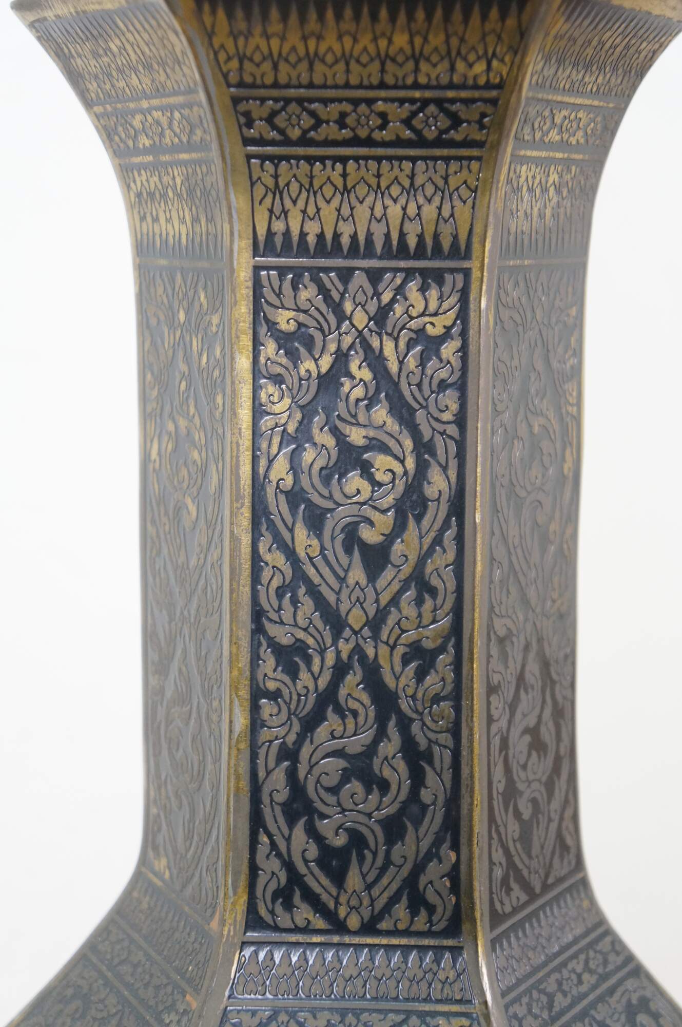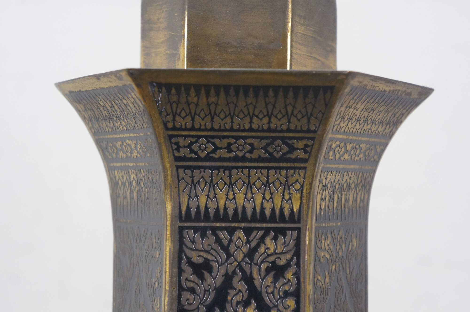 Mid 20th century enameled brass table / banquet / parlor lamp - hexagonal vase shape on black wooden base, etched with Thai figures and intricate floral / foliate / bird and squirrel designs against black enamel. Fixed harp; brass finial. Includes white fabric shade.