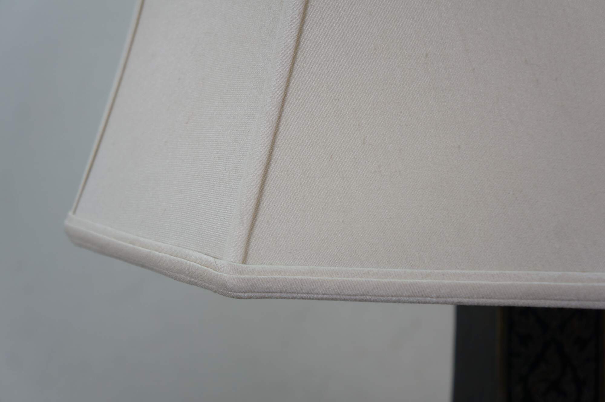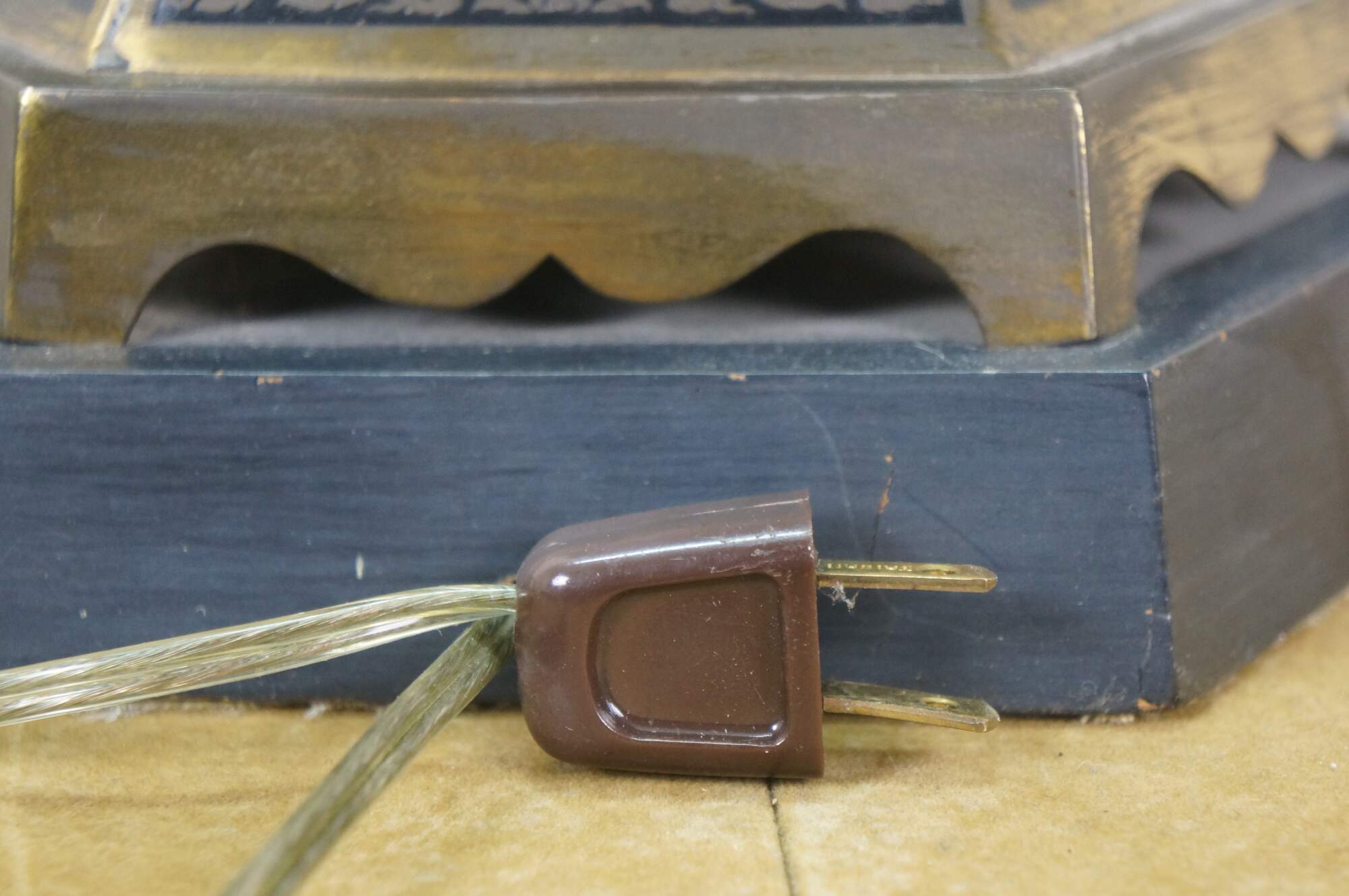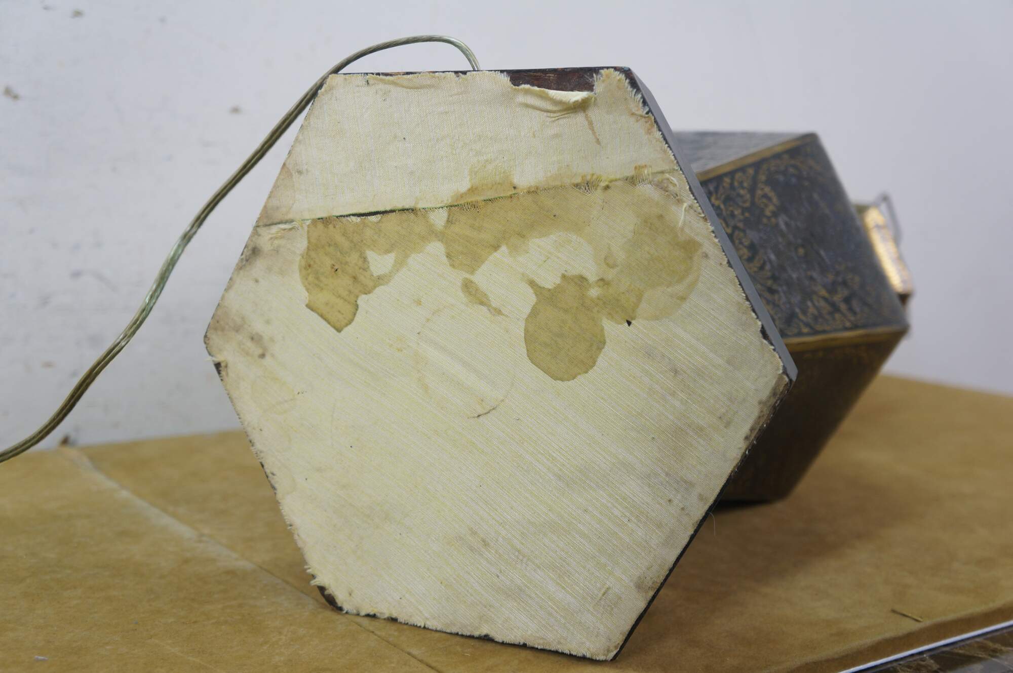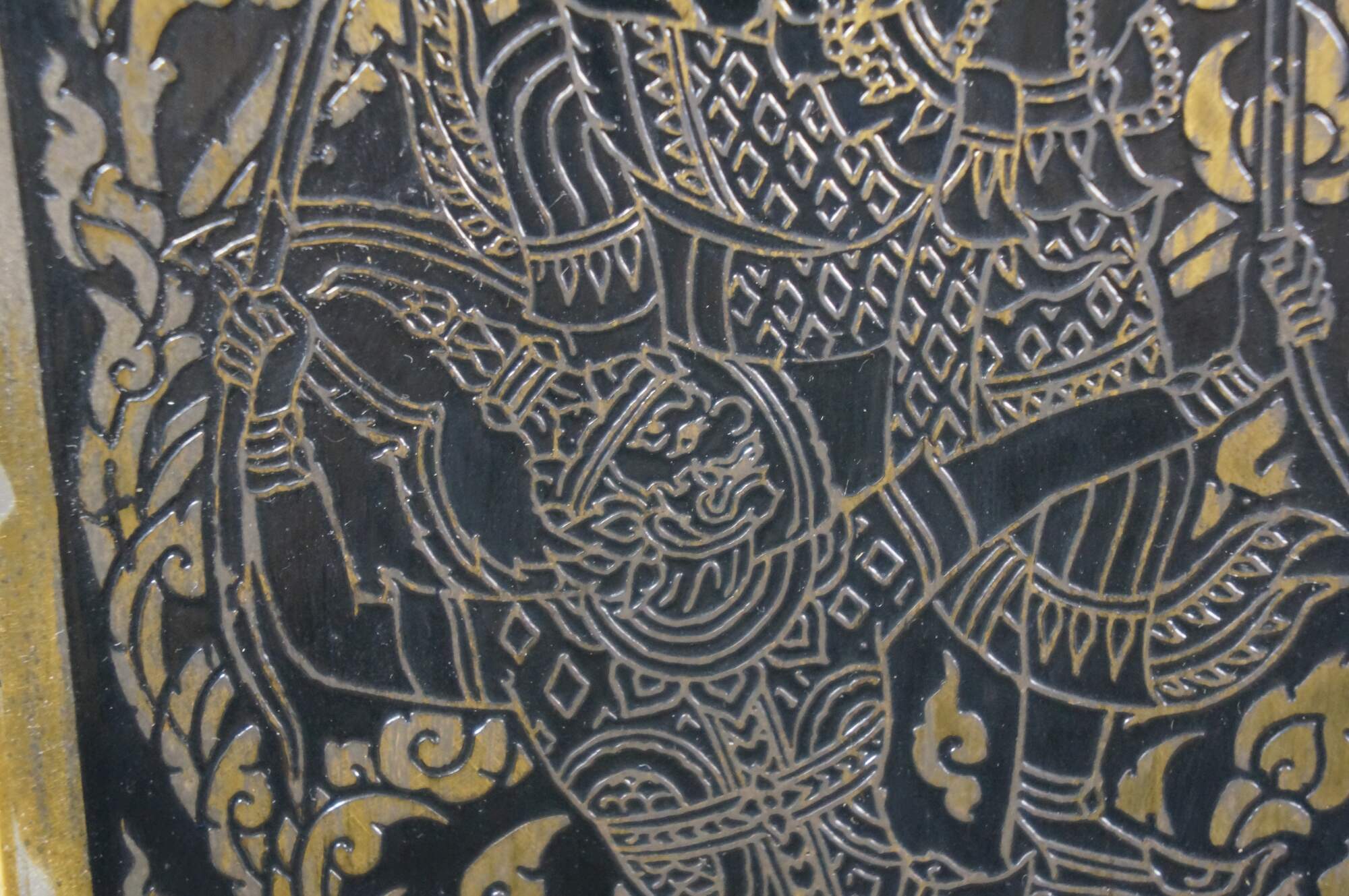 Mid 20th century enameled brass table / banquet / parlor lamp - hexagonal vase shape on black wooden base, etched with Thai figures and intricate floral / foliate / bird and squirrel designs against black enamel. Fixed harp; brass finial. Includes white fabric shade.