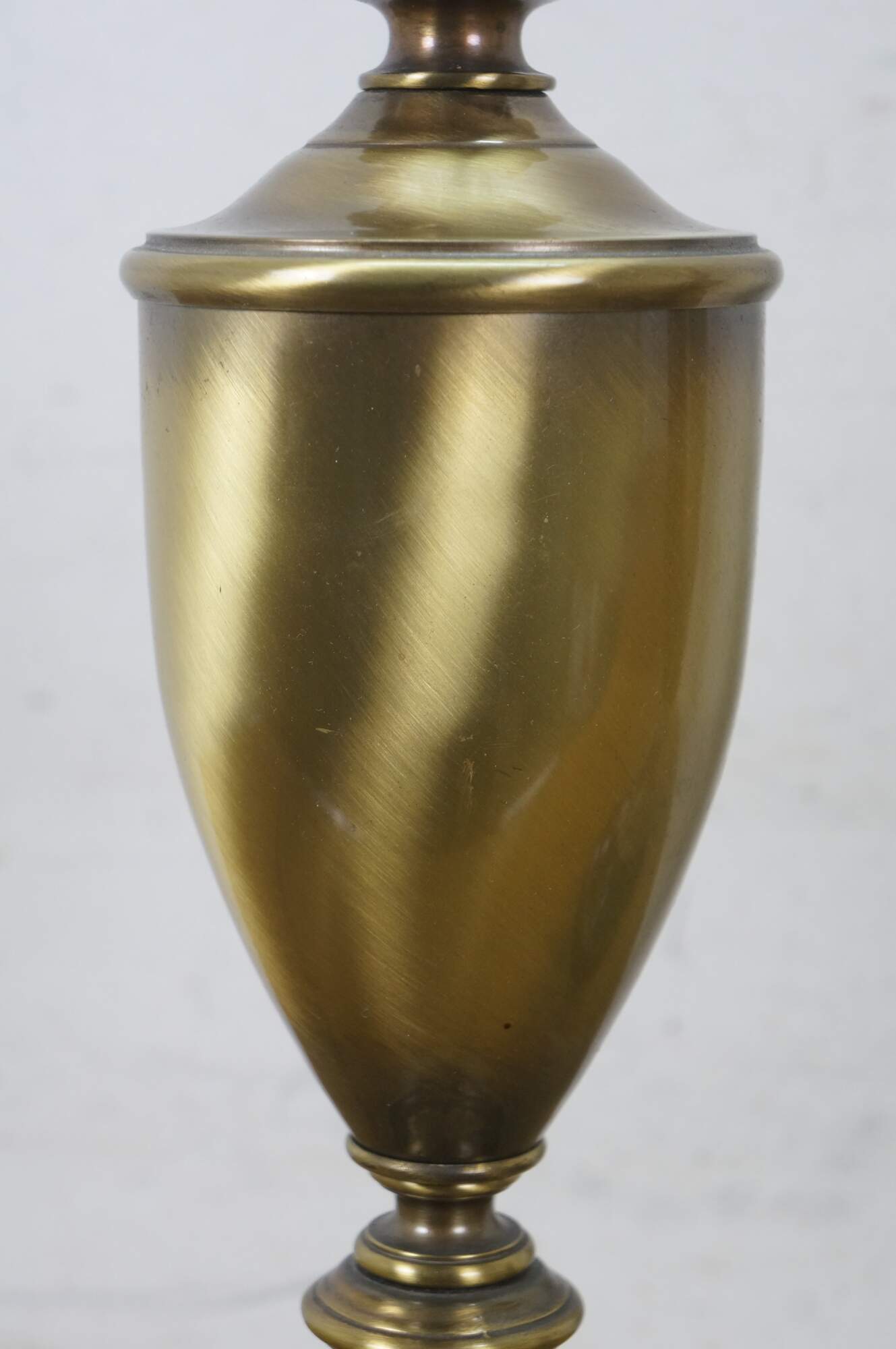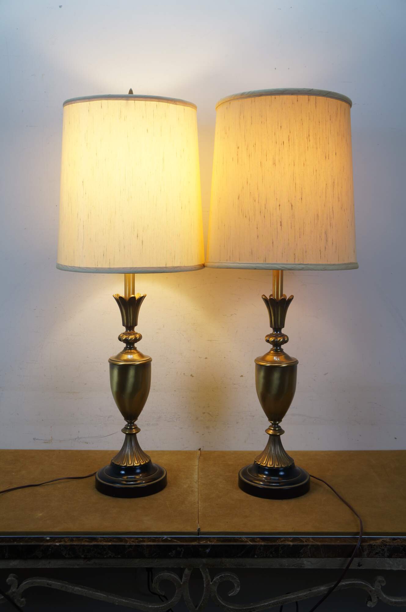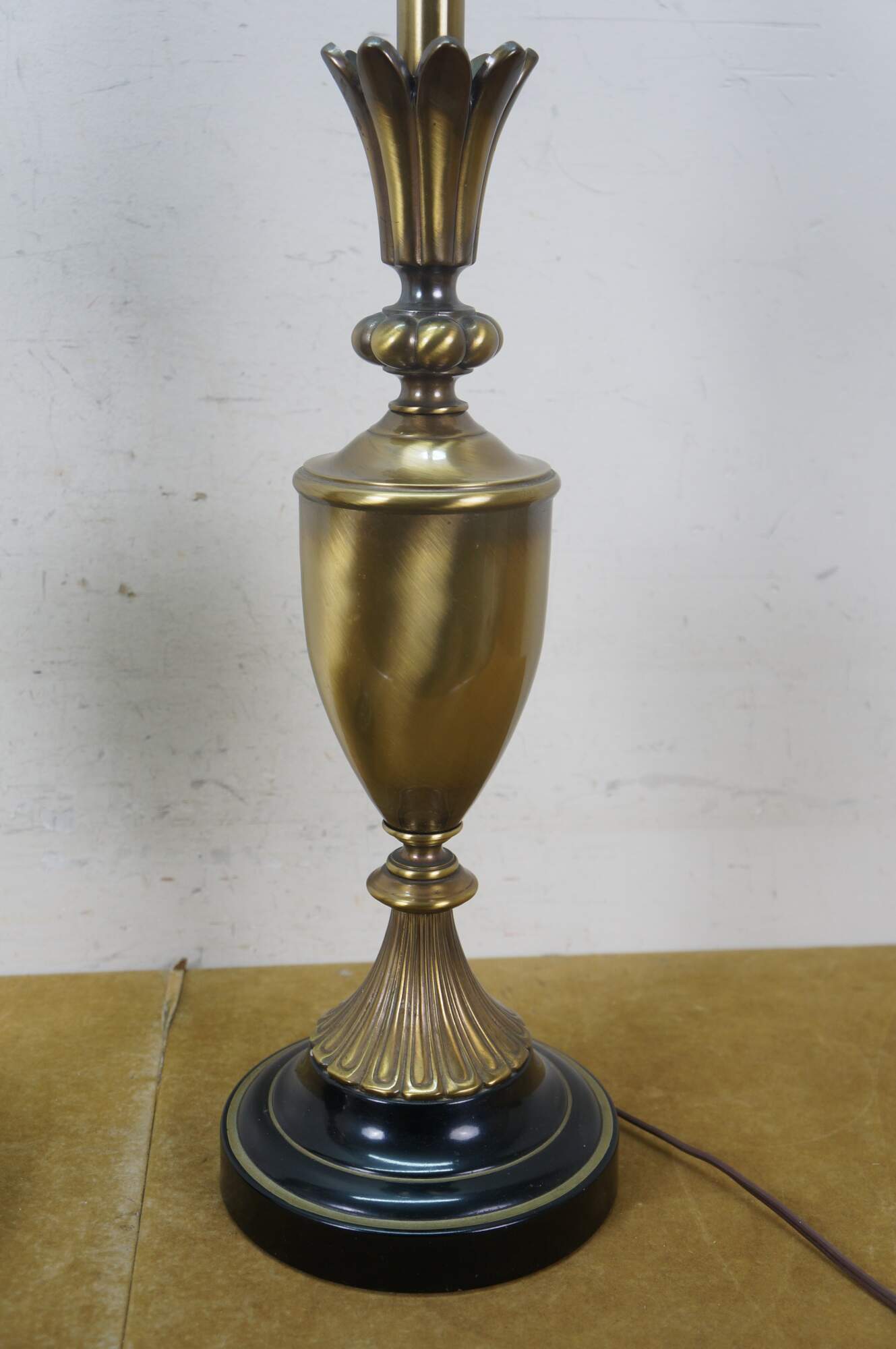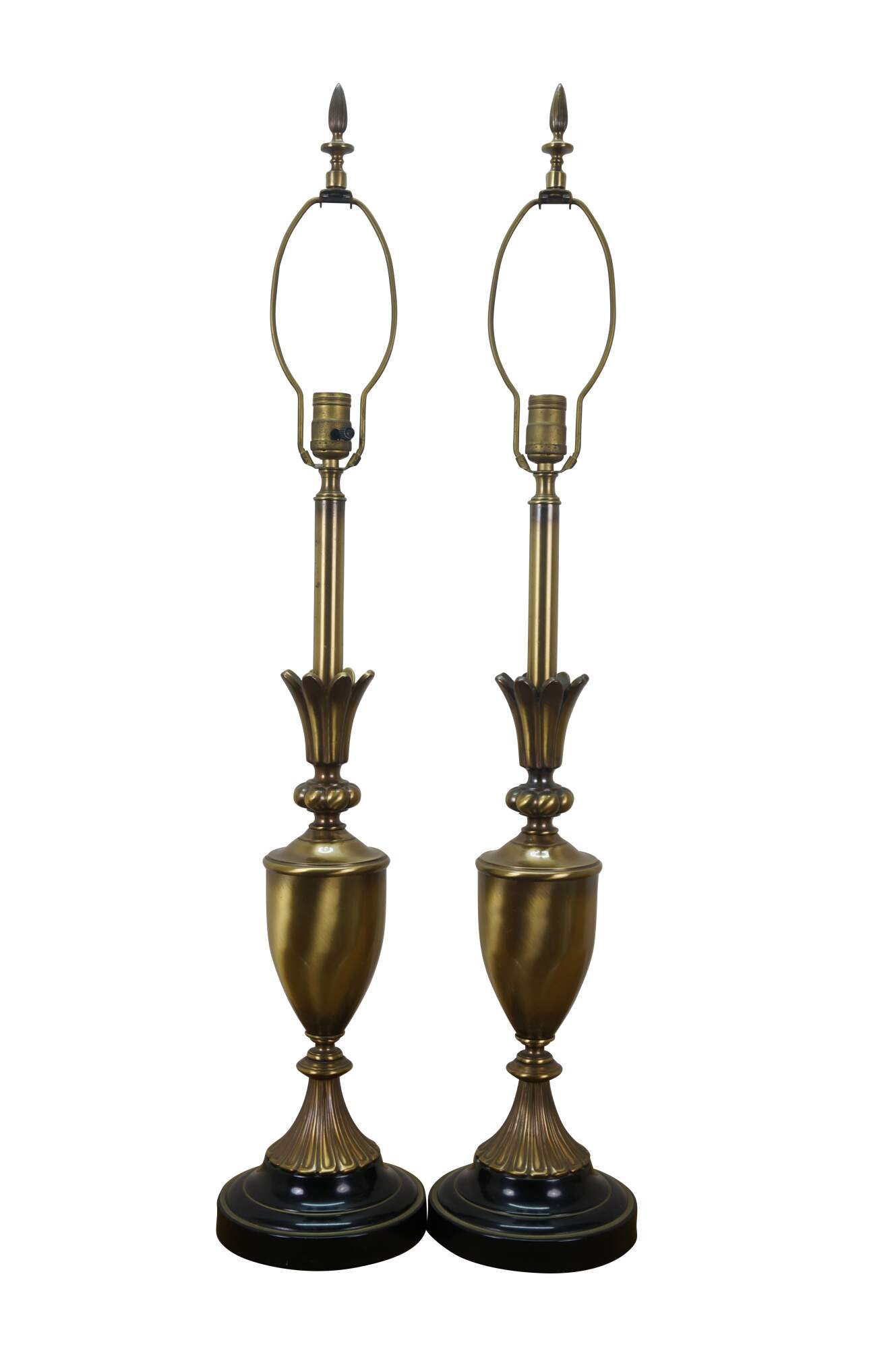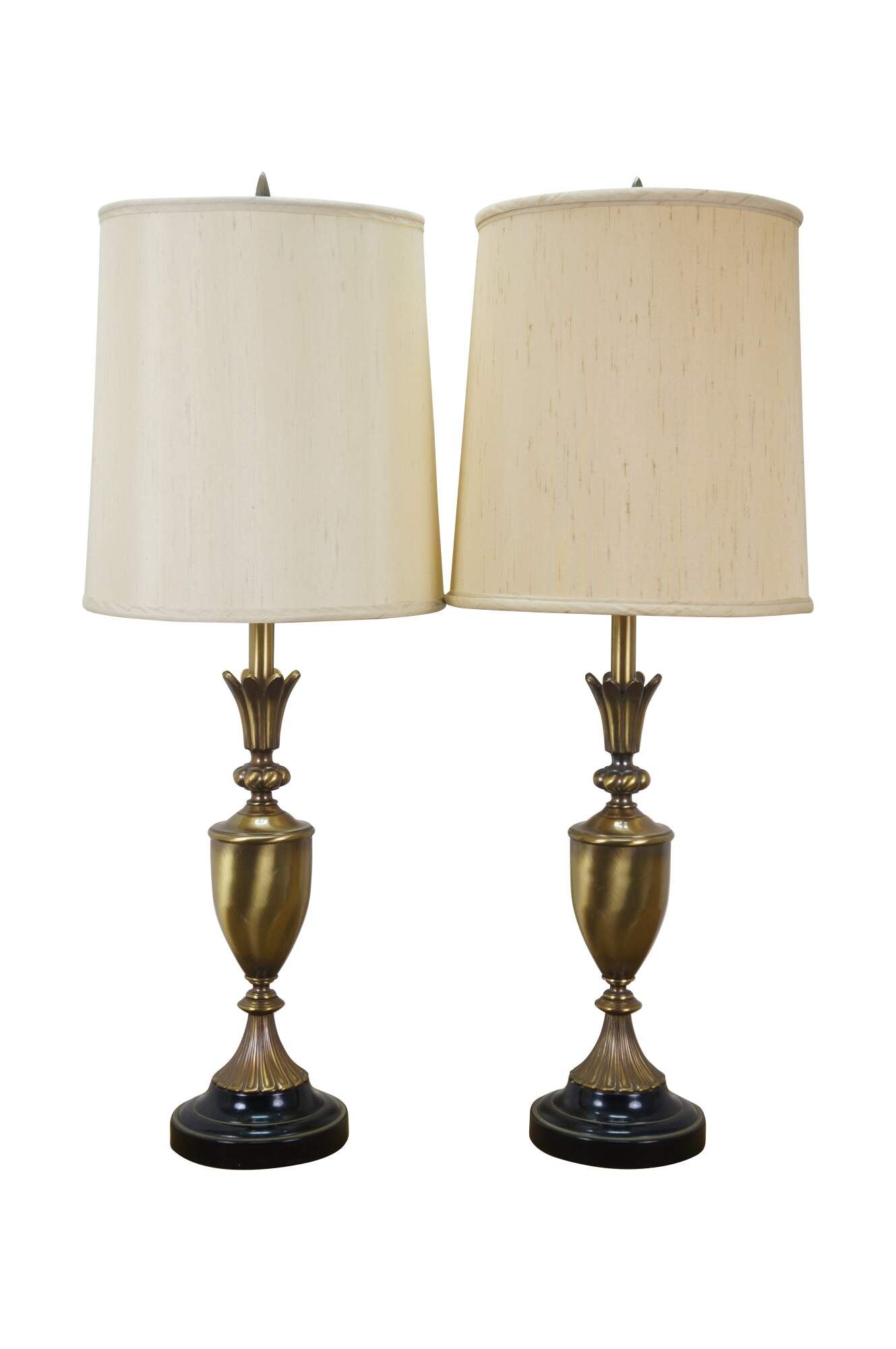 Mid 20th century brass table lamps - Neoclassical / Hollywood Regency style trophy urn shape with sweeping fluted base and petal shaped top, on a black enameled round base. Fixed harps, brass finials. Includes speckled fabric shades.