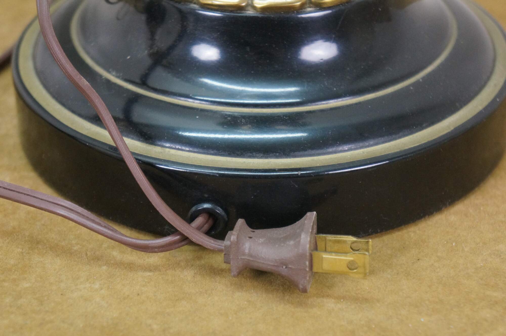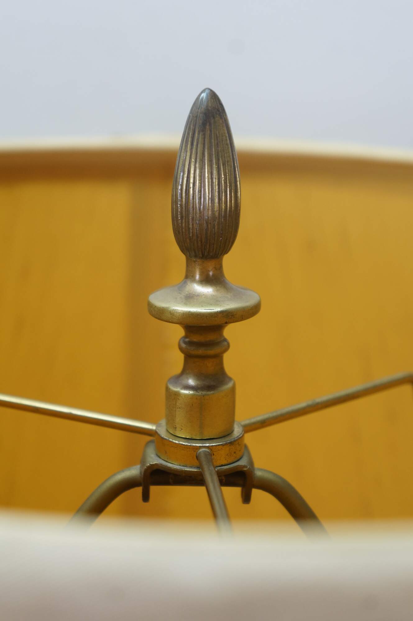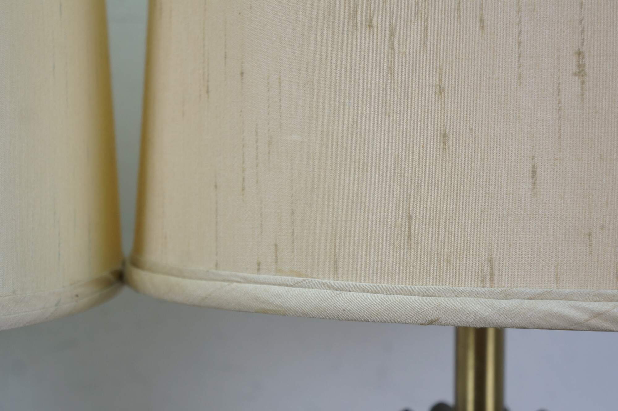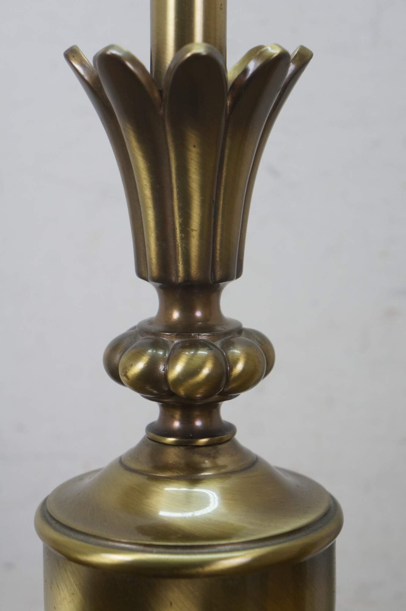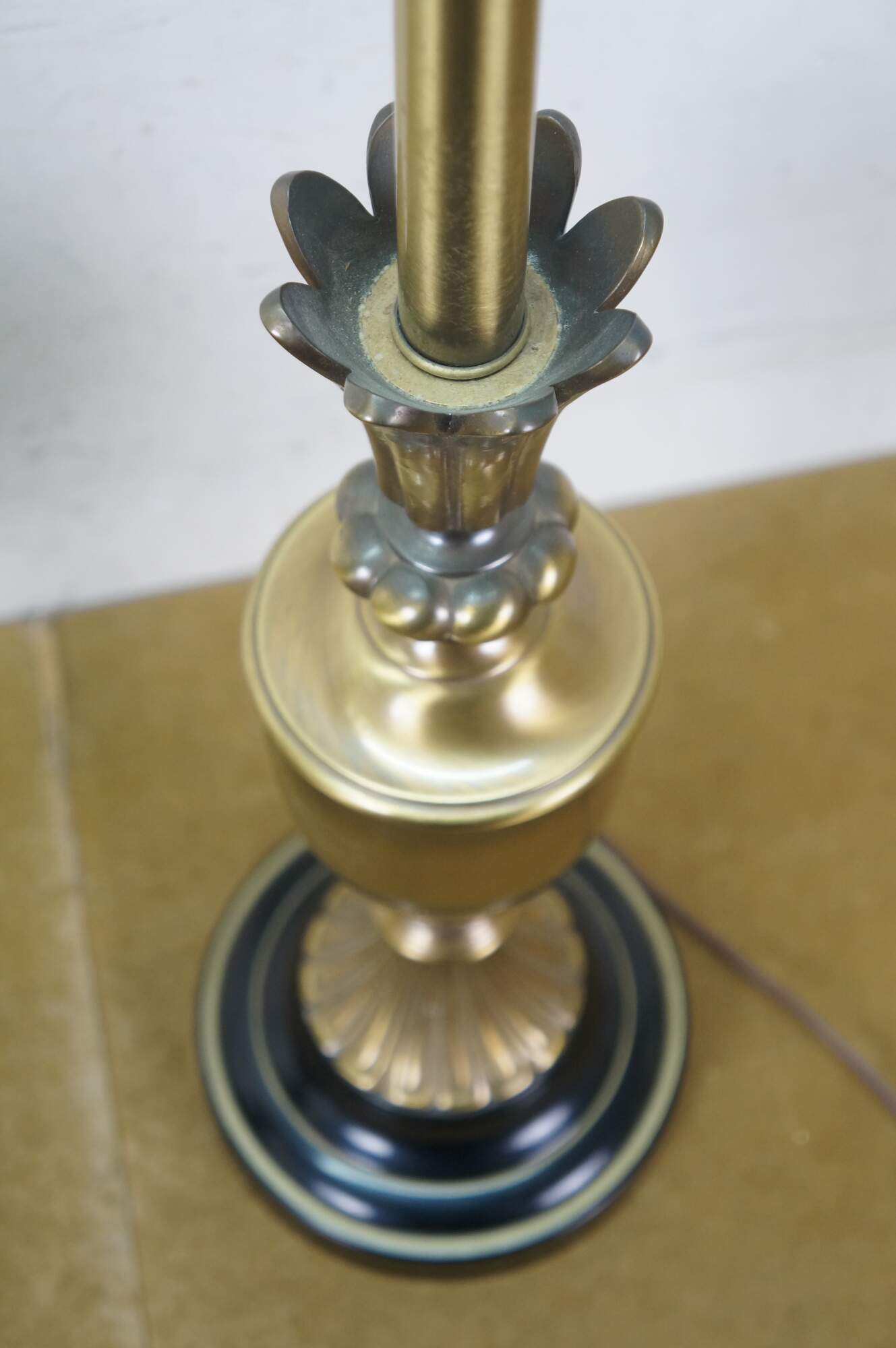 Mid 20th century brass table lamps - Neoclassical / Hollywood Regency style trophy urn shape with sweeping fluted base and petal shaped top, on a black enameled round base. Fixed harps, brass finials. Includes speckled fabric shades.