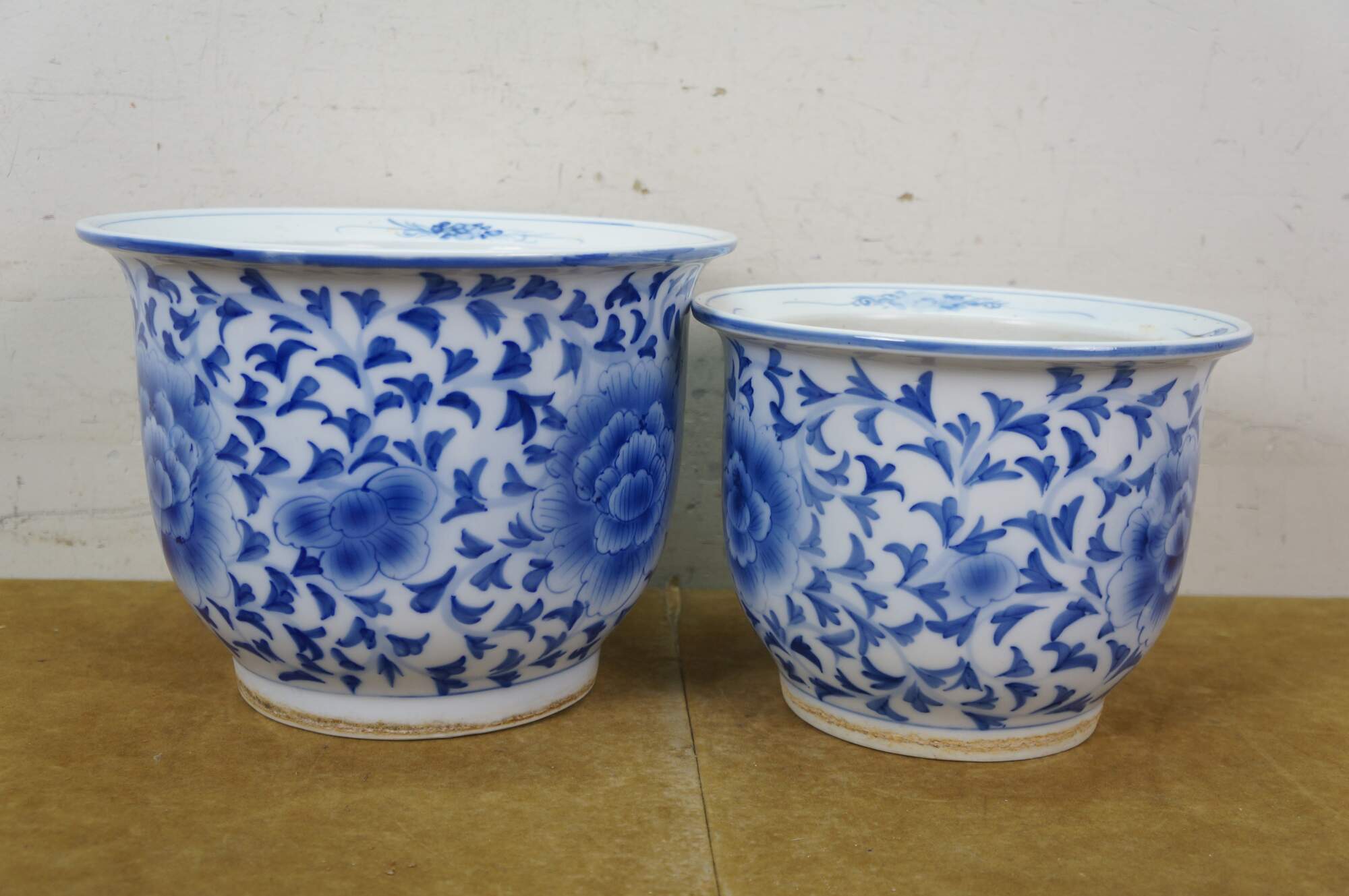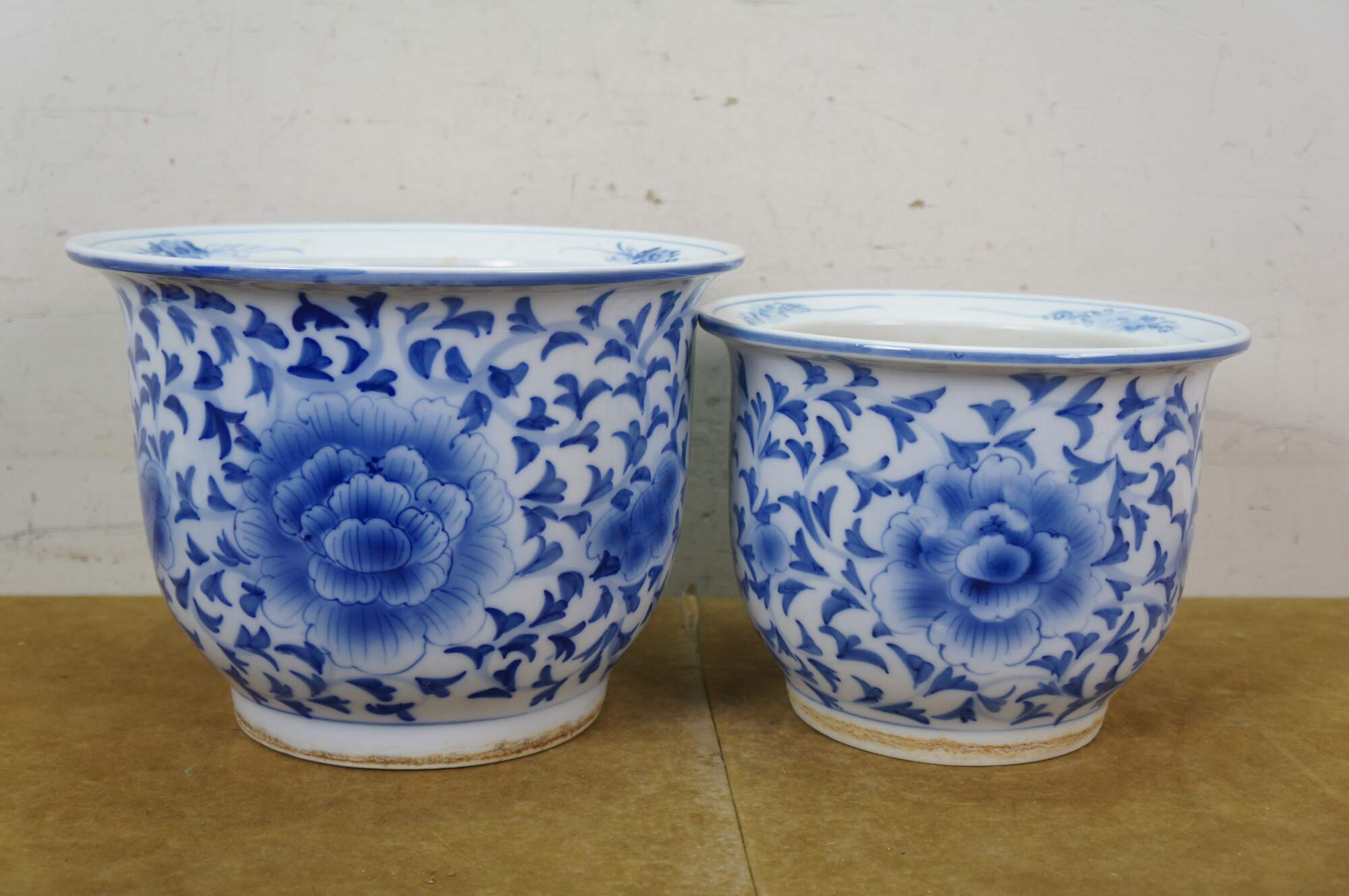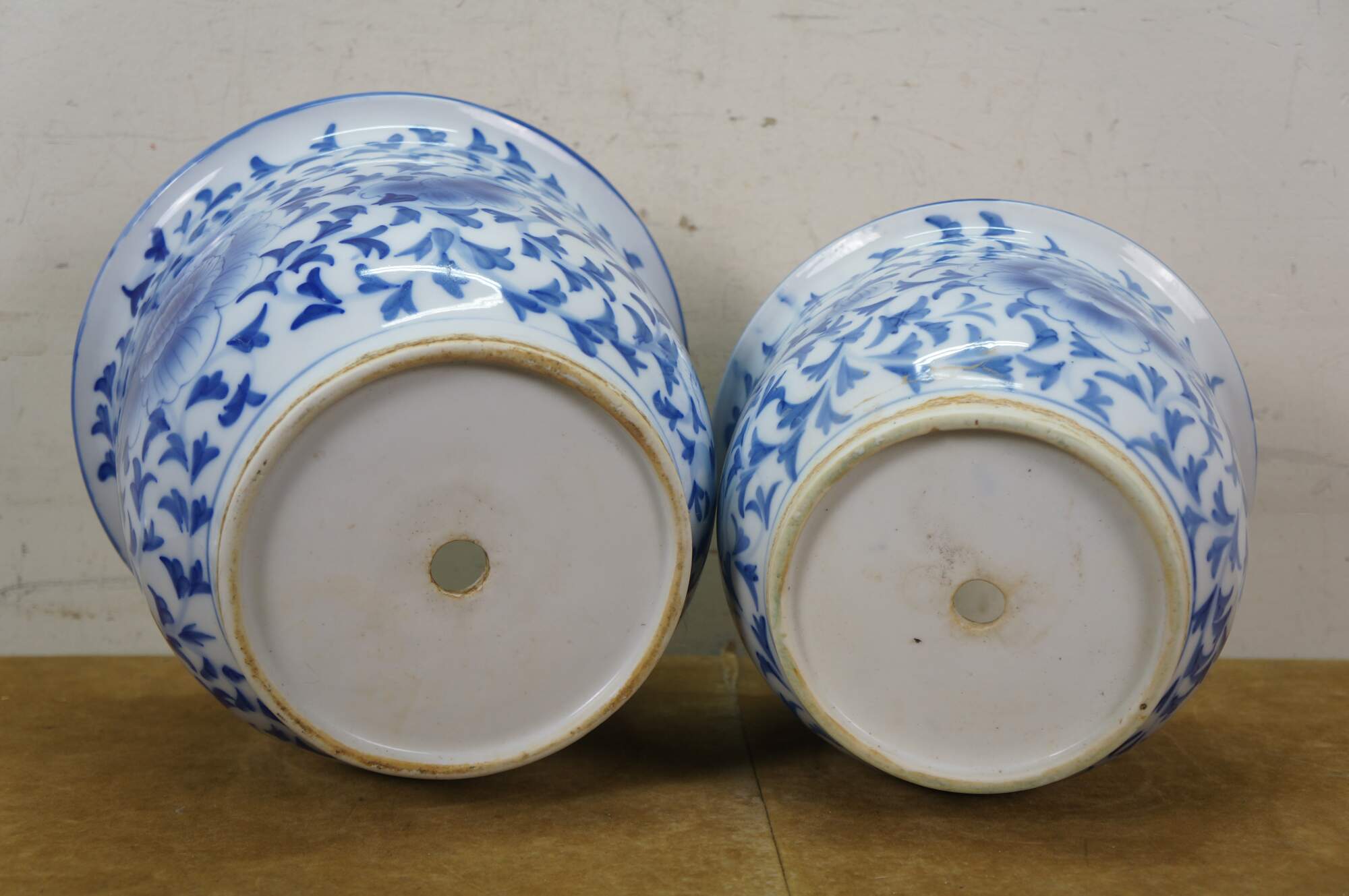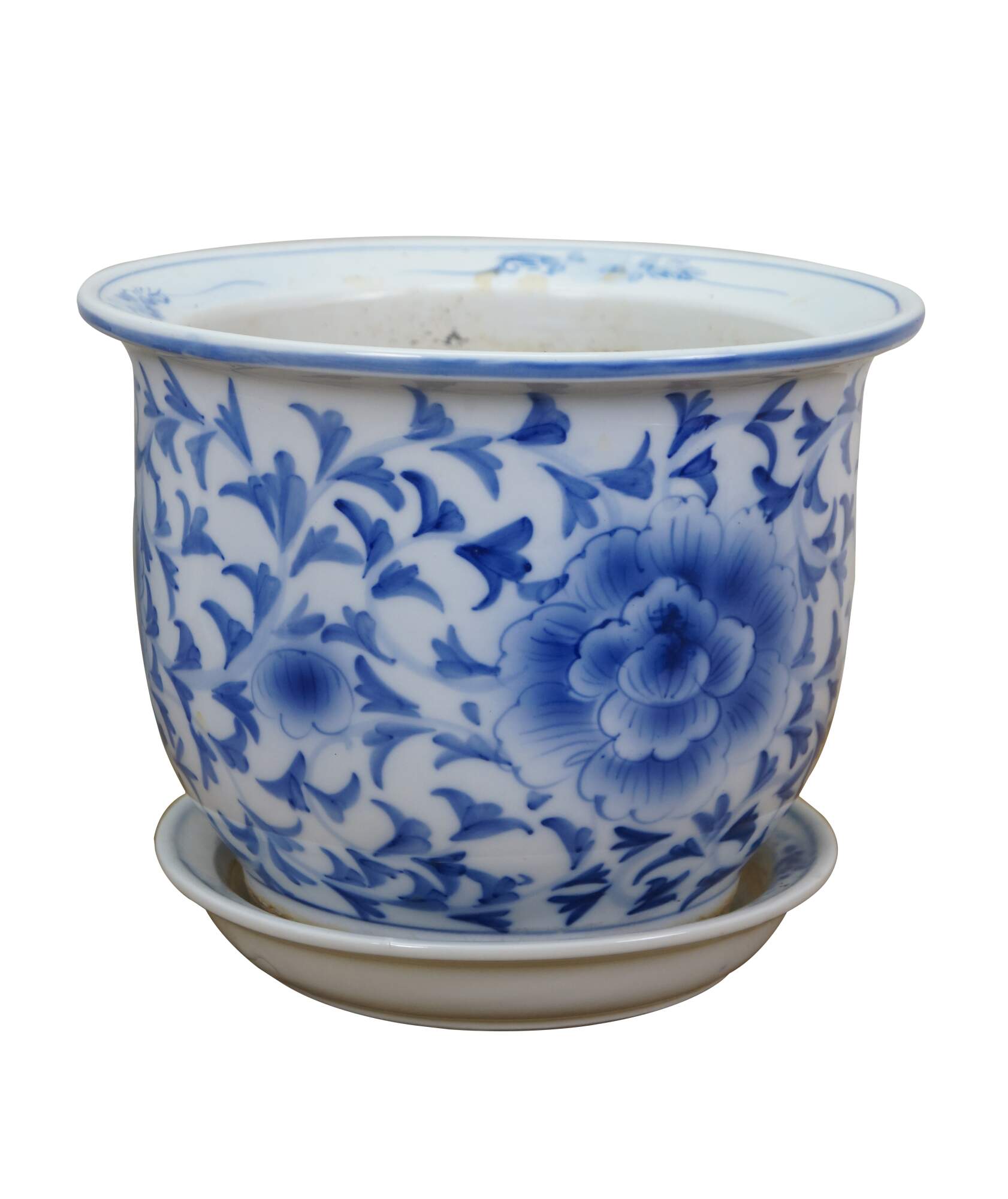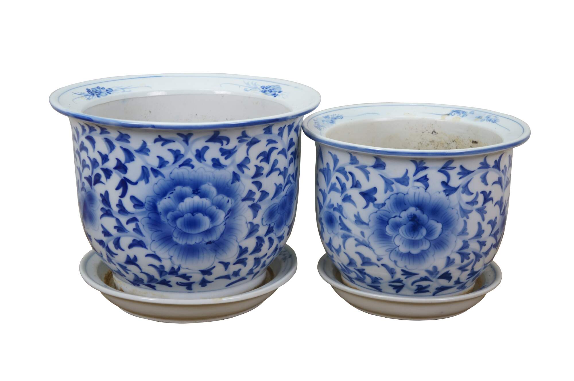 Pair of mid to early 20th century blue and white porcelain planters / jardinieres. Round form with flared rim, drain holes, and matching underplates. Decorated by hand with swirling stems of leaves and large lotus blossoms.