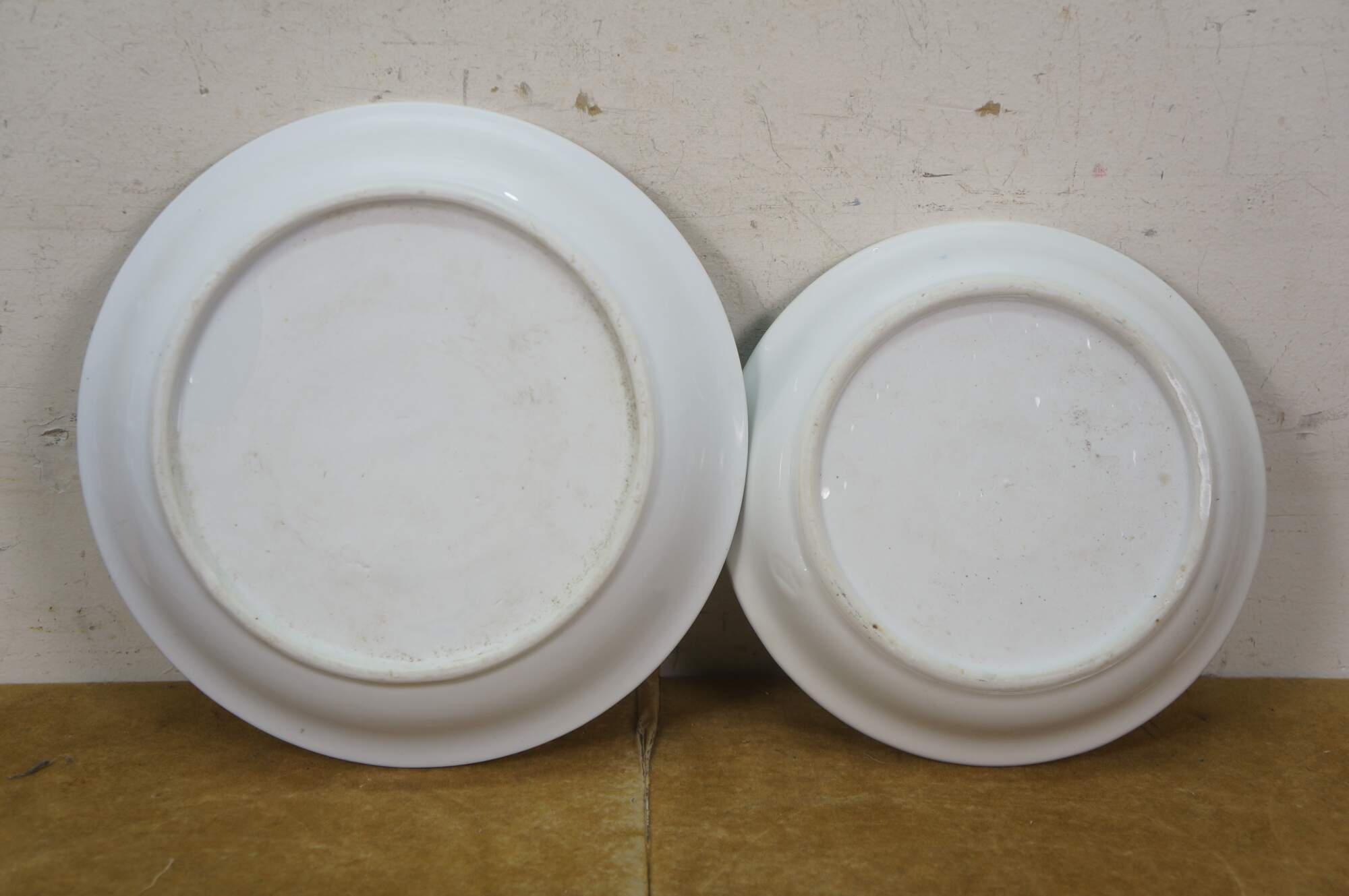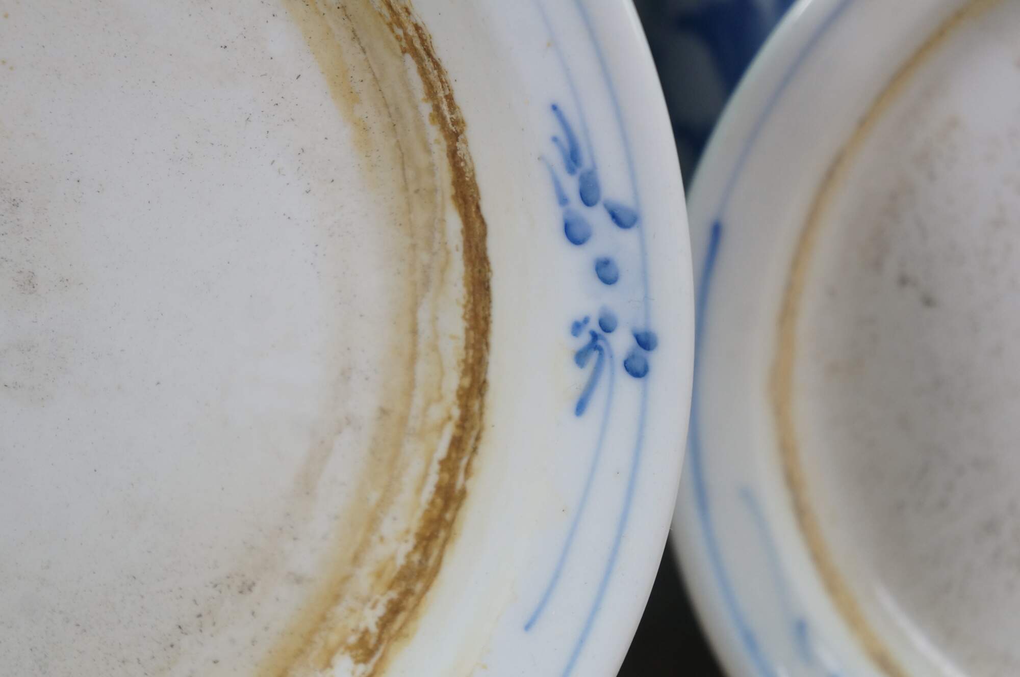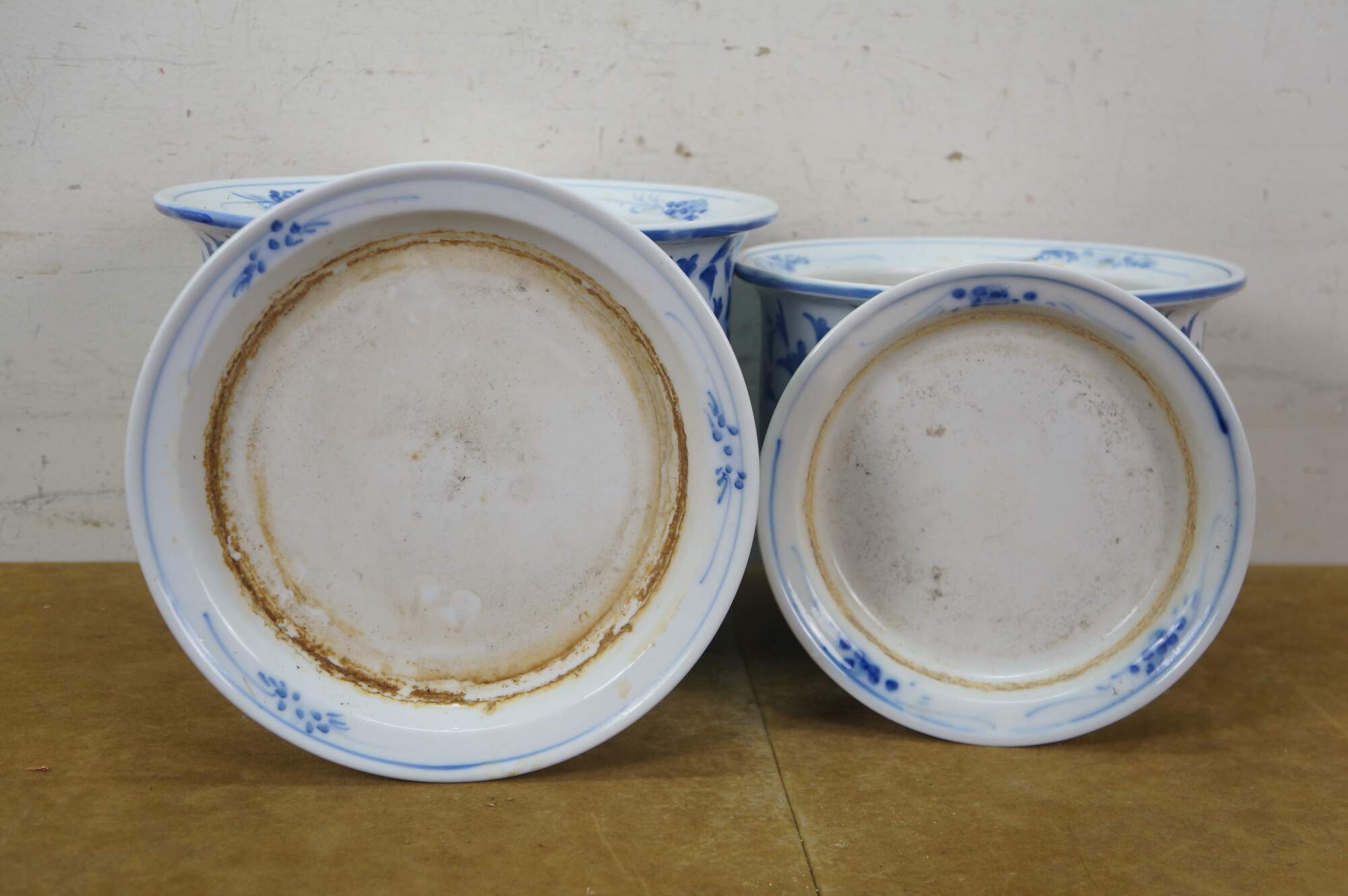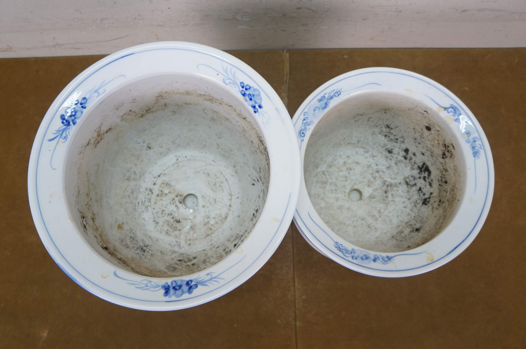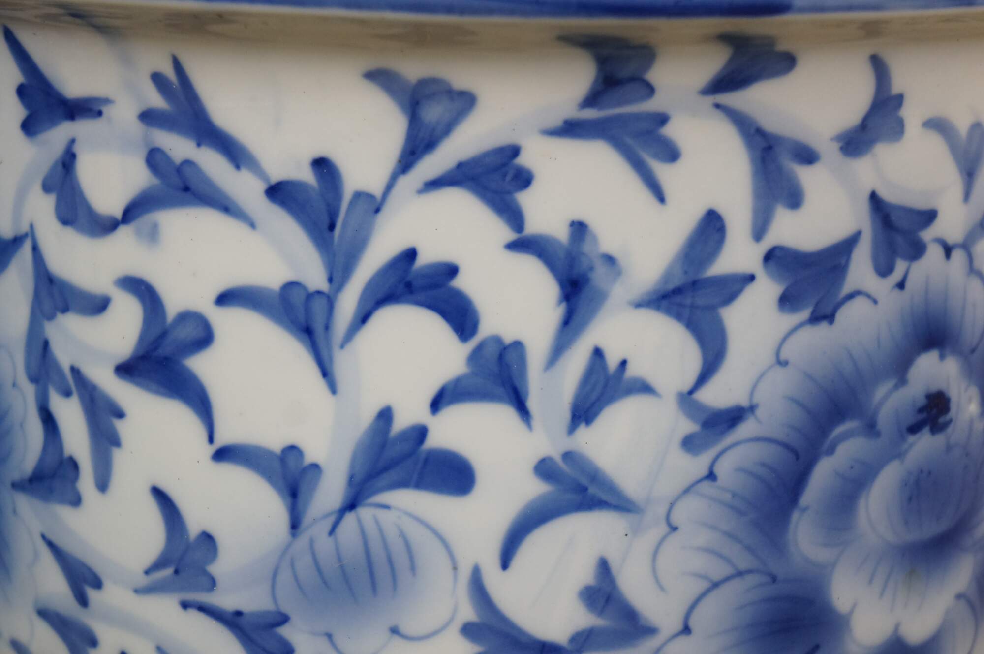 Pair of mid to early 20th century blue and white porcelain planters / jardinieres. Round form with flared rim, drain holes, and matching underplates. Decorated by hand with swirling stems of leaves and large lotus blossoms.