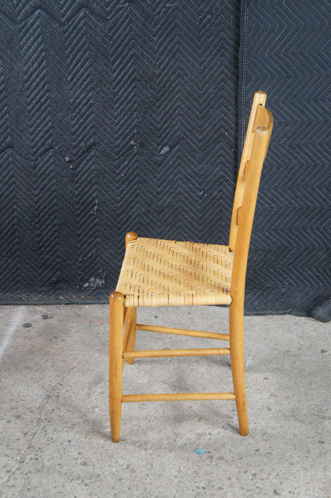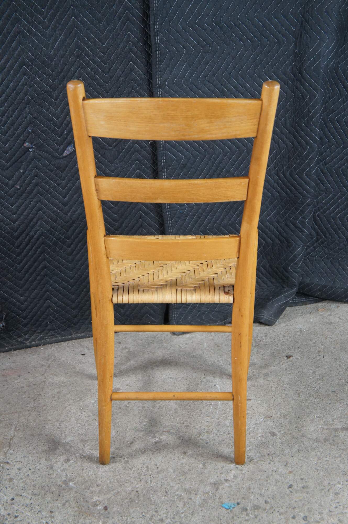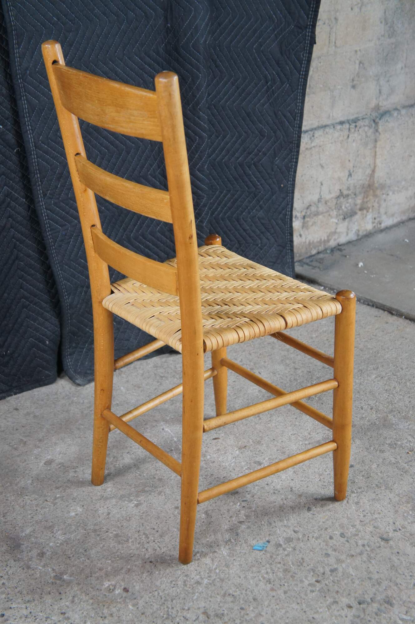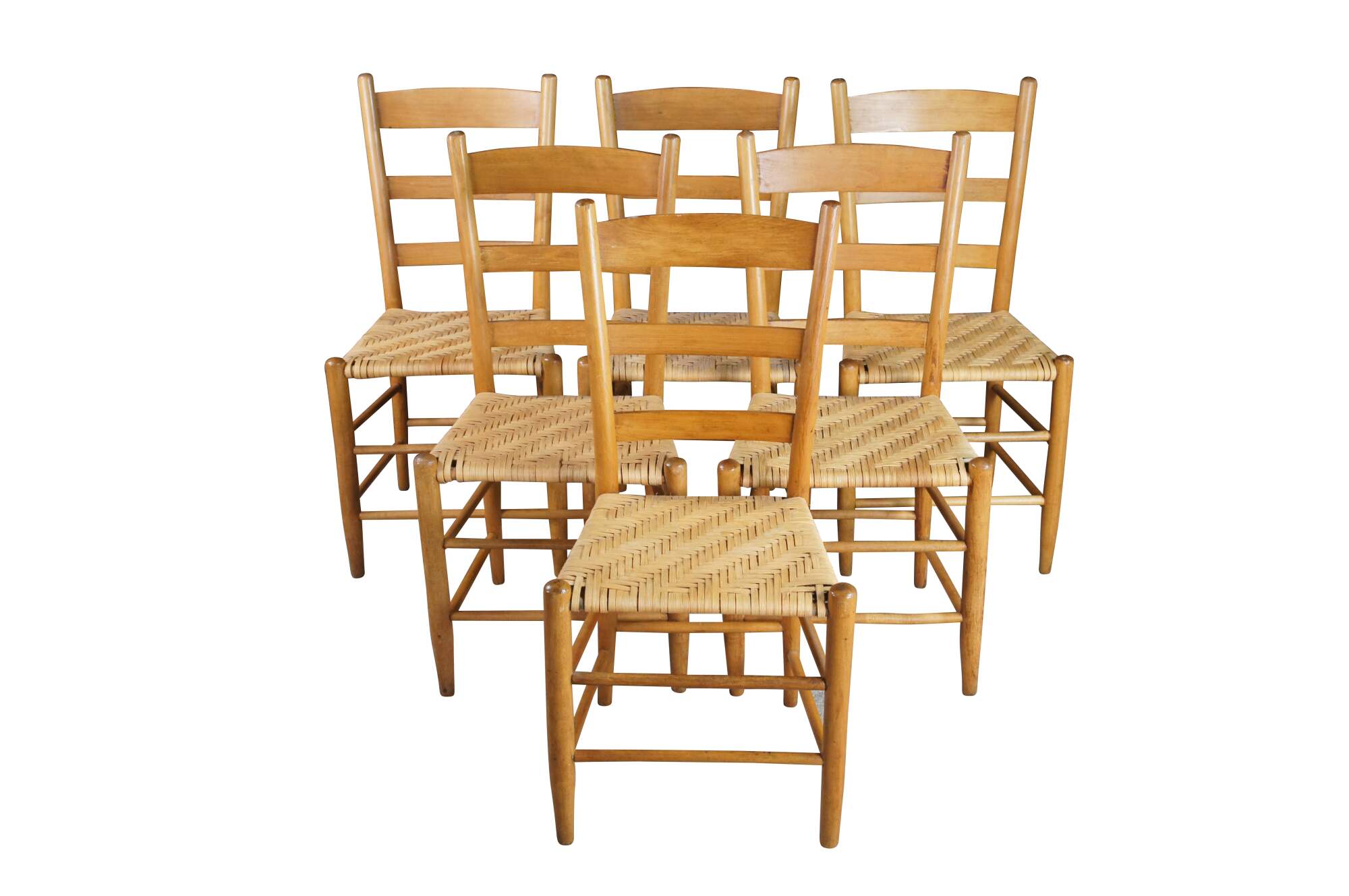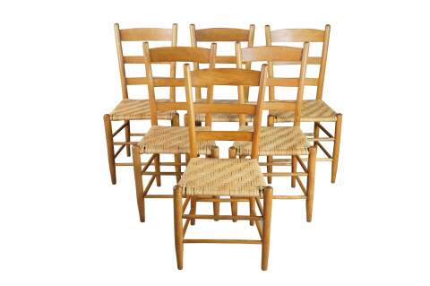Set of 6 antique Shaker style country farmhouse dining chairs. Made of Maple featuring a woven rattan seat and ladder back design.
