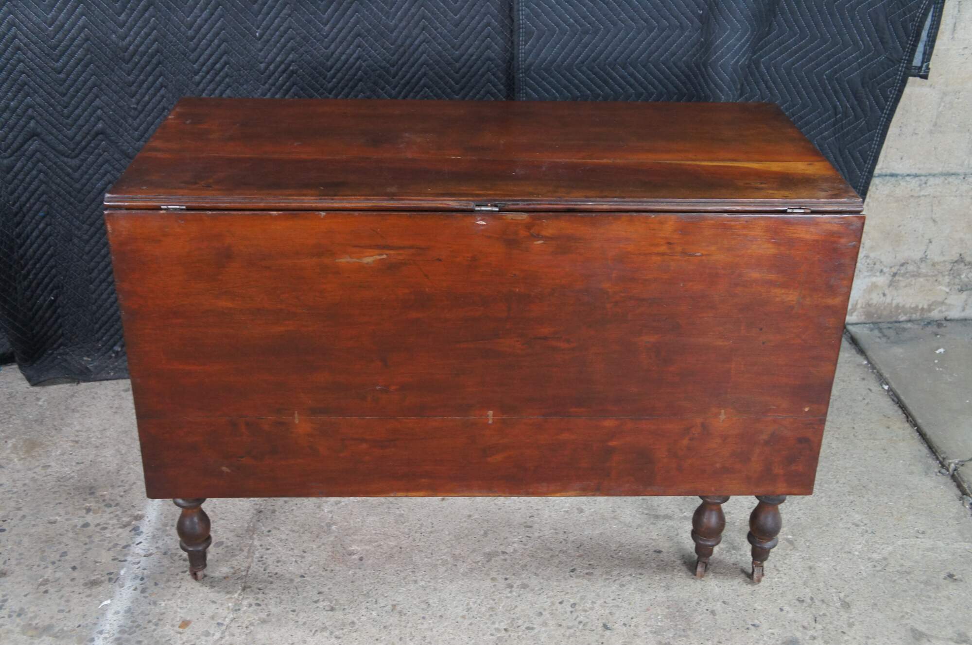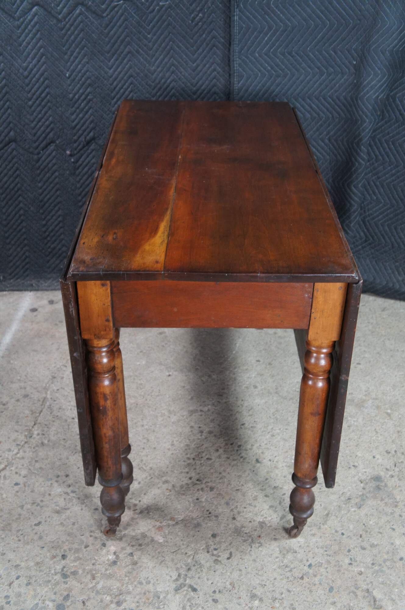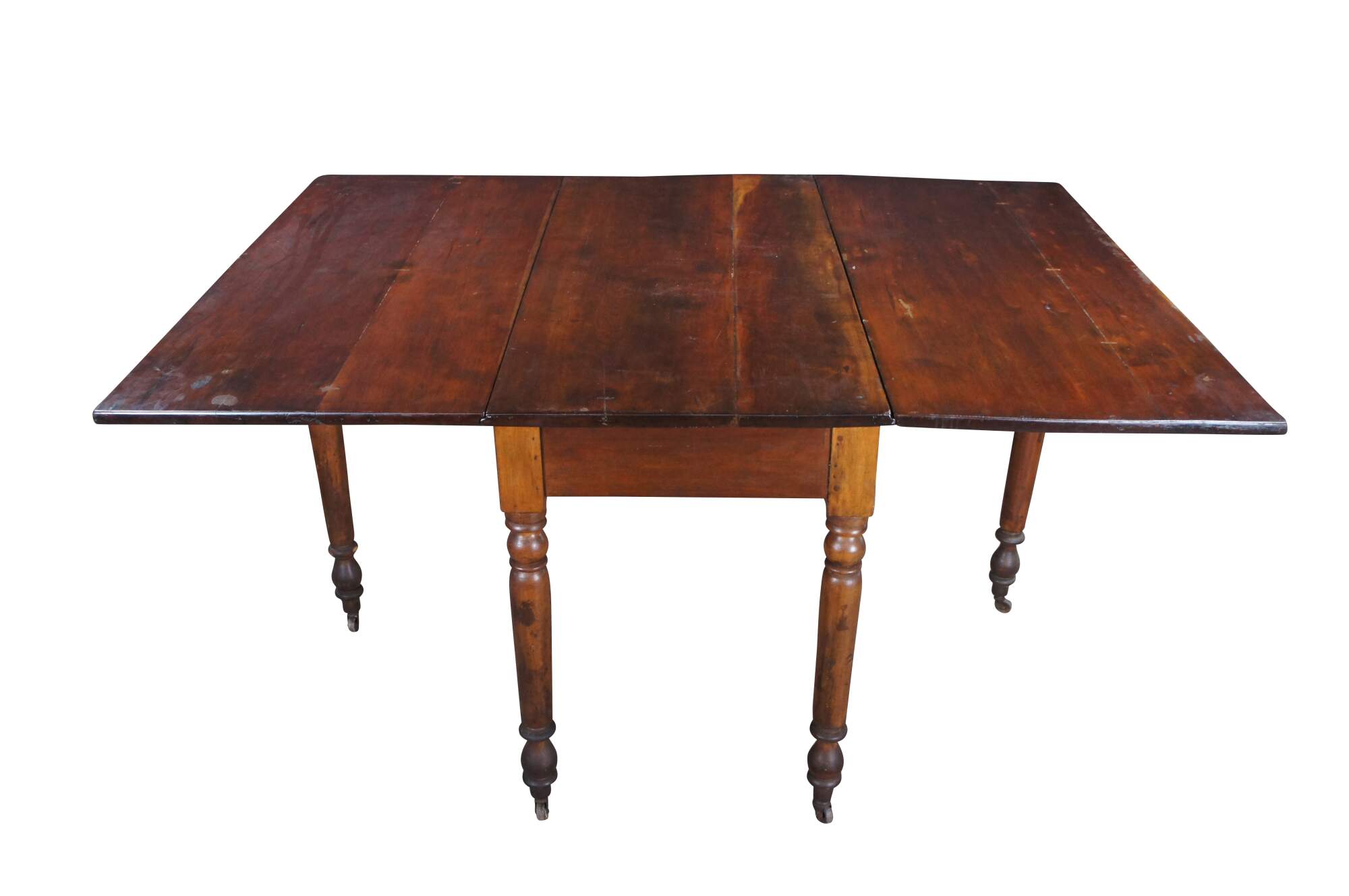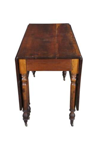 Antique American drop leaf gateleg dining table. Features rectangular form with long drop leaves made from solid cherry. The table is supported by turned legs with casters Great for use as breakfast or work table, or against a wall as an entry console.