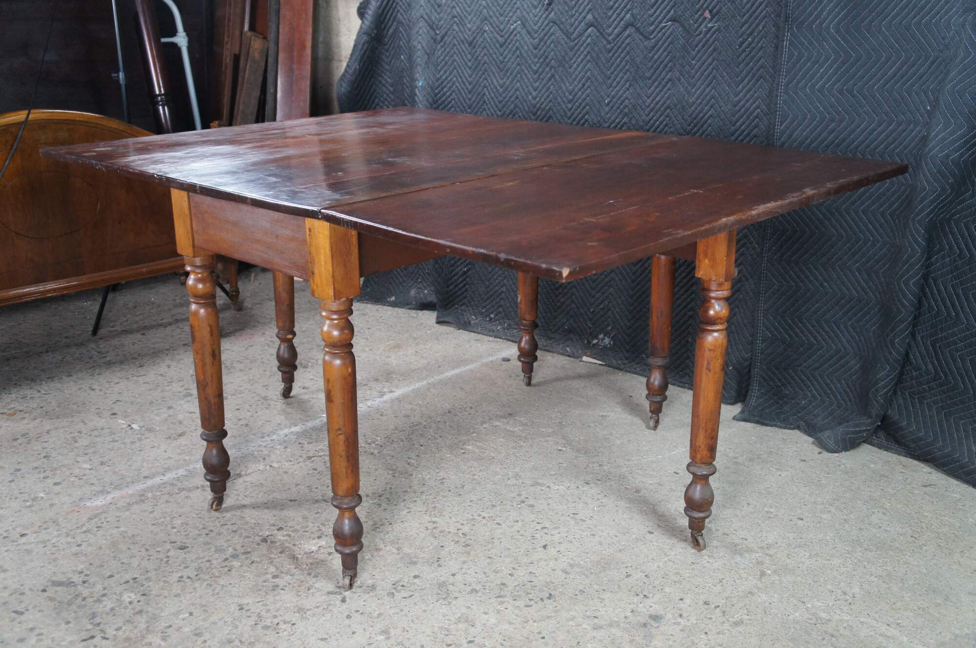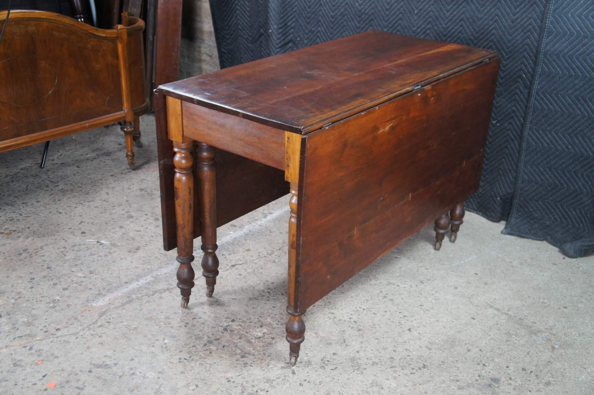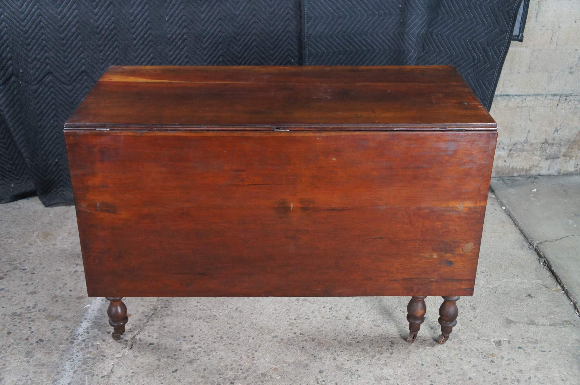 Antique American drop leaf gateleg dining table. Features rectangular form with long drop leaves made from solid cherry. The table is supported by turned legs with casters Great for use as breakfast or work table, or against a wall as an entry console.