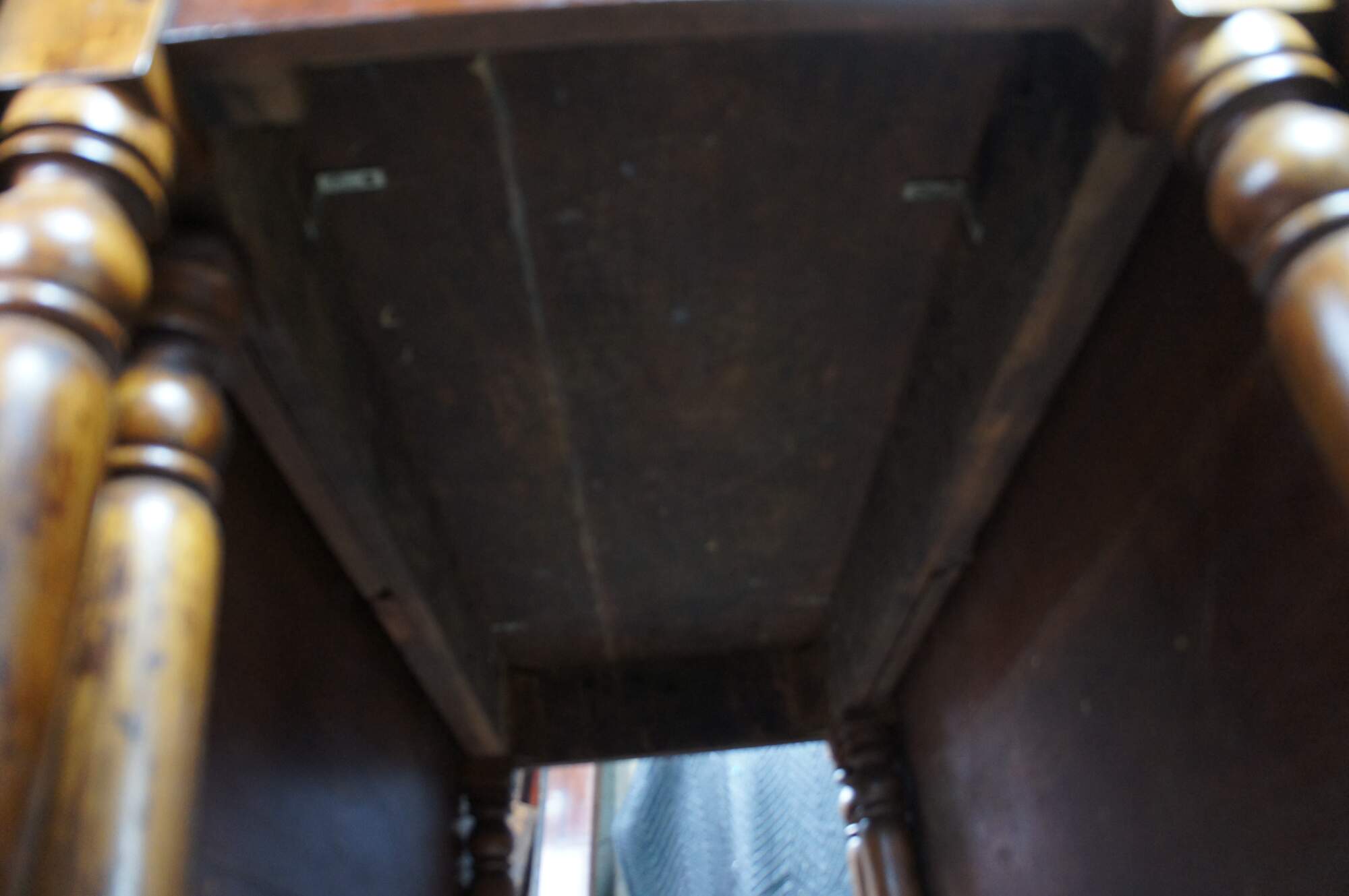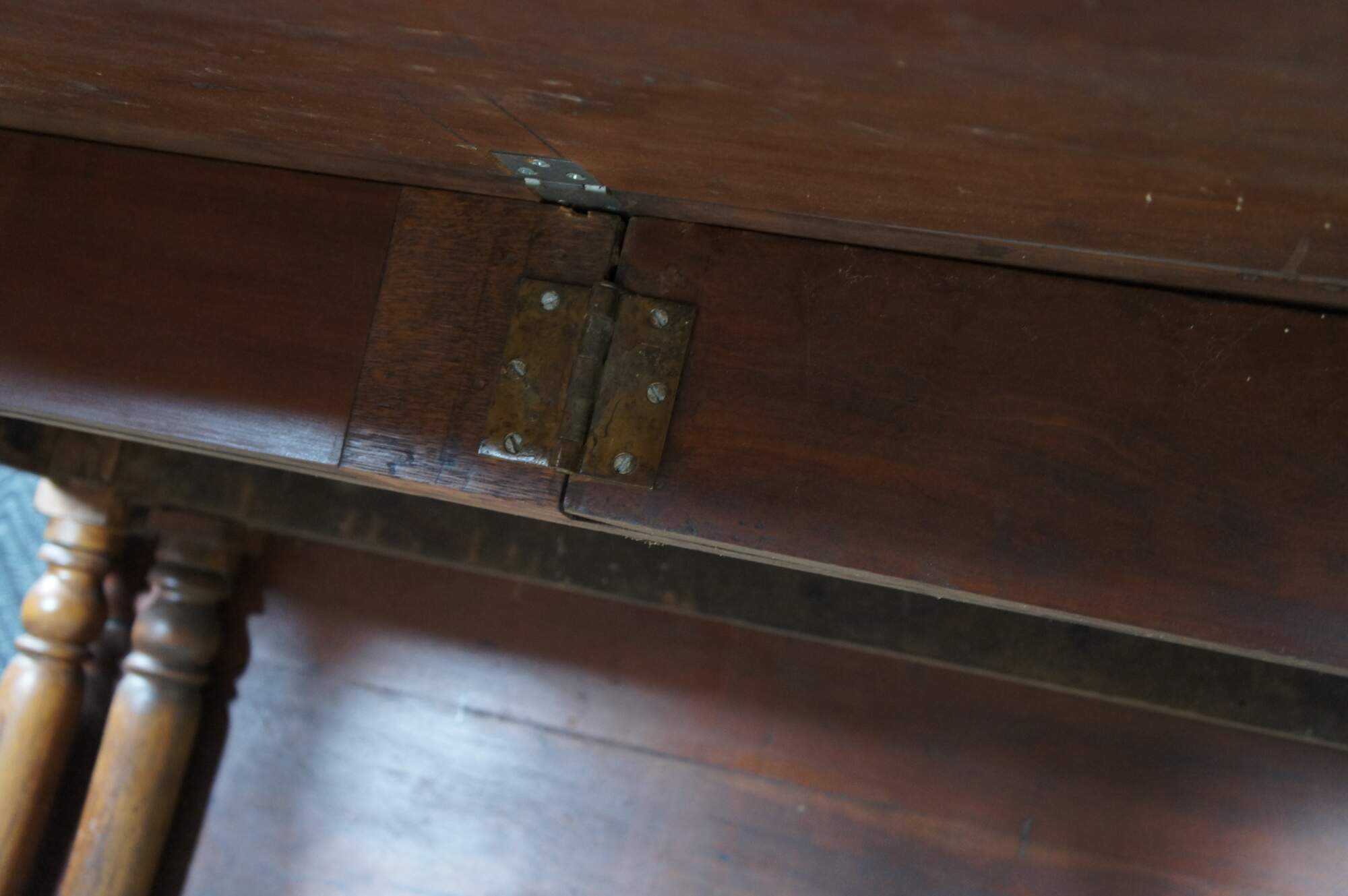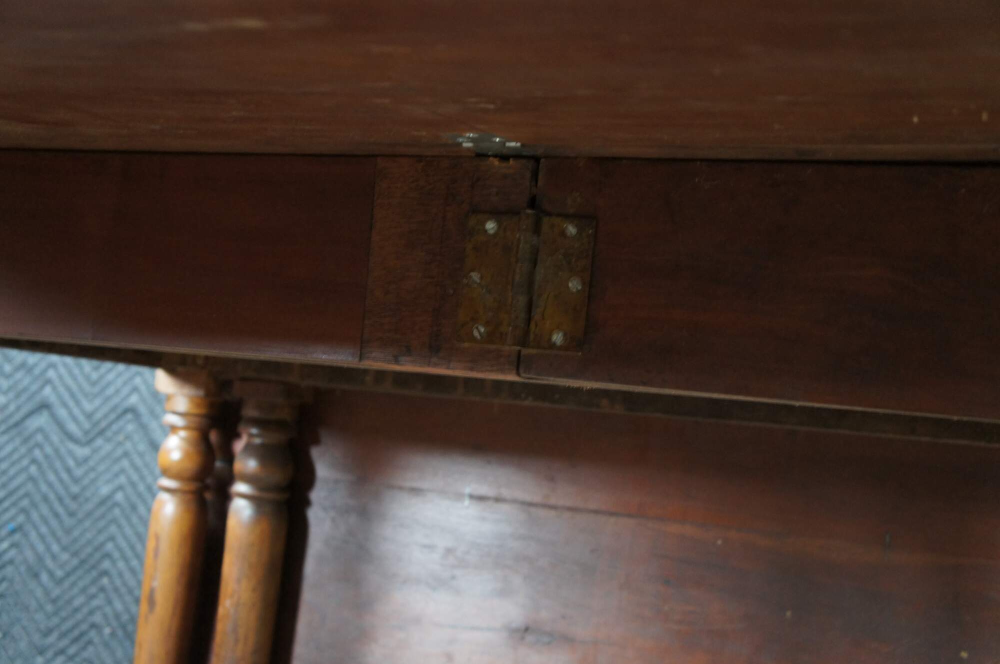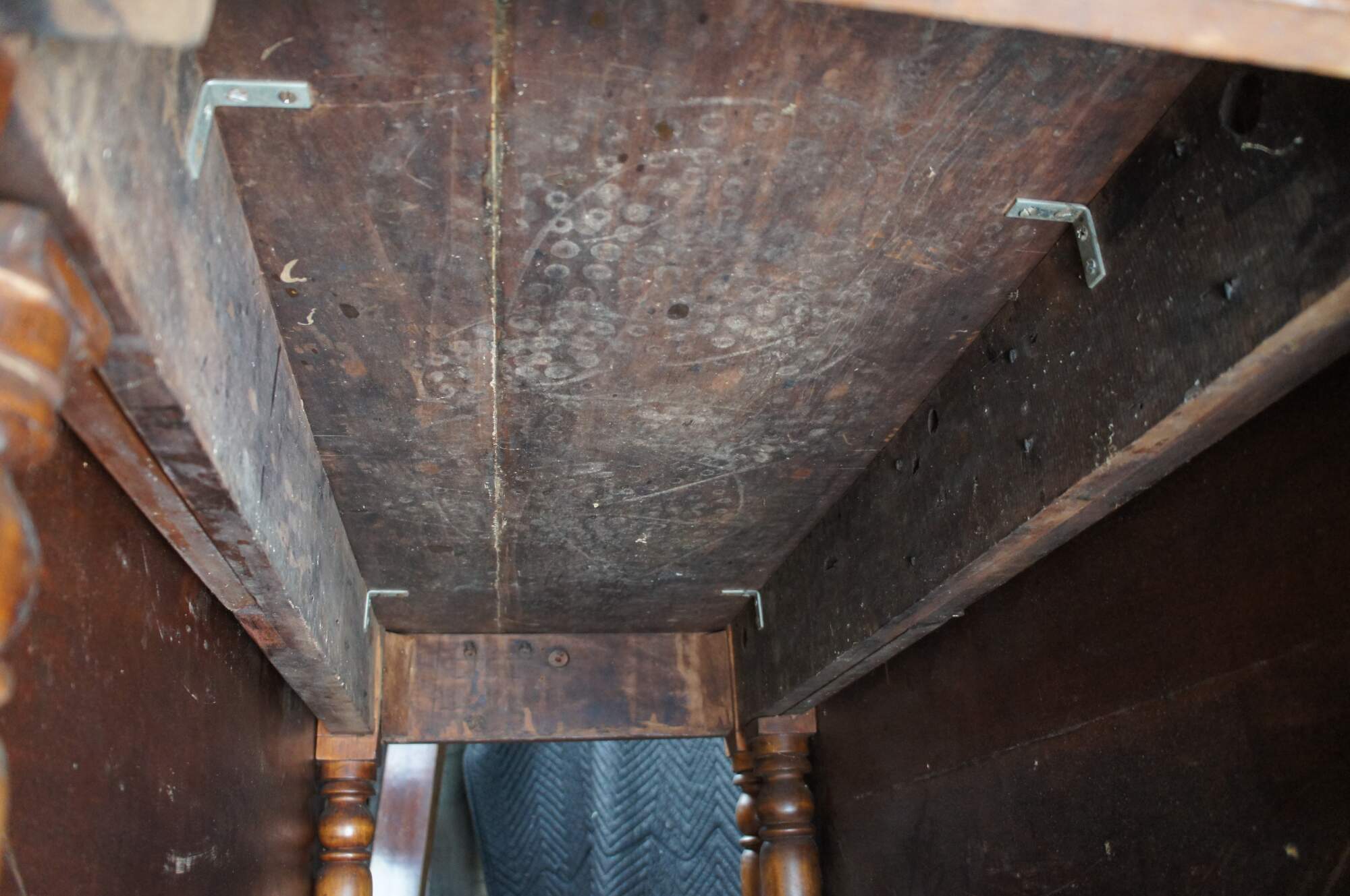 Distressing from age and use, fading, marking, warping, splitting, past fills, edge / corner wear, some updated hardware.