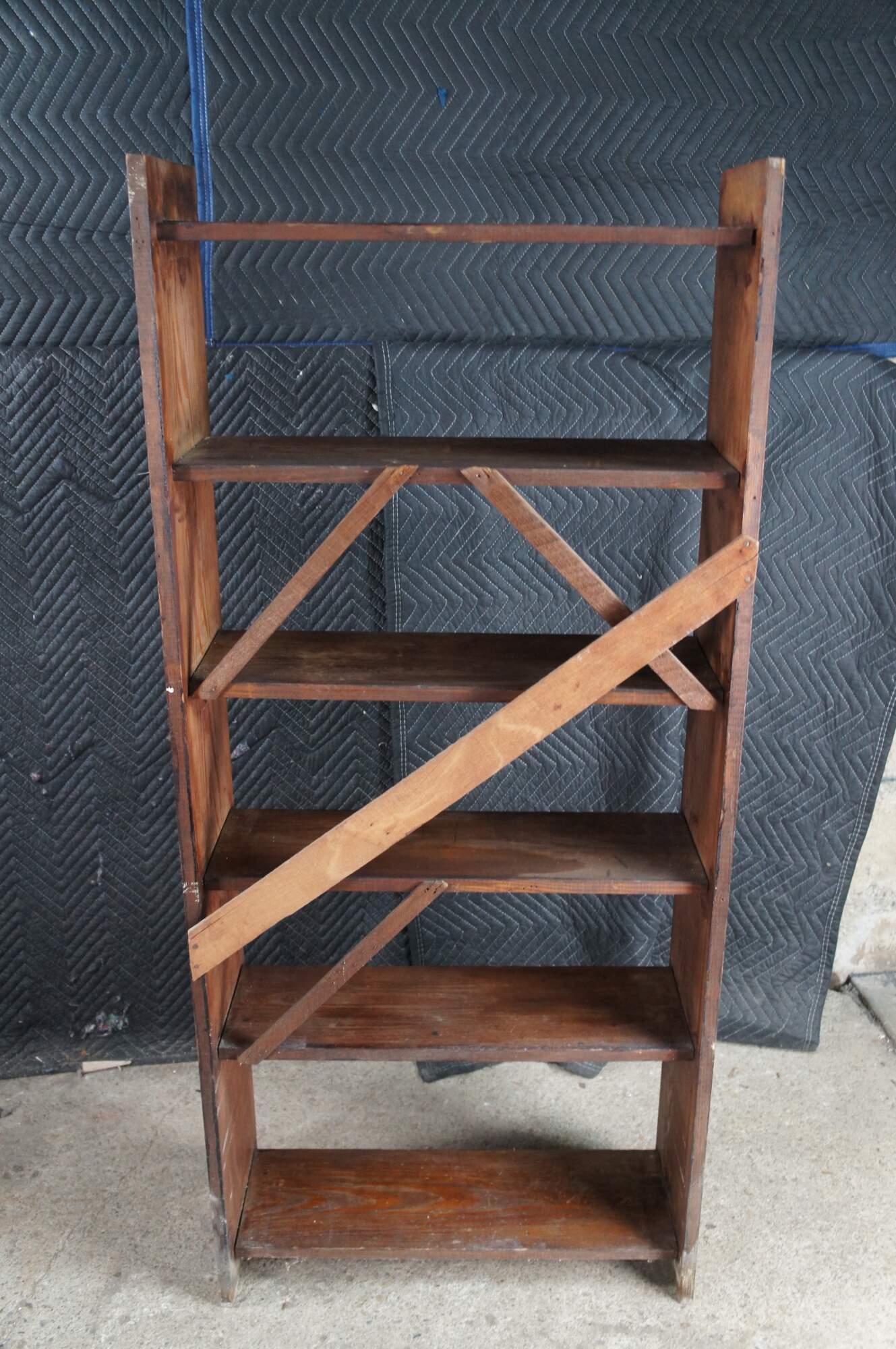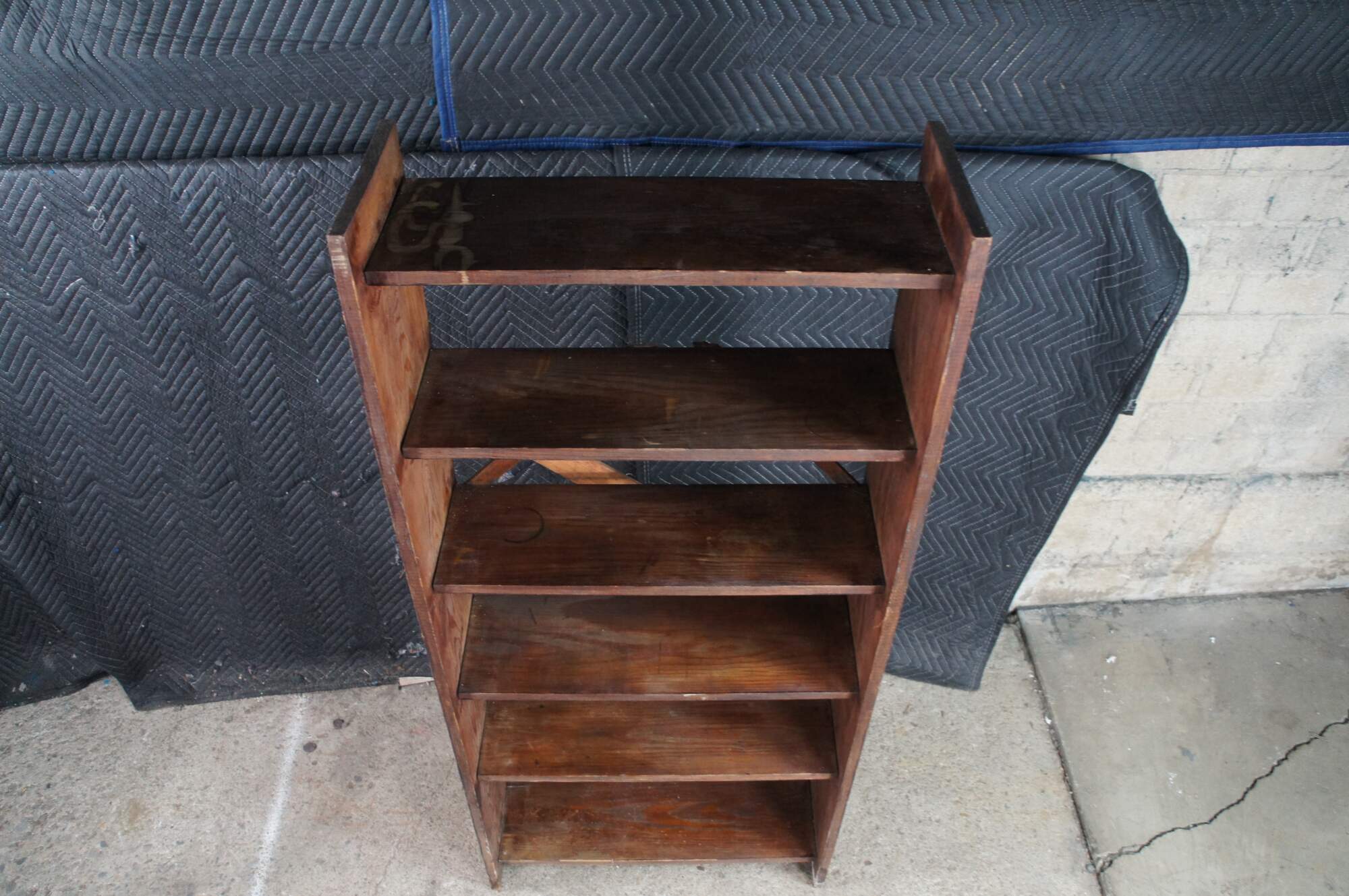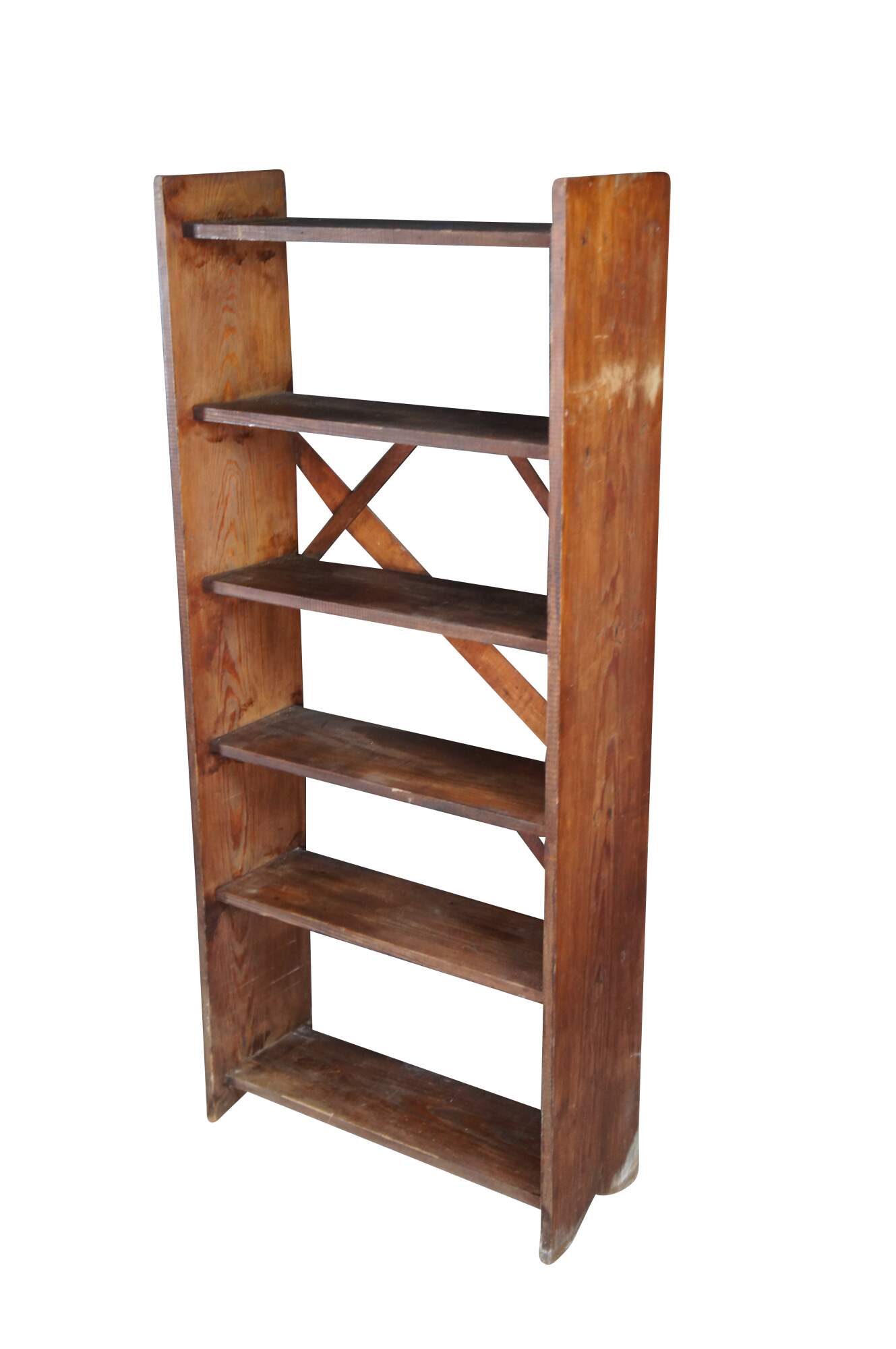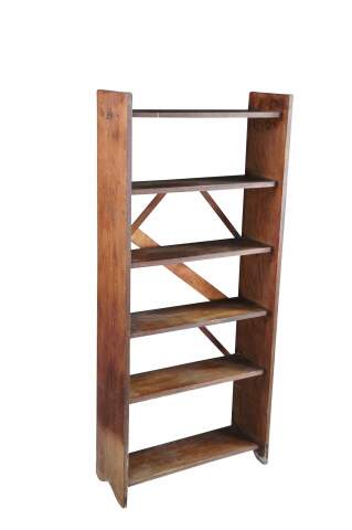 Vintage oak library book shelf featuring primitive styling with six tiers.