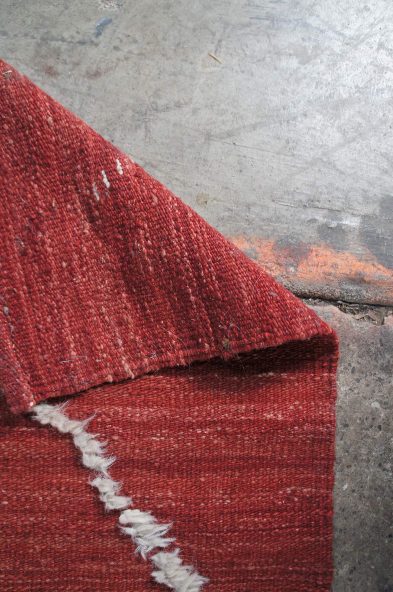 Vintage hand knotted Moroccan style wool kilim area rug with geometric raised fringe pattern that terminates into a checkerboard finish line accent.
