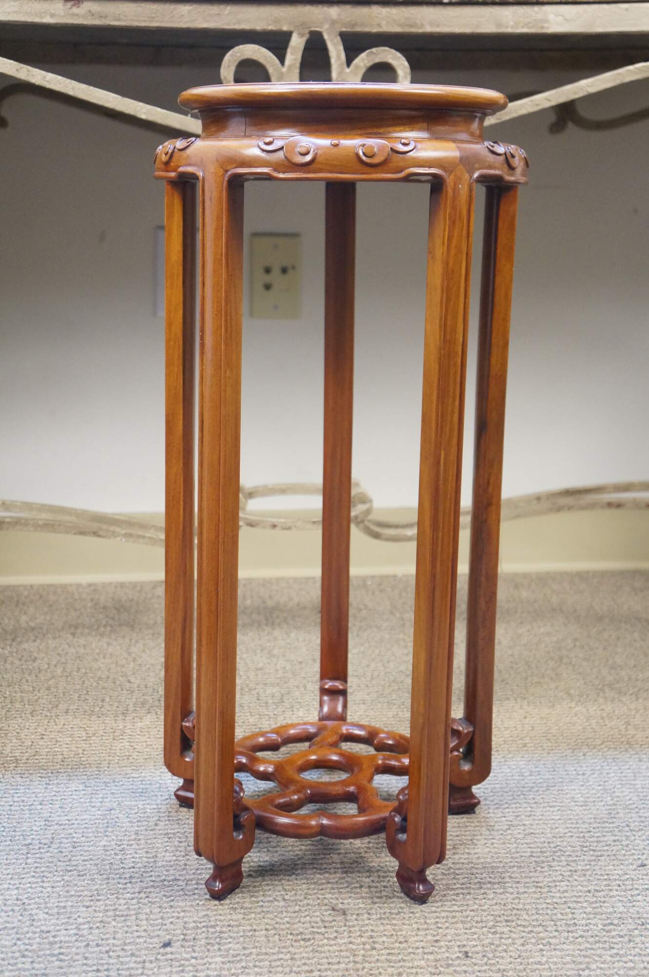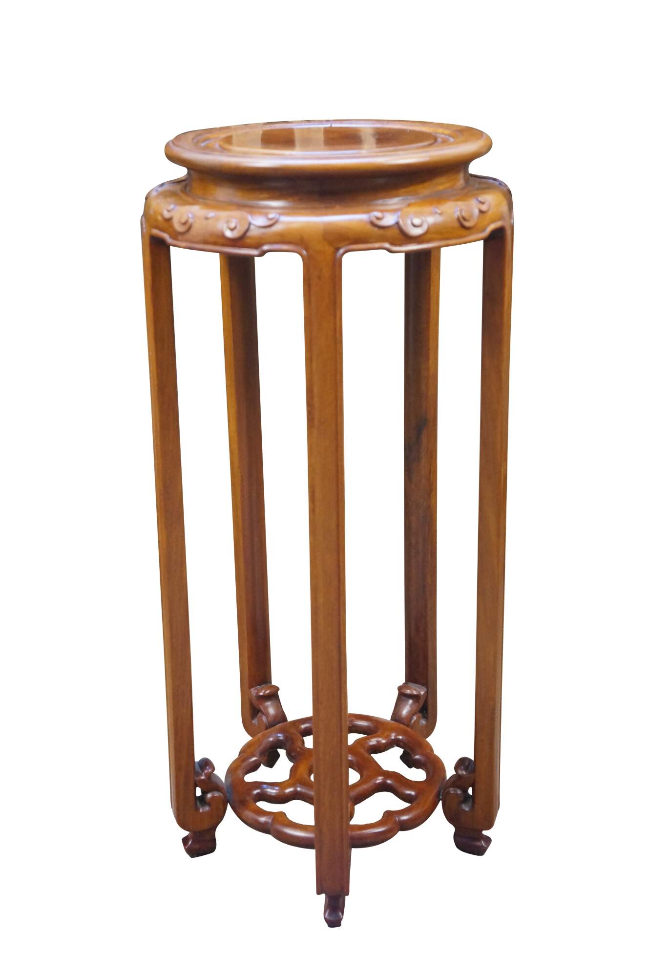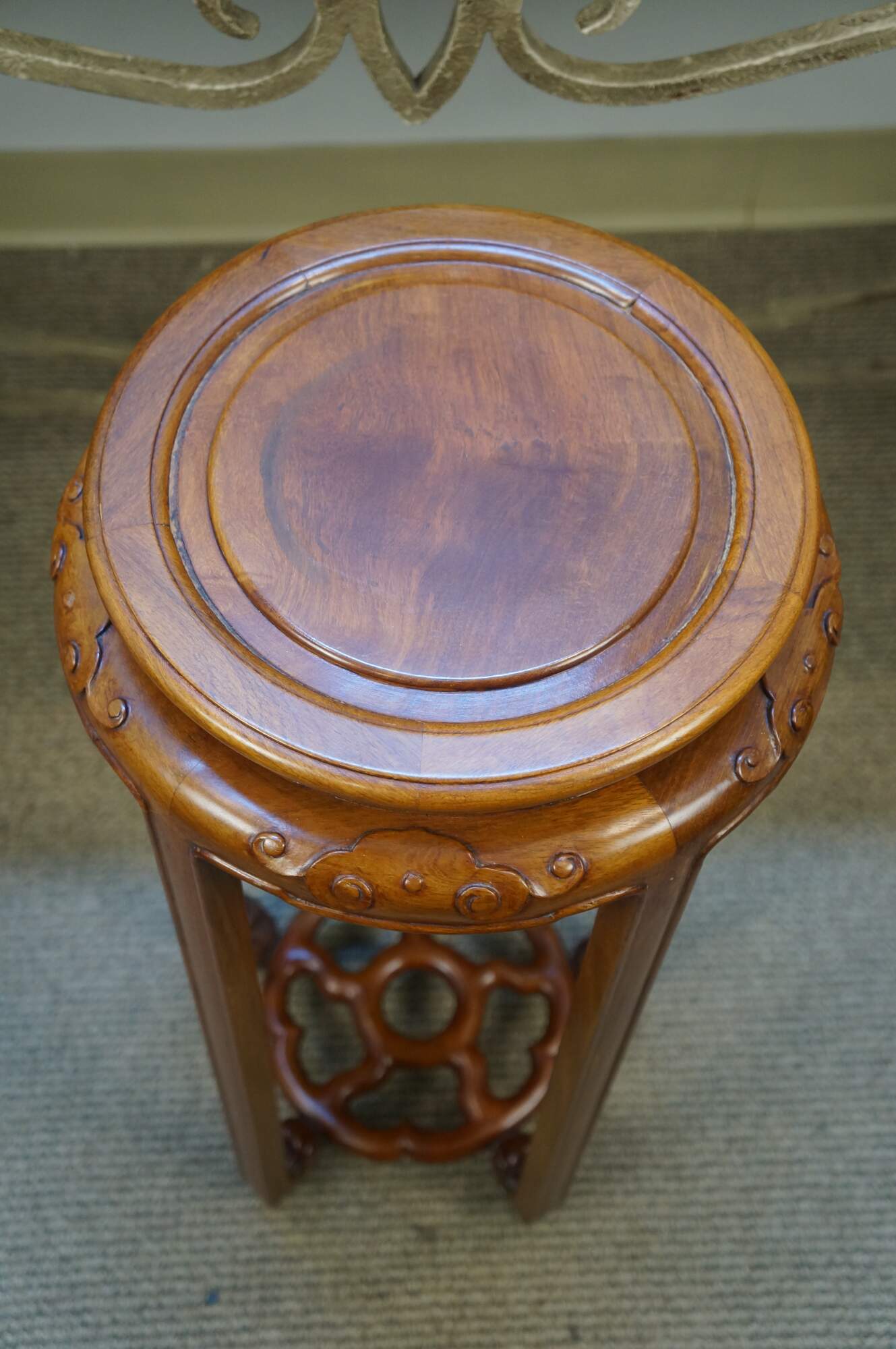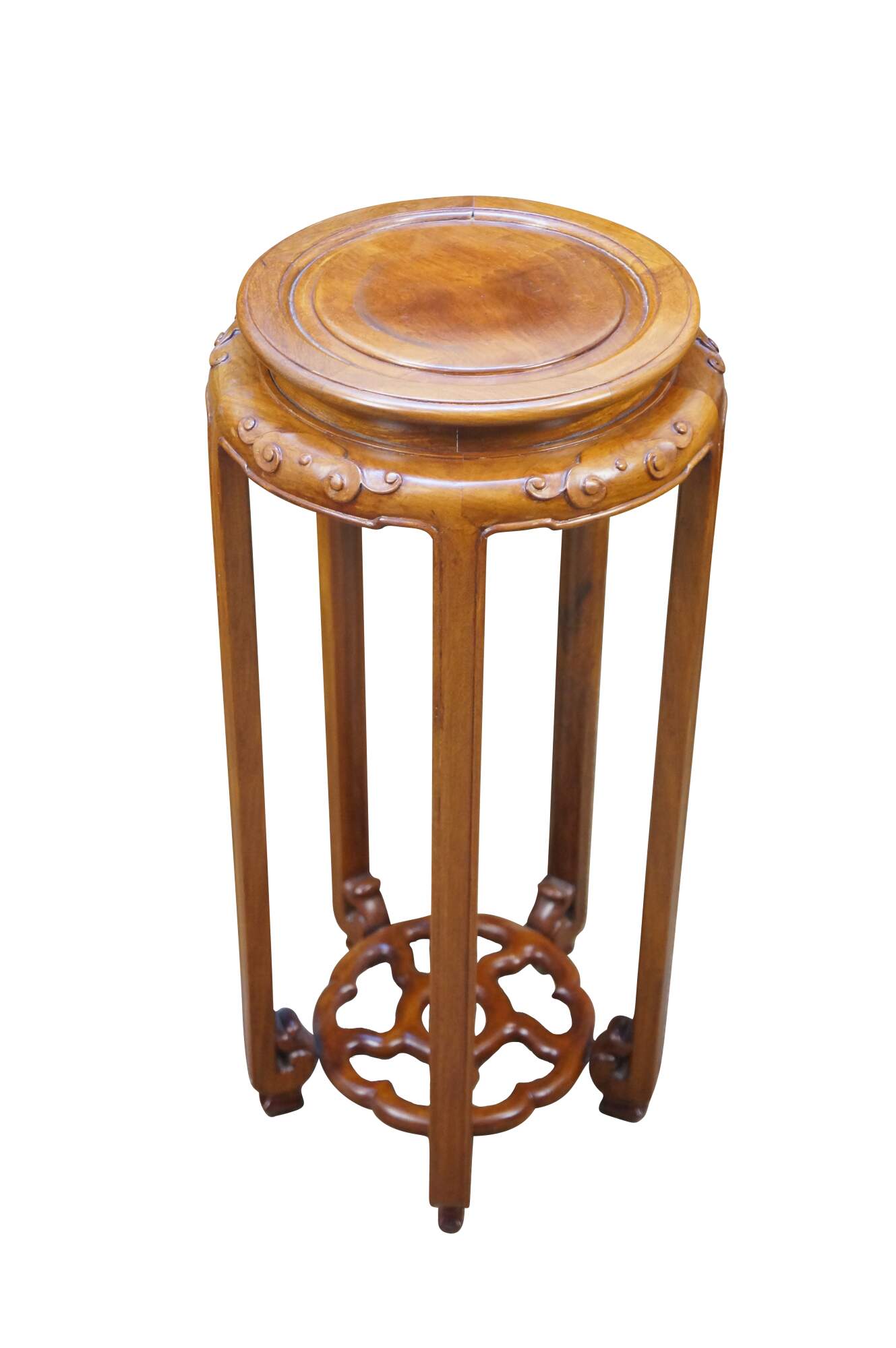 Vintage 20th century carved wooden Chinese plant stand / sculpture / statue pedestal. Round top trimmed with cloud shaped carvings around the upper edge and sun shaped medallion stretcher at the base.
