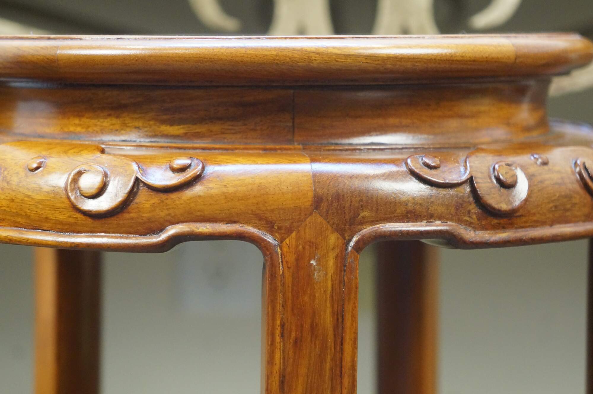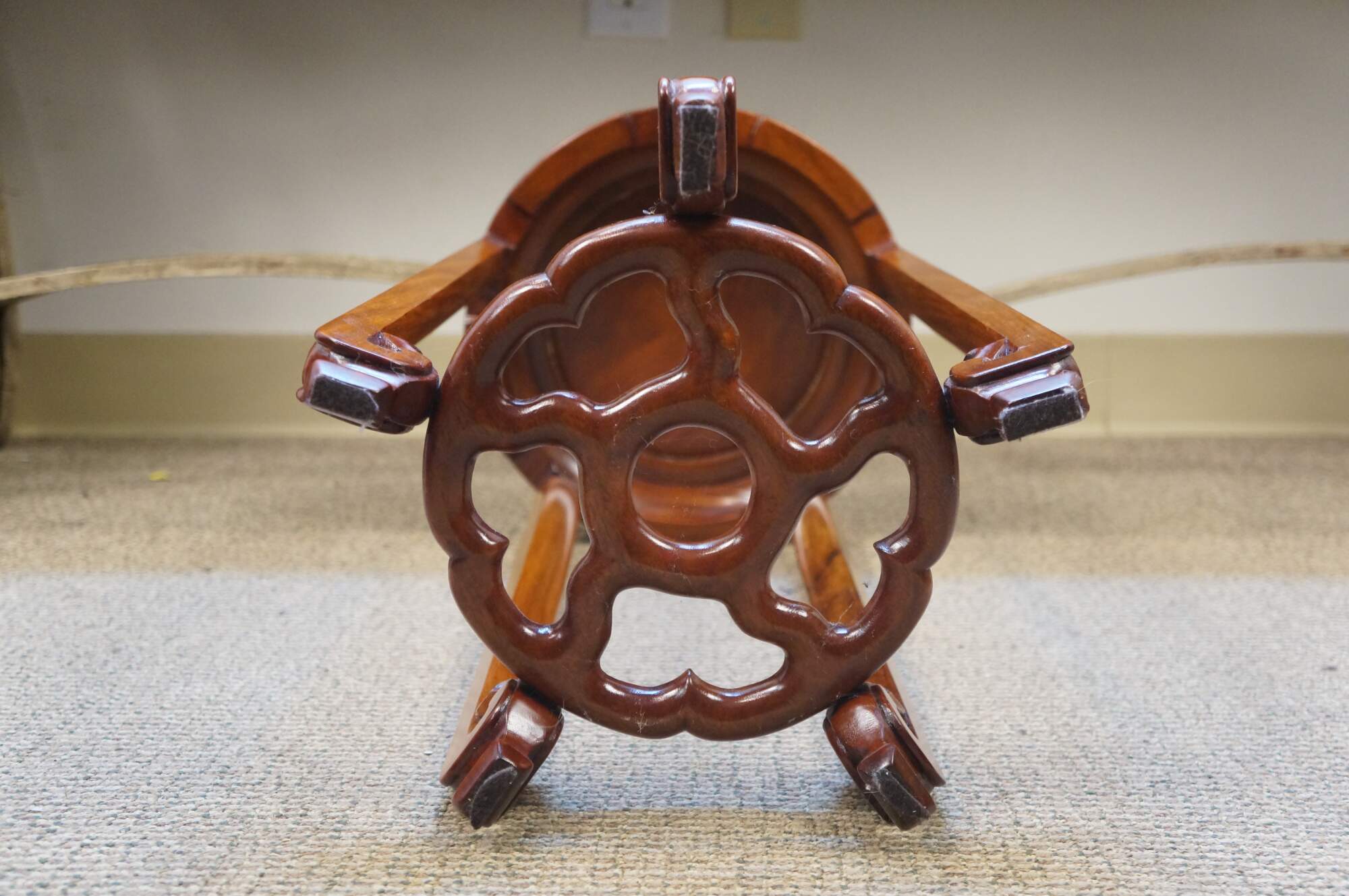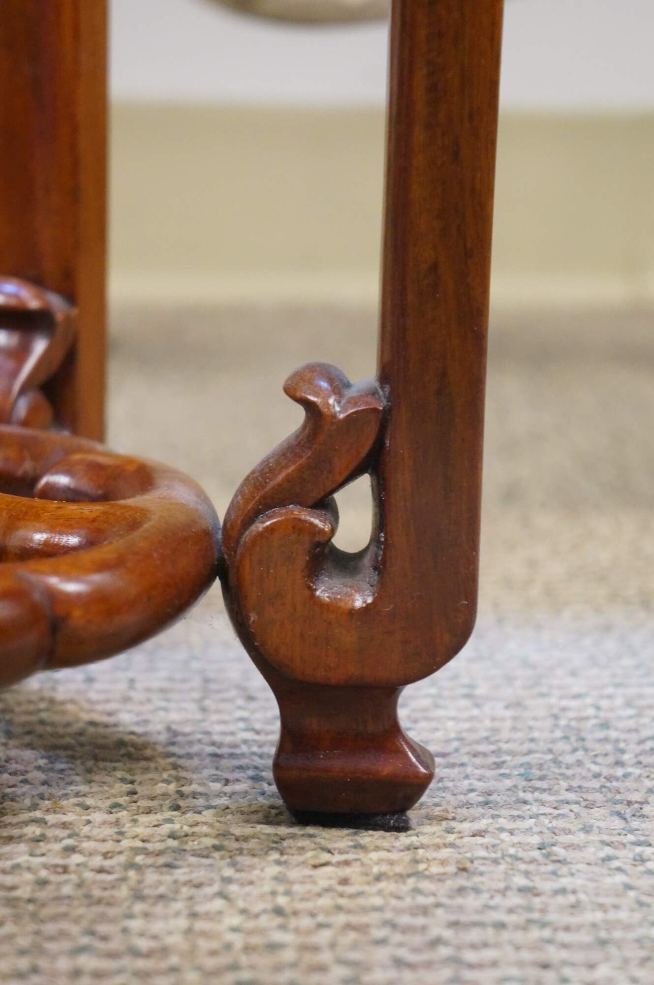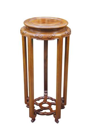 Vintage 20th century carved wooden Chinese plant stand / sculpture / statue pedestal. Round top trimmed with cloud shaped carvings around the upper edge and sun shaped medallion stretcher at the base.